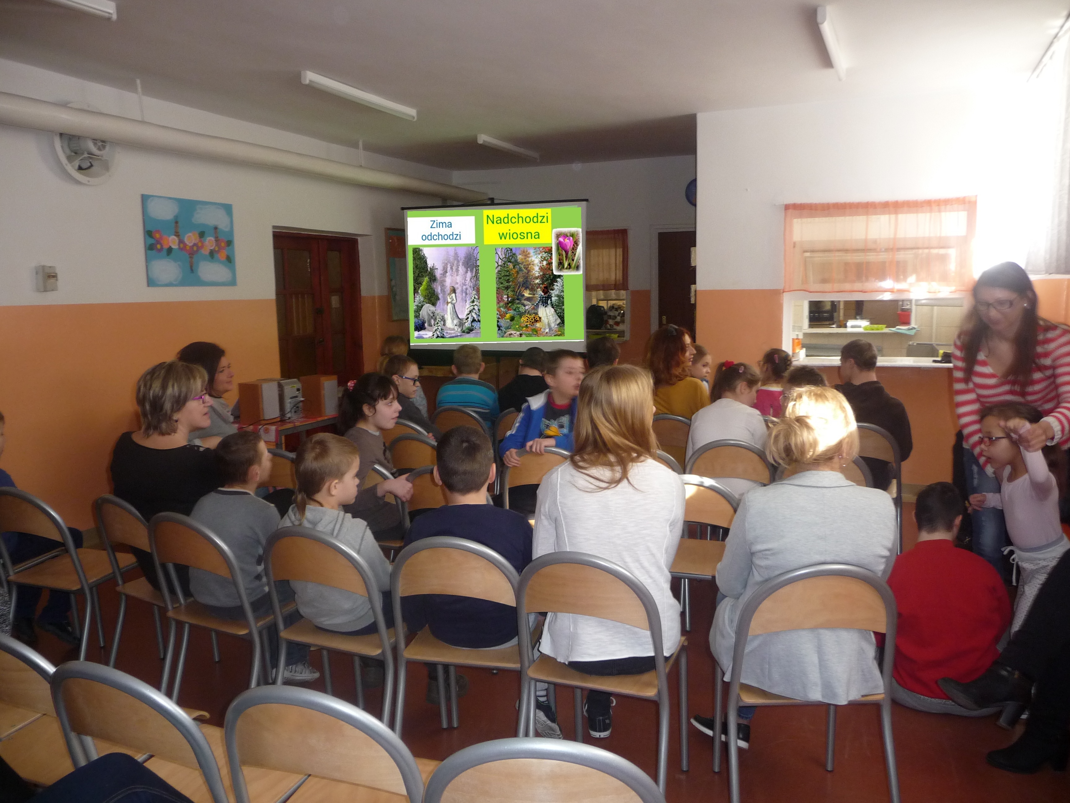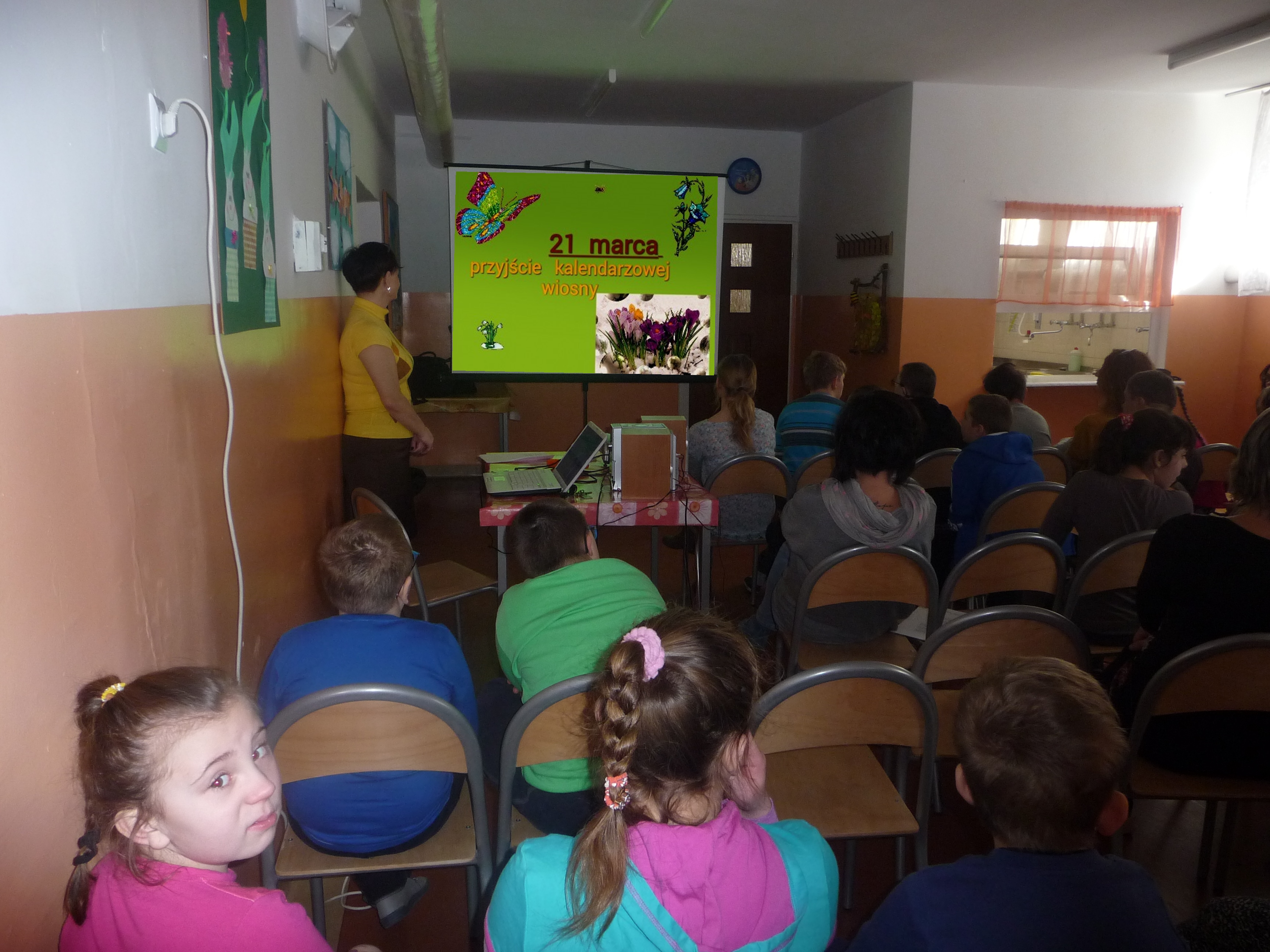 Długo oczekiwaną wiosnę uczniowie szkoły podstawowej przywitali wesołą zabawą. Na spotkaniu zaaranżowanym przez bibliotekę szkolną poznawaliśmy zwiastuny astronomicznej wiosny oraz towarzyszące temu zmiany w przyrodzie. Do prezentacji okolicznościowych wierszy o wiośnie  wyszukanych w księgozbiorze szkolnym włączyła się  pani Ania Rogożyńska -studentka  trzeciego roku PWSZ w Elblągu. Nauka melodyjnej i pogodnej piosenki „Przyszła do nas wiosna” wprawiła uczestników spotkania w radosny nastrój powitania nadchodzącej pory roku.  Uwieńczeniem spotkania była przygotowana przez bibliotekarkę inscenizacja opowiadania Aleksandry Hϋbnerowej „Krasnoludki na balu u królowej wiosny”. W rolę narratorów opowiadania wcieliły się wychowawczynie  klas  V i VI,  panie: Ania Wójtowicz  i  Katarzyna  Pietrzyńska , zaś oprawę graficzną  stanowiła prezentacja multimedialna wykonana  przez  Koło Przyjaciół Biblioteki.