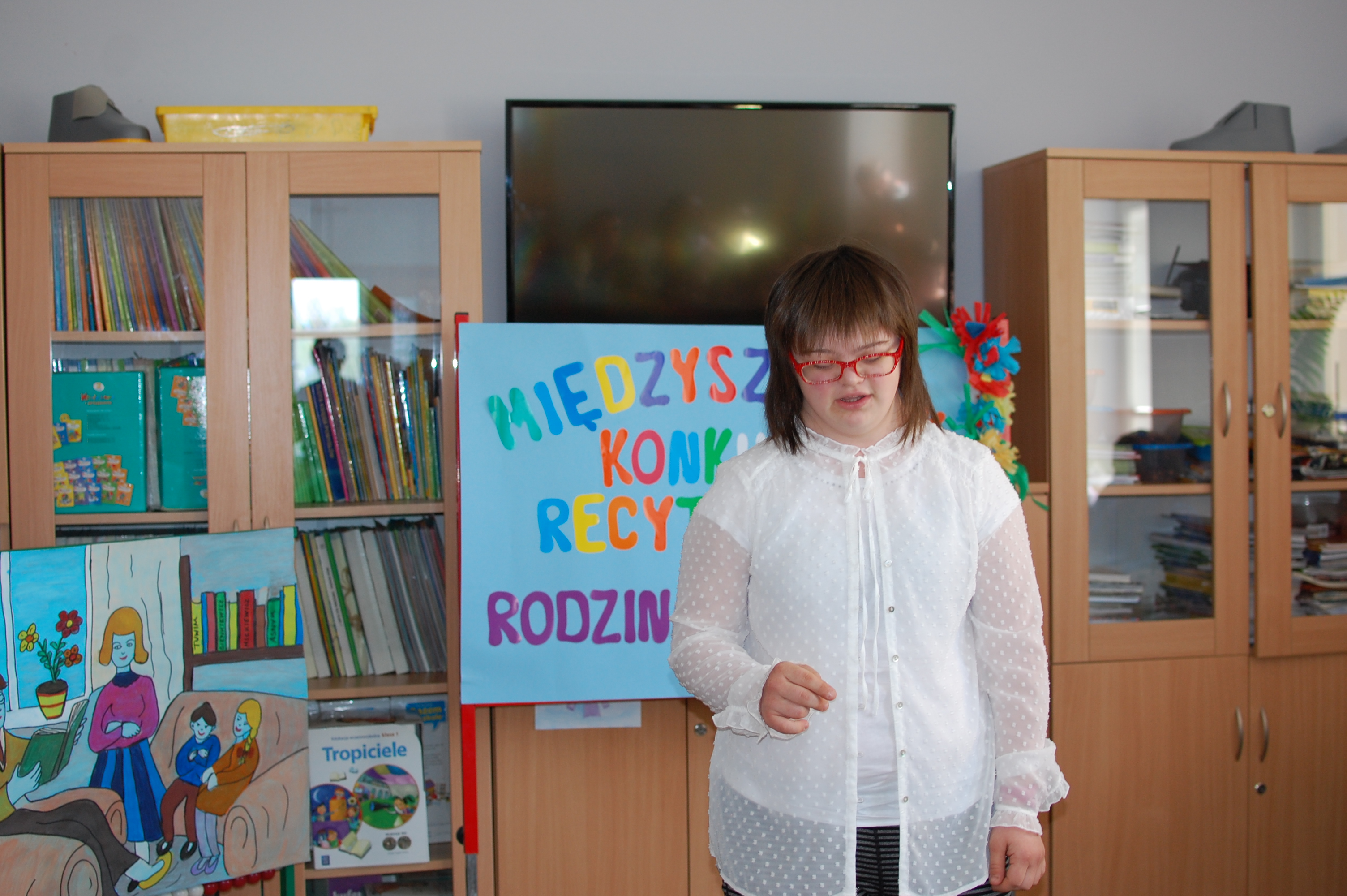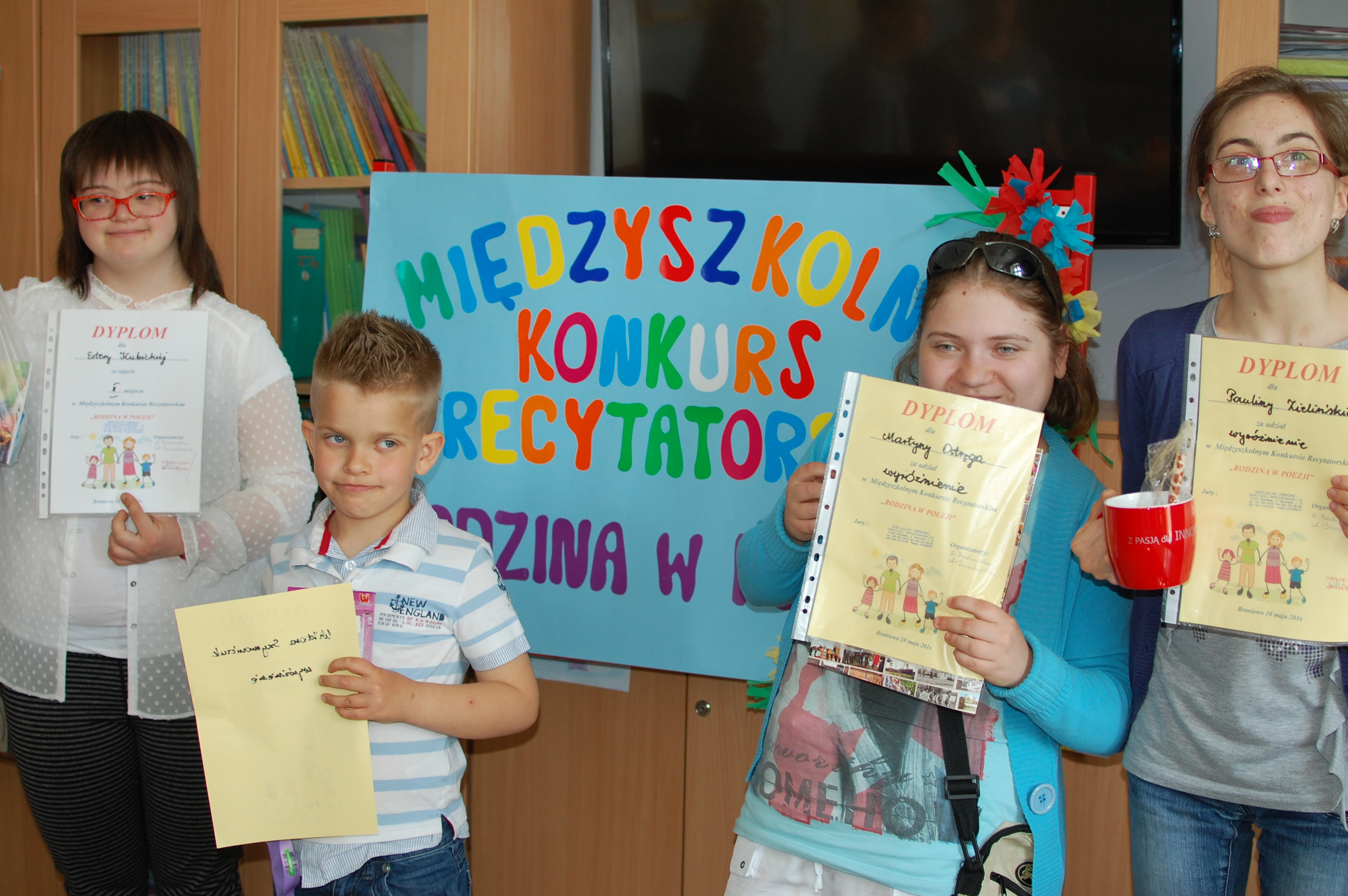 Międzyszkolny konkurs recytatorski „Rodzina w poezji” organizowany 10 maja przez zaprzyjaźniony Ośrodek Szkolno- Wychowawczy w Braniewie przyniósł naszym uczniom z zespołów edukacyjno- terapeutycznych szkoły podstawowej oraz gimnazjum dużo radości. Nasi przedstawiciele zaprezentowali nie tylko poprawna dykcję, ale i trudną umiejętność interpretacji utworów poetyckich. Poziom konkursu był wysoki. Wzięło w nim udział 23 uczniów z trzech placówek Braniewa i Elbląga. Jury wyłoniło zwycięzców w dwóch kategoriach.