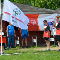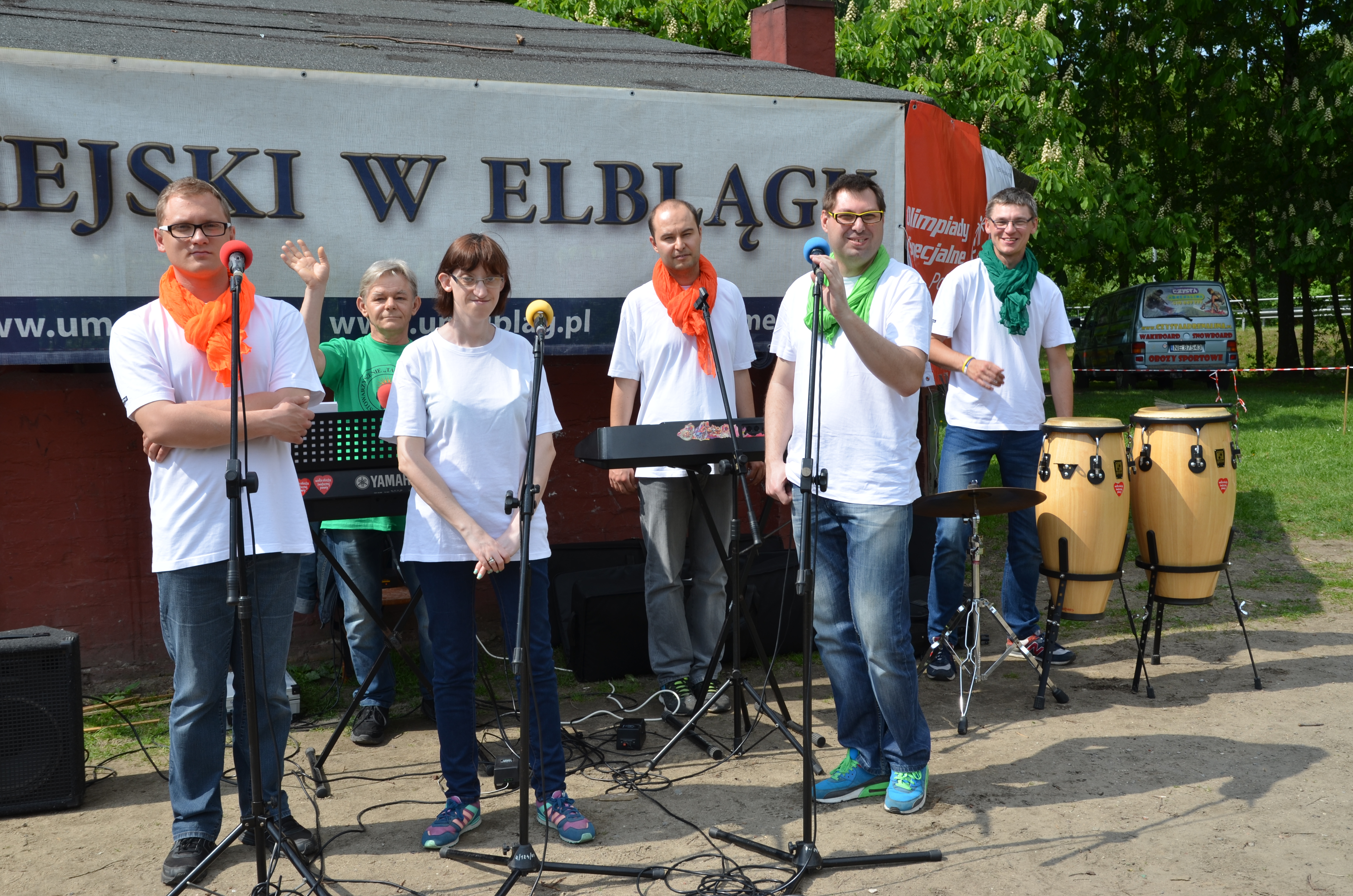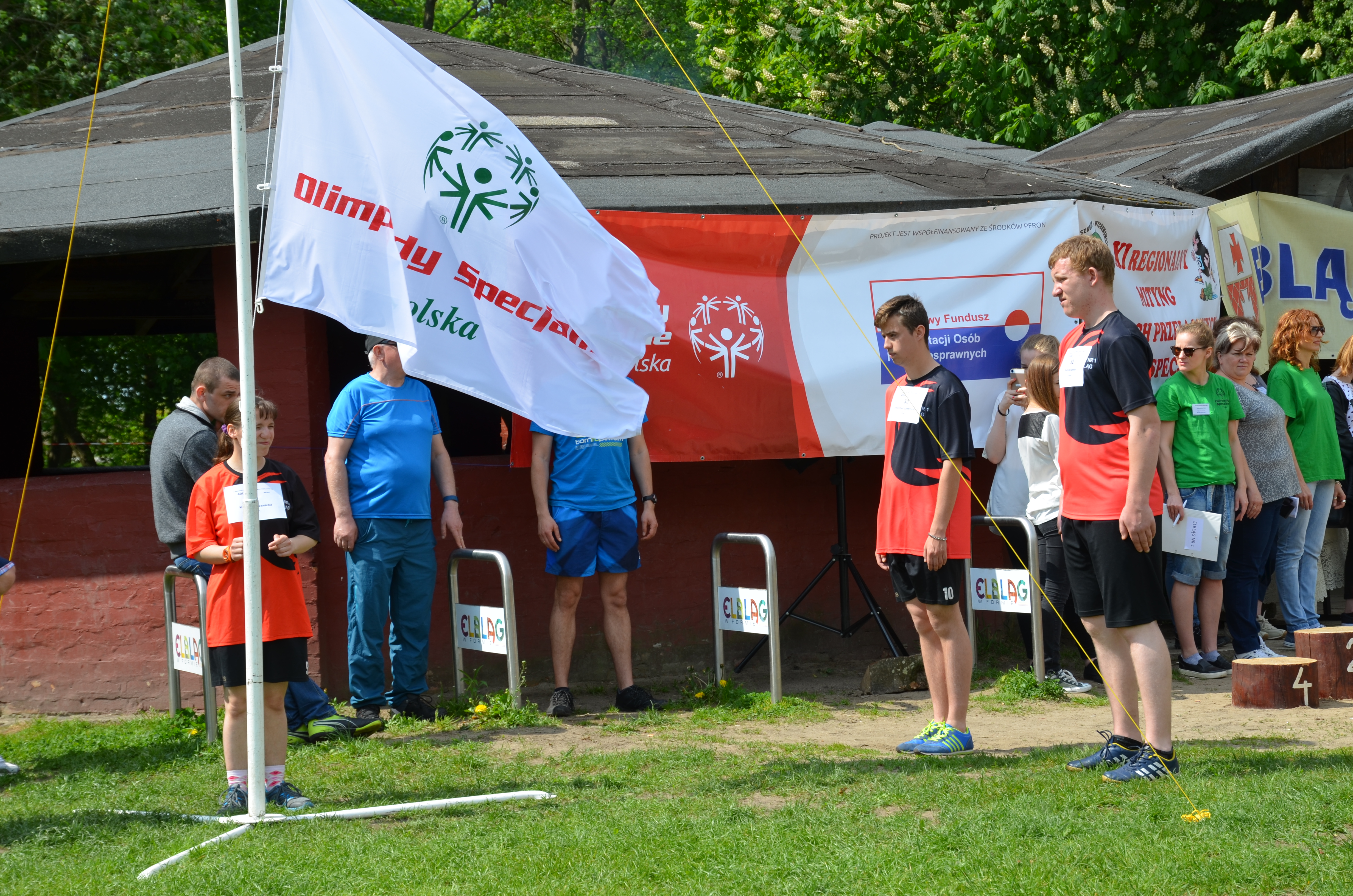 Uroczysty moment inauguracji biegów przełajowych rozpoczęto hymnem i prezentacją Flagi Olimpiad Specjalnych, po czym z ogromnym zainteresowaniem wysłuchano występu Zespołu ”Szwagry„ –WTZ przy Środowiskowym Domu Samopomocy w Elblągu pod kierunkiem PanaZdzisława Lacha.