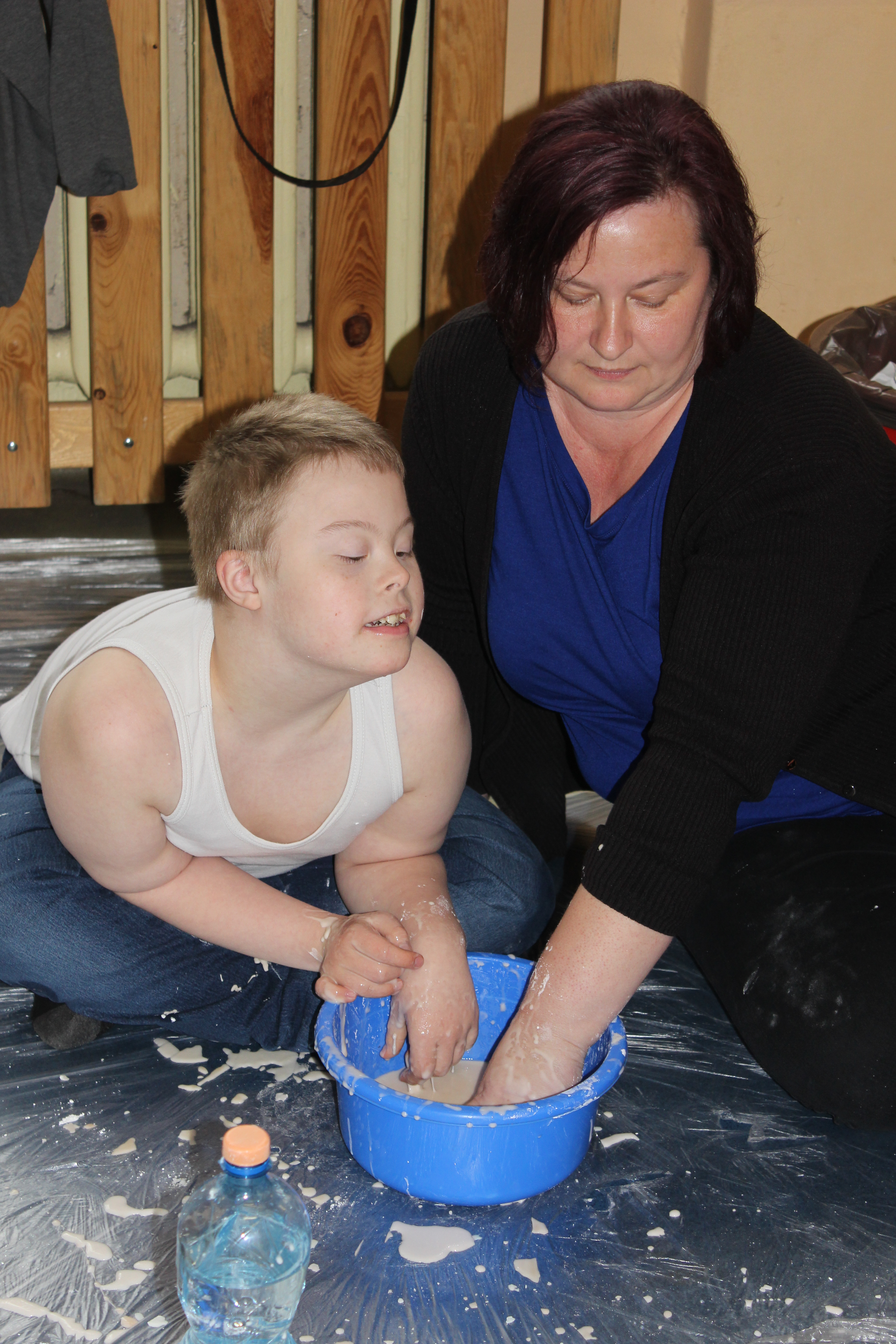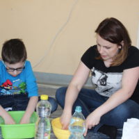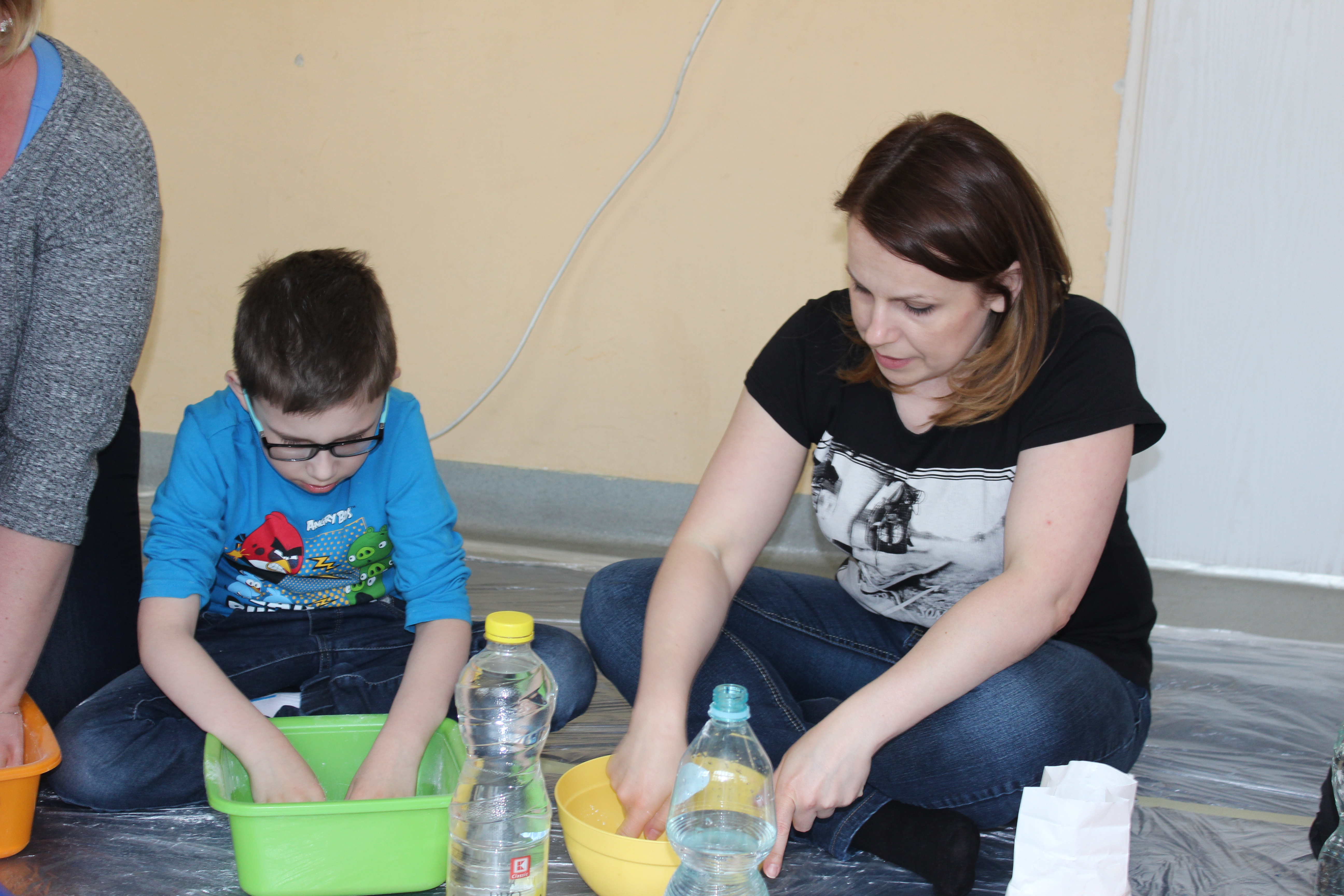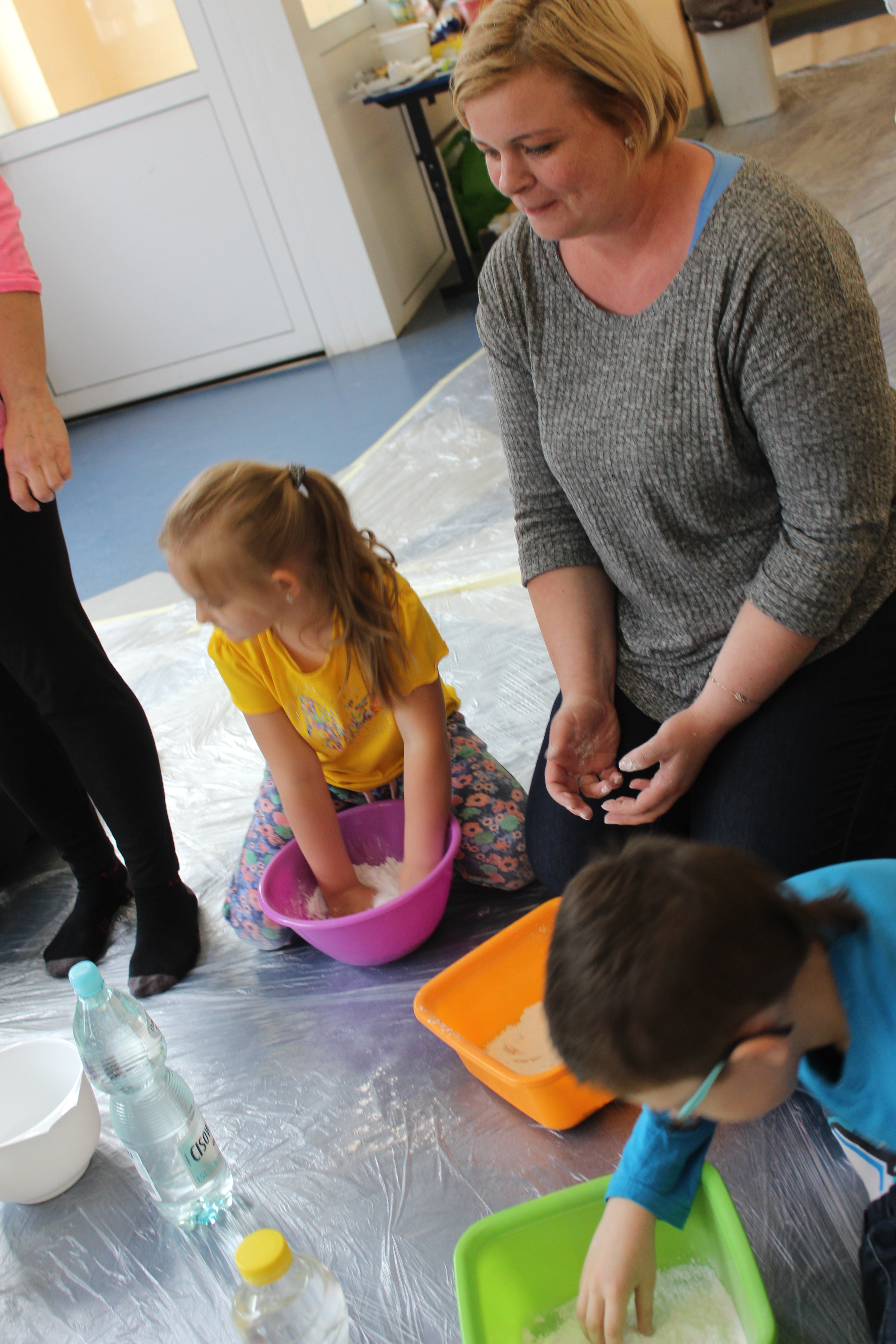 We wtorkowe popołudnie w naszym Ośrodku odbyły się kolejne warsztaty świetlicowe dla uczniów i ich rodziców. Tym razem zajęcia poprowadziła p. Marta Zalewska wraz z p. Patrycją Sokalską, a tematem była sensoplastyka. Dowiedzieliśmy się jak z prostych produktów i barwników spożywczych wykonać m.in. ciecz nienewtonowską, piasek pszenny i ciastolinę klasyczną. Uczestnicy zobaczyli także śnieg bezglutenowy i glut lniany gładki. Wraz z tworzeniem coraz to ciekawszych mas, zabawy było coraz więcej. Na zakończenie ułożyliśmy z ciastoliny dywan sensoryczny ozdabiając go m.in. makaronami, kaszami, grochem i pestkami, po którym chętne osoby spacerowały, a dla wszystkich ubrudzonych i szczęśliwych uczestników czekał zasłużony poczęstunek. Dziękujemy wszystkim za zaangażowanie i wyśmienitą zabawę pełną radości.