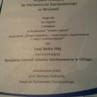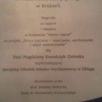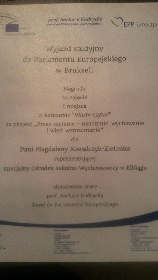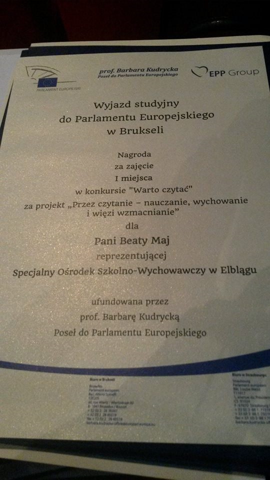 Nauczycielki B. Maj i M. Kowalczyk-Zielonka wzięły udział w wojewódzkim konkursie „Warto czytać” zorganizowanym przez W-MODN w Elblągu. Miał na celu promowanie nauczycieli, którzy wspólnie z uczniami zrealizują projekt edukacyjny przyczyniający się do rozwijania kompetencji czytelniczych i upowszechniania czytelnictwa wśród dzieci i młodzieży. Nauczycielki opracowały projekt pod hasłem „Przez czytanie- nauczanie, wychowanie i więzi wzmacnianie”, którego realizacja trwała cały rok szkolny 2015/16. Został doceniony i nagrodzony podczas dzisiejszej konferencji podsumowującej to przedsięwzięcie. Wyjazd edukacyjny do Brukseli to nagroda za zajęcie I miejsca w kategorii szkoły podstawowe, klasy I-III za najlepszy projekt promujący czytanie. To ogromne wyróżnienie, radość i motywacja do dalszego działania z naszymi wspaniałymi uczniami, którzy wnoszą ogromny wkład pracy w proponowane formy nauki.
