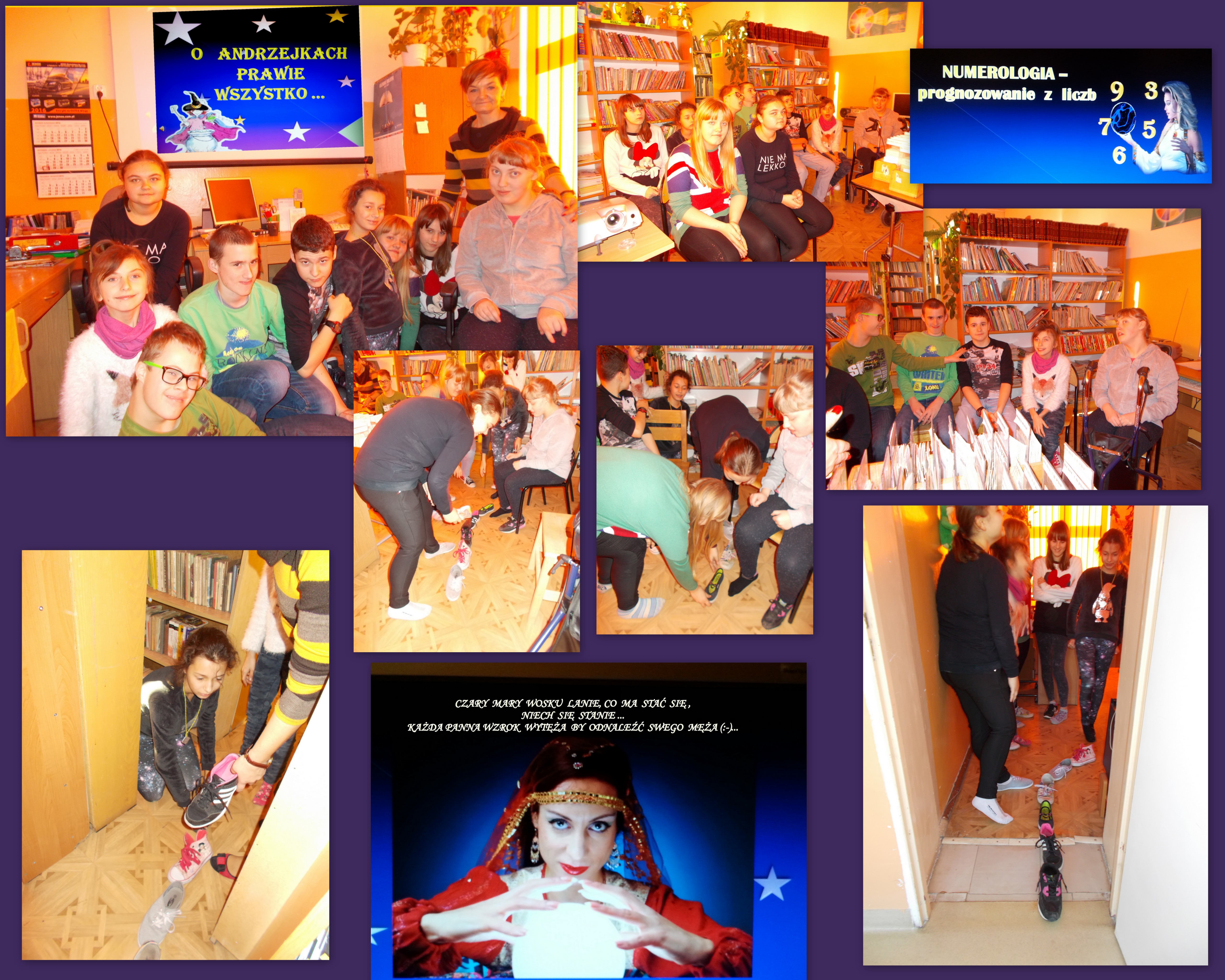 Pod hasłem „O Andrzejkach prawie wszystko” w bibliotece szkolnej odbyły się zajęcia w klasach gimnazjum. Uczniowie poznali dawne tradycje naszych przodków  związane z obchodami Andrzejek i Katarzynek, oraz rozmaitymi  wróżbami  im towarzyszącymi. Mieli również możliwość porównania dzisiejszych zabaw andrzejkowych z dawnymi tradycjami i jak wspólnie orzekli „warto je kultywować bo to fajna zabawa”.  Podążając tym tropem wspólnie spróbowaliśmy sięgnąć  do świata magii. Tradycyjna wróżba  „której but pierwszy” przyniosła obecnym panienkom nie mało emocji  , a uwieńczeniem spotkania była innowacyjna forma   „czarów” zwana  wróżbą numerologiczną .Dzięki niej  odkryliśmy  nawet najbardziej ukryte cechy charakteru wszystkich obecnych, ich przyszłość, a także poznaliśmy znane postacie reprezentujące   „magiczne cyfry”.  Było wesoło, zabawnie i śmiesznie – i oto chyba chodzi w andrzejkowych harcach.
