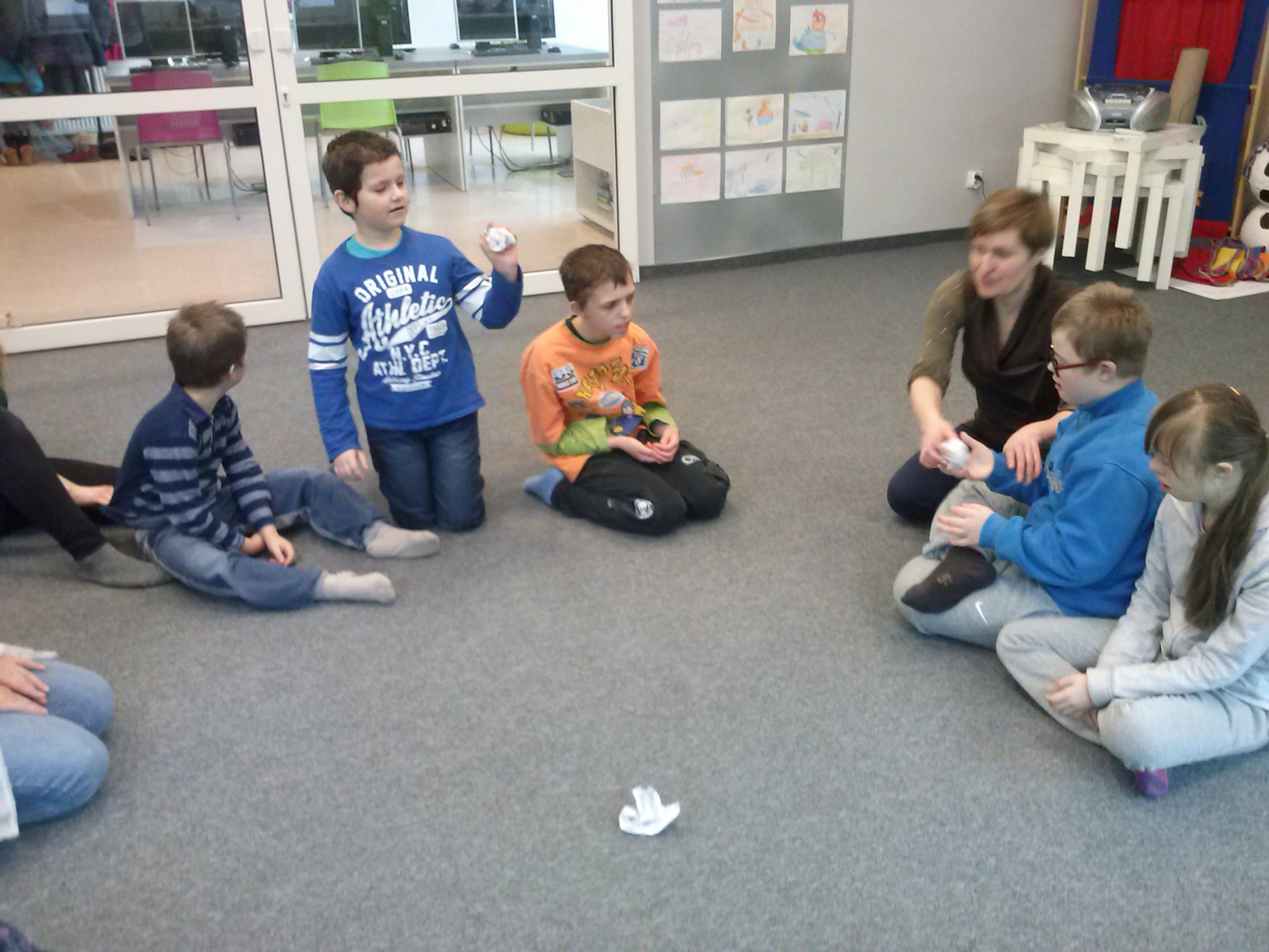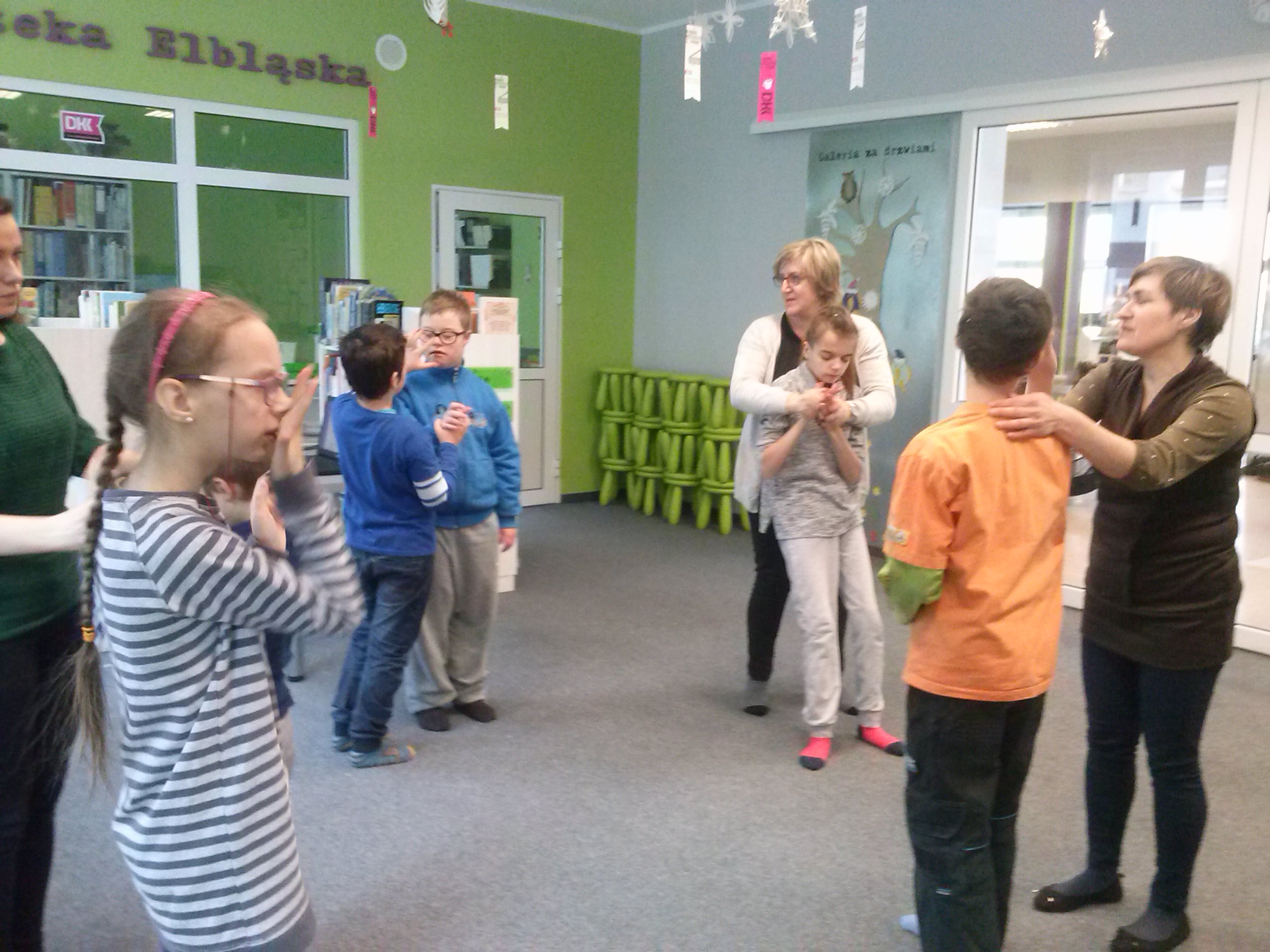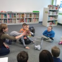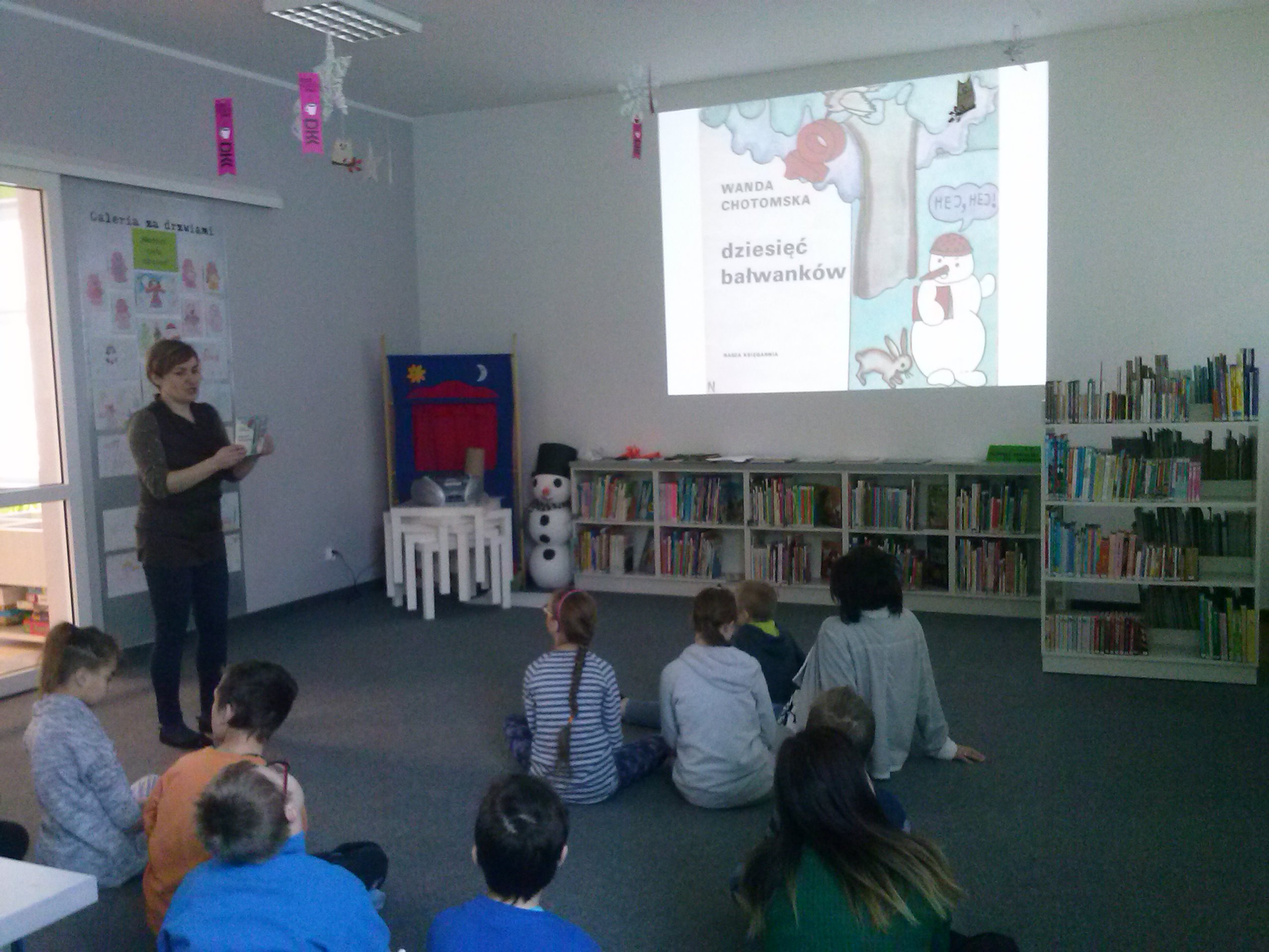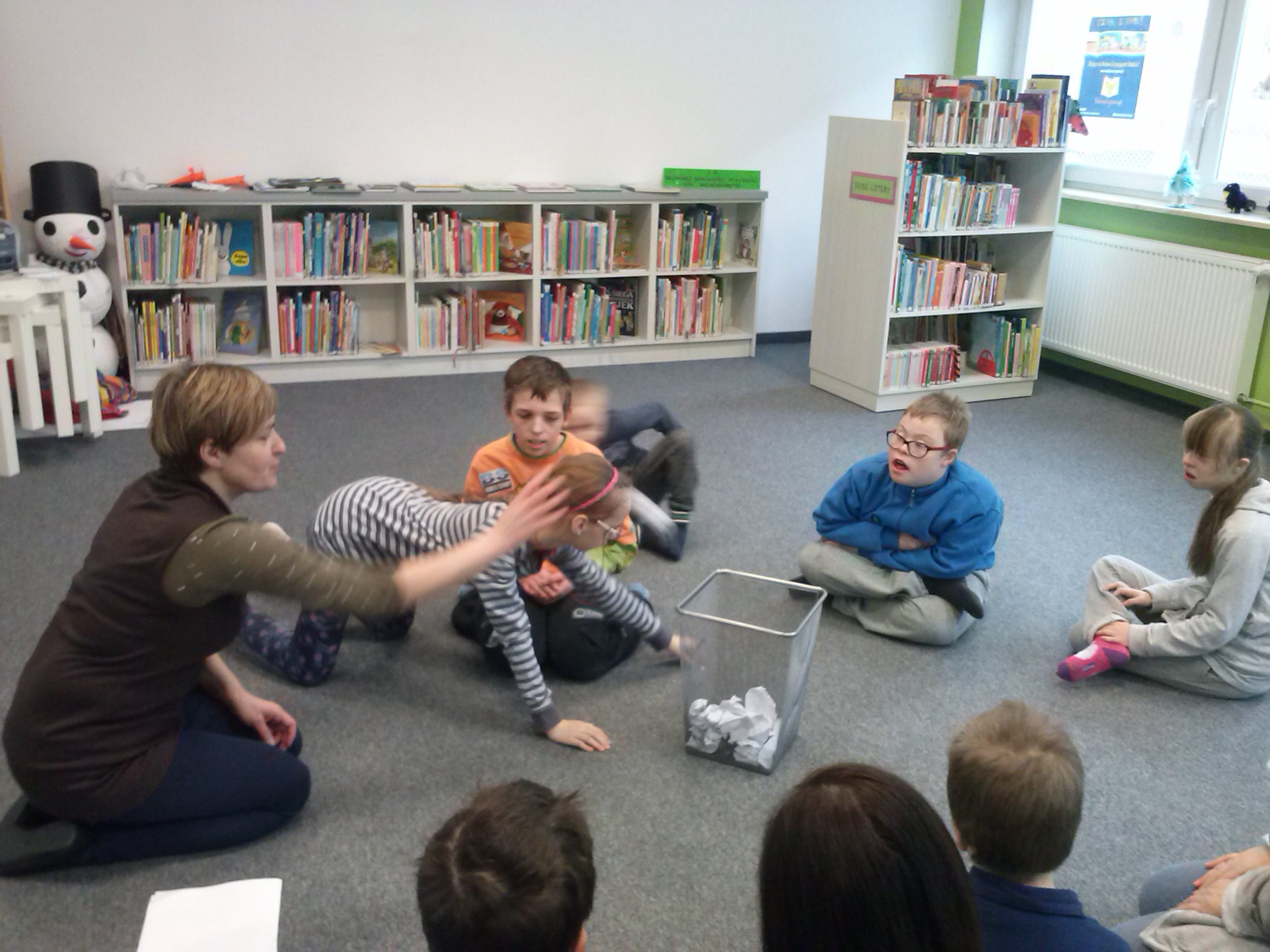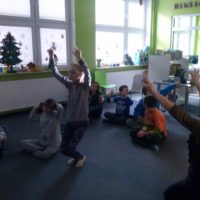 W dniu dzisiejszym uczniowie I a i V a zespołów edukacyjno – terapeutycznych uczestniczyli, kolejny już raz, w zajęciach zorganizowanych w Filii Nr 5 Biblioteki Elbląskiej. Tym razem Pani Małgosia zaproponowała naszym podopiecznym zajęcia związane z aktualną porą roku, czyli zimą. Na wstępie, w rytm muzyki, rozgrzewaliśmy się po zimowym spacerze. Następnie, w oparciu o wiersz Wandy Chotomskiej ,,Dziesięć Bałwanków”, doskonaliliśmy technikę liczenia w zakresie dziesięciu oraz bawiliśmy się śnieżynkami i śnieżnymi kulami. Kolejnym etapem spotkania było wspólne wyklejanie bałwana, którego podziwiać można na korytarzu klas młodszych. Nieco przemarznięci, ale bardzo zadowoleni, wróciliśmy do szkoły.