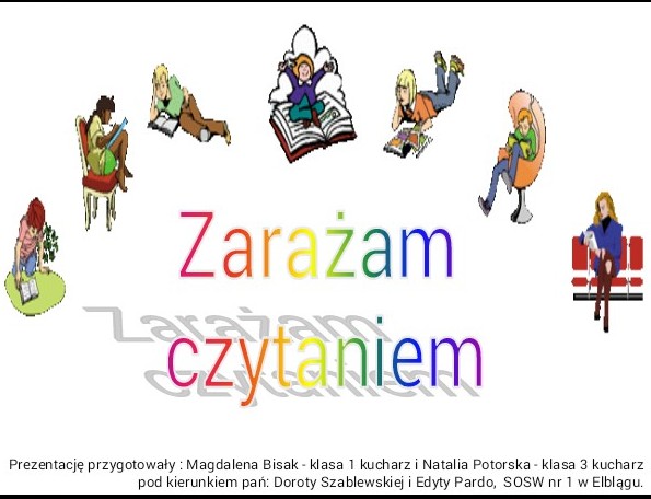 Trudnego przedsięwzięcia przygotowania prezentacji multimedialnej skoncentrowanej wokół tematu „Zarażamy czytaniem” podjęło się Koło Przyjaciół Biblioteki w osobach dwóch uczennic szkoły zawodowej: Magdy Bisak (klasa 1 kucharz ) i Natalii Potorskiej (klasa 3 kucharz). Pod czujnym okiem pań Doroty Szablewskiej i Edyty Pardo dziewczynki przygotowały prezentację multimedialną w formacie Microsoft Power mającą na celu promocję książki i czytelnictwa oraz sprzyjającą kształceniu kompetencji językowych młodzieży, (czas trwania: 180 sekund, zawartość: 15 slajdów) .