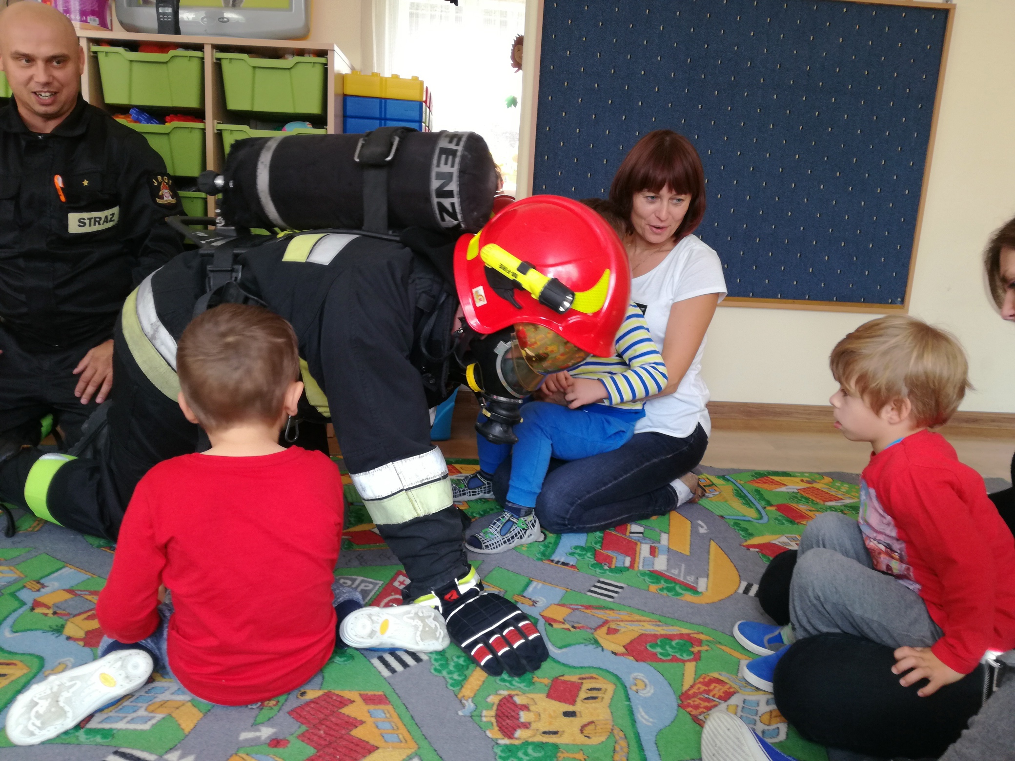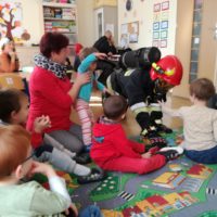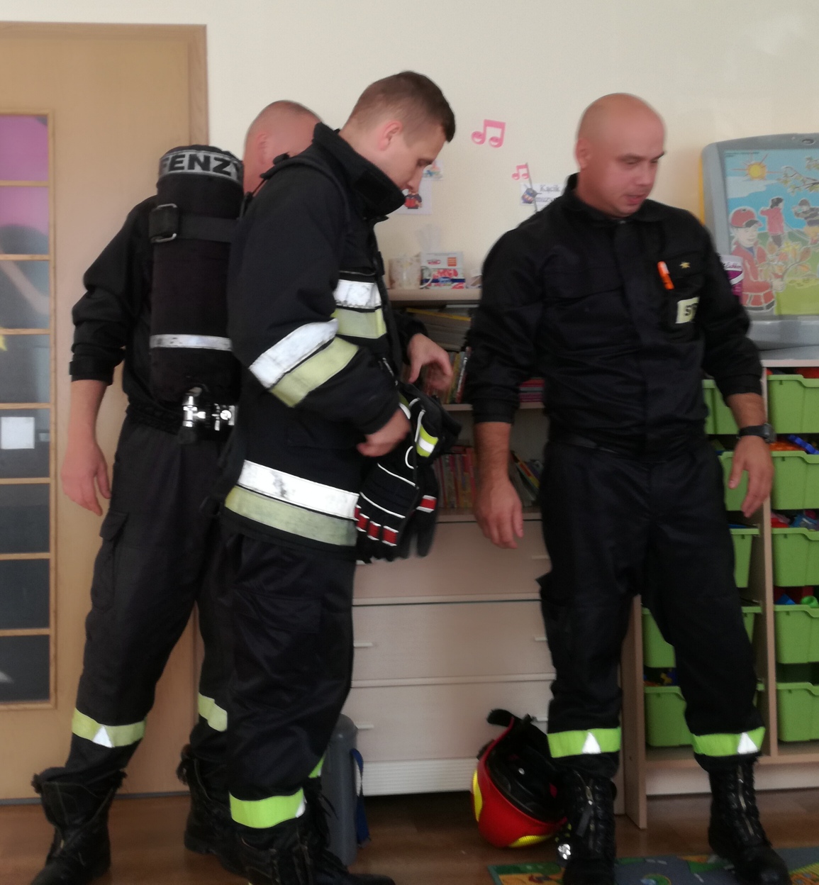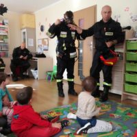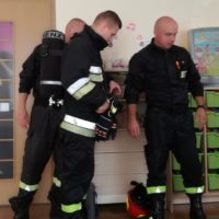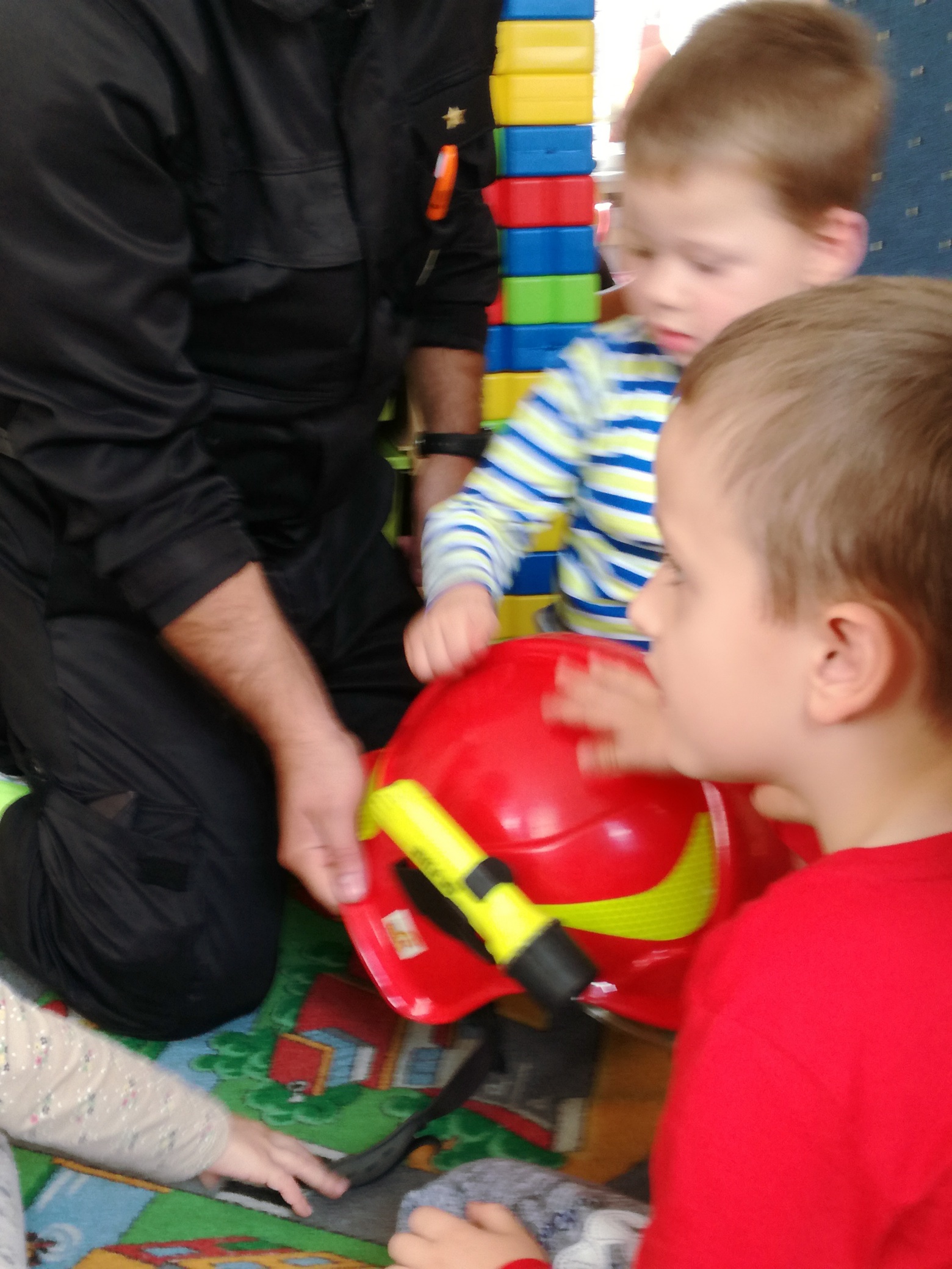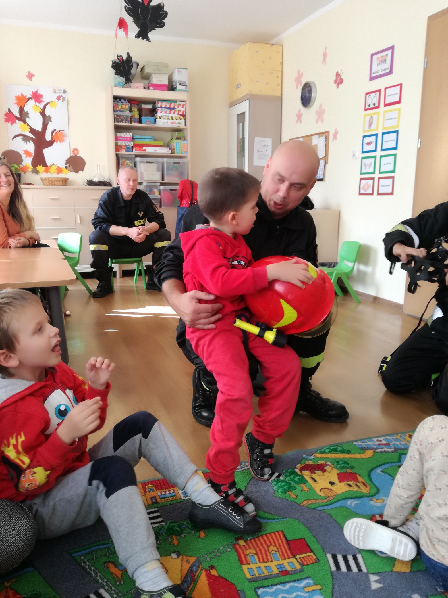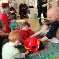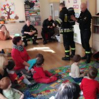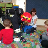 Po ” tygodniu niebieskim”, w którym nasze najmłodsze pociechy aktywnie uczestniczyły w spotkaniach z Policją i Strażą Miejską, przyszedł czas na „tydzień czerwony”. W dniu dzisiejszym odwiedzili nas przedstawiciele Państwowej Straży Pożarnej. Dzieci zapoznały się ze sposobami bezpiecznego zachowania się w czasie zagrożenia pożarowego.Poznały wyposażenie strażaka oraz miały możliwość obejrzeć od wewnątrz wóz strażacki.