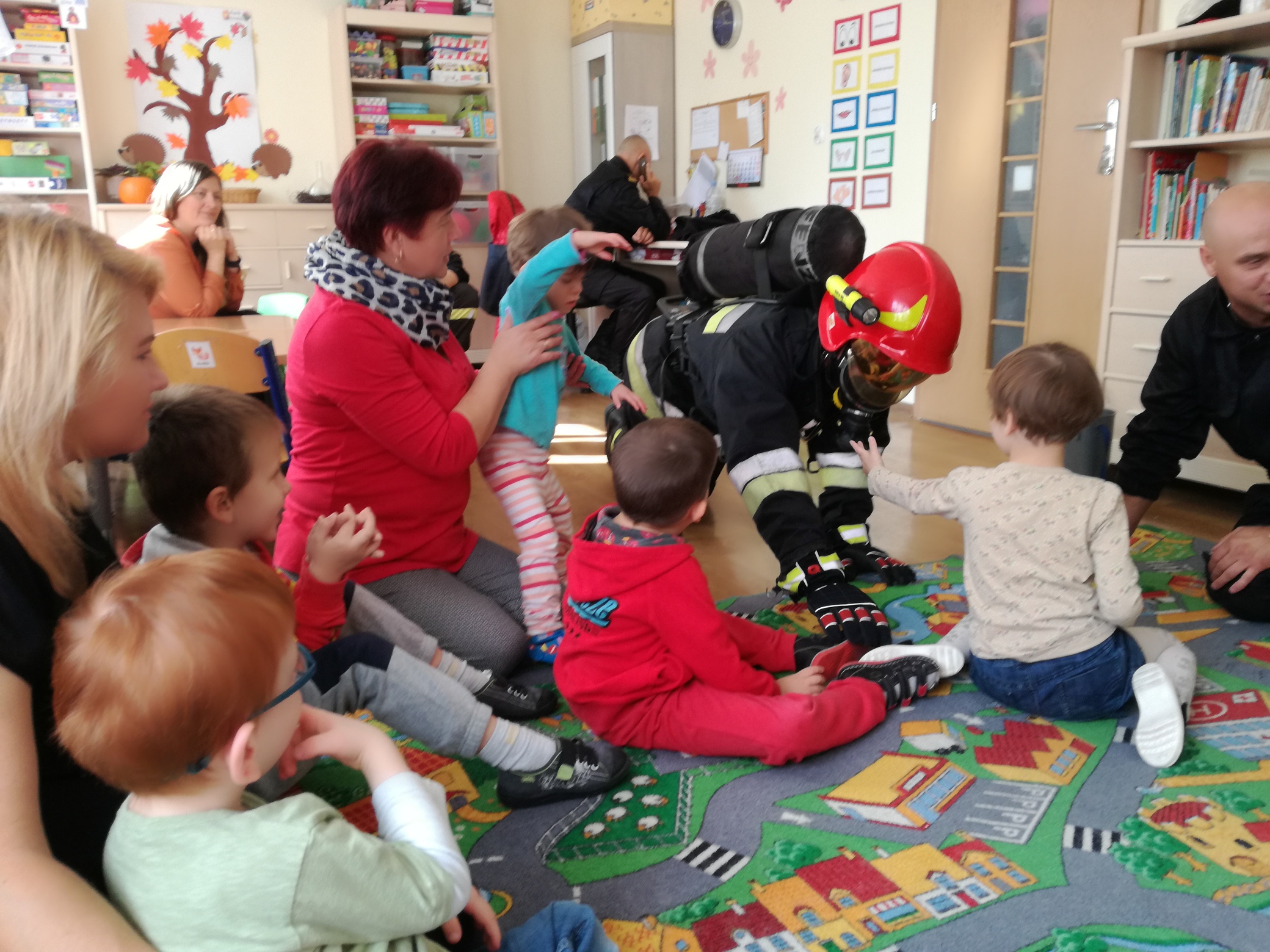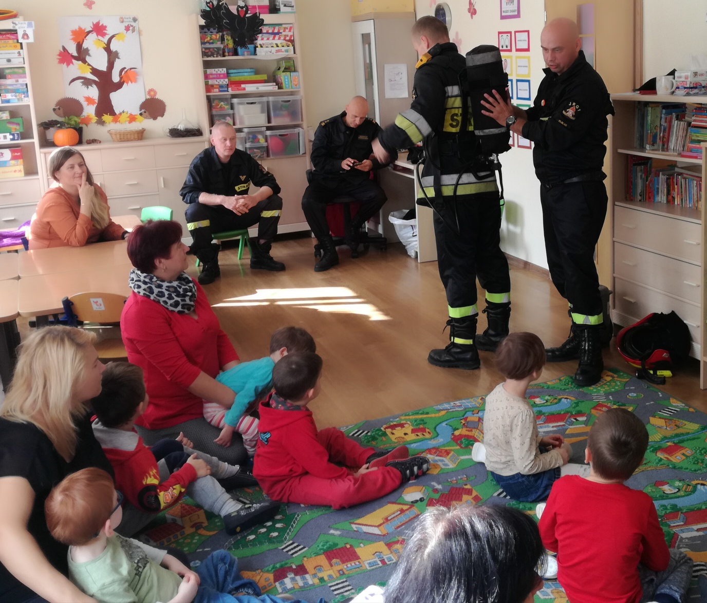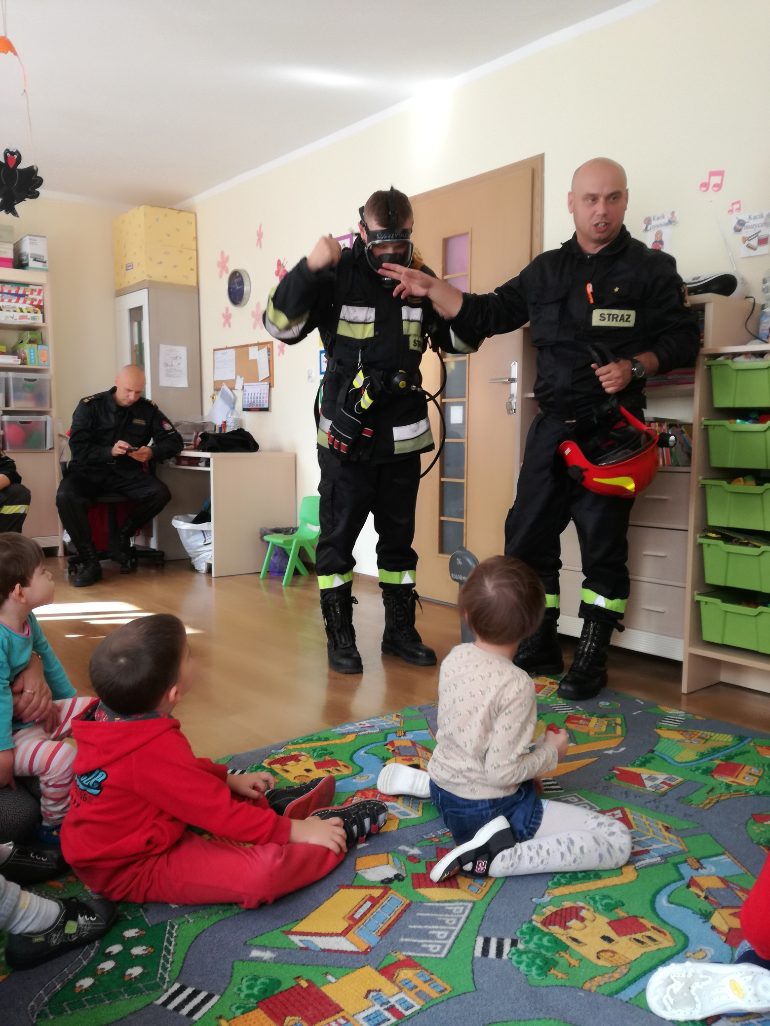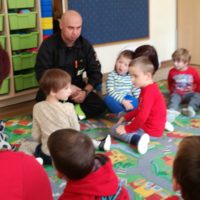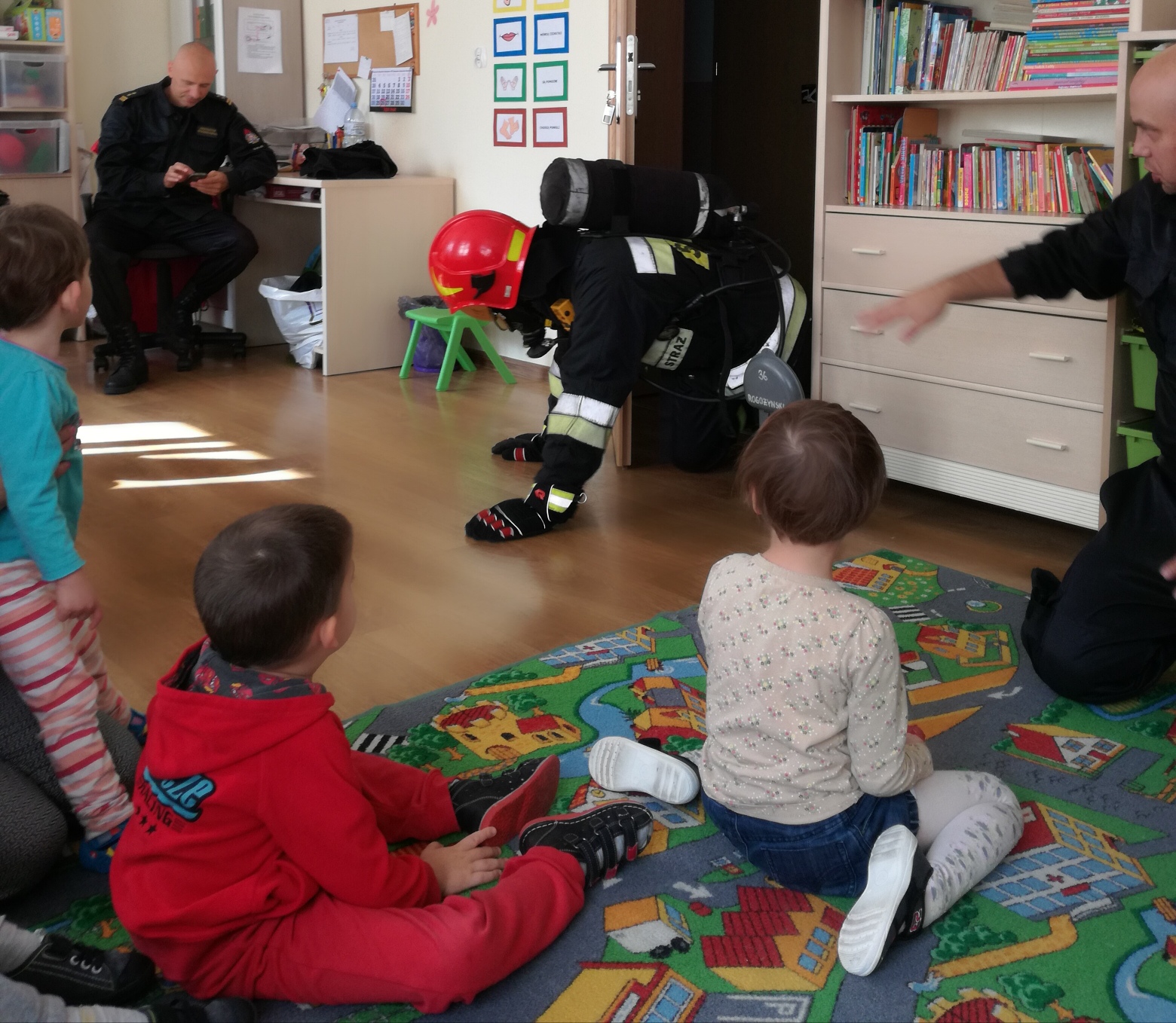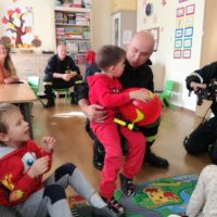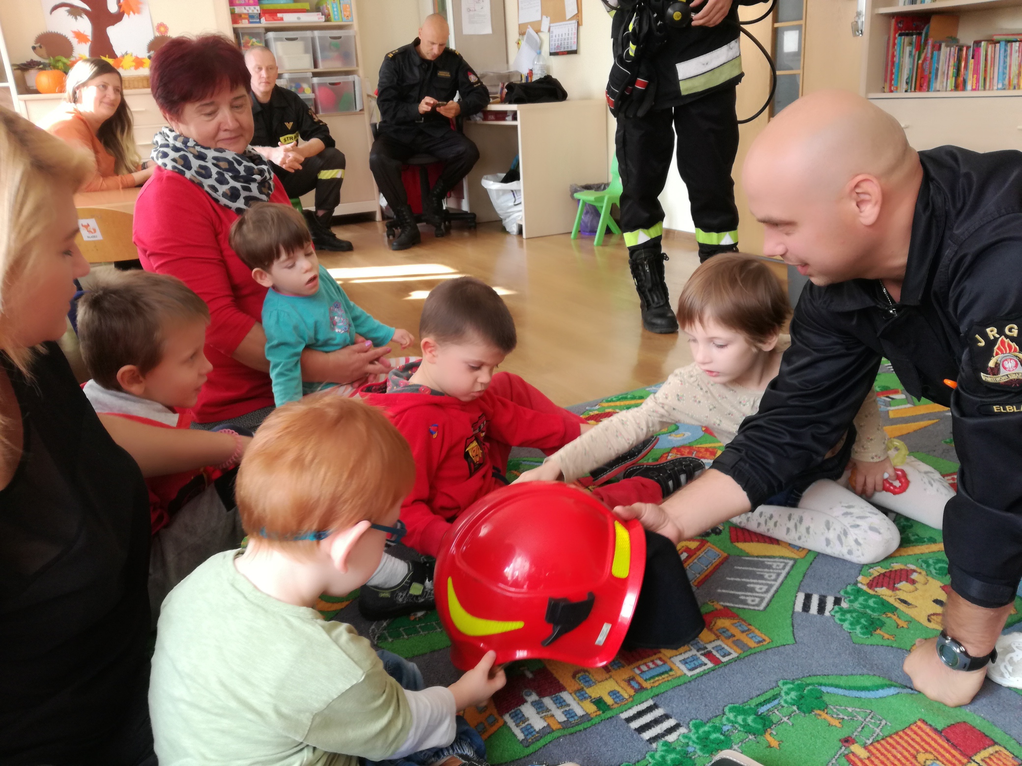 Po ” tygodniu niebieskim”, w którym nasze najmłodsze pociechy aktywnie uczestniczyły w spotkaniach z Policją i Strażą Miejską, przyszedł czas na „tydzień czerwony”. W dniu dzisiejszym odwiedzili nas przedstawiciele Państwowej Straży Pożarnej. Dzieci zapoznały się ze sposobami bezpiecznego zachowania się w czasie zagrożenia pożarowego.Poznały wyposażenie strażaka oraz miały możliwość obejrzeć od wewnątrz wóz strażacki.