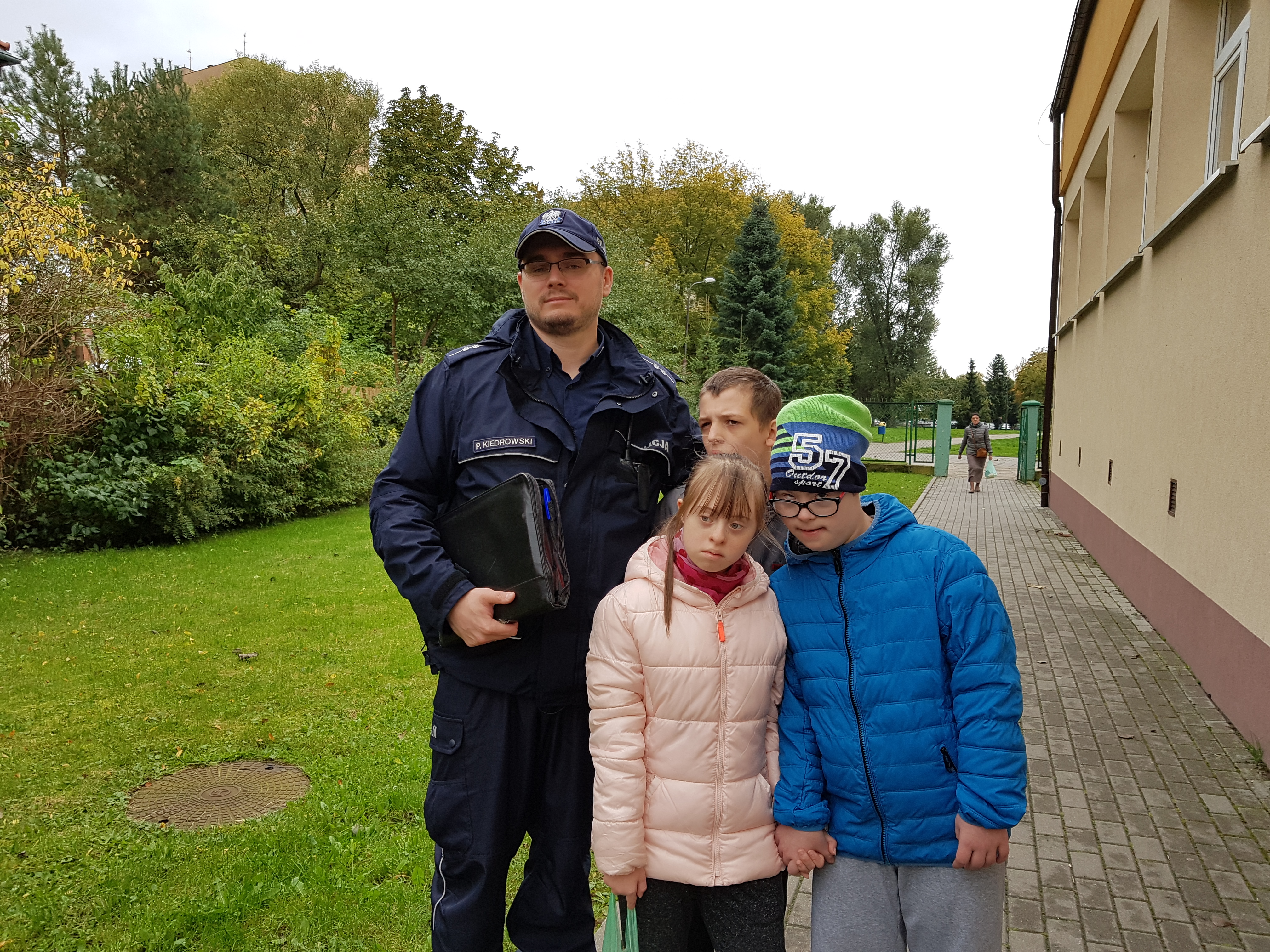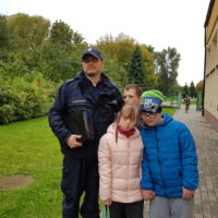 W drodze powrotnej do szkoły spotkaliśmy naszego zaprzyjaźnionego policjanta, który już całkiem serio i nie ,,w różowych okularach” przepytał nas, w jaki sposób bezpiecznie poruszać się po mieście. ,,Egzamin” z przepisów ruchu drogowego wypadł bardzo dobrze, a my bezpiecznie wróciliśmy do szkoły.