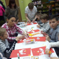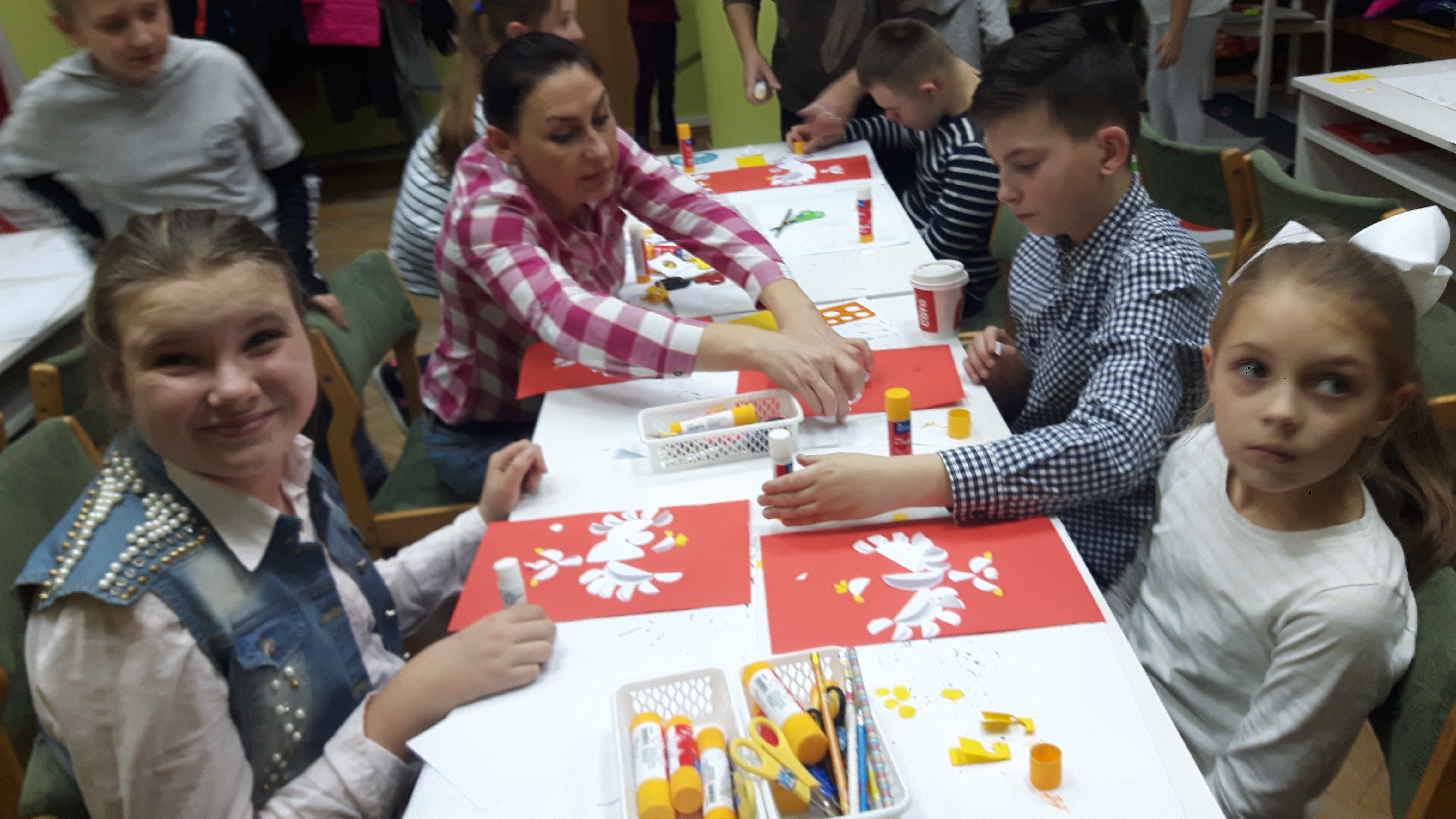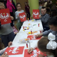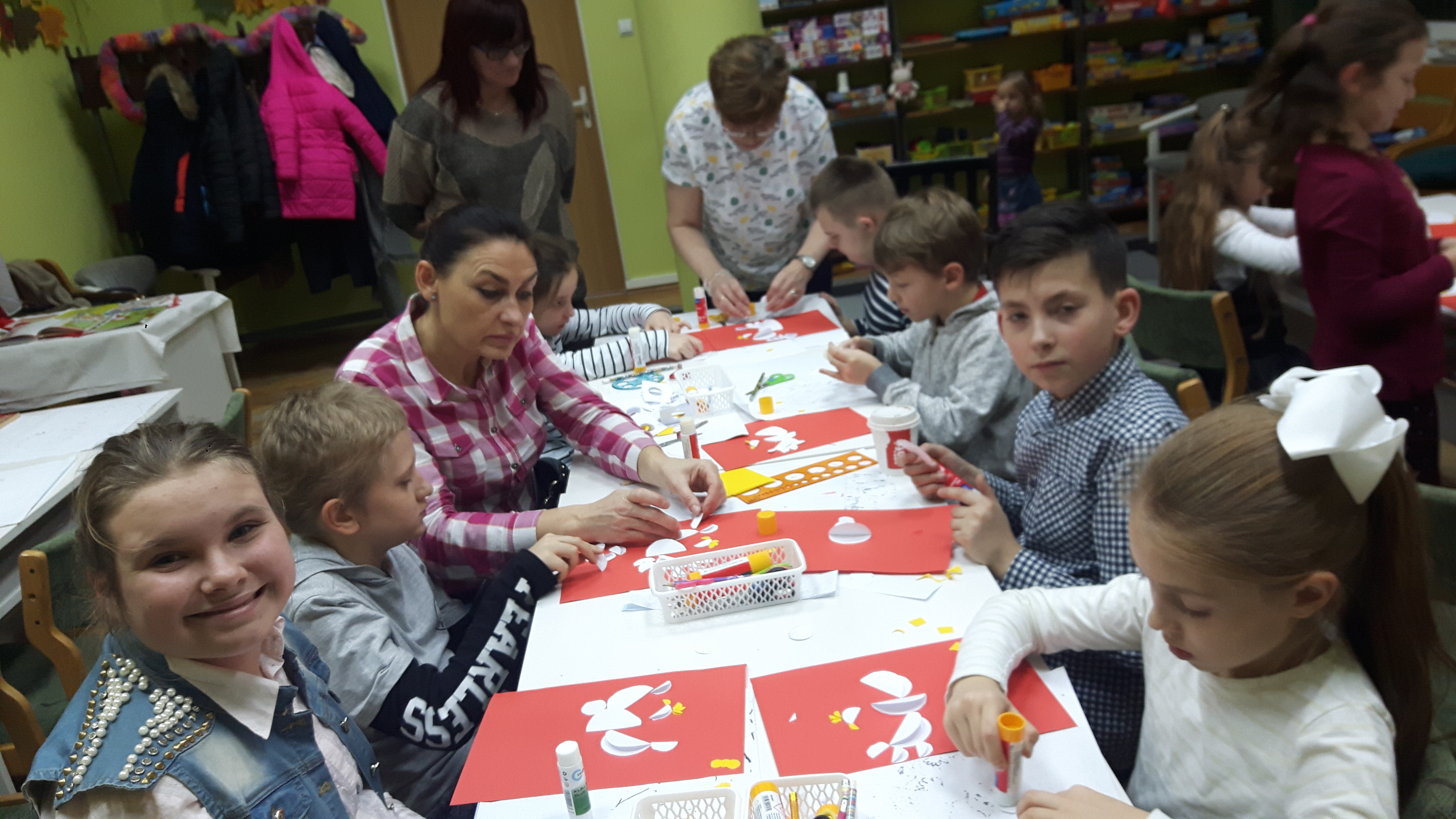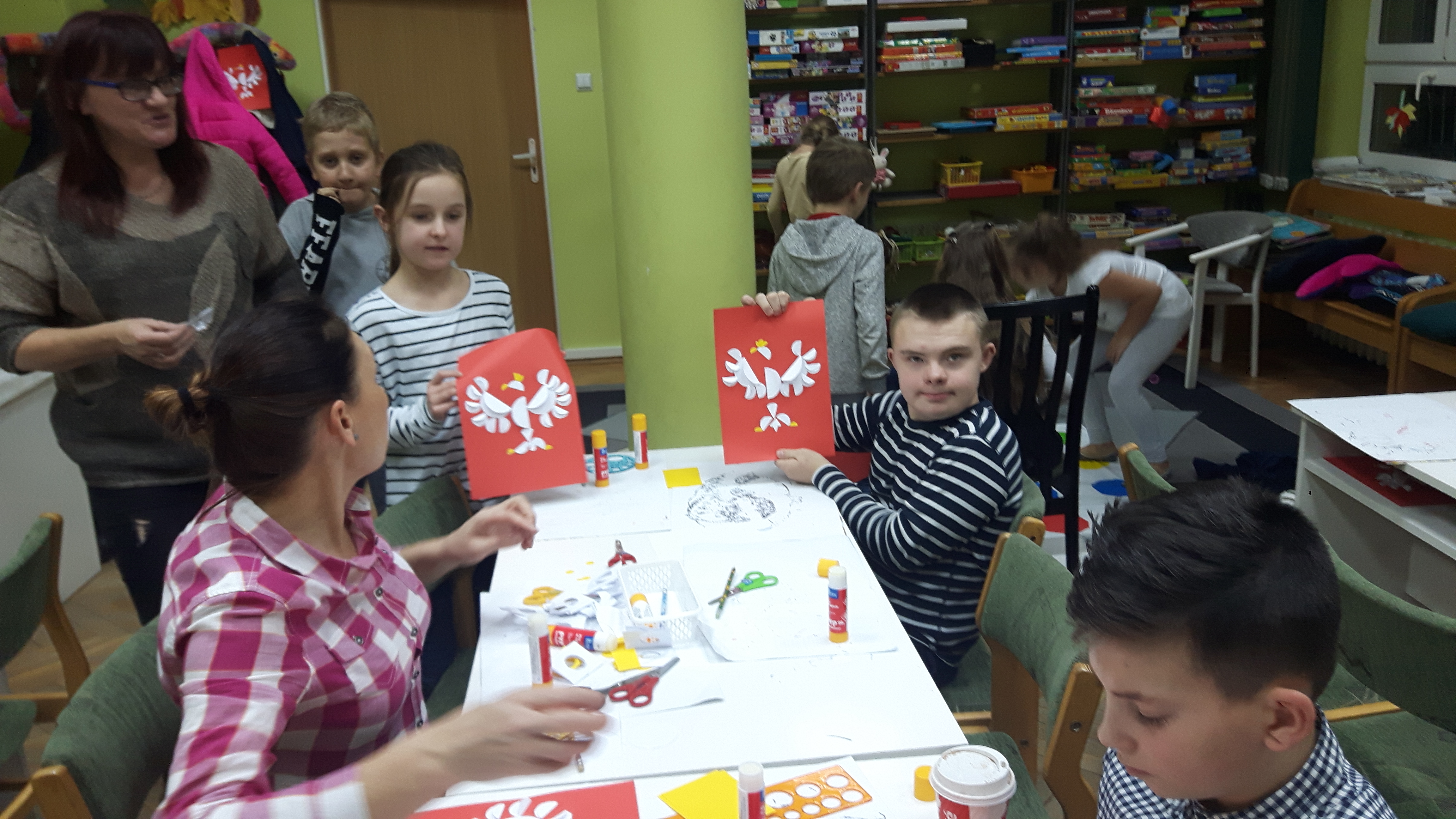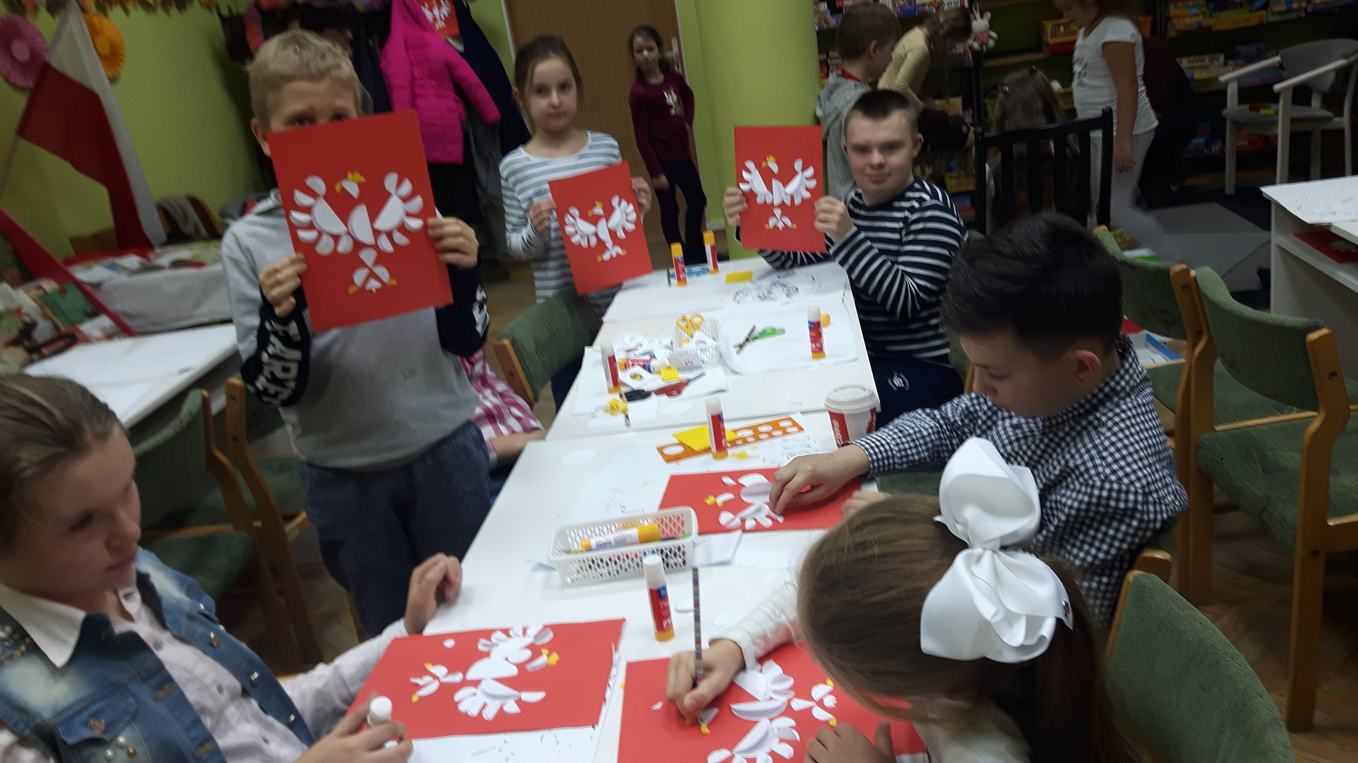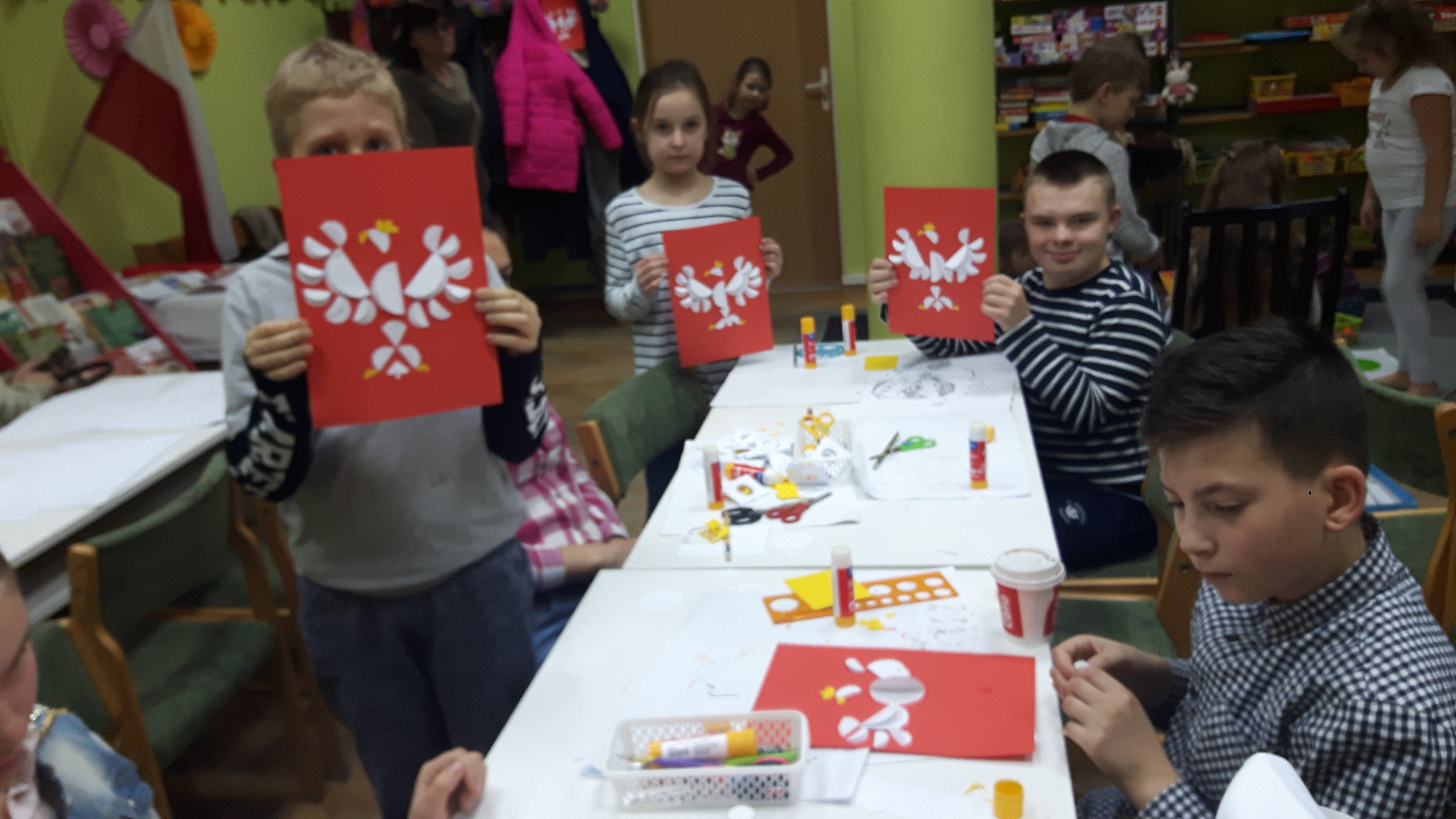 W klimacie zbliżającego się Święta Niepodległości, dnia 7 listopada uczniowie klas: 7 zesp. edukac.-terap. oraz 5/6 d SP uczestniczyli w popołudniowych zajęciach plastyczno-technicznych w Bibliotece Elbląskiej Filia nr 6 w Elblągu przy ul. Słonecznej. W ramach rozwijania zamiłowań artystycznych oraz pogłębiania poczucia tożsamości narodowej opartej na więzi z krajem, uczniowie koncentrowali uwagę na wyglądzie godła Polski, którego symbolikę wyraża Orzeł o szeroko rozpostartych skrzydłach i złotej koronie. Owoce twórczej ekspresji uczniów dowiodły, iż żadnej z owych wymownych cech- przymiotów narodowego godła nie zabrakło na kartach pracy, zresztą sami oceńcie. ..Udział dzieci w zajęciach pozalekcyjnych posłużył jako cenna metoda oglądowa w toku rozmów o genezie państwa polskiego w oparciu o legendę „O Lechu i białym orle”.