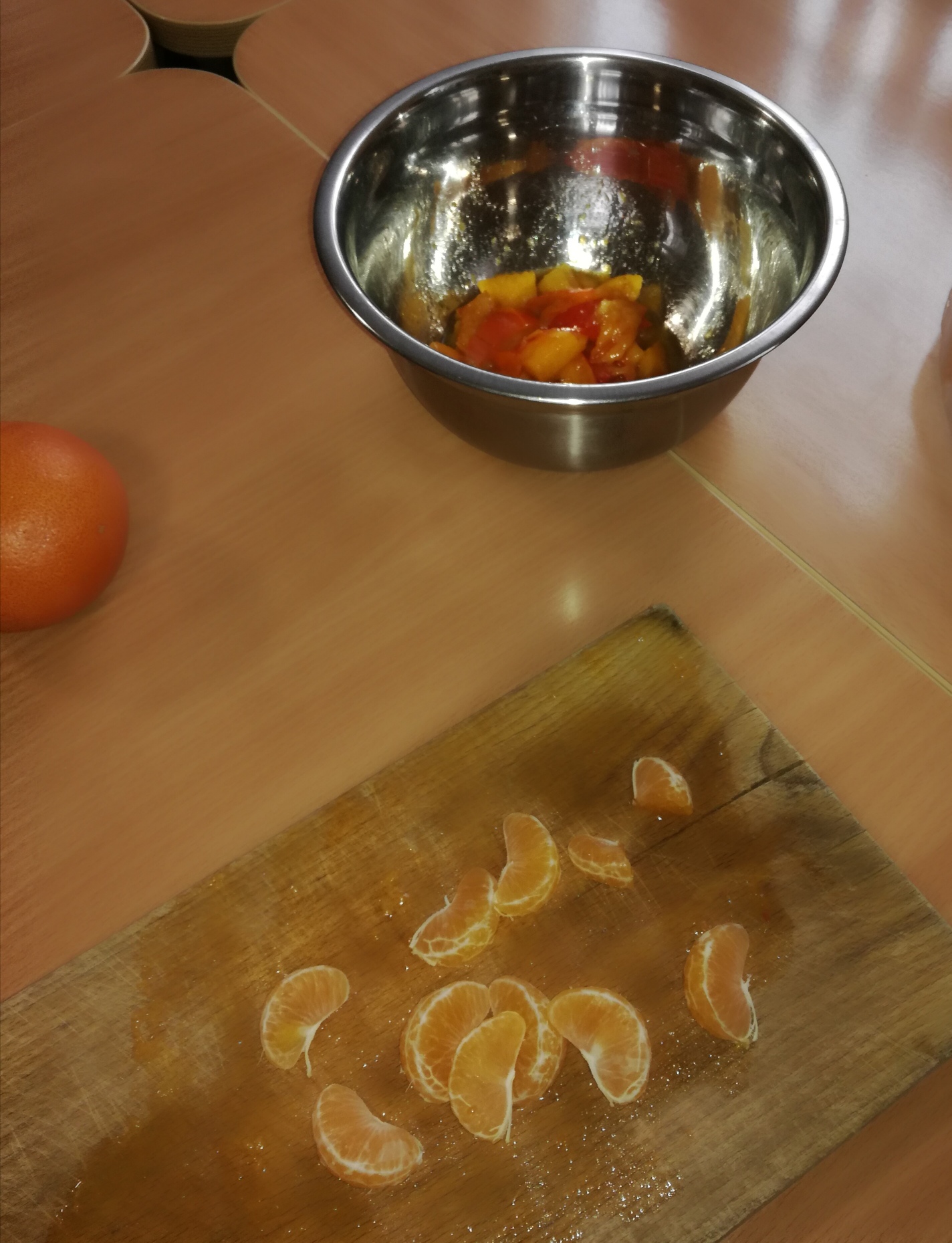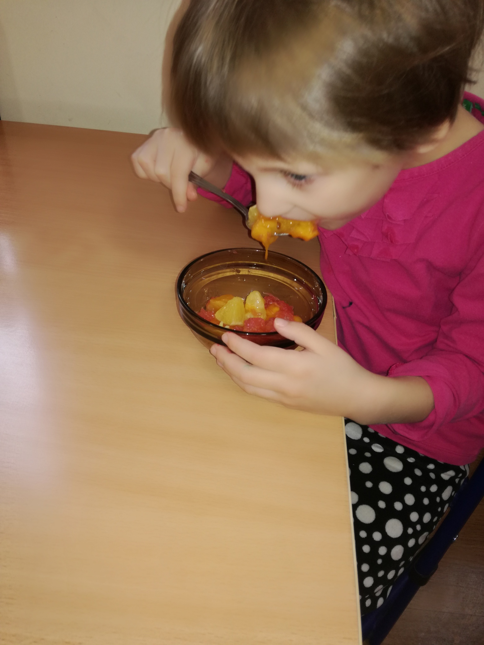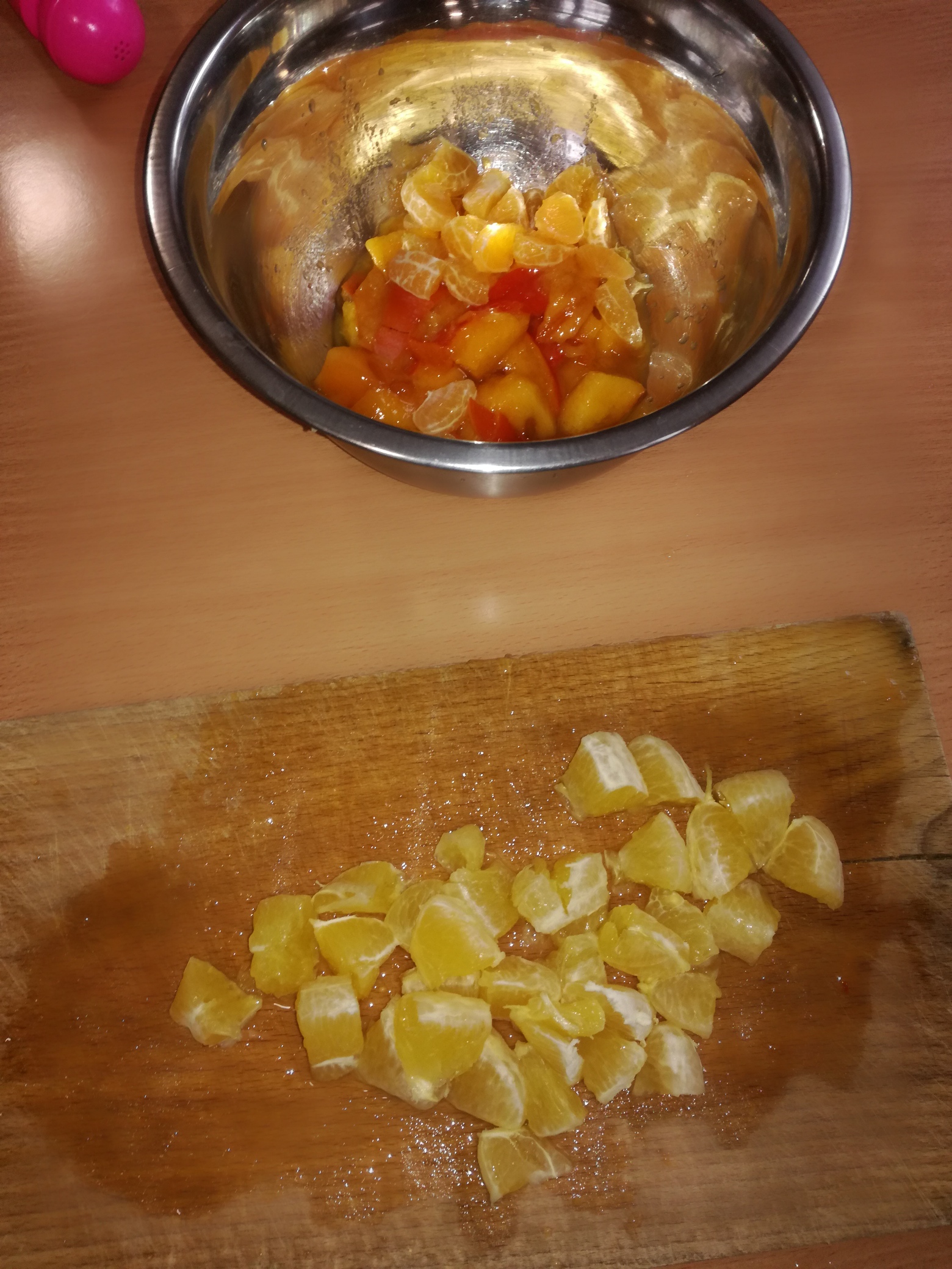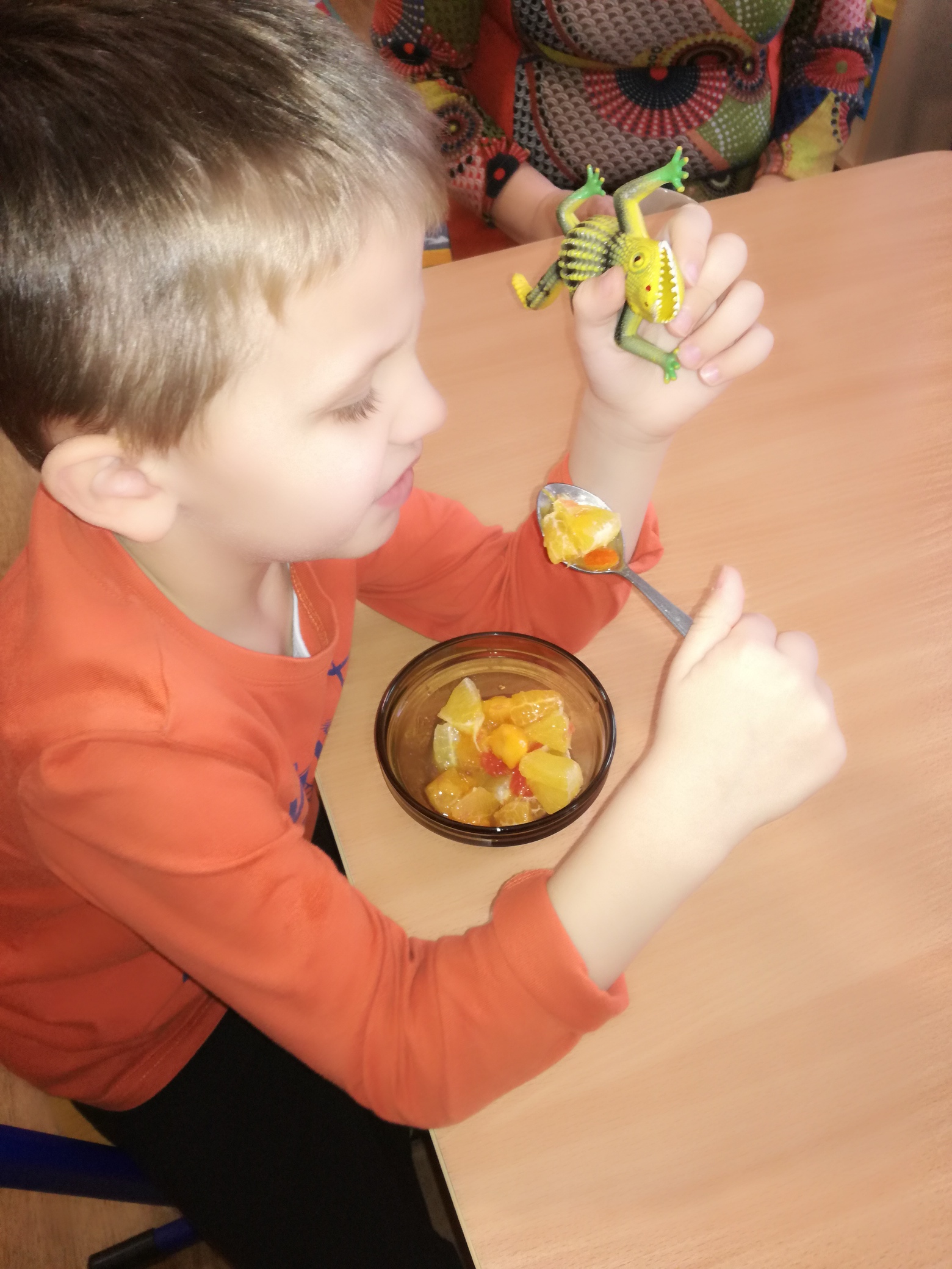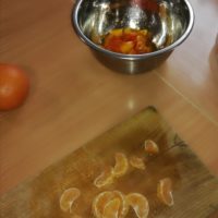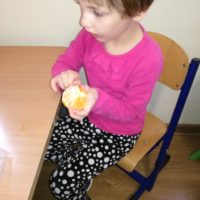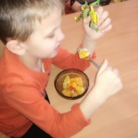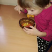 13 listopada było w naszym przedszkolu przesmacznie, a przede wszystkim zdrowo! Dzieci z grupy „Waleczne pszczółki” na zajęciach własnoręcznie przygotowały pyszną, witaminową sałatkę. Dzieci miały do dyspozycji różne pomarańczowe świeże owoce. Były kaki, pomarańcze, mandarynki, brzoskwinie a nawet grejpfrut . Wszyscy mieli soczyste minki na widok tak smakowitych owoców i każdy ochoczo zabrał się do pracy. Dokładnie umyliśmy rączki, a następnie posegregowaliśmy umyte wcześniej przez panią owoce. Każdy dostał swój owoc i tak przystąpiliśmy do obierania. Pani pomogła w krojeniu cząstek owoców. Przyrządzanie sałatki dało dzieciom wiele satysfakcji jednocześnie uświadamiając jak ważną rolę odgrywają witaminy we właściwym funkcjonowaniu organizmu. Sałatka udała się, wyszła wspaniale!
