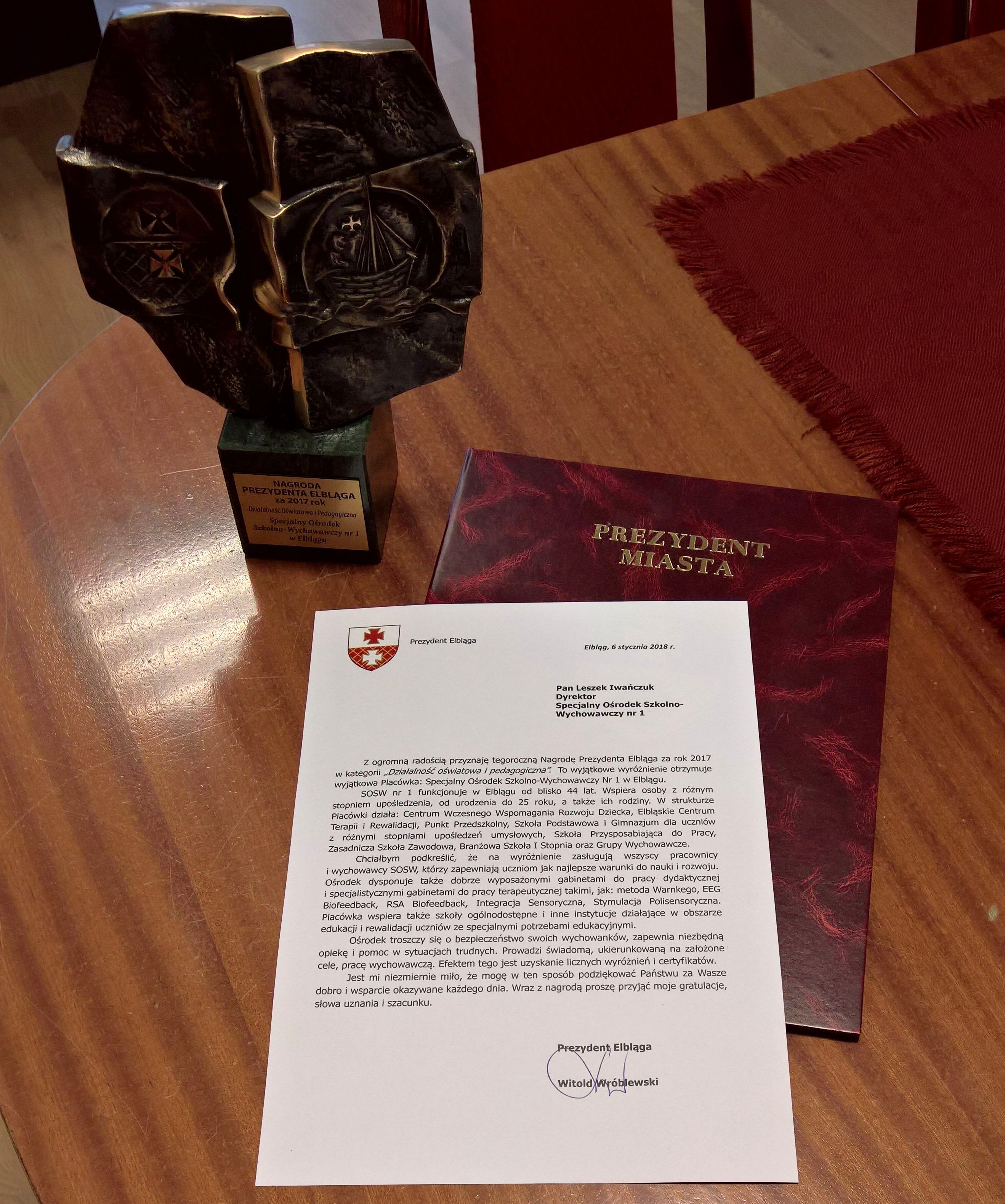 Tradycyjnie w wieczór Trzech Króli w Teatrze im. Aleksandra Sewruka odbył się Koncert Noworoczny, podczas którego Prezydent Miasta Elbląg Witold Wróblewski wręczył nagrody za wybitne osiągnięcia w pracy na rzecz społeczności i rozwoju naszego miasta. W gronie wyróżnionych laureatów znalazł się Specjalny Ośrodek Szkolno – Wychowawczy nr 1. To wspaniałe podsumowanie pracy nas Wszystkich i Naszych Poprzedników. Gratuluję tego sukcesu Uczniom, Nauczycielom, Pracownikom administracji i obsługi, Rodzicom i Opiekunom, Przyjaciołom i Partnerom naszej placówki. Niech to będzie piękne podsumowanie naszych dotychczasowych, wspólnych działań oraz impuls do dalszej pracy. Jestem dumny, że los pozwolił mi kierować tak wyjątkowym zespołem wspaniałych ludzi.