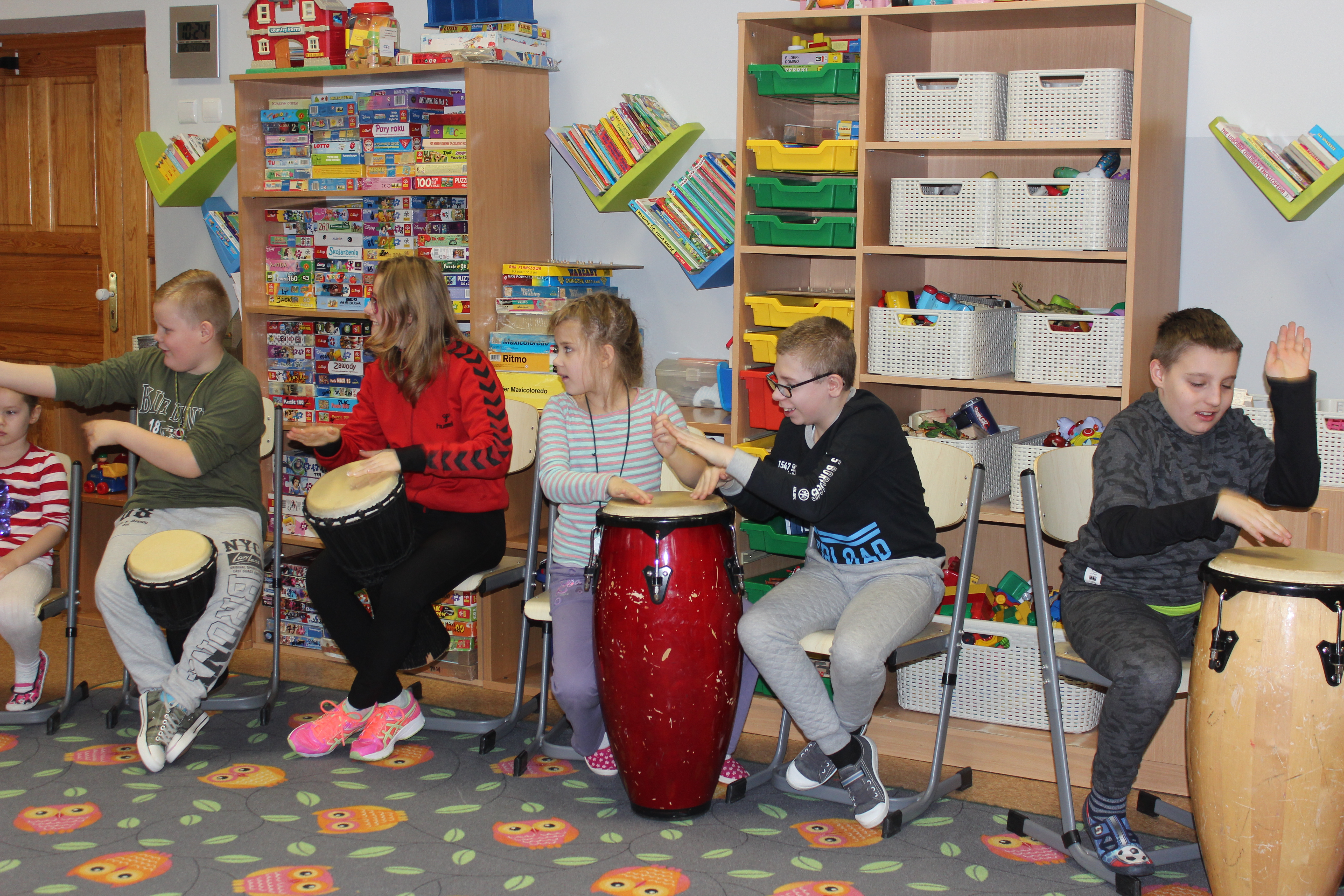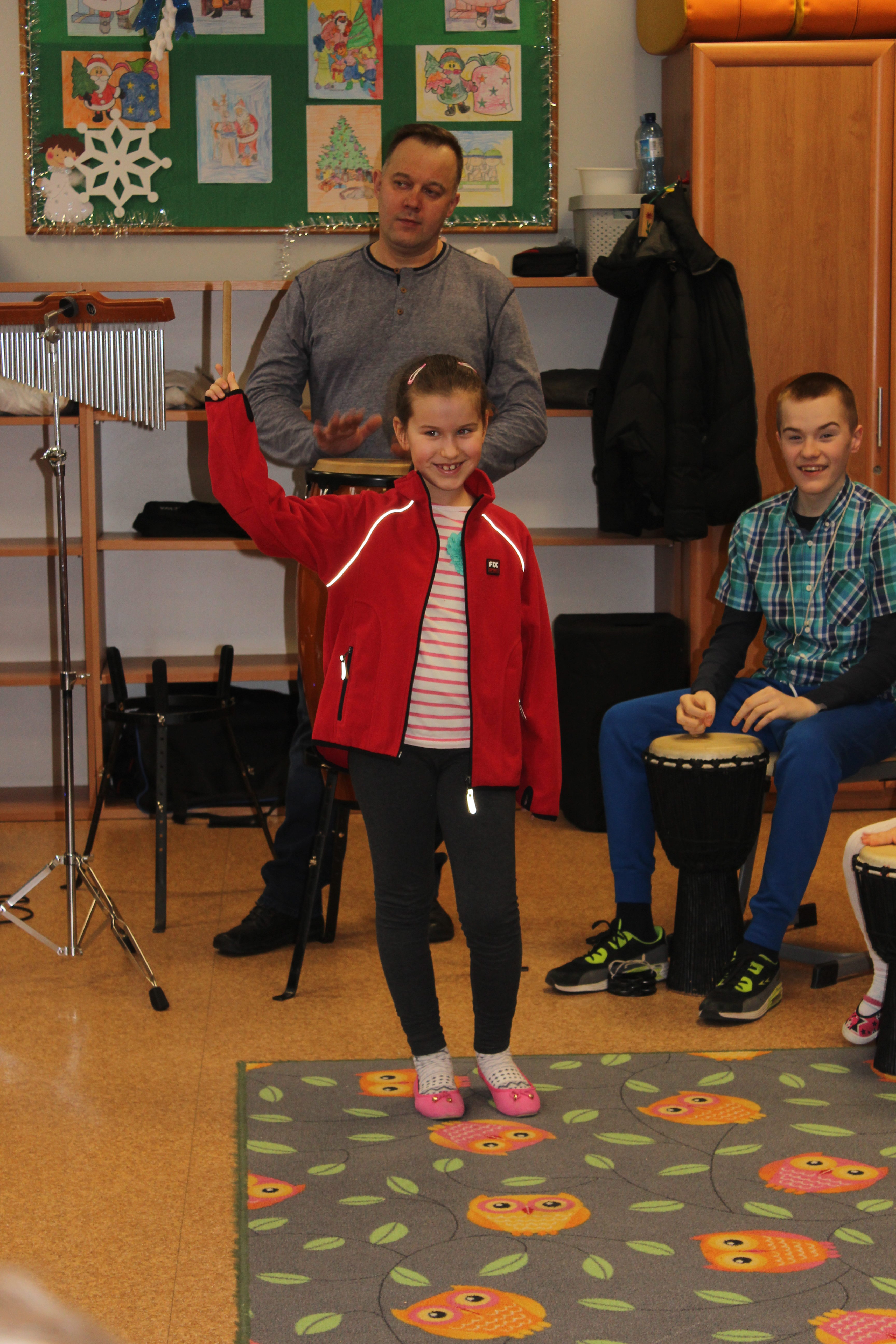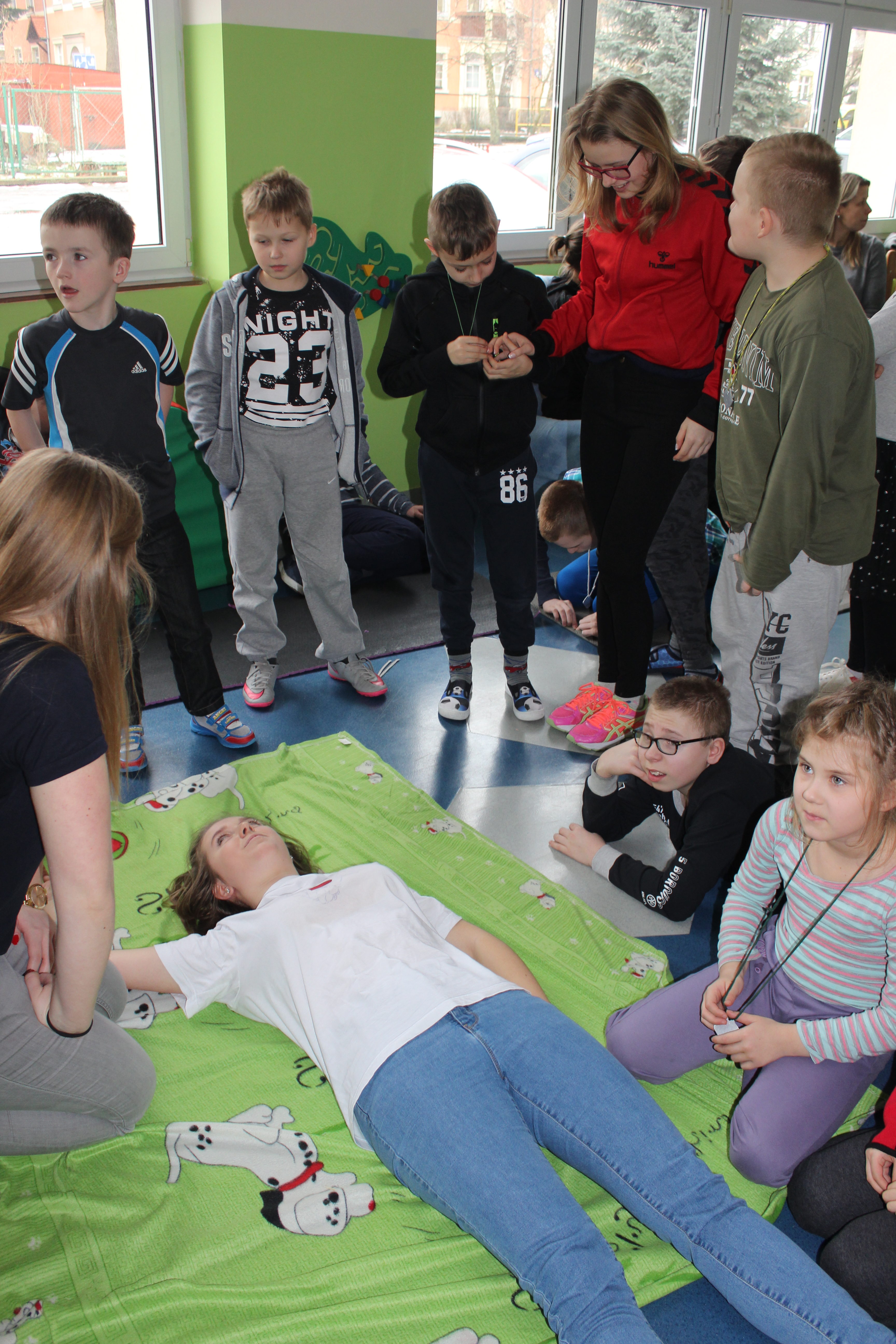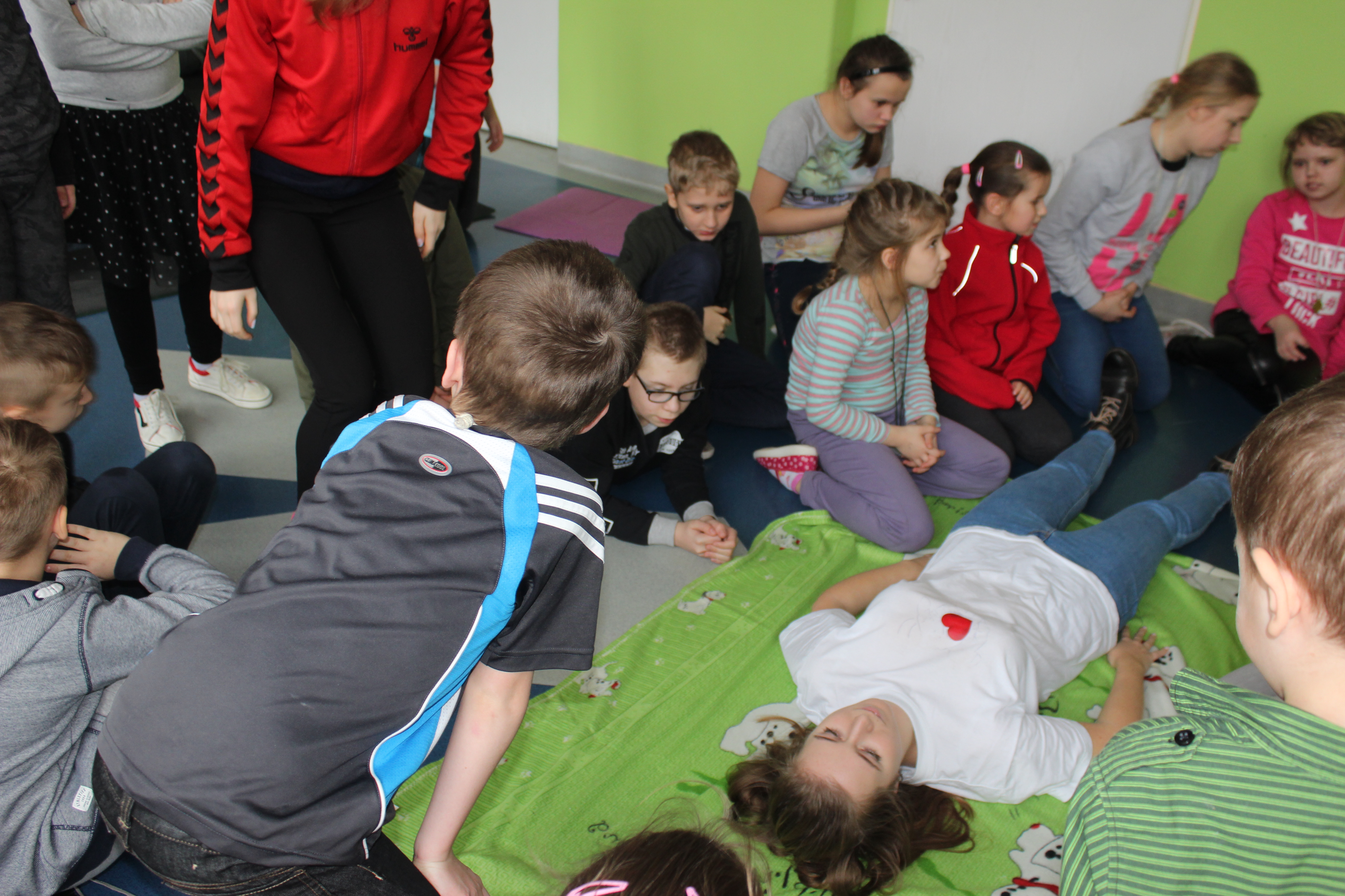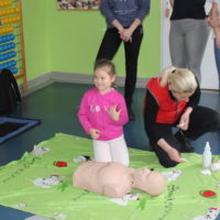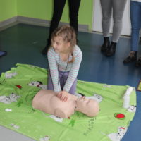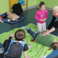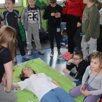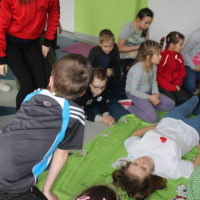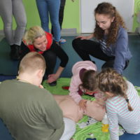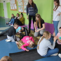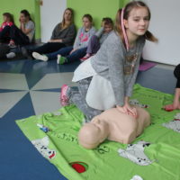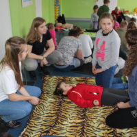 Dzisiejszy dzień obfitował wieloma atrakcjami. Odbyły się warsztaty bębniarskie, podczas których każde dziecko mogło wykazać się muzyczną inwencją twórczą. Następnie, dzięki uprzejmości Ratowniczki Medycznej, p. Angeliki i jej żeńskiej ekipie specjalistek, uczestniczyliśmy w praktycznych zajęciach z wykorzystaniem fantomów. Każdy uczestnik nabywał umiejętność udzielania I pomocy przedmedycznej. Po ogromnym skupieniu na tak ważnej i odpowiedzialnej sprawności, nasi podopieczni dali się ponownie ponieść muzyce. Tym razem, podczas aktywności tanecznej -Sumba Kids.