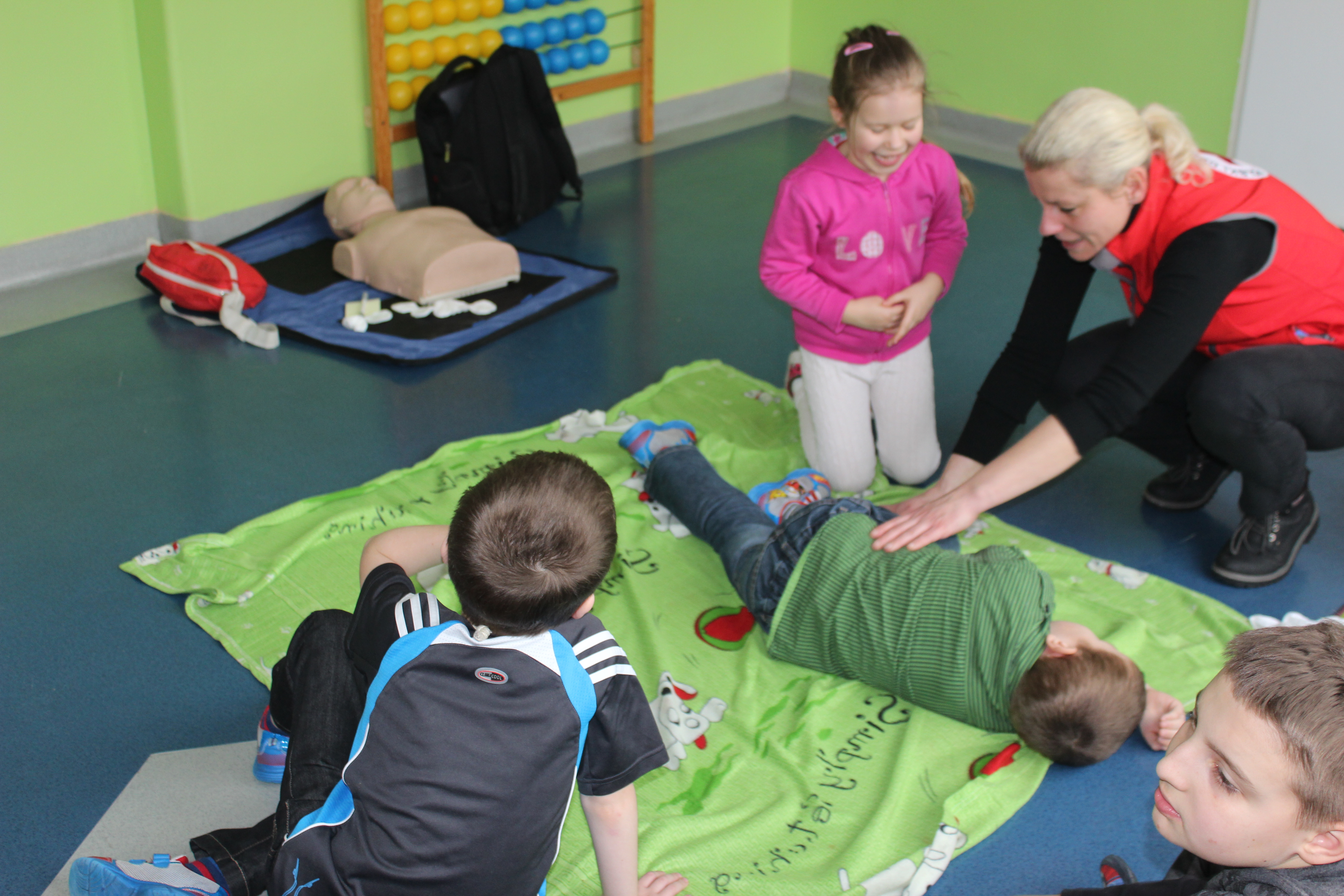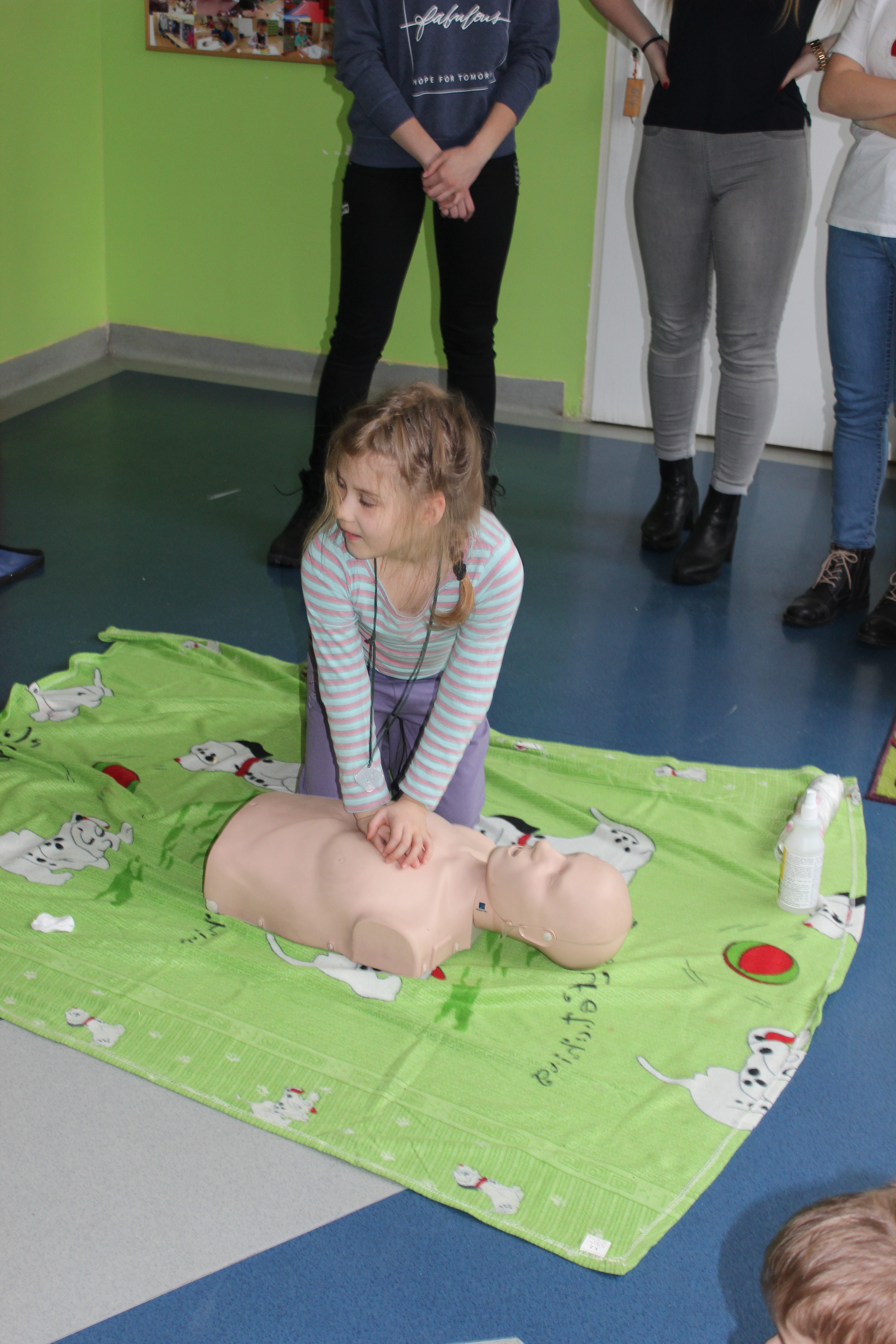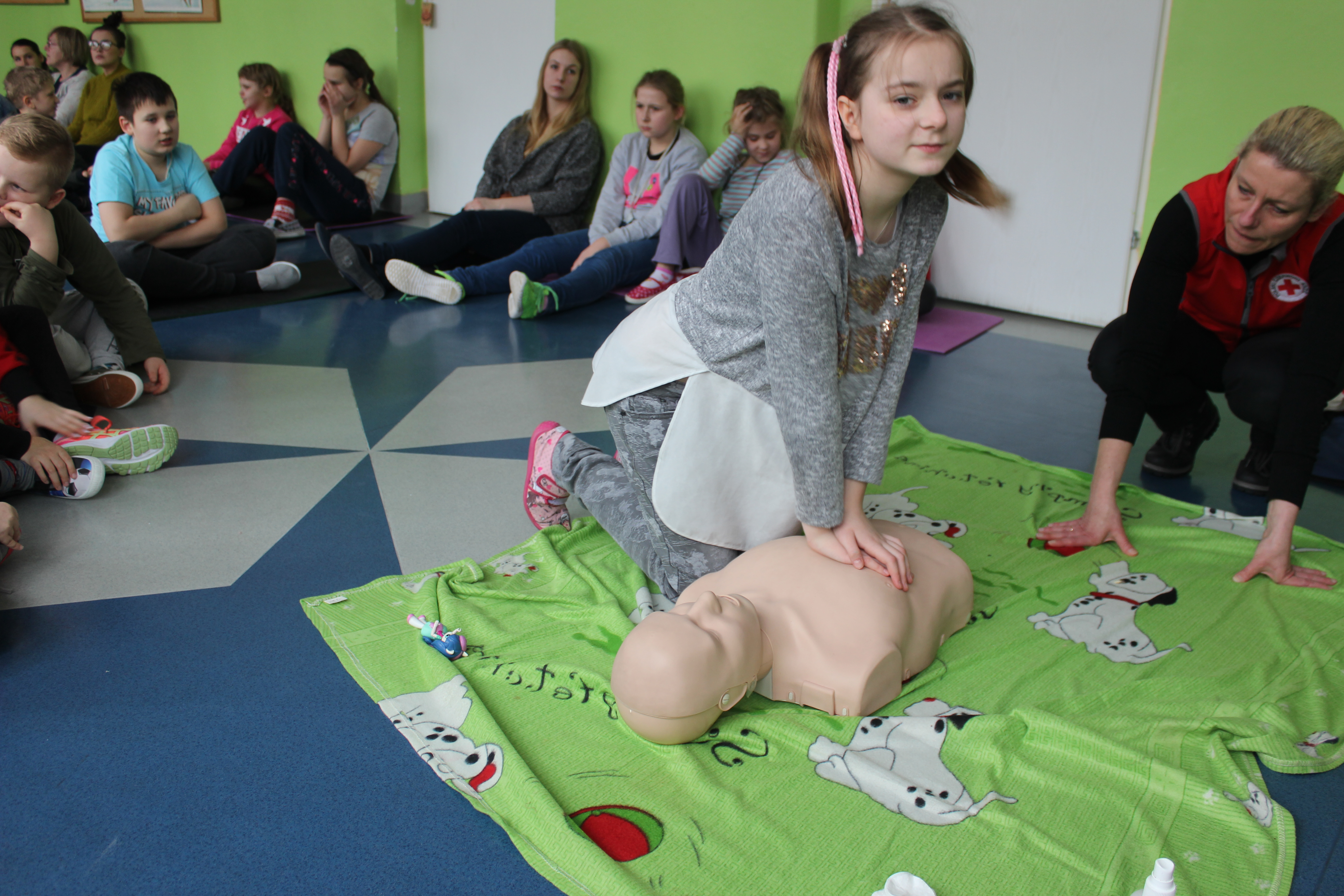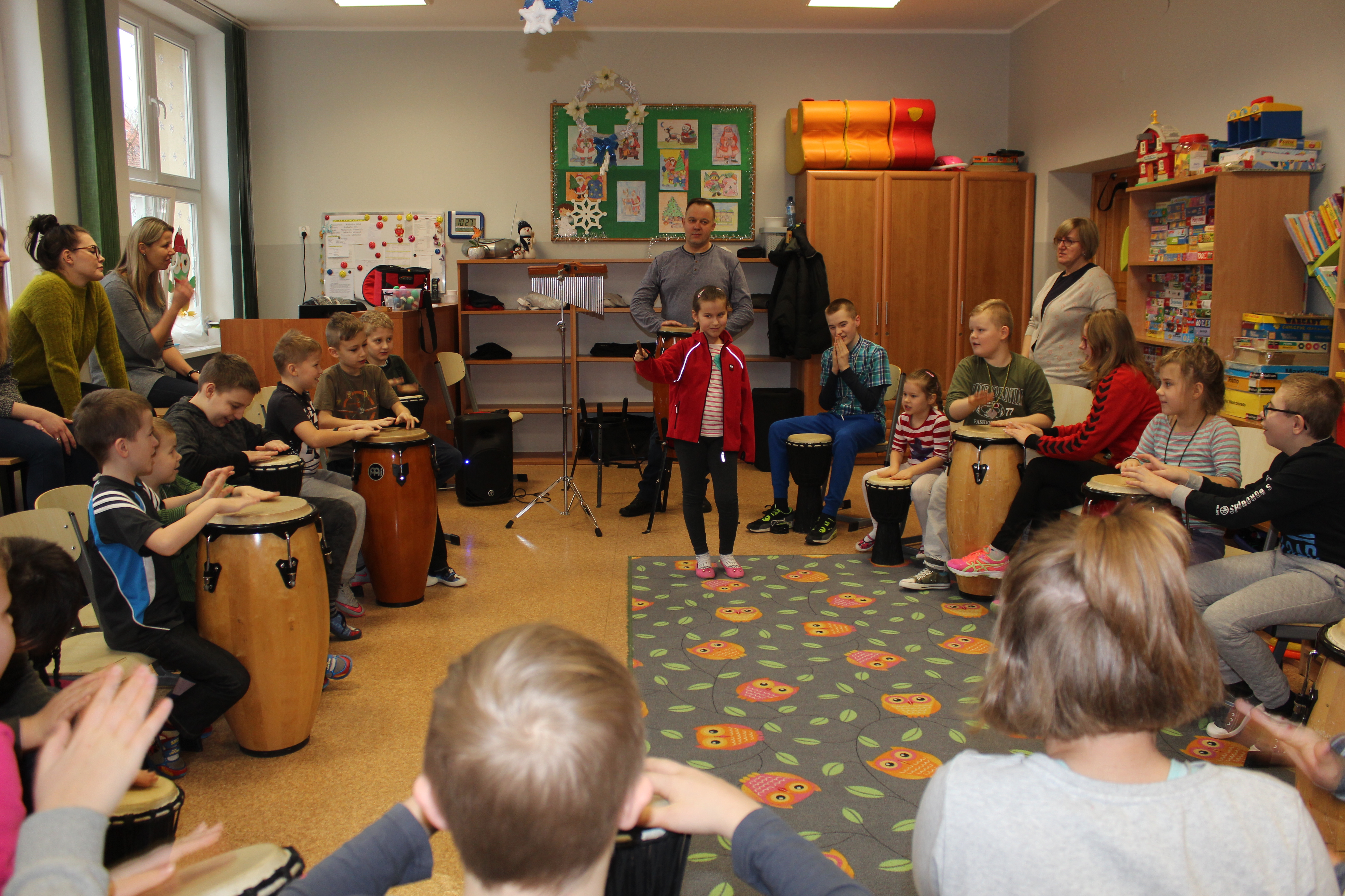 Dzisiejszy dzień obfitował wieloma atrakcjami. Odbyły się warsztaty bębniarskie, podczas których każde dziecko mogło wykazać się muzyczną inwencją twórczą. Następnie, dzięki uprzejmości Ratowniczki Medycznej, p. Angeliki i jej żeńskiej ekipie specjalistek, uczestniczyliśmy w praktycznych zajęciach z wykorzystaniem fantomów. Każdy uczestnik nabywał umiejętność udzielania I pomocy przedmedycznej. Po ogromnym skupieniu na tak ważnej i odpowiedzialnej sprawności, nasi podopieczni dali się ponownie ponieść muzyce. Tym razem, podczas aktywności tanecznej -Sumba Kids.