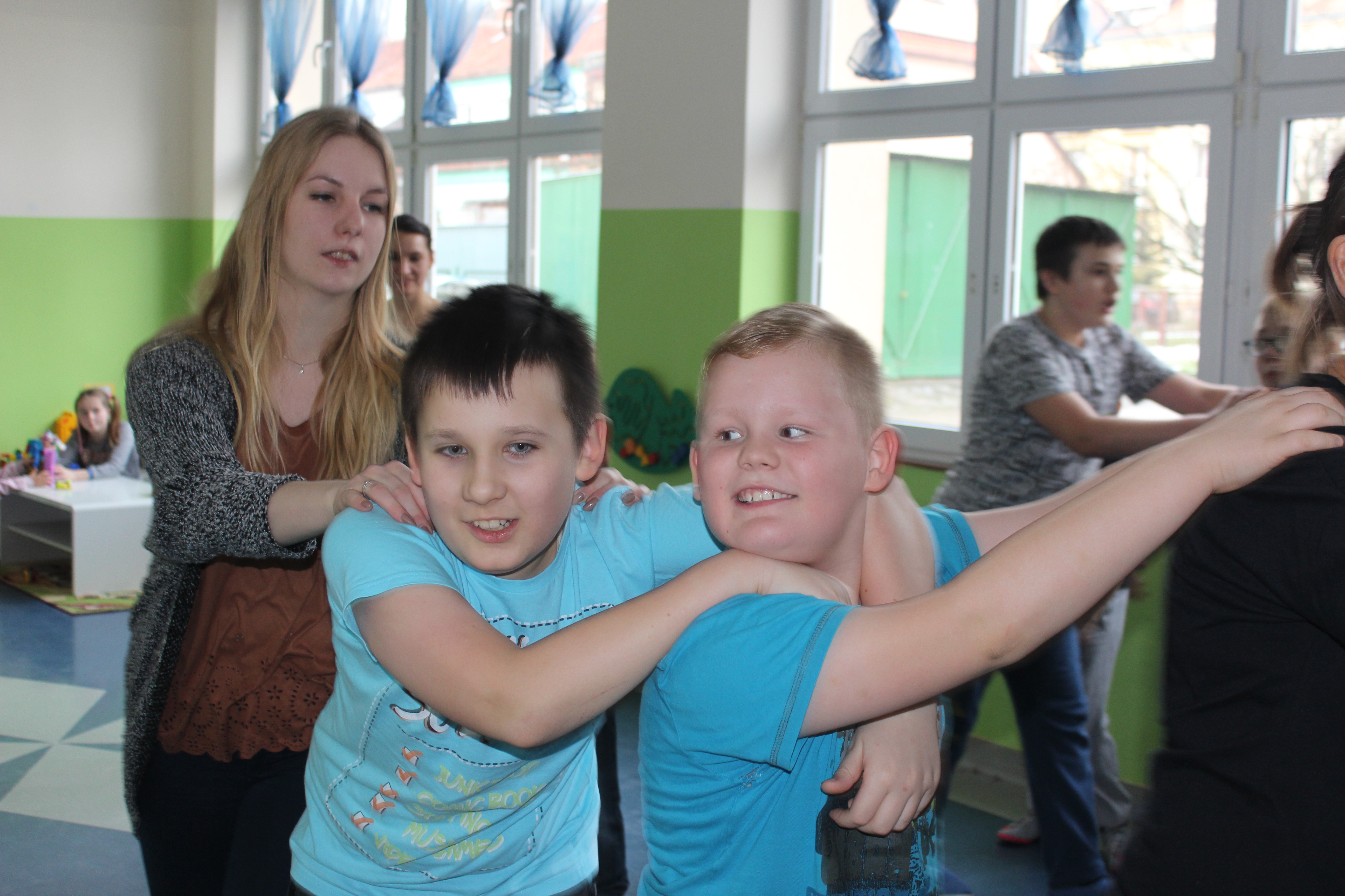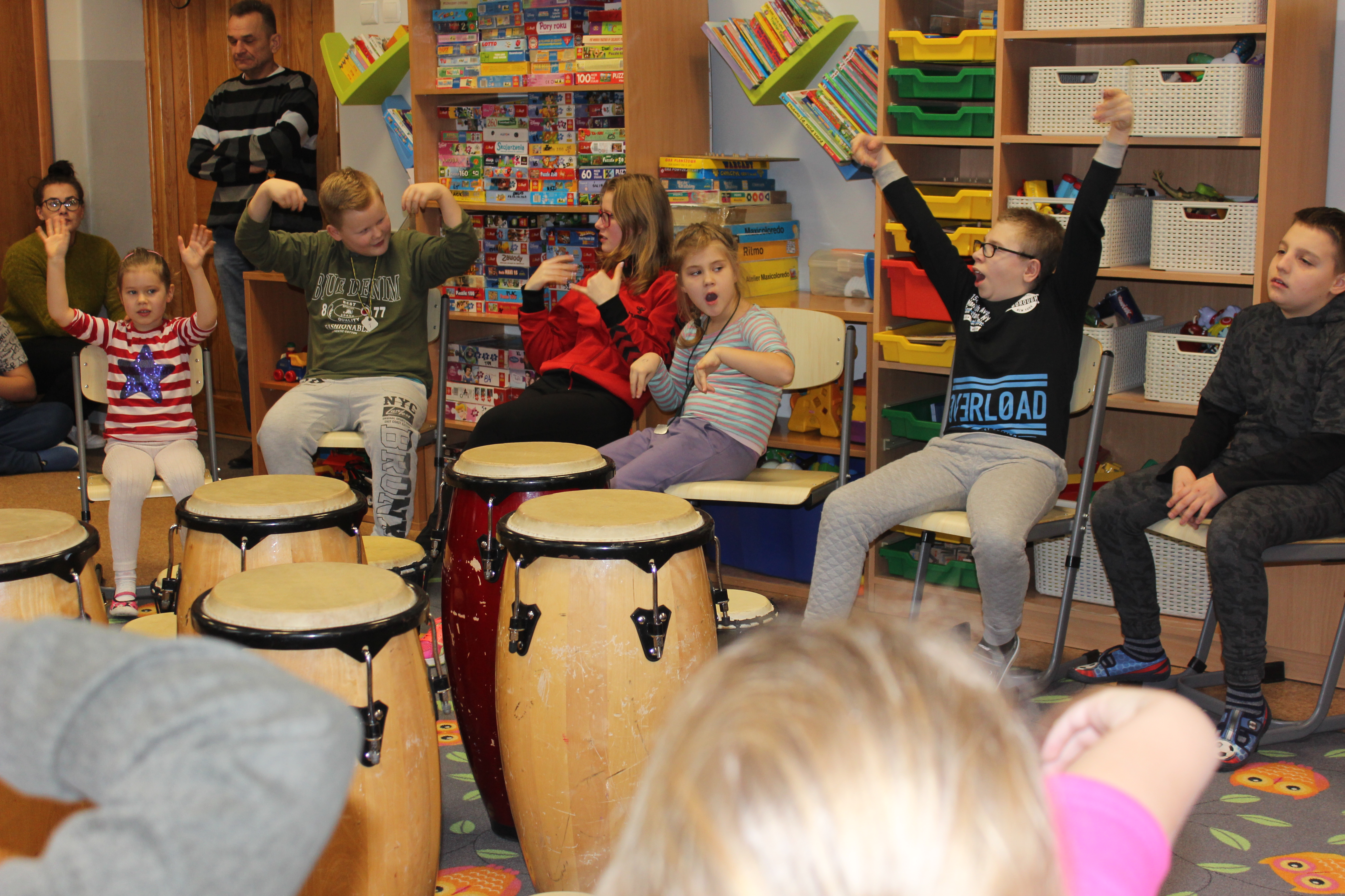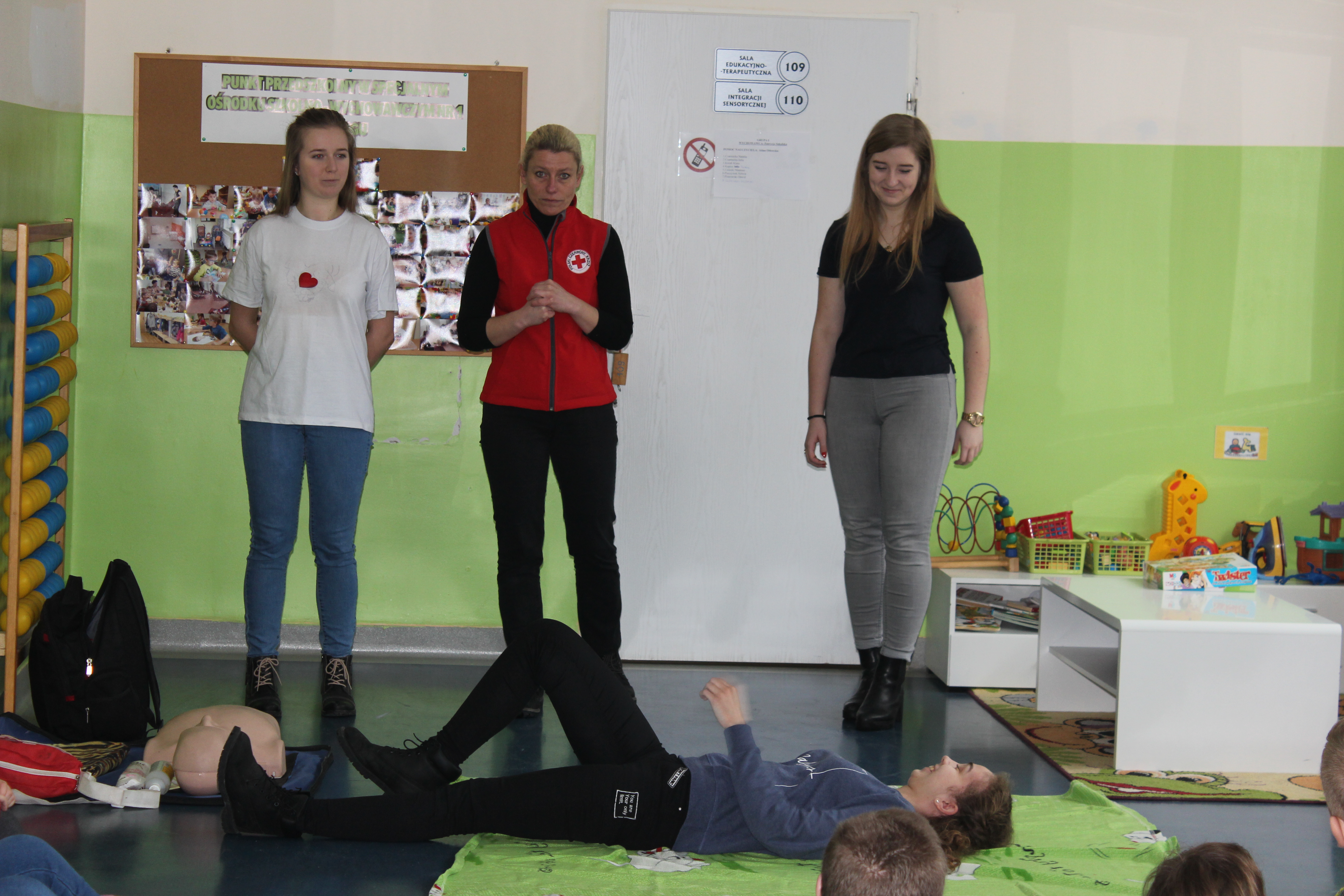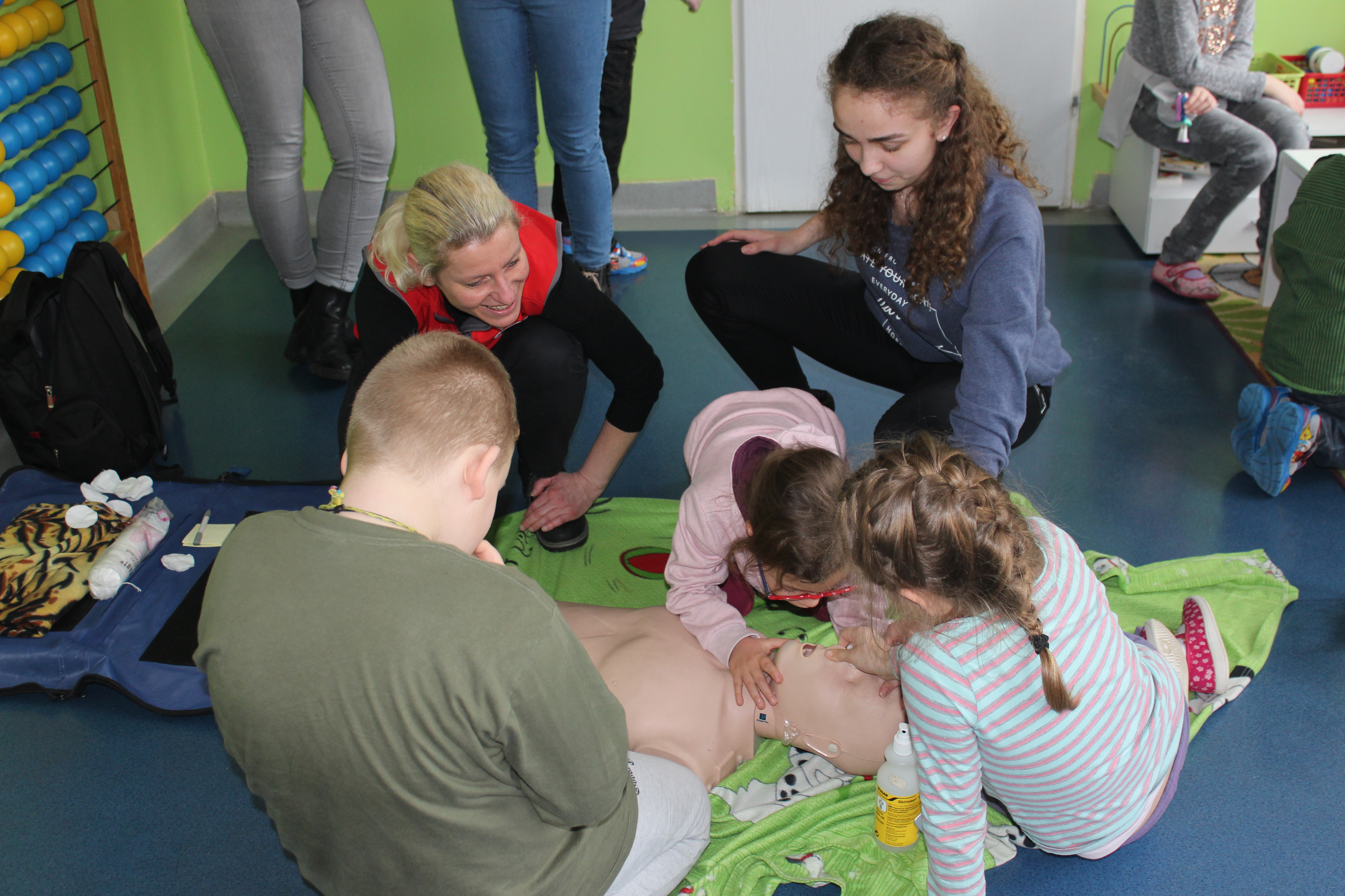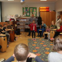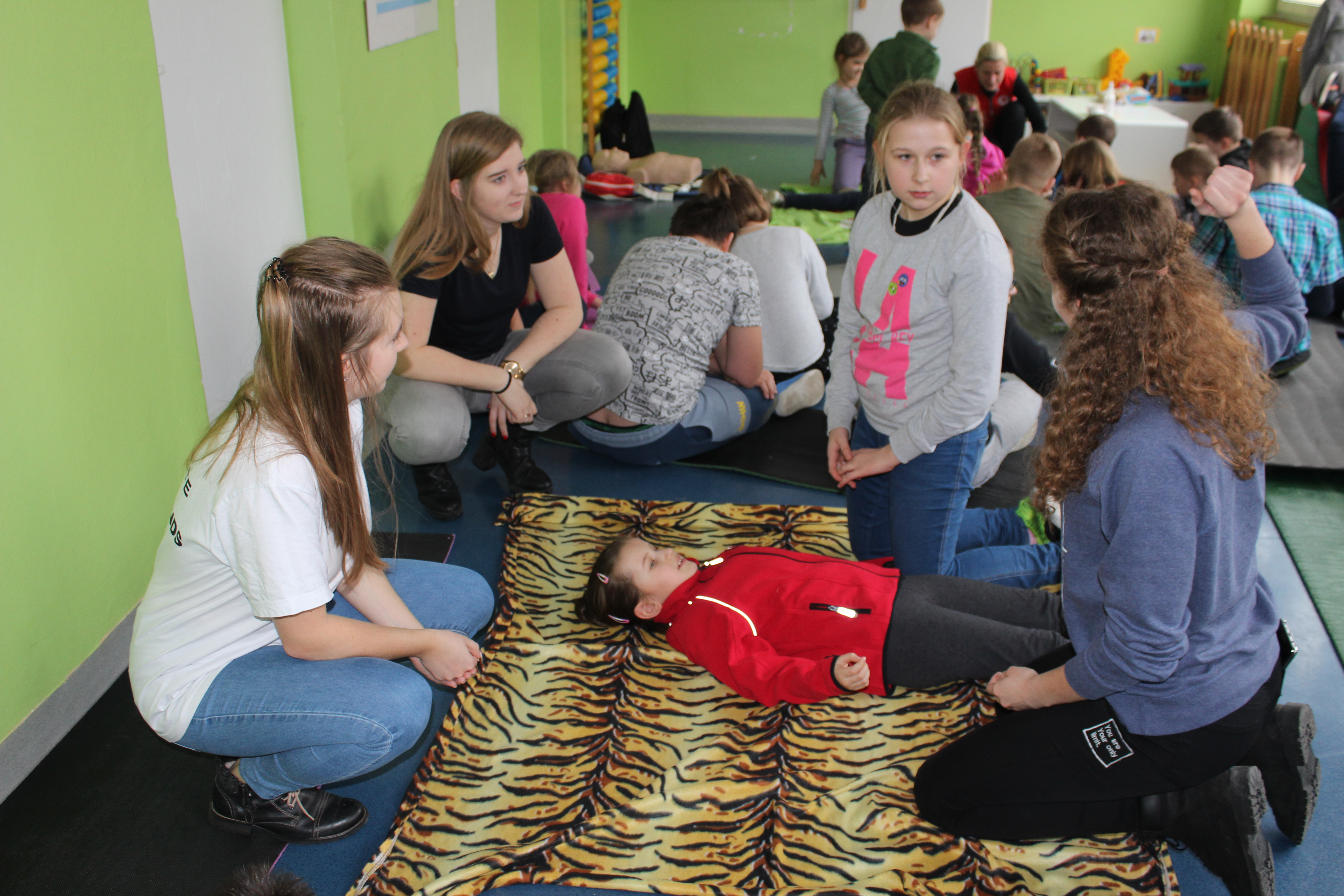 Dzisiejszy dzień obfitował wieloma atrakcjami. Odbyły się warsztaty bębniarskie, podczas których każde dziecko mogło wykazać się muzyczną inwencją twórczą. Następnie, dzięki uprzejmości Ratowniczki Medycznej, p. Angeliki i jej żeńskiej ekipie specjalistek, uczestniczyliśmy w praktycznych zajęciach z wykorzystaniem fantomów. Każdy uczestnik nabywał umiejętność udzielania I pomocy przedmedycznej. Po ogromnym skupieniu na tak ważnej i odpowiedzialnej sprawności, nasi podopieczni dali się ponownie ponieść muzyce. Tym razem, podczas aktywności tanecznej -Sumba Kids.