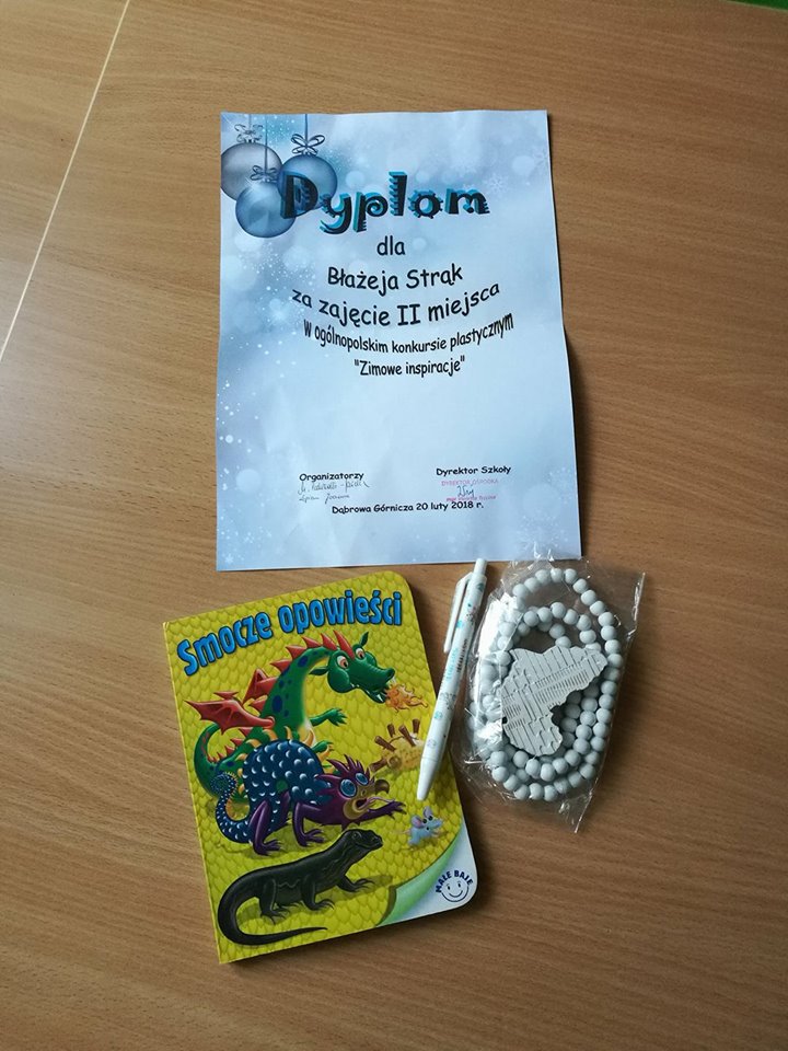 W lutym grupa Walecznych pszczółek brała udział w ogólnopolskim konkursie plastycznym „Zimowe Inspiracje” organizowanym przez Zespół Szkół Specjalnych nr 5 w Dąbrowie Górniczej. Szymon, Olek oraz Błażej z pomocą nauczyciela stworzyli prace plastyczne o tematyce zimowej. Szymon -bałwanka, Olek- zimowe rękawiczki a Błażej- pingwiny. Praca naszego Błażeja zajęła 2 miejsce! Gratulujemy 😉 A oto zdjęcia z tworzenia naszych prac konkursowych oraz nagroda przysłana dla zwycięzcy.