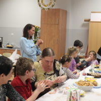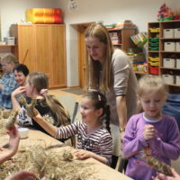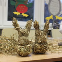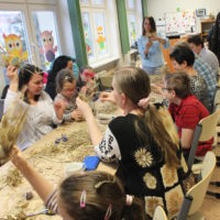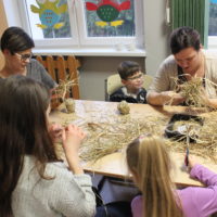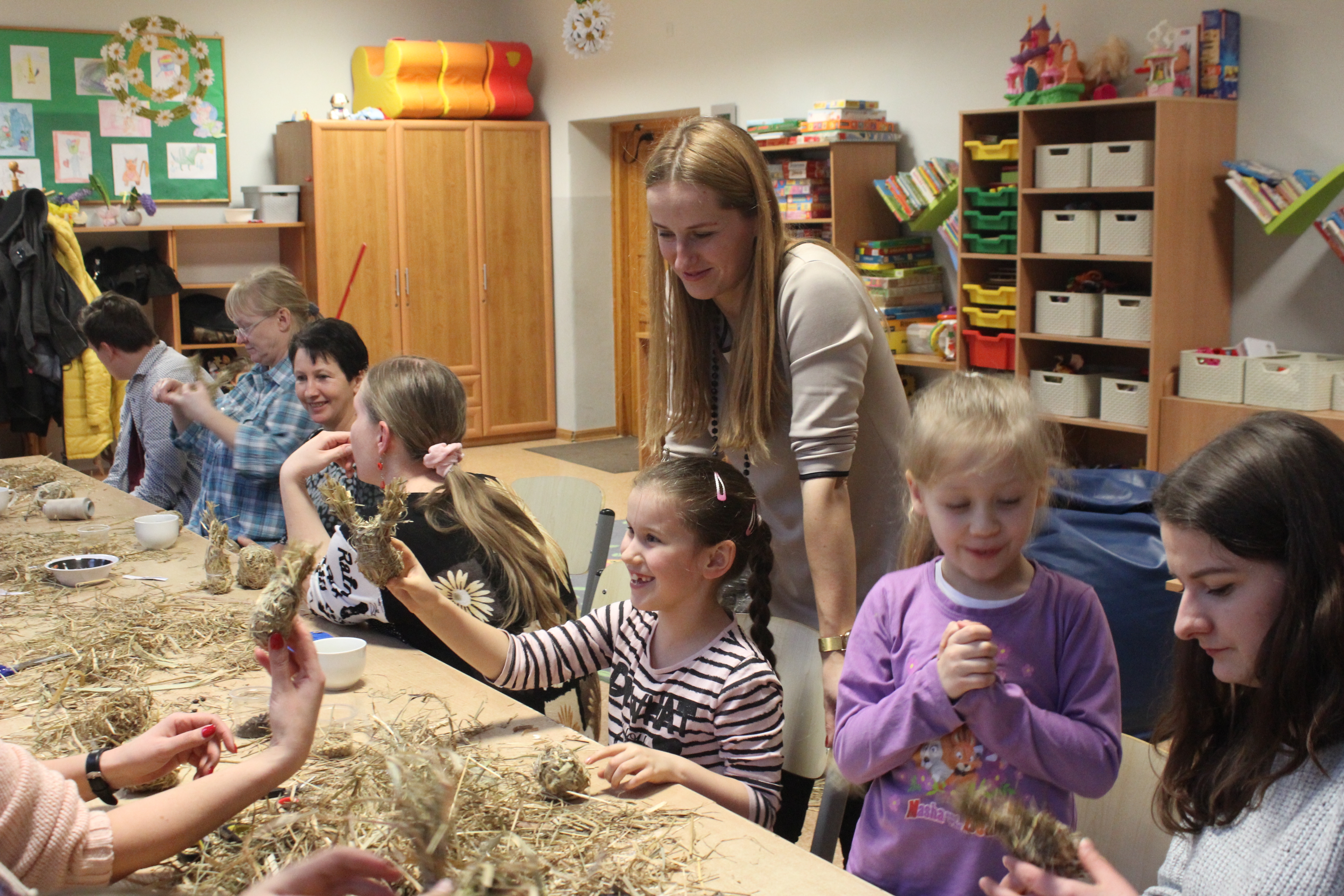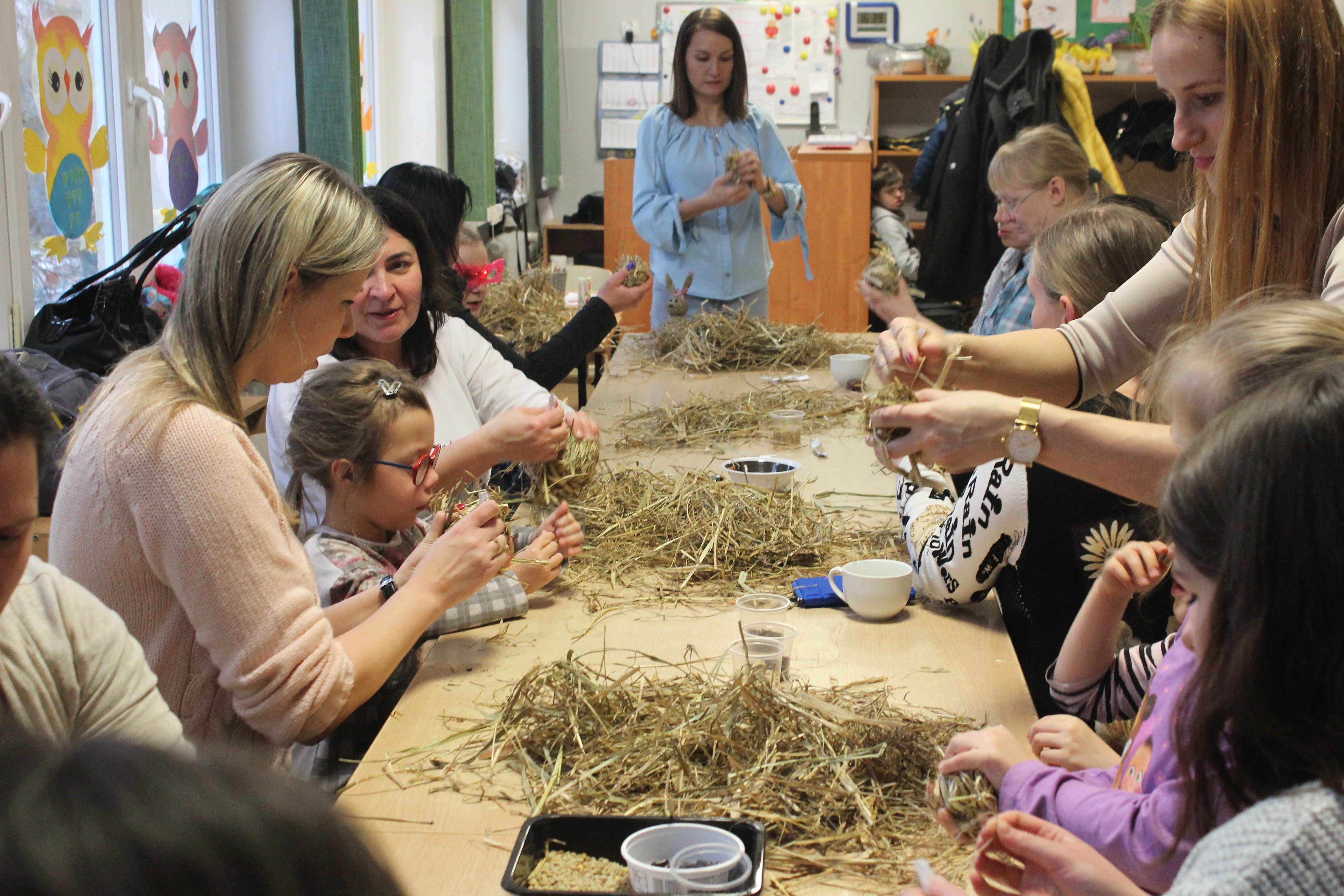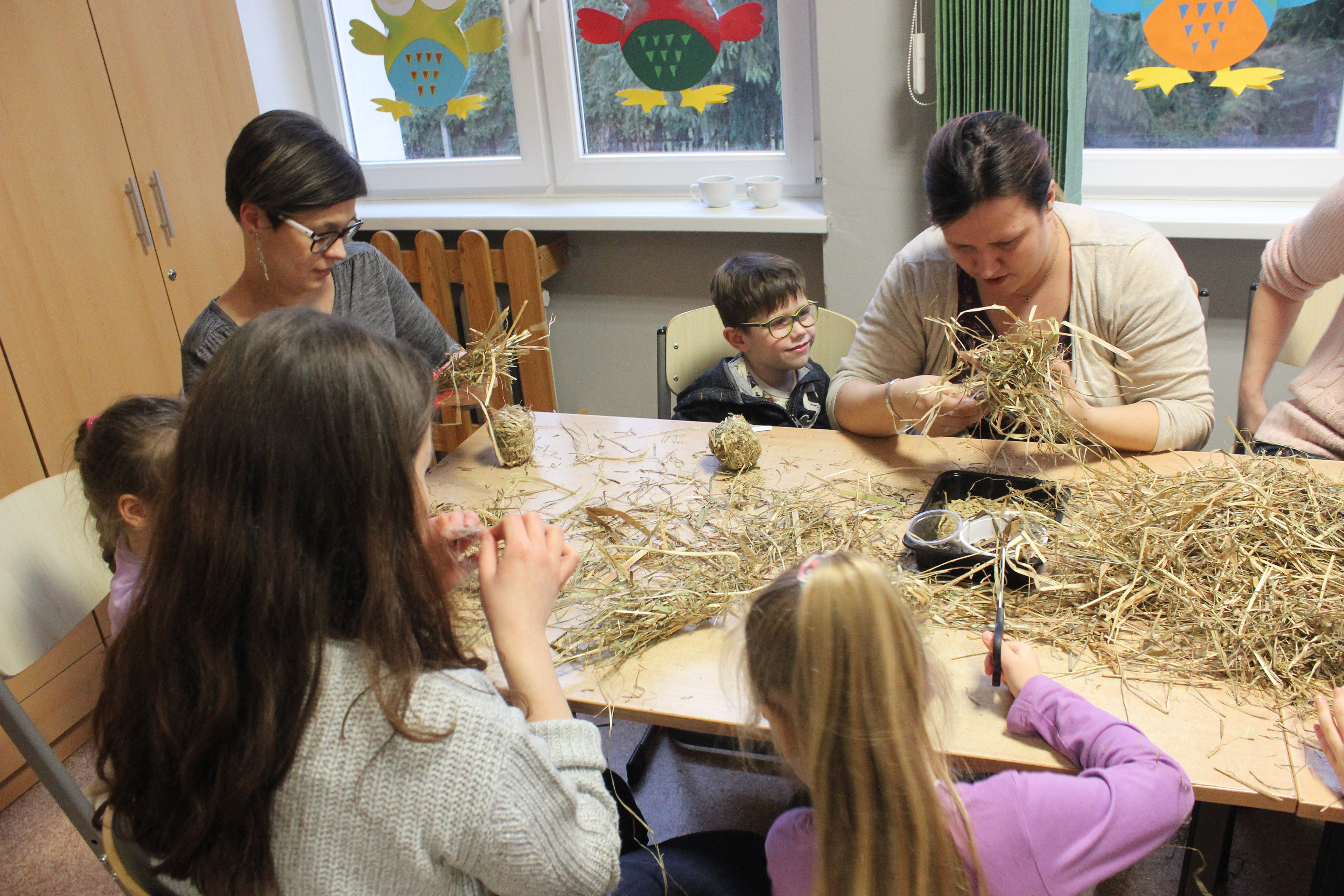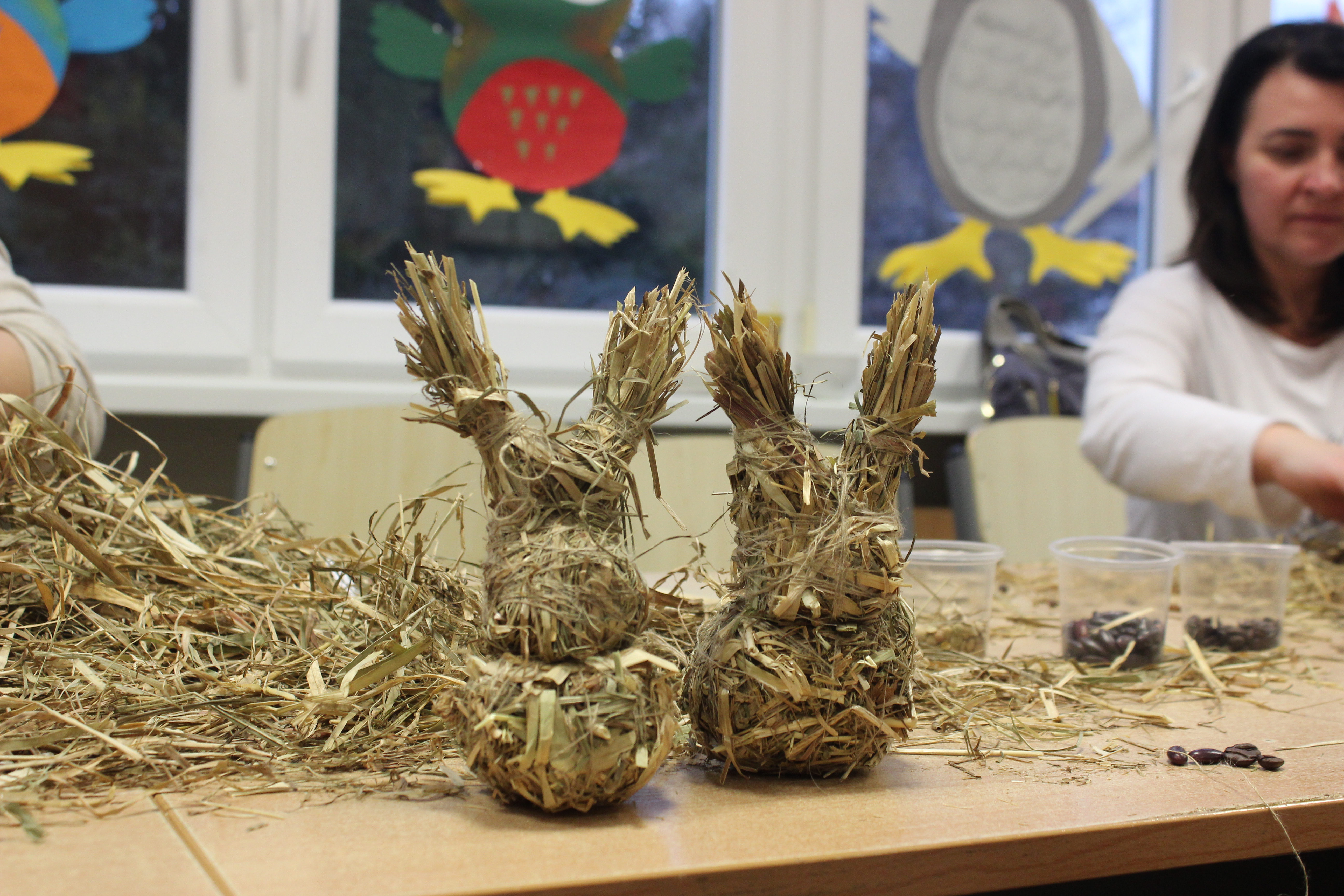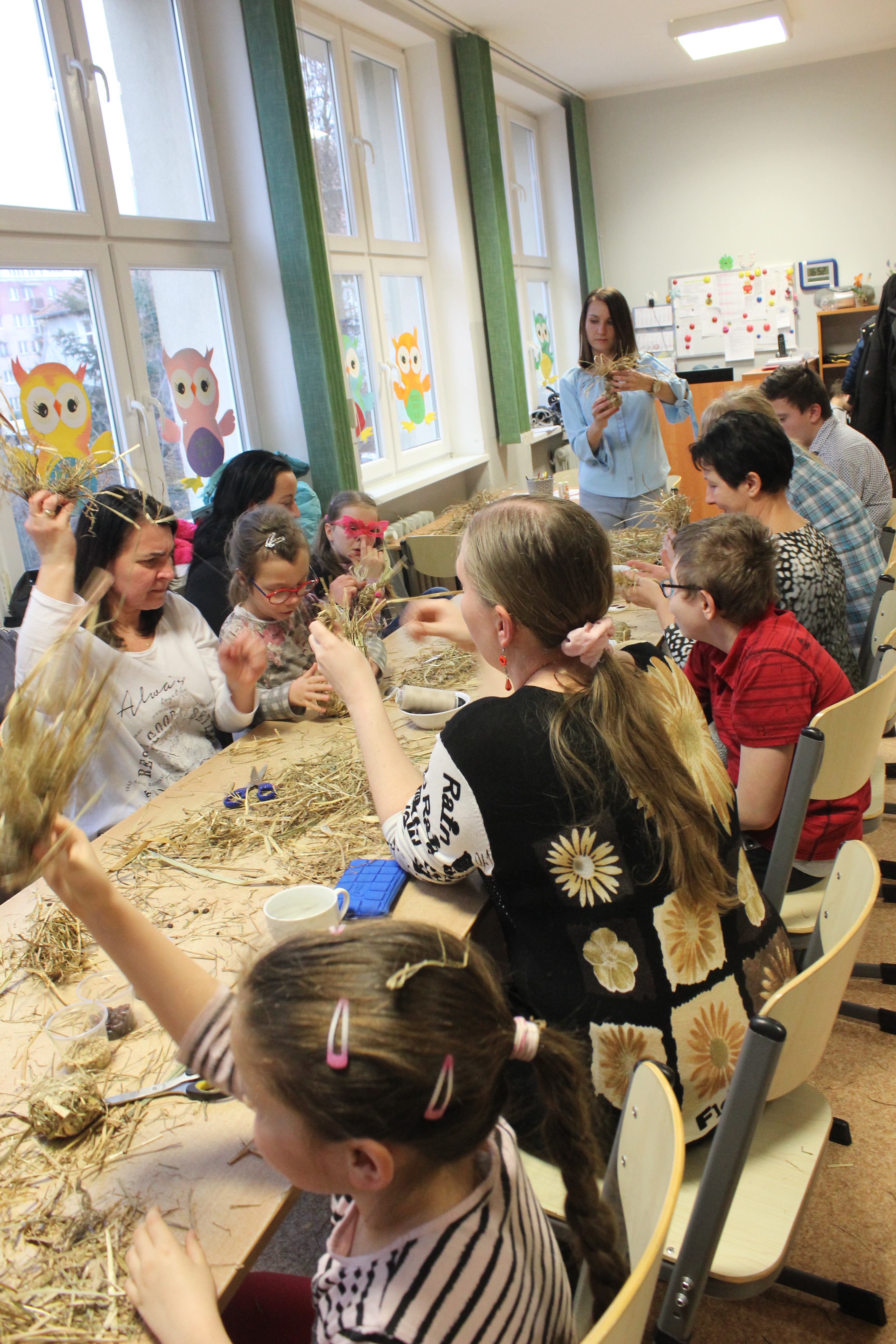 22 marca nauczyciele świetlicy wraz z uczniami i ich rodzicami, opiekunami spotkali się na Integracyjnych Warsztatach Wielkanocnych. Spotkanie było bogate w wiele atrakcji. Jedną z nich było wykonanie króliczków wielkanocnych z sianka. Kolejno podzieleni na drużyny uczestnicy otrzymali tajemnicze koperty z wierszowanymi wskazówkami od Zajączka Wielkanocnego. U celu poszukiwań znajdowały się kosze z niespodziankami. Odnalezione skarby były niezbędne do dalszej części zajęć. Jedną z kolejnych atrakcji był konkurs na najtwardszą skorupkę wielkanocnego jajka, które odnalazła jedna z grup w koszu. Inne grupy znalazły upominki dla każdego dziecka oraz kosz babeczek, które wśród innych słodkości zagościły na naszym stole. Całe spotkanie upłynęło w świątecznej i rodzinnej atmosferze, aż żal było się rozstać… .