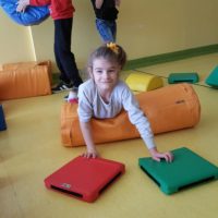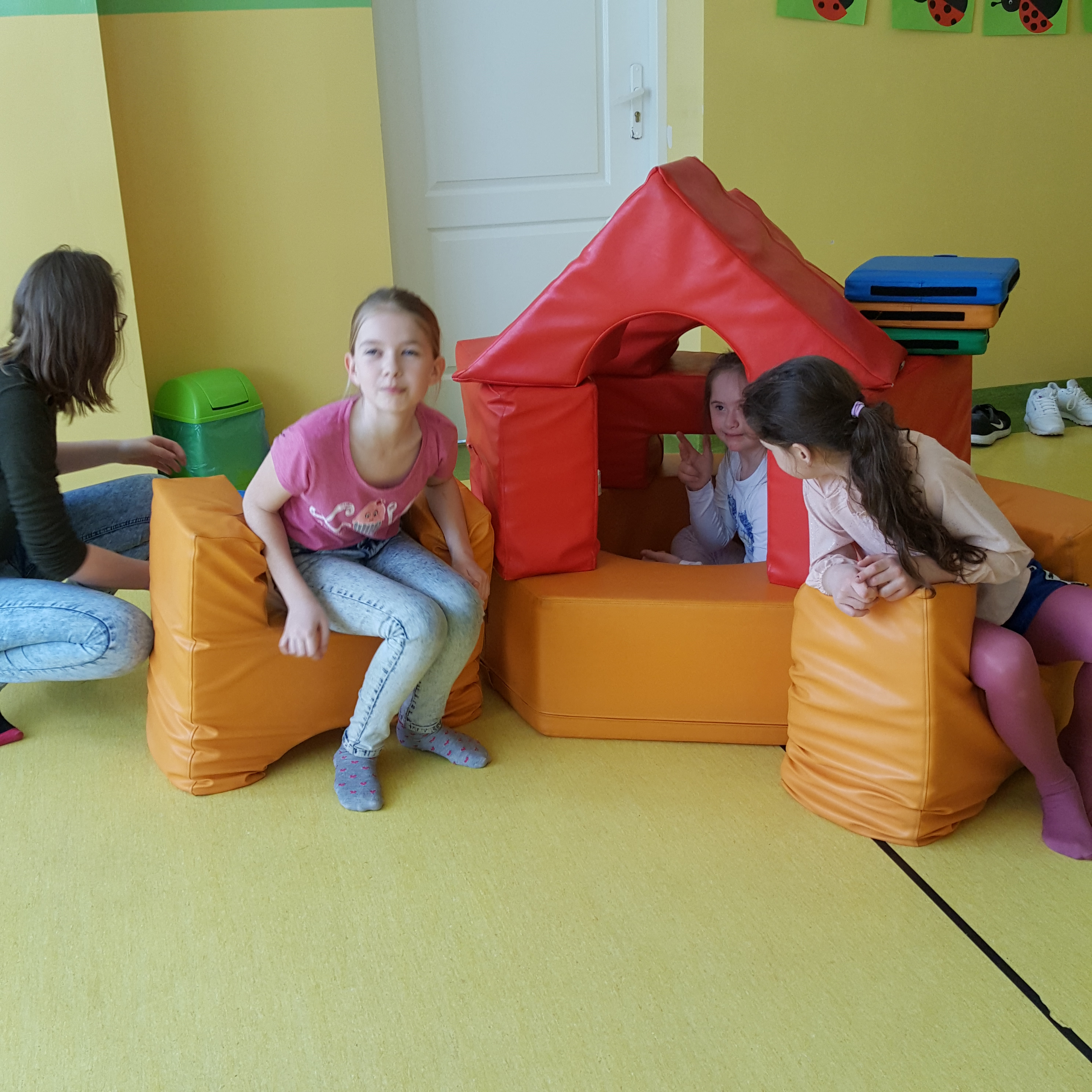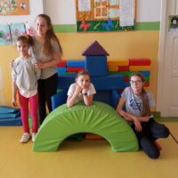Dzieci wzmacniając relacje między sobą miały okazję bawić się w grupach przy wznoszeniu domków z ogromnych klocków.