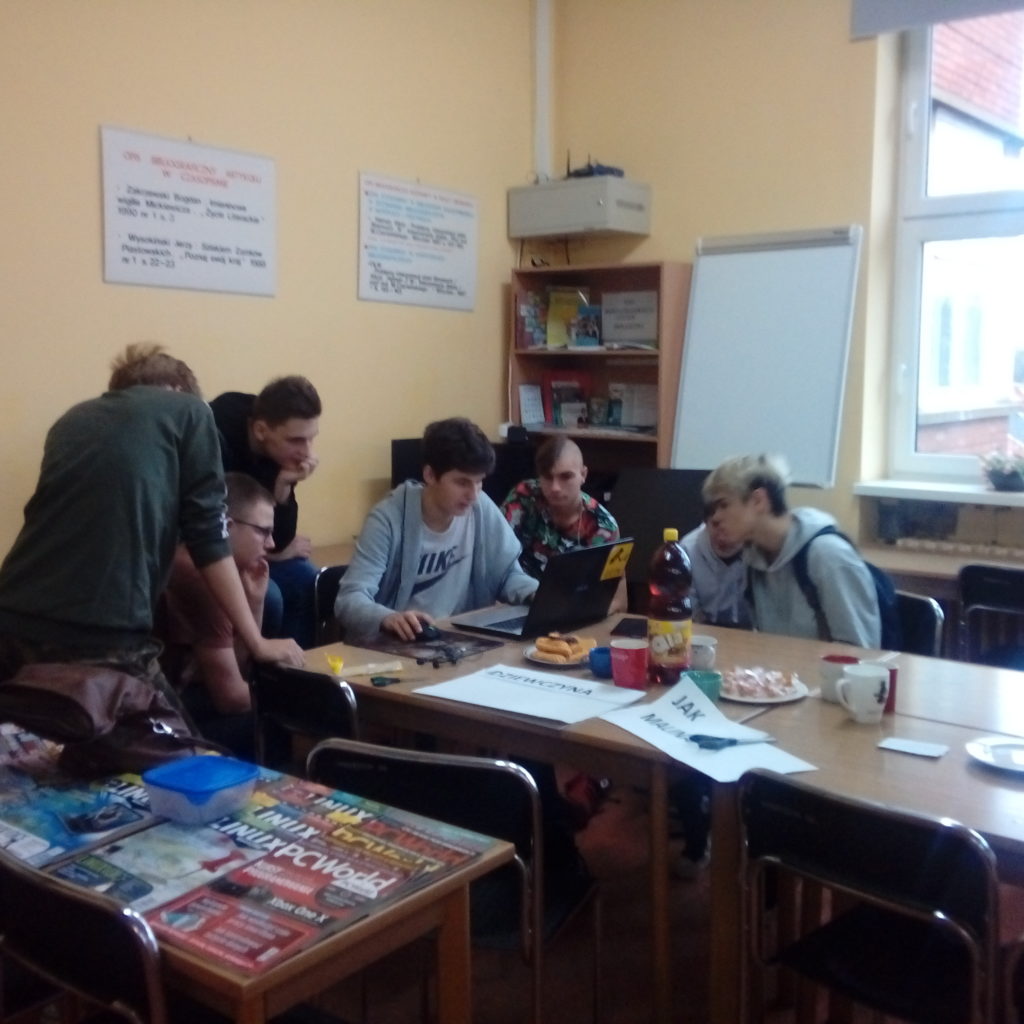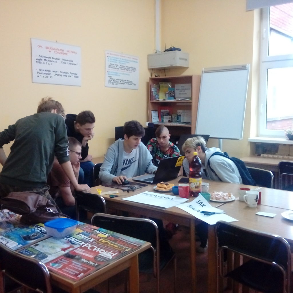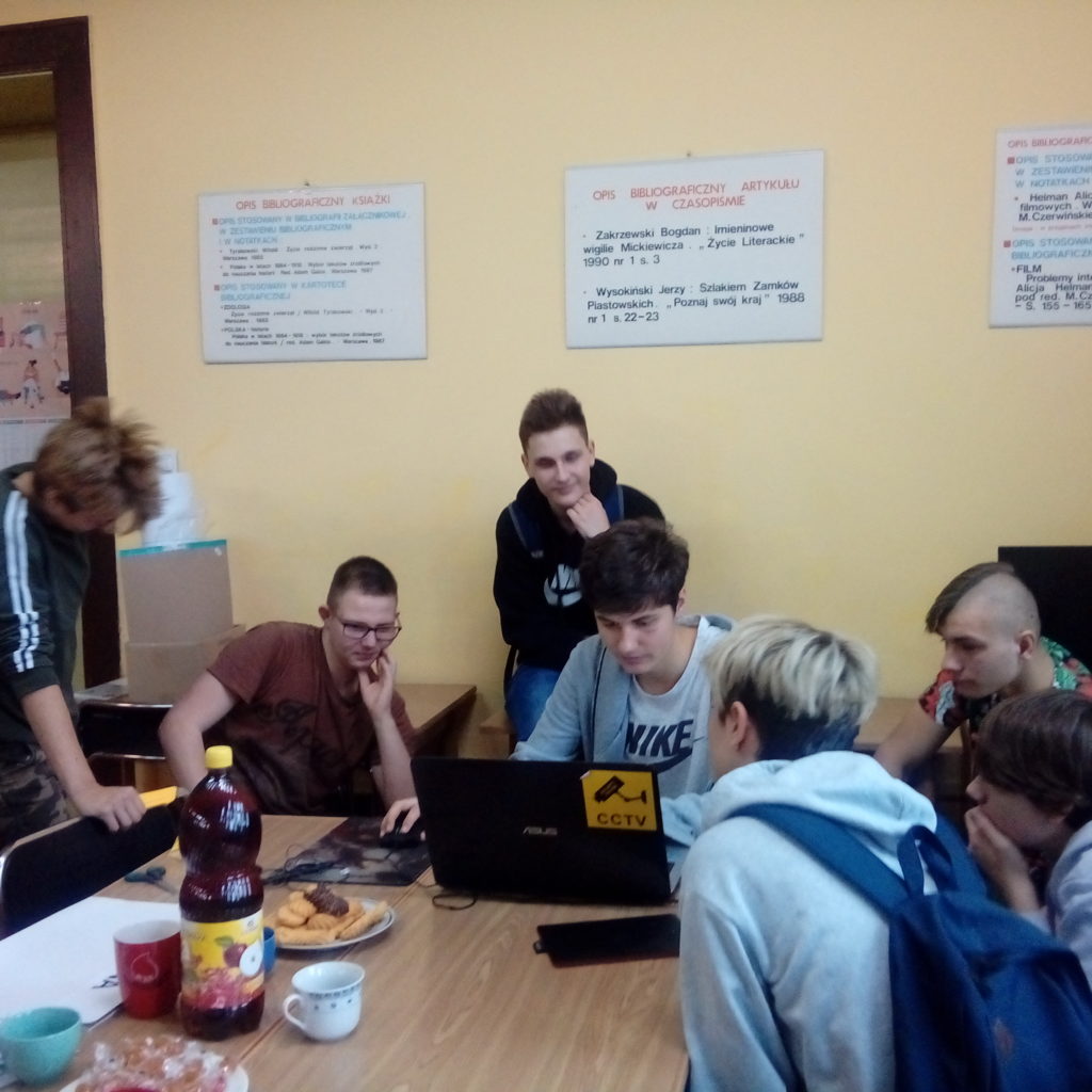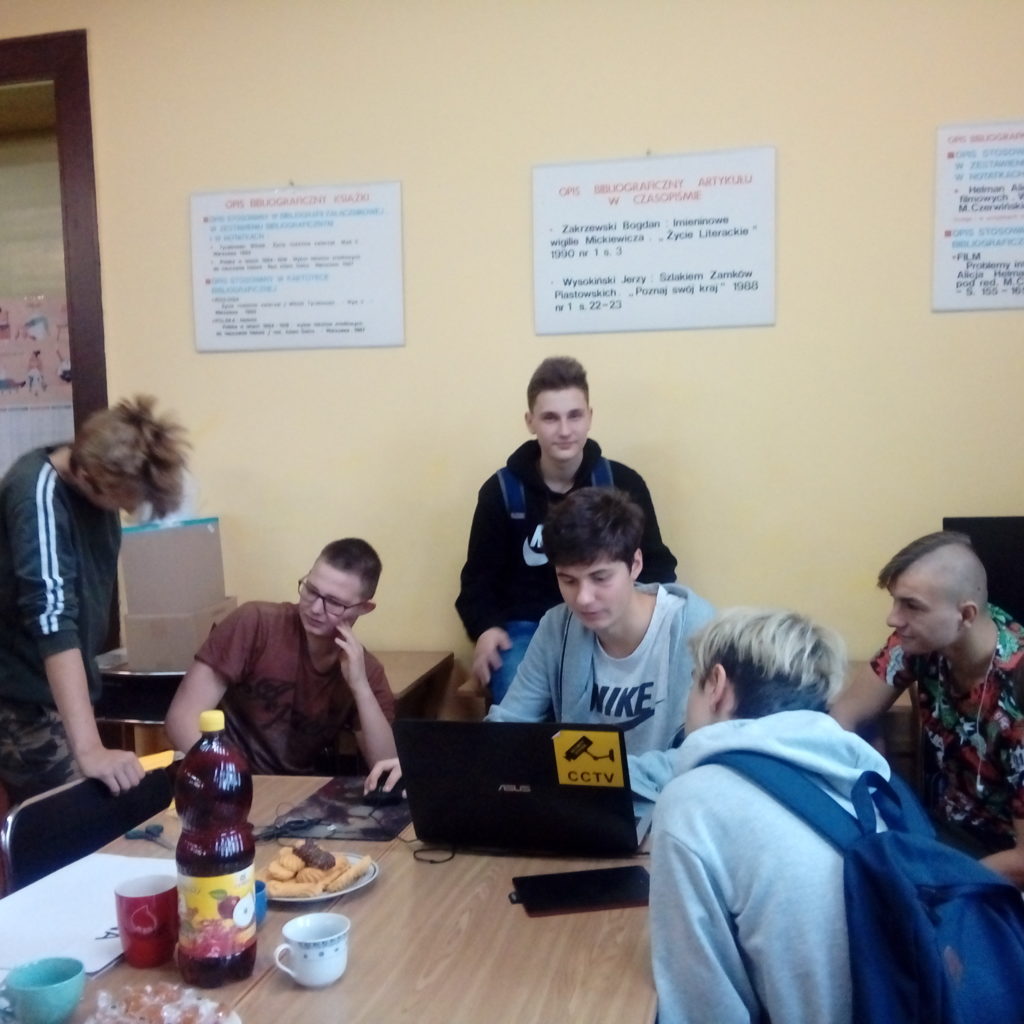 W piątek 14 grudnia Maria, Krystian i Kuba gościli w Technikum Mechanicznym. Uczniowie tej szkoły komputerowo stworzyli szablony do zrobienia graffiti, które nasi uczniowie sobie wymyślili. Zostaną one stworzone na koszulkach. Po stworzeniu szablonu cała grupa wspólnie wykonała najbardziej żmudną część pracy, czyli ich wycinanie. Spotkanie z rówieśnikami Technikum Mechanicznego okazało się sympatyczna i owocną współpracą.