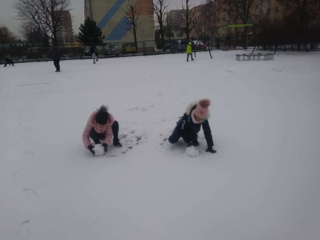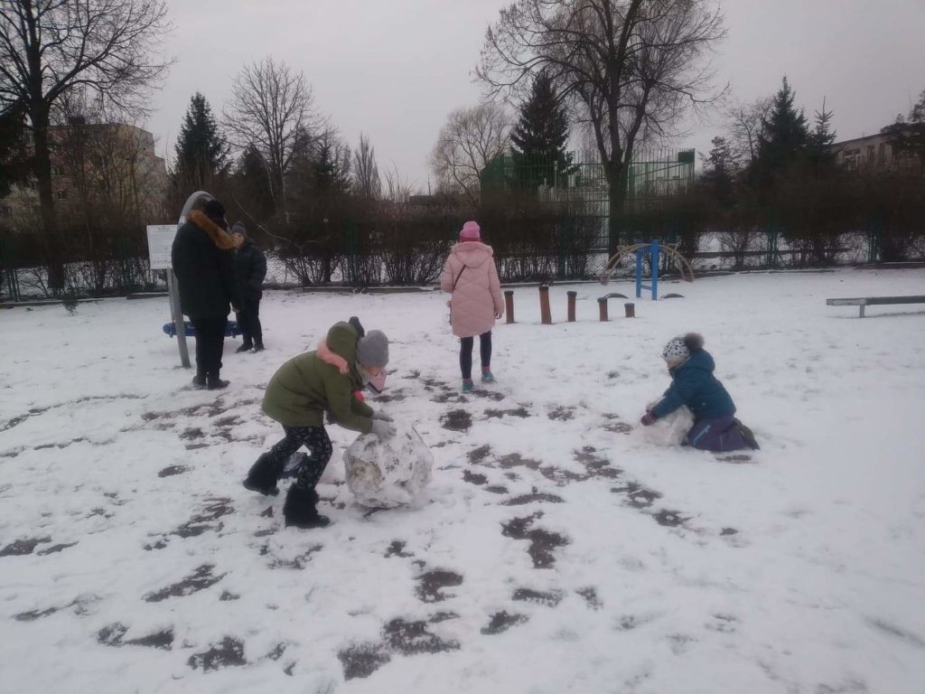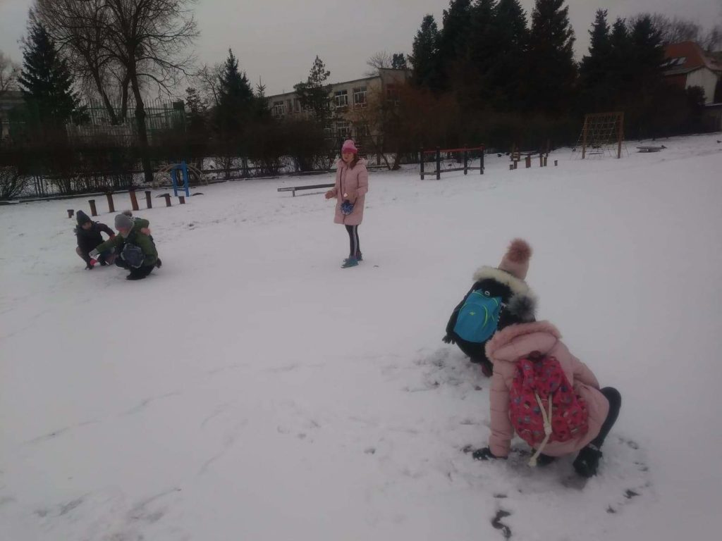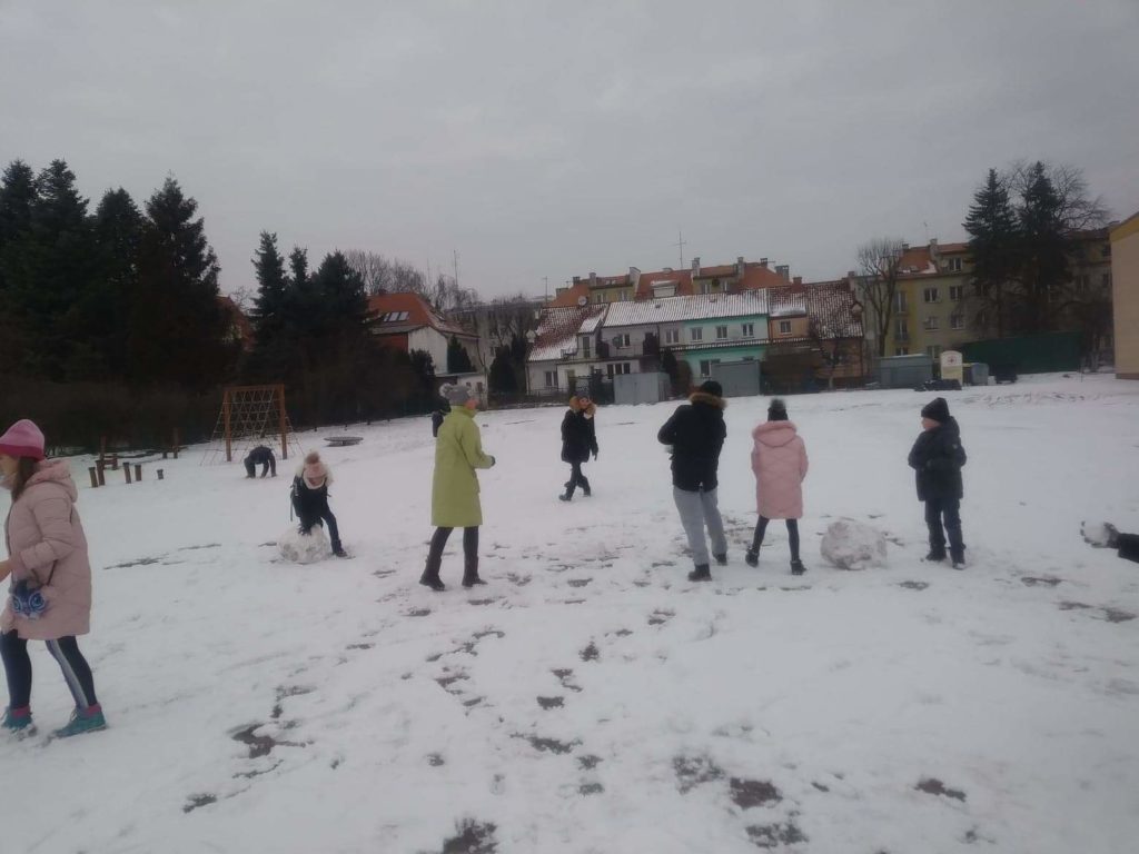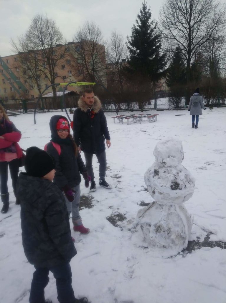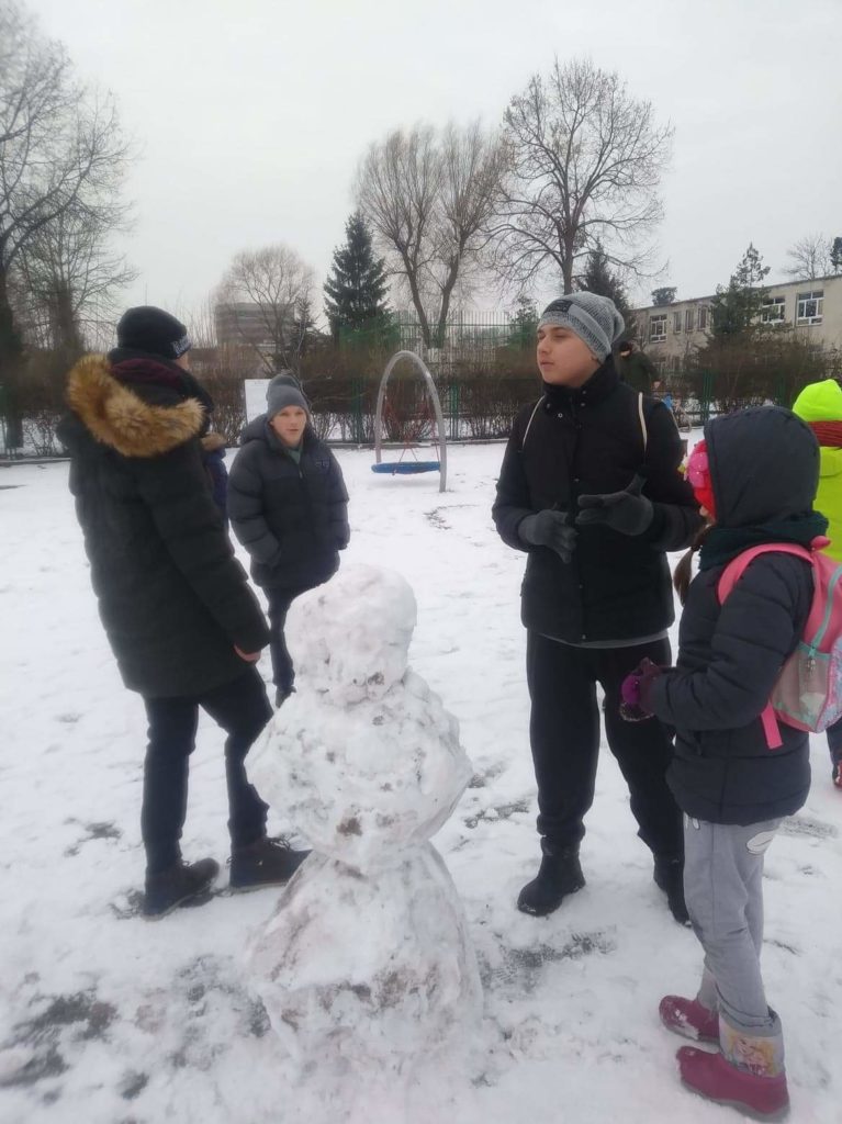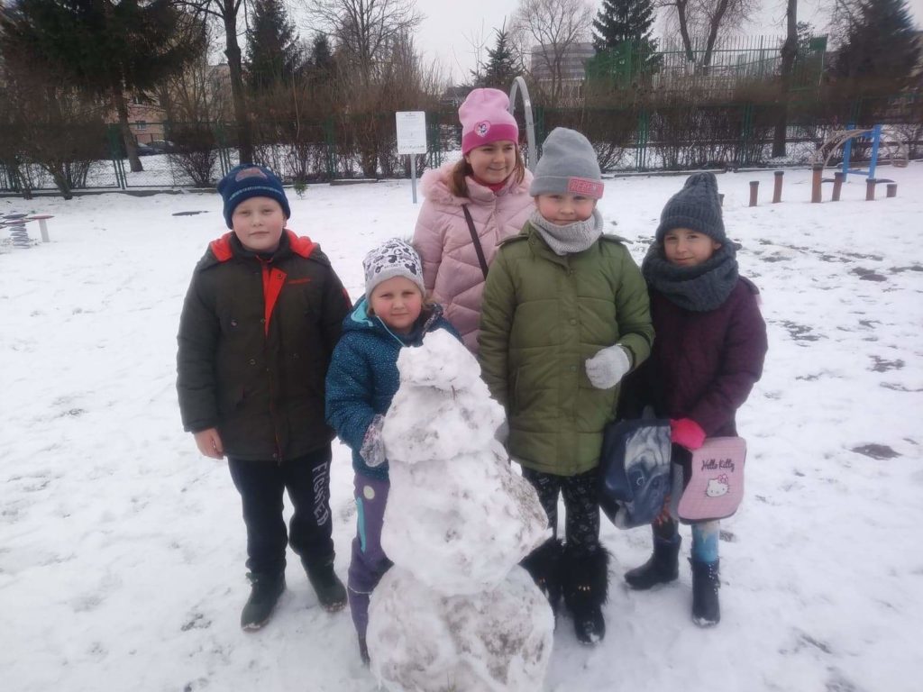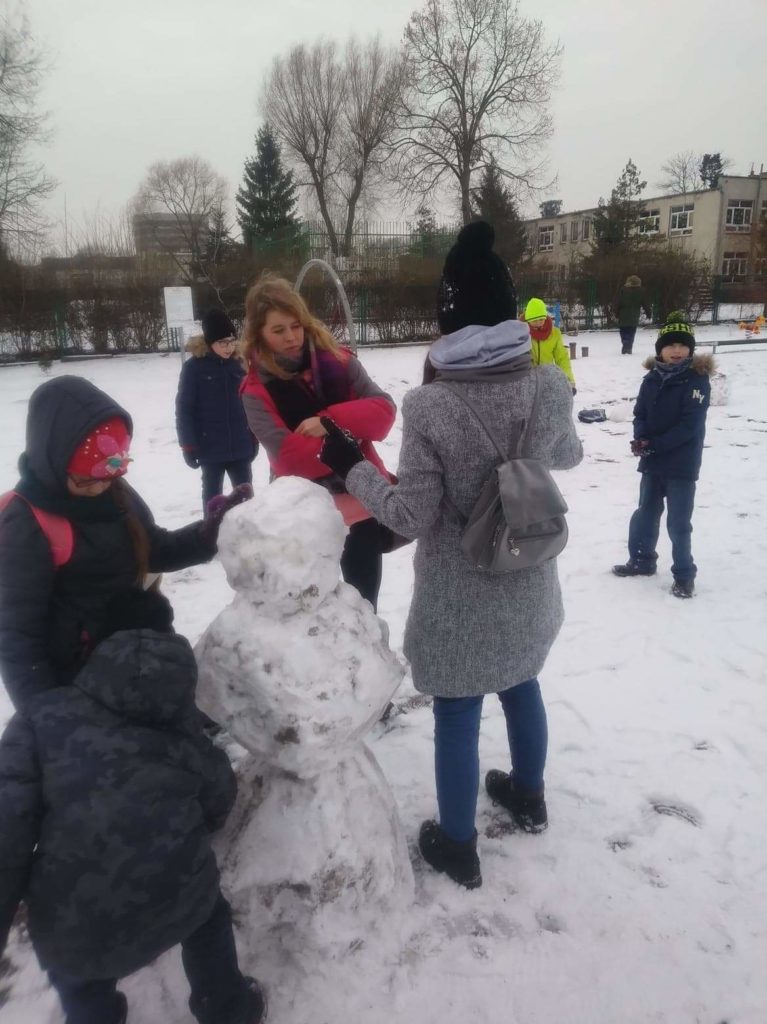 Pierwszy dzień rozpoczęliśmy zabawami integracyjnymi. Stworzyliśmy własne kodeksy grupowe. Następnie Pan policjant przypomniał nam zasady bezpiecznego zachowania się podczas ferii zimowych. Kolejnym punktem programu było wyjście do kina Światowid na projekcję filmu „Ralph Demolka”. Wracając każda grupa ulepiła swojego bałwana. W sali przećwiczyliśmy udzielanie pierwszej pomocy przedmedycznej.