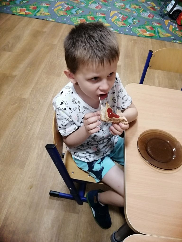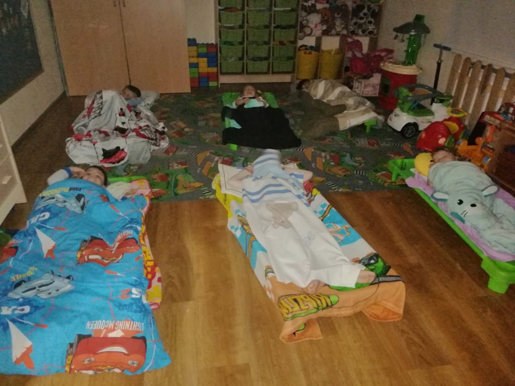 Nasze przedszkolaki postanowiły przeżyć nowa przygodę- nocowanie w przedszkolu. Ten wspólny czas zupełnie inny niz na codzień okazał się świetną zabawą! Aby przyrządzić pyszną kolację i śniadanko wybraliśmy się do sklepu po zakupy. Po zakupach przyszedł czas na zabawę na placu zabaw. Zabawa była bardzo fajna, ale i męcząca, postanowilismy więc wrócic do sali przedszkolnej. Tam głodni jak wilki szybko zjedliśmy pyszną kolację- cieplutkie tosty z serem i szynką oraz rozgrzewająca herbatkę. Po kolacji nasza sala zamieniła się w dużą sypialnię. Myjemy ząbki, przebieramy się w piżamki i czas spać. Nasze przedszkolaki zasnęły w mgnieniu oka. Rano po obudzeniu sniadanie, zabawa i oglądanie ulubionej bajki, aż tu nagle przyjechali po nas rodzice. Nasze przedszkolaki zdaly ten egzamin na 6!