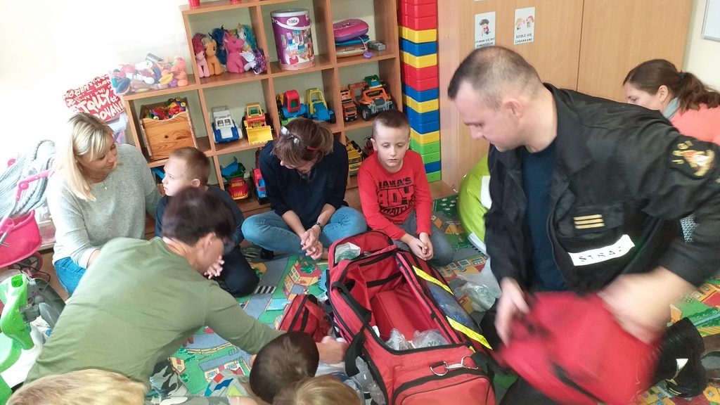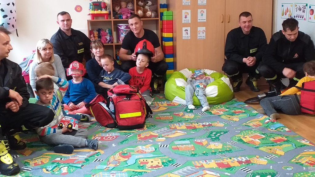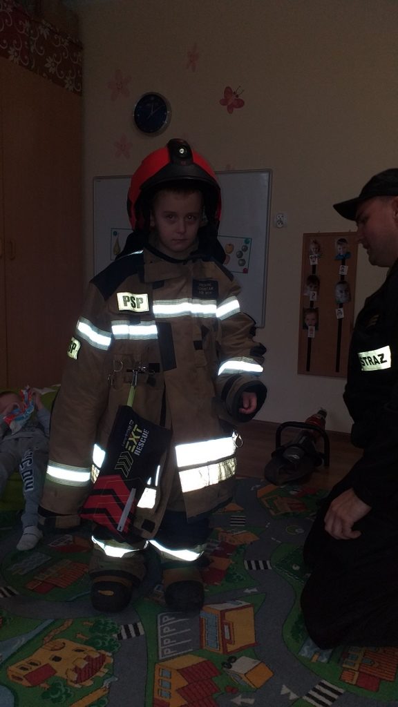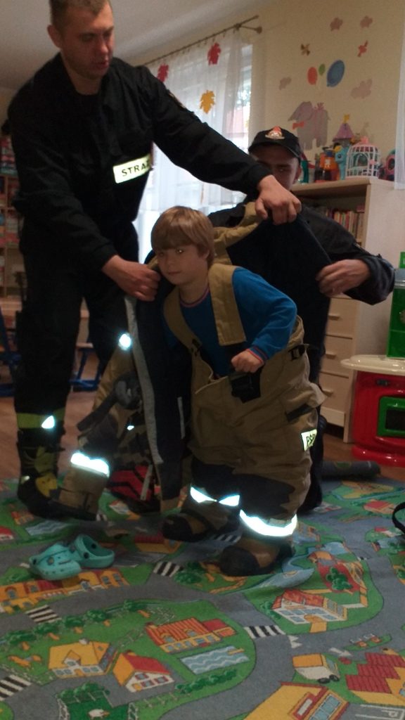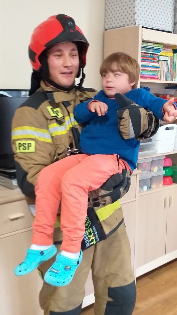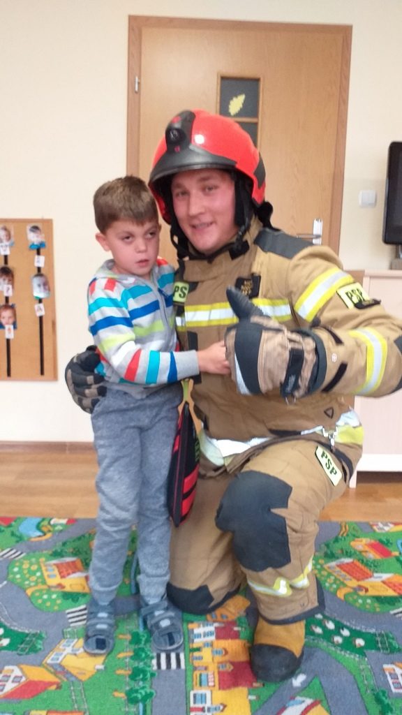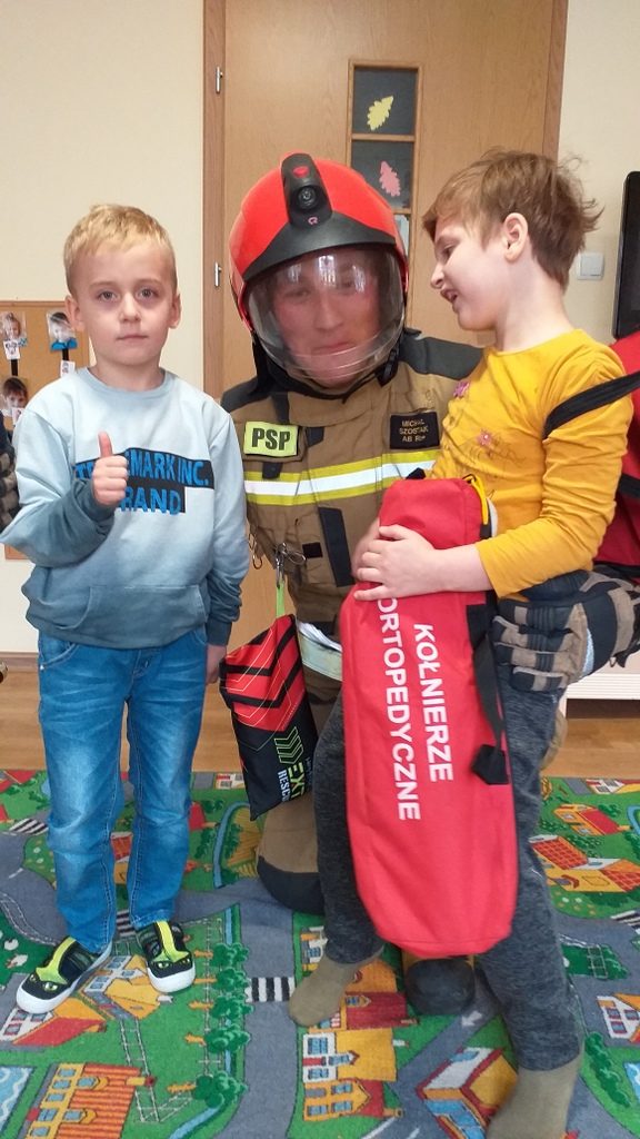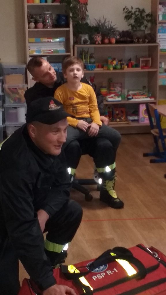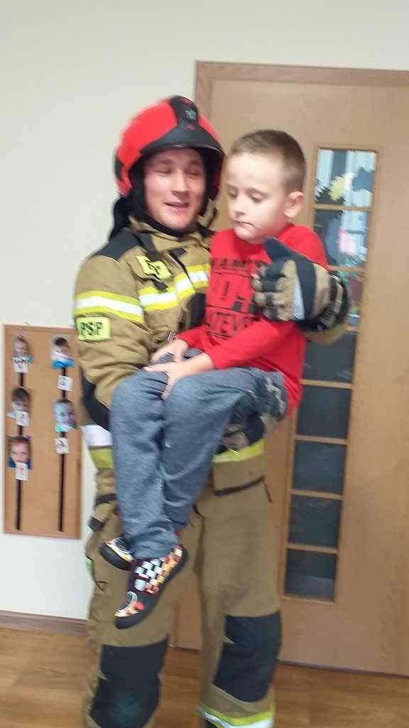 Jednostka ratowniczo-gaśnicza nr 1 w Elblągu zaprezentowała naszym przedszkolakom pełne umundurowanie strażaka, podstawowy sprzęt ratowniczy oraz ciekawostki z pracy w trakcie akcji. Dzieci miały możliwość przebrać się w strój strażaka, zapoznać się z wyposażeniem torby medycznej, ugasić fikcyjny pożar oraz zapytać: czy strażacy mają drabinę.
