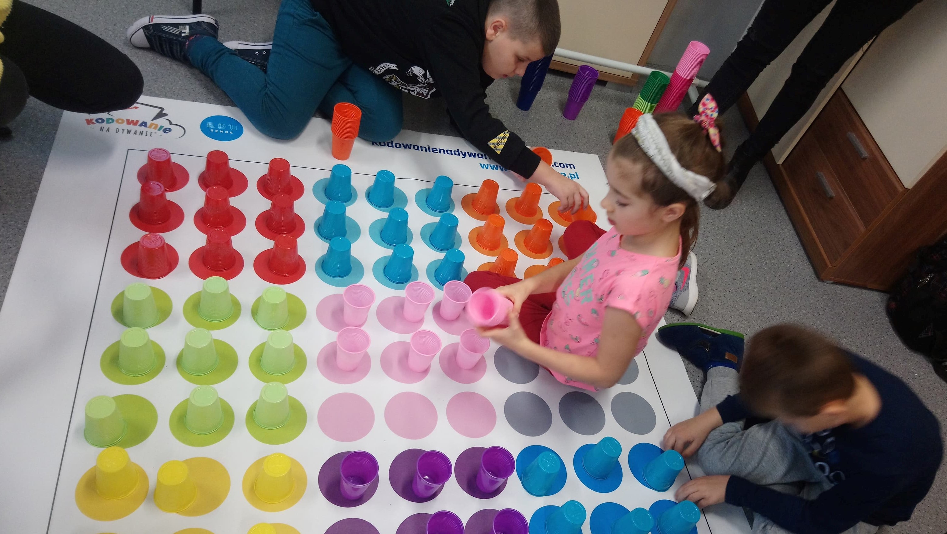 Wychodząc naprzeciw potrzebom edukacyjnym  uczniów, w dniu dzisiejszym zorganizowany został dzień z kodowaniem. Zaproponowano zabawy wprowadzające dzieci w świat programowania.  Uczniowie SP i PdP ZET oraz klas 1-4 SP L swoją przygodę z kodowaniem rozpoczęli na macie, wykorzystując kolorowe kubeczki i tablicę interaktywną. Kolejna „stacja” oferowała zadania z zastosowaniem ozobota, wyznaczanie i programowanie tras z użyciem przeznaczonych do tego  puzzli oraz odpowiednich kodów.  Następny punkt spotkania to  roboty Dash oraz programowanie drogi do poszczególnych, wyznaczonych miejsc.