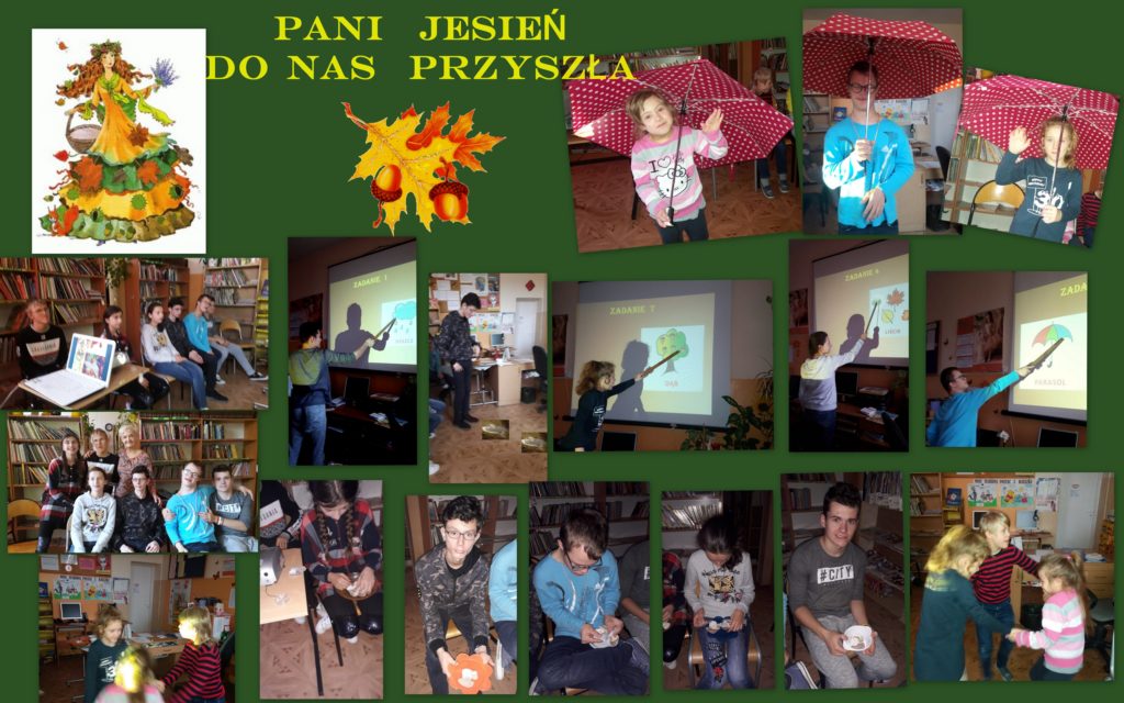 Pod tym hasłem w bibliotece szkolnej odbyły się listopadowe zajęcia edukacyjno czytelnicze dla uczniów zespołów edukacyjno – terapeutycznych, mające na celu utrwalenie wiadomości na temat zmian w środowisku wiążących się z królującą obecnie porą roku. Uczniowie obejrzeli prezentację multimedialną i rozwiązali zadania jesienne wymagające od nich wykazania się wiedzą, sprytem, spostrzegawczością , umiejętnością czytania tekstu lub odczytywania treści z obrazków. W części literackiej uczestnicy zajęć wysłuchali wierszy o jesieni, bajki o „pewnej malarce” oraz popularnego wiersza Jana Brzechwy „Grzyby”. Podczas zajęć był i czas na zabawę ,wyszukiwanie grzybów ukrytych w bibliotece ,wybór króla grzybobrania oraz śpiewy i pląsy przy rytmicznych , jesiennych piosenkach.