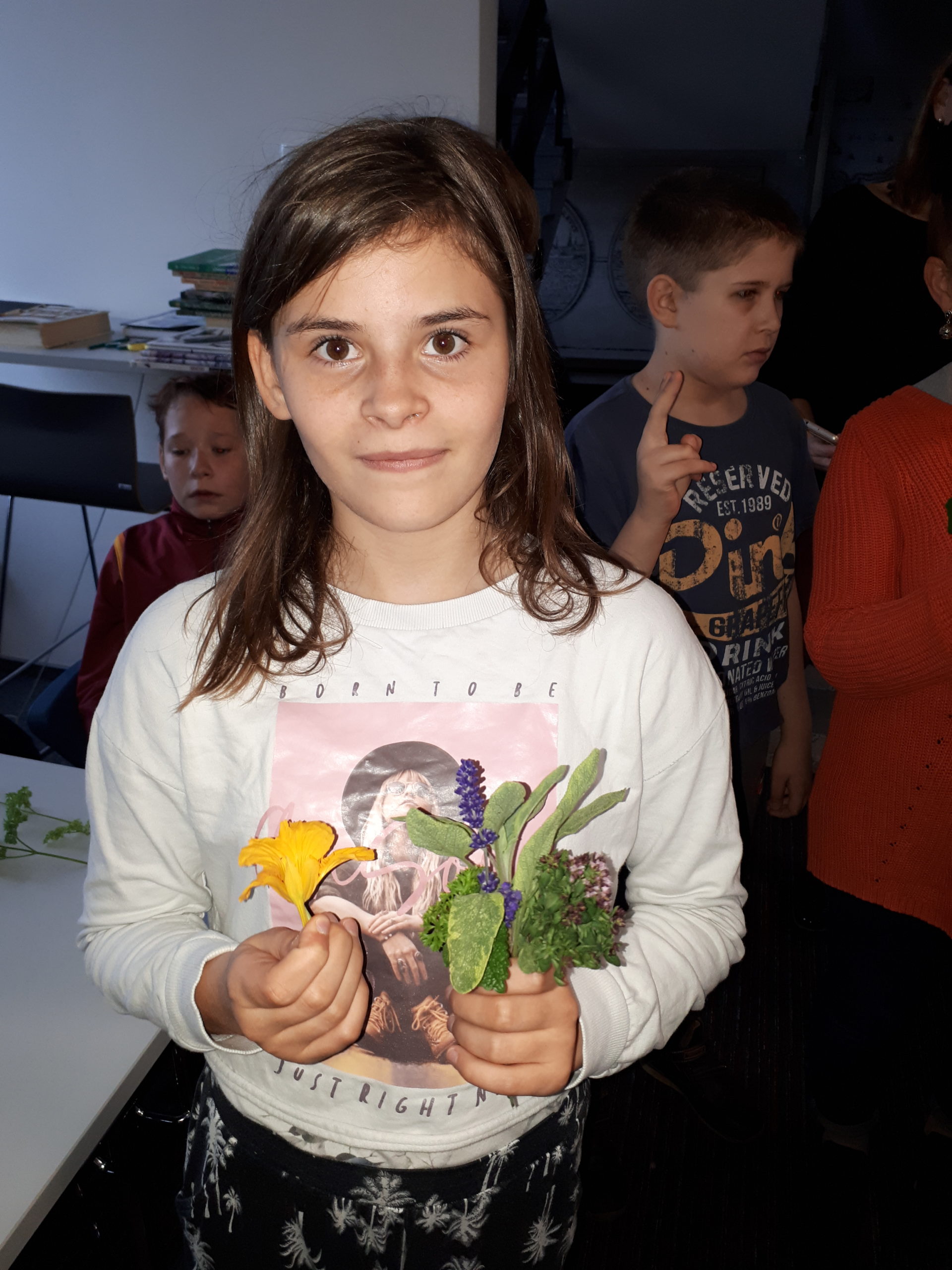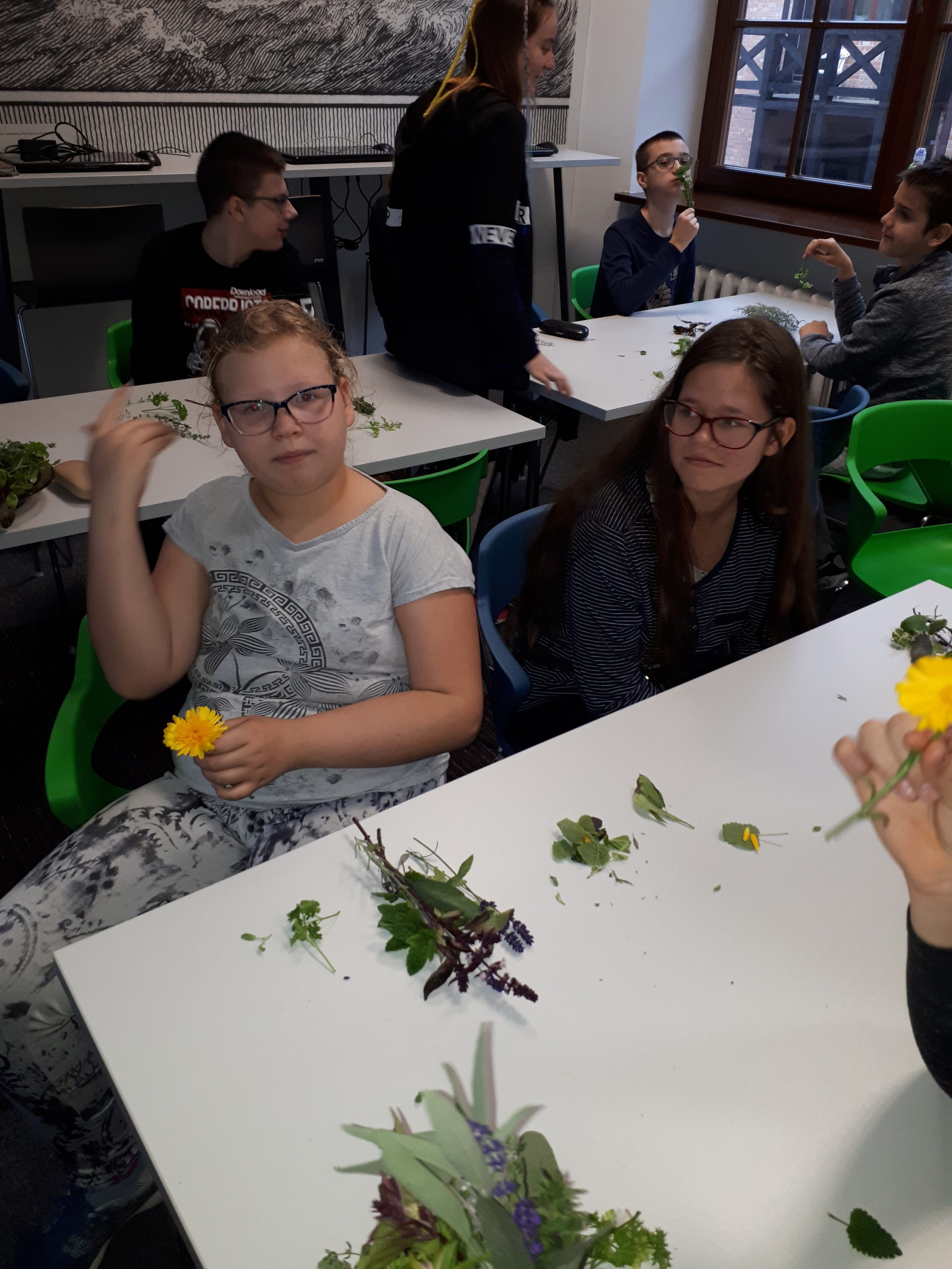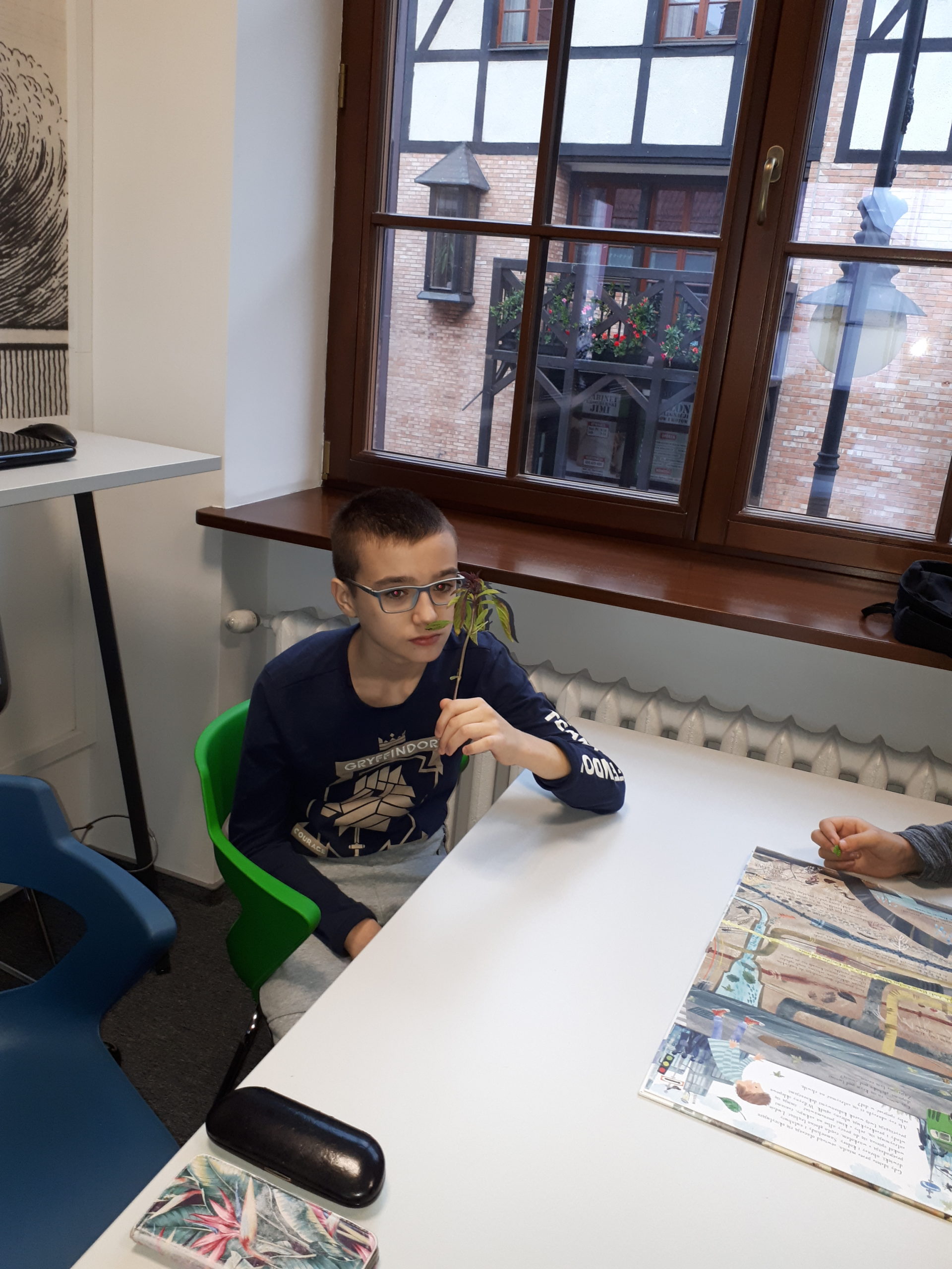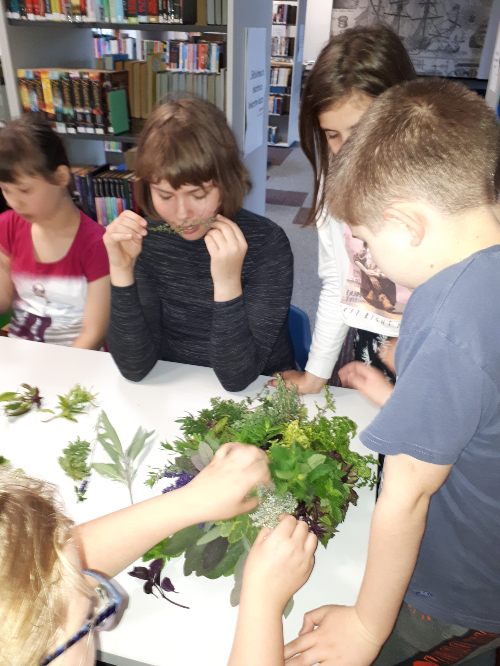 W toku warsztatów plastyczno – literackich eksplorowaliśmy polisensorycznie, poznając wygląd, zapach, smak, dotyk roślin zielnych z lawendą, miętą, szałwią, lubczykiem, bazylią czy majerankiem na czele. Niemałym zaskoczeniem był dla nas fakt, że płatki nagietka czy nasturcji są jadalne i zdobią stoły najbardziej renomowanych restauracji świata. Dopełnieniem zajęć było czytanie cytatów z książką w roli głównej oraz ustalanie przesłania zawartego w metaforze. Przysłowiową wisienką na torcie okazała się gra w piłkarzyki oraz zabawy ruchowe na podłodze interaktywnej. Zajęcia okazały się nader ciekawym spotkaniem z książką, w której wszystko, jak w życiu, zdarzyć się i zaskoczyć nas może…