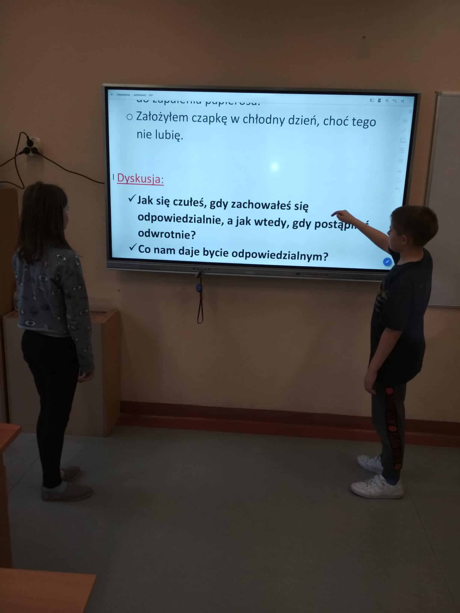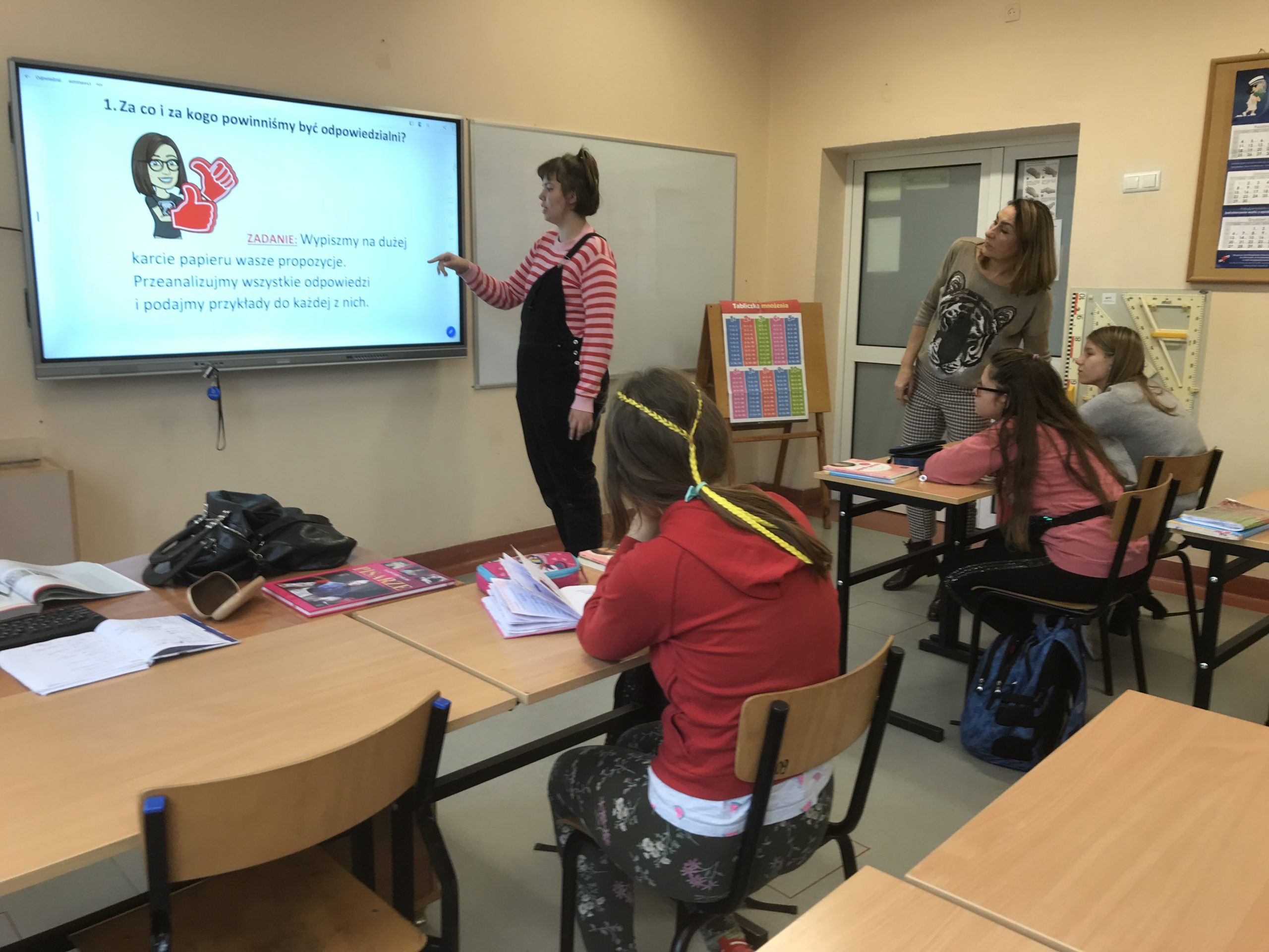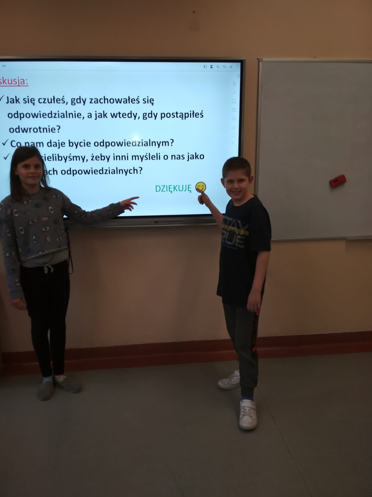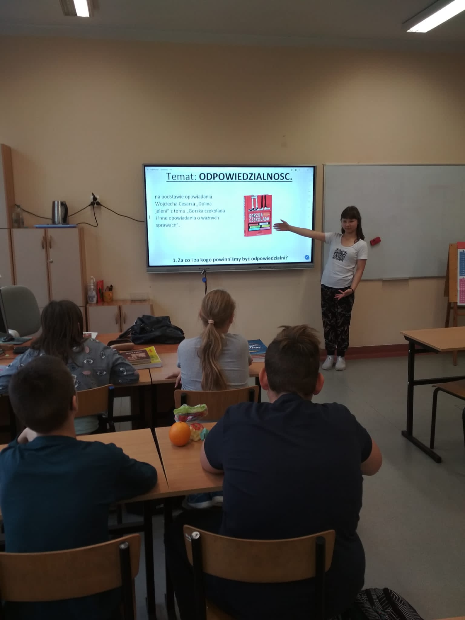 W niezwykle ważnej lekcji o odpowiedzialności wzięły udział klasy: 7b, 4a i 4b . Uczniowie zastanawiali się nad tym, co to znaczy „być odpowiedzialnym”. Odpowiadali na pytania: Czym jest odpowiedzialność? Dlaczego człowiek powinien być odpowiedzialny? Lekcja o odpowiedzialności odbyła się w ramach realizacji programu „Wychowanie przez Czytanie” w piątek, 22 października.