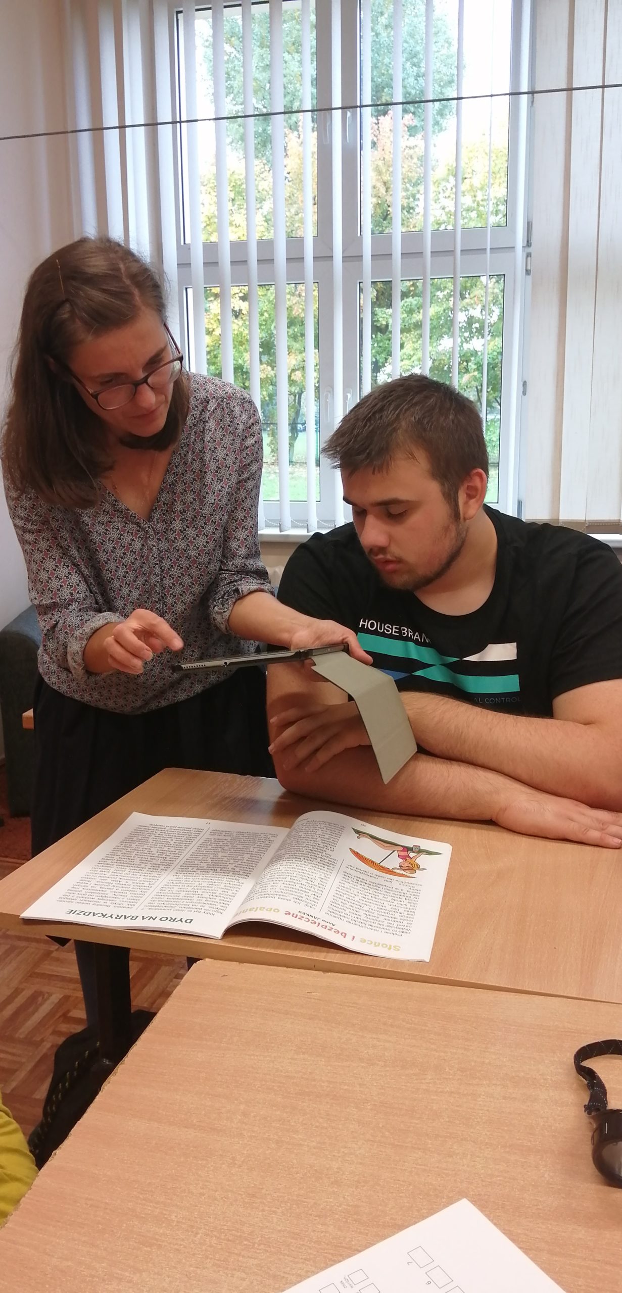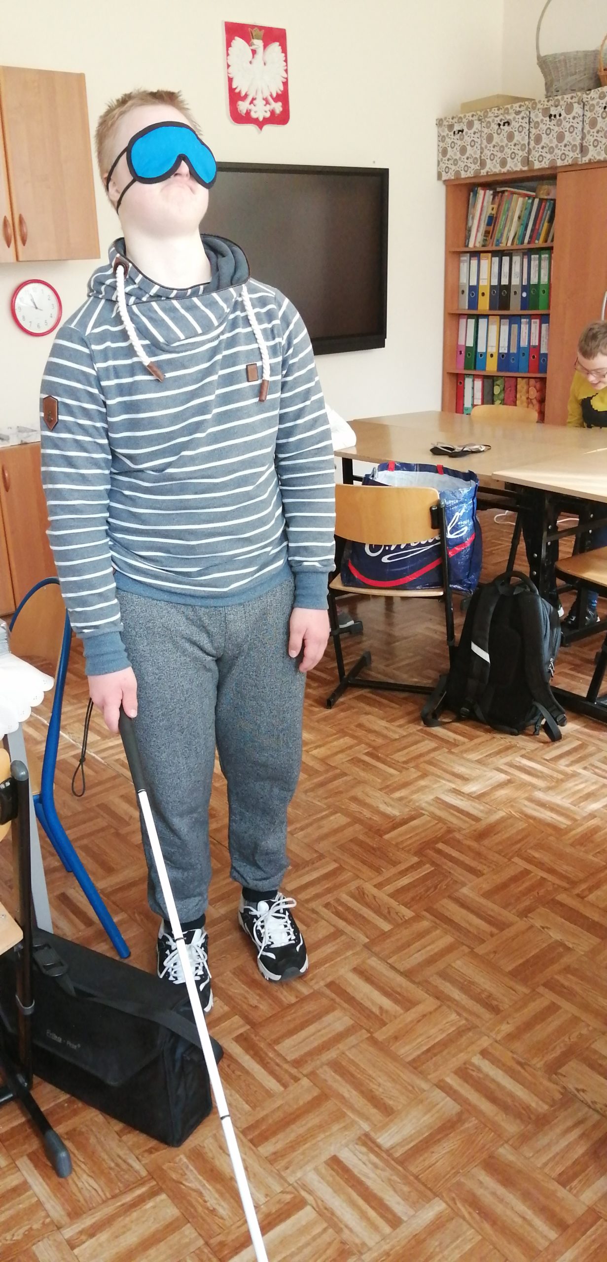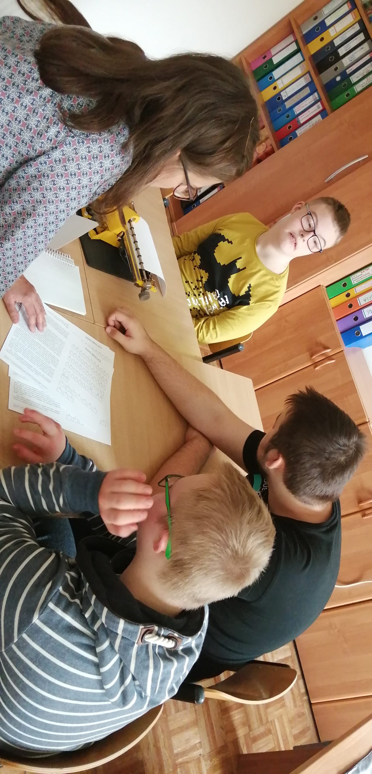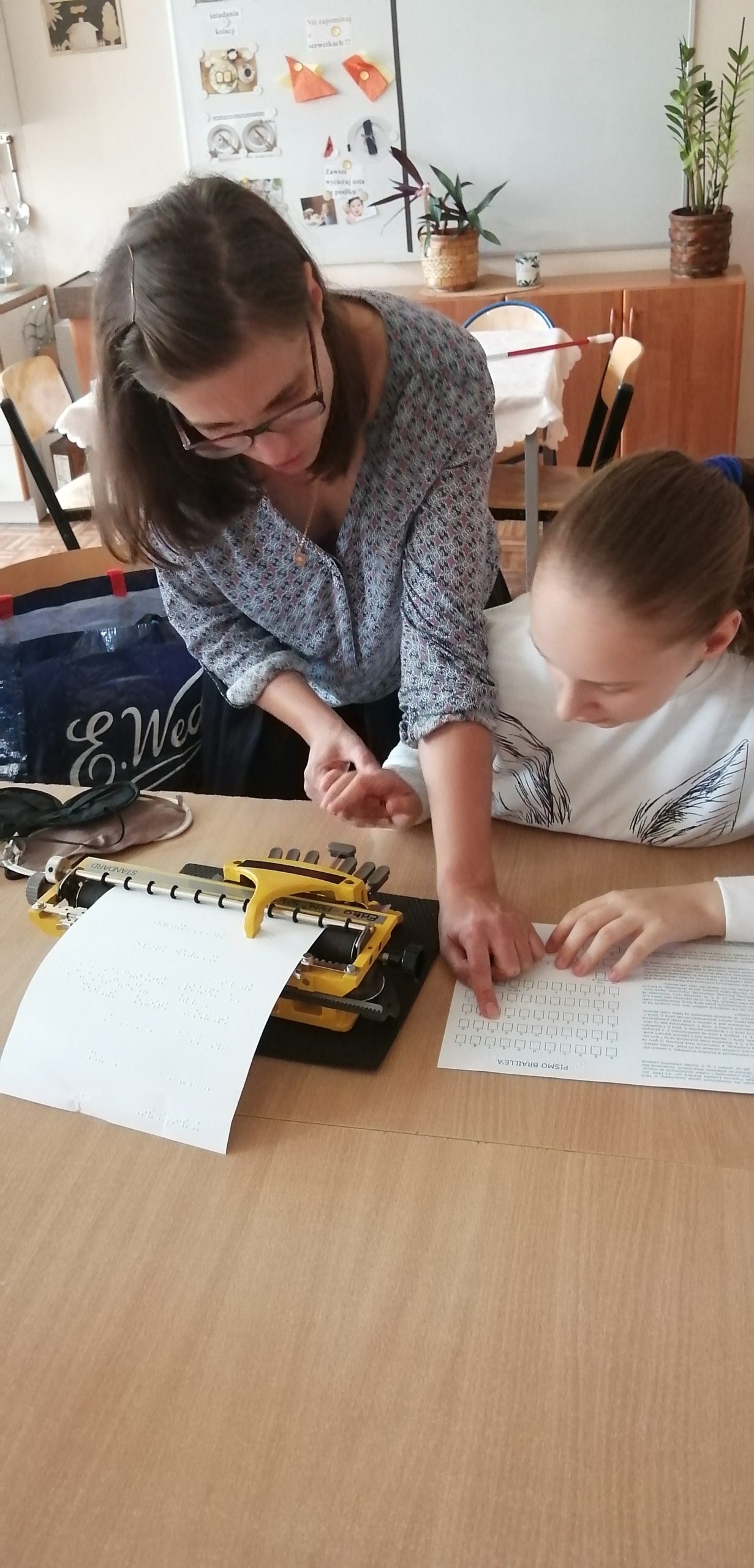 W tym roku po raz kolejny miałam okazję zawitać do wielu klas naszej szkoły z lekcją warsztatową o osobach niewidomych oraz słabowidzących. Uczniowie mogli doświadczyć jak to jest poruszać się z laską, jak poprawnie przeprowadzić osobę niewidomą będąc jej przewodnikiem, na czym polega pismo brajla, napisać swoje imię na maszynie brajlowskiej. W sposób szczególny rozmawialiśmy o osobach słabowidzących. Uczniowie dowiedzieli się kto to jest osoba słabowidząca, a przede wszystkim dzięki goglom symulujących różne choroby oczu, mogli doświadczyć jak to jest być taką osobą i z jakimi trudnościami przychodzi im się zmagać.