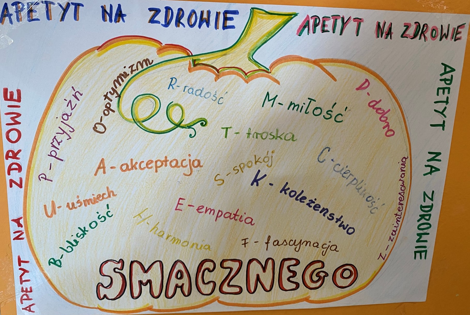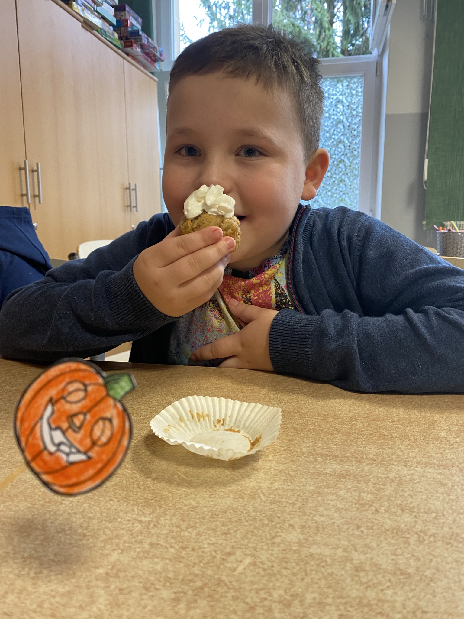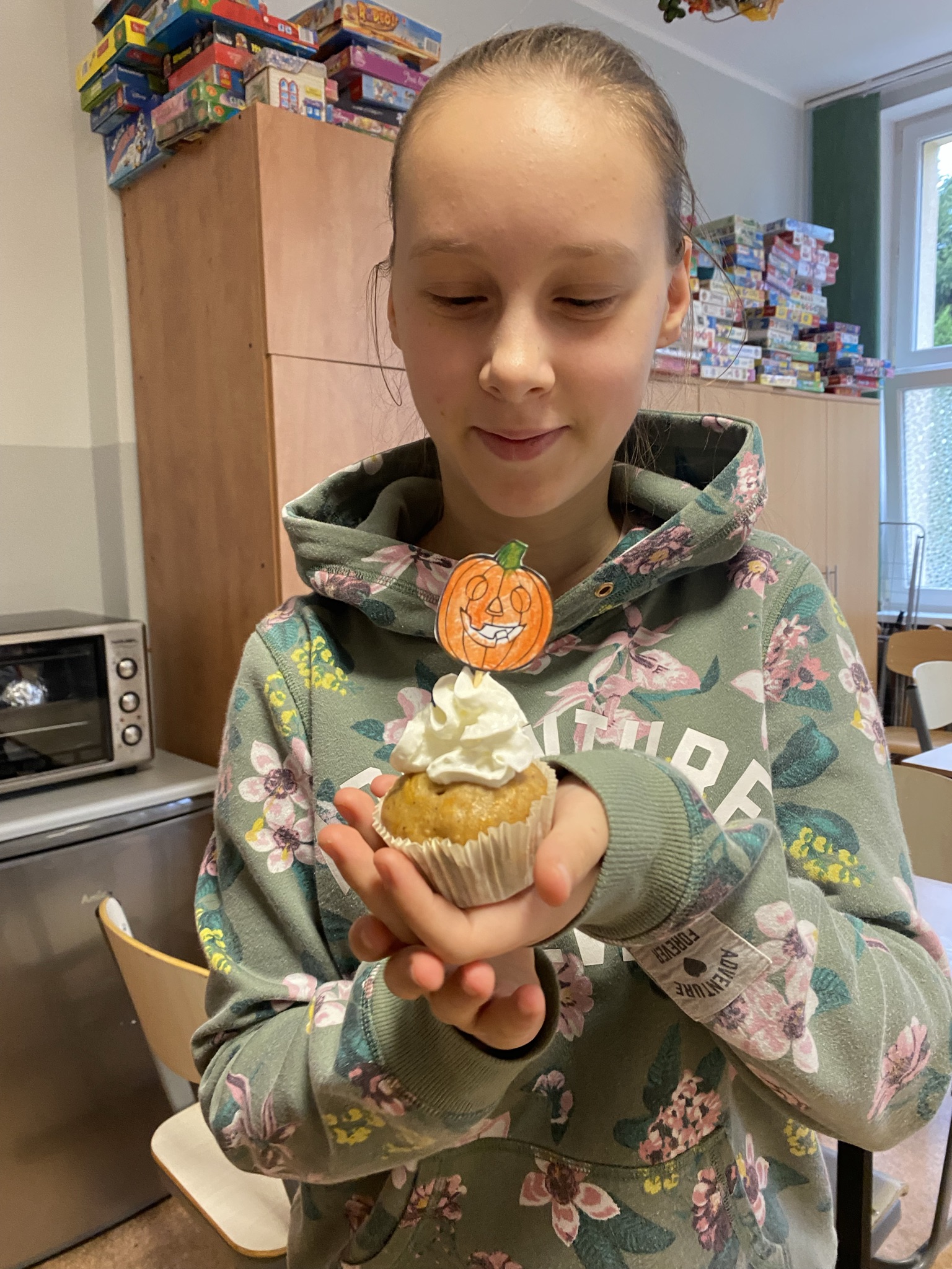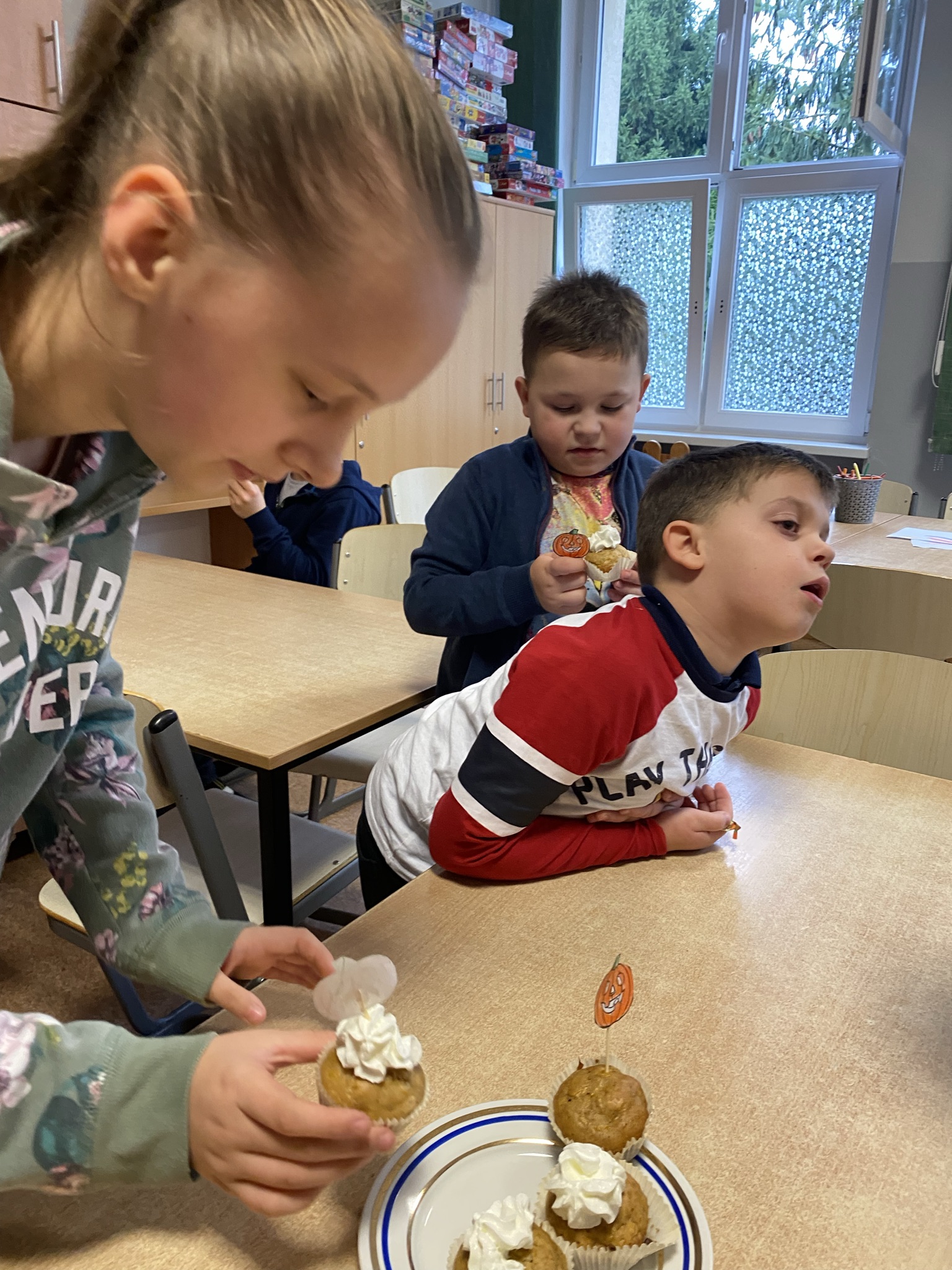 Wszystko nam bardzo smakowało. Dynia również może być elementem dekoracyjnym, dlatego wykorzystaliśmy jej walory dekorując świetlicę. W pachnącej ciastem atmosferze milej upływa czas.