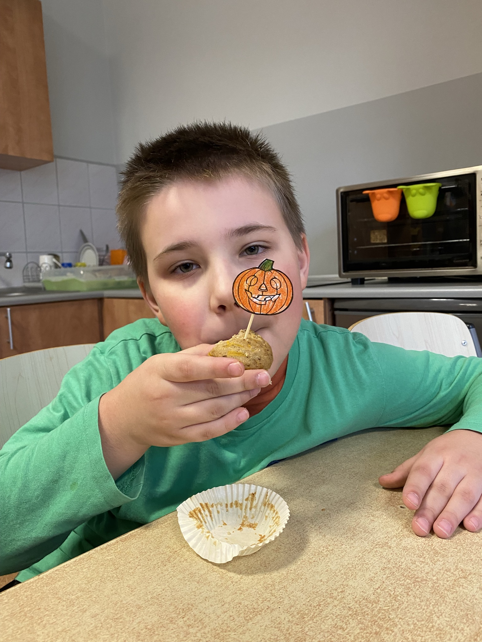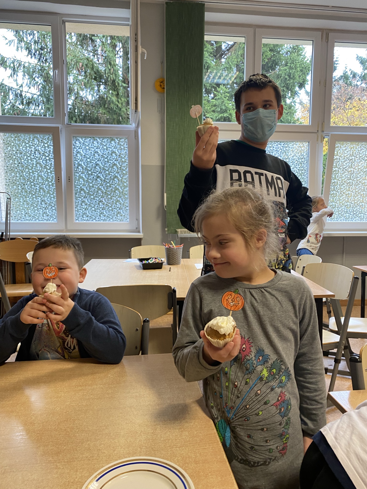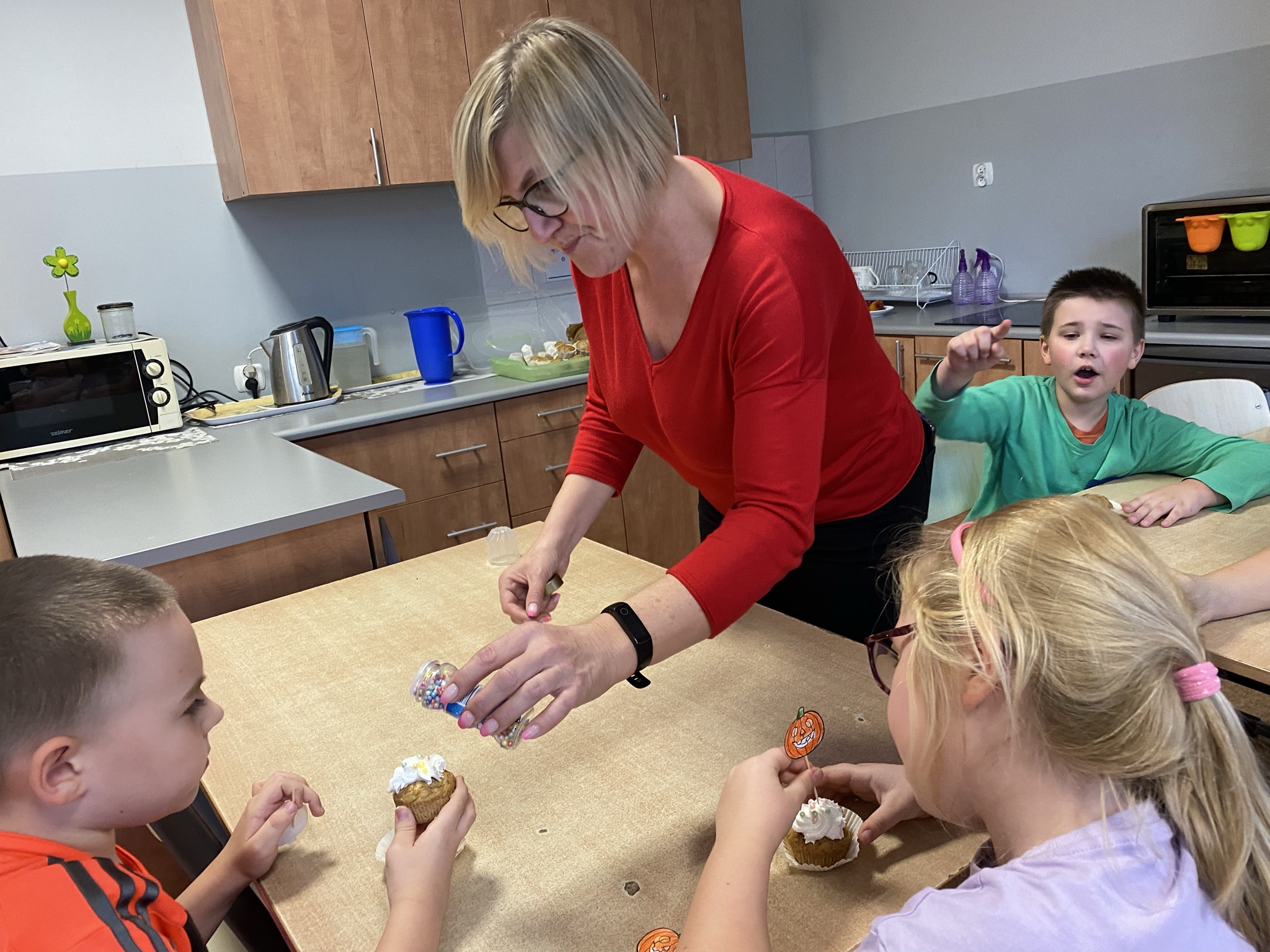 Wszystko nam bardzo smakowało. Dynia również może być elementem dekoracyjnym, dlatego wykorzystaliśmy jej walory dekorując świetlicę. W pachnącej ciastem atmosferze milej upływa czas.