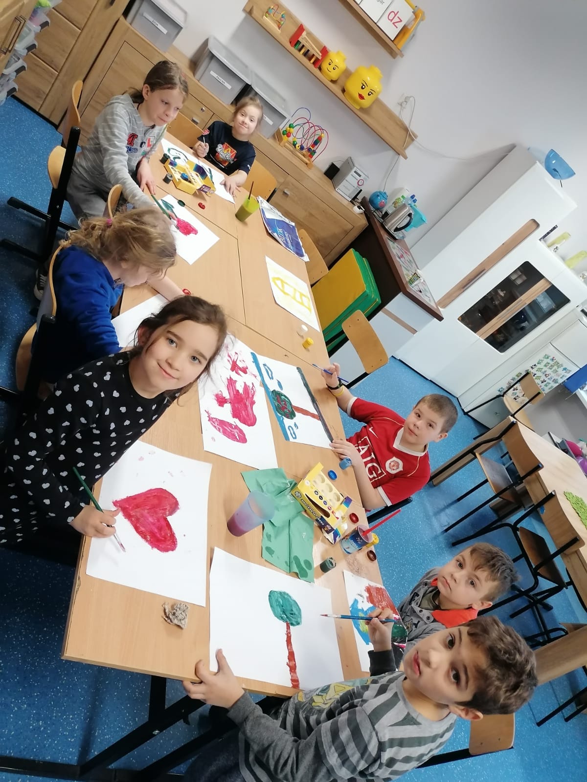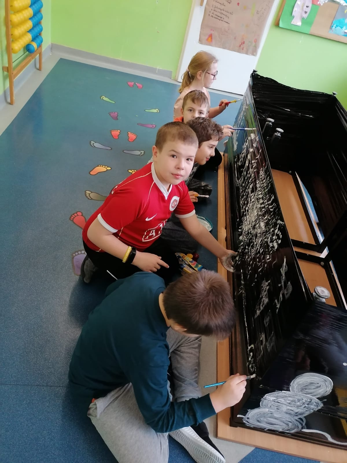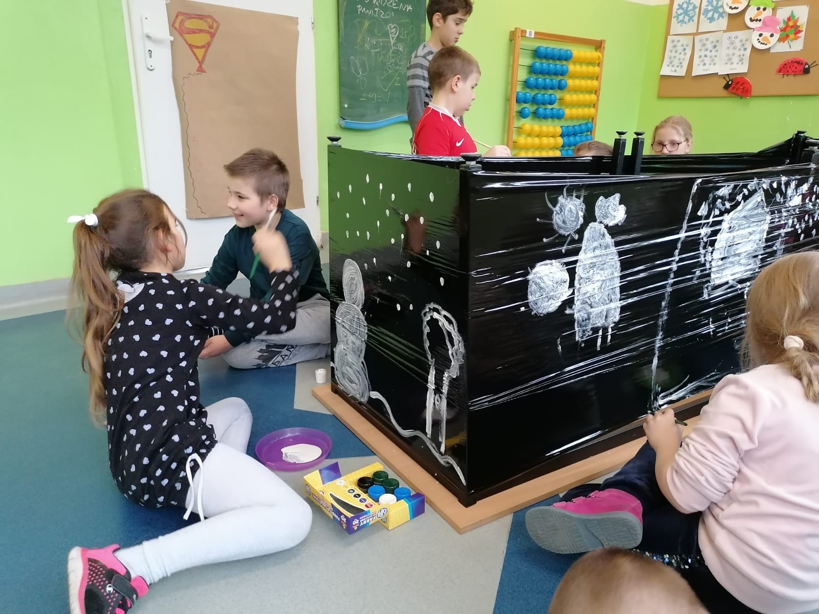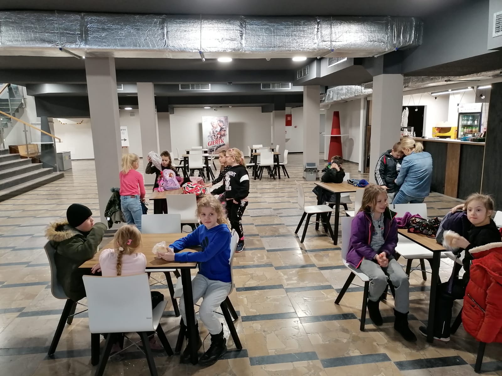 W czwartek uczestnicy półzimowiska udali się do kina Światowid na seans filmowy.  Po filmie odbył się spacer do Parku Dolinka. Po powrocie dzieci malowały na strechu zimowy krajobraz.