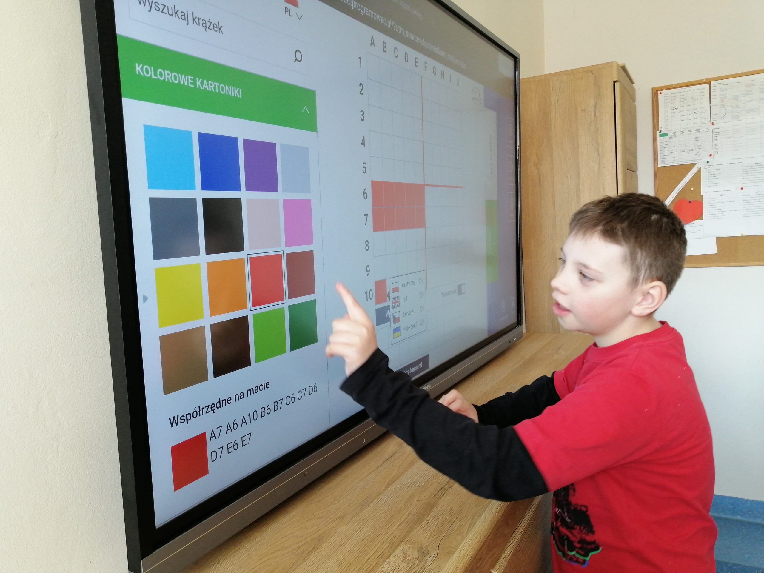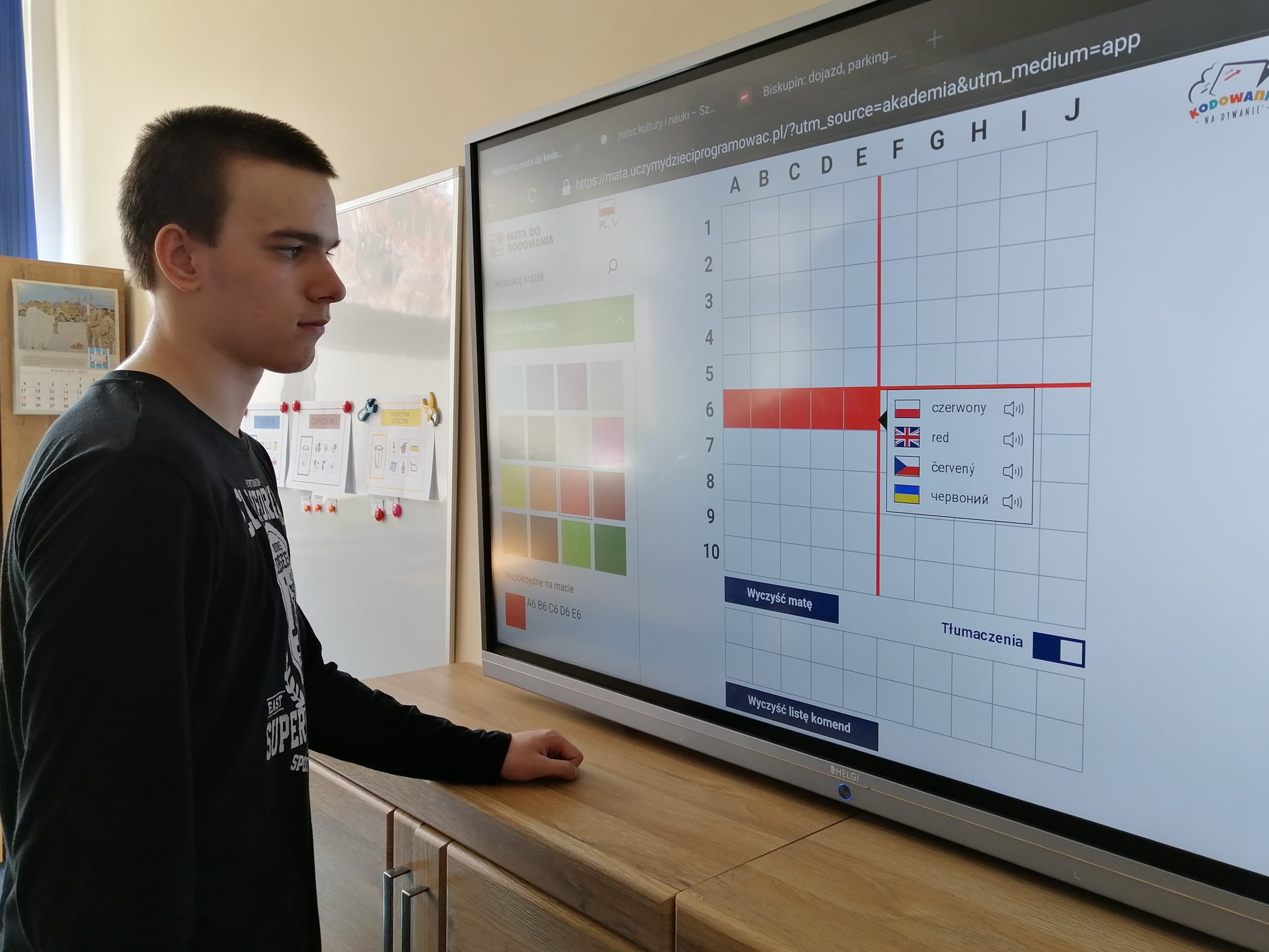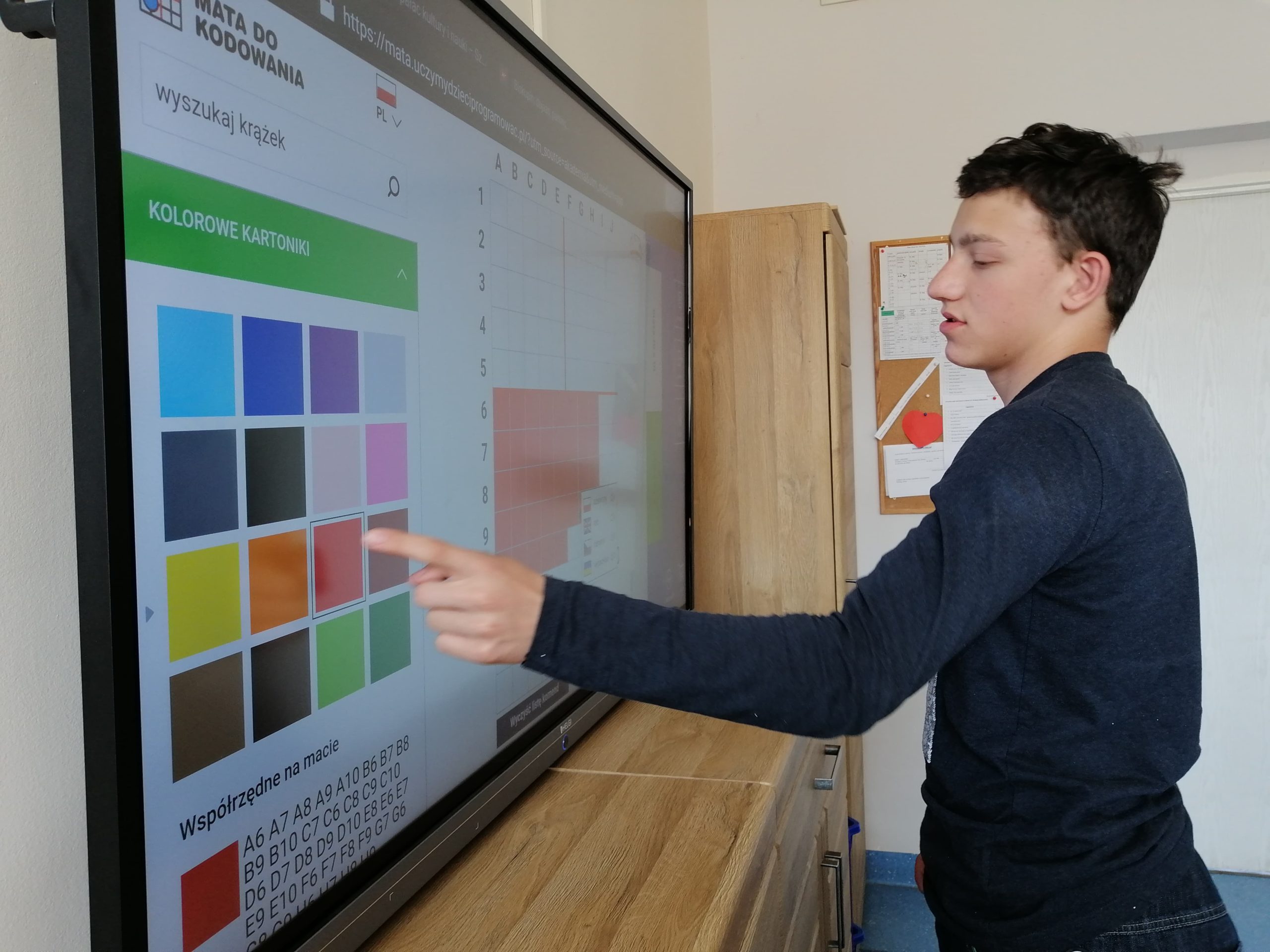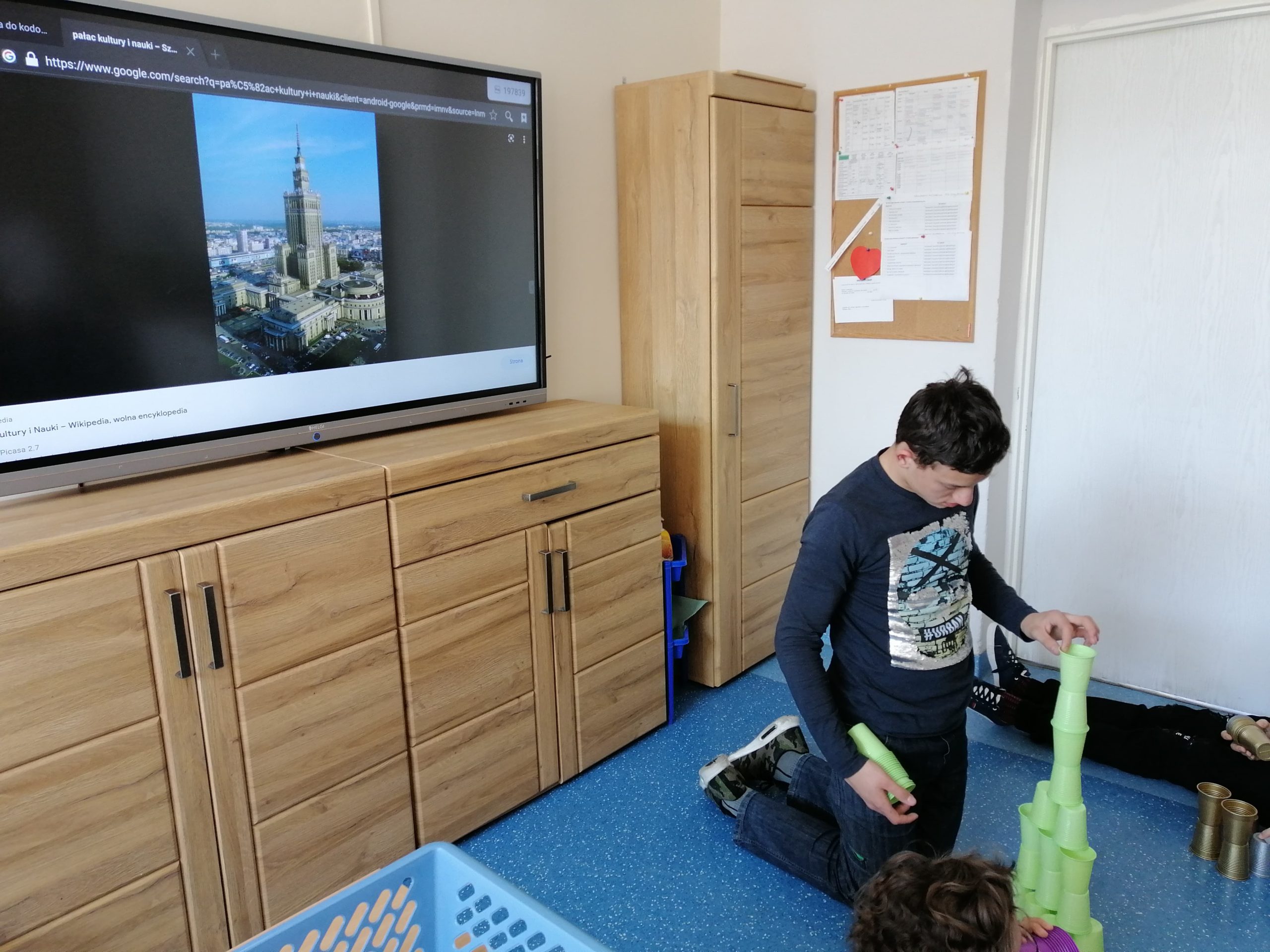 Klasy: Ia, IIc, VIIIc oraz VI/VIIa, wykorzystując wirtualną matę do kodowania, realizowały ciekawą tematykę, dotyczącą Polski. Utrwalały symbole narodowe oraz pierwsze stolice naszego kraju. Następnie wznosiły Pałac Kultury i Nauki oraz osadę Biskupin z kolorowych kubeczków. Na zakończenie spotkania utrwalały kolory, tworząc wirtualną flagę naszego kraju.