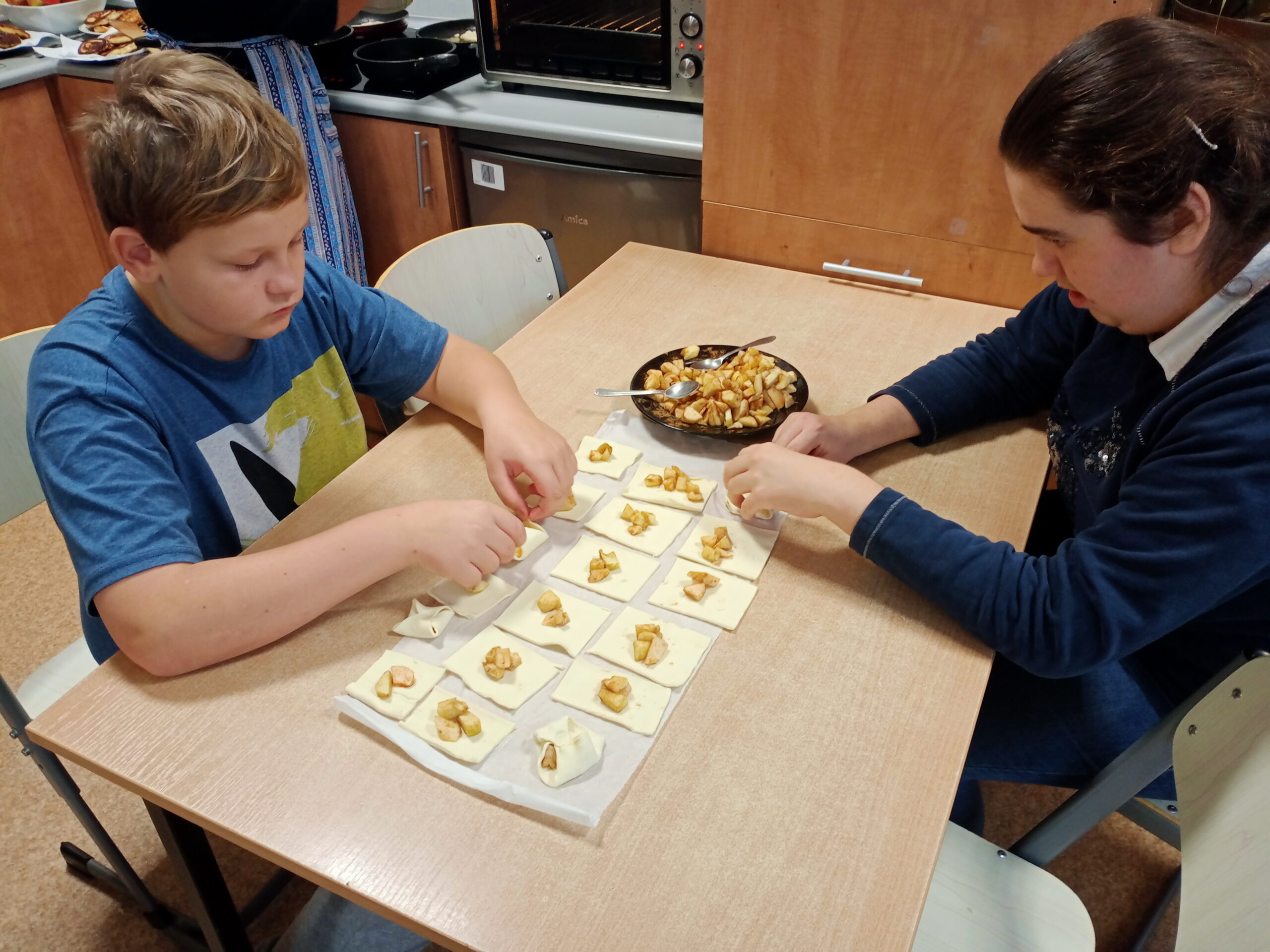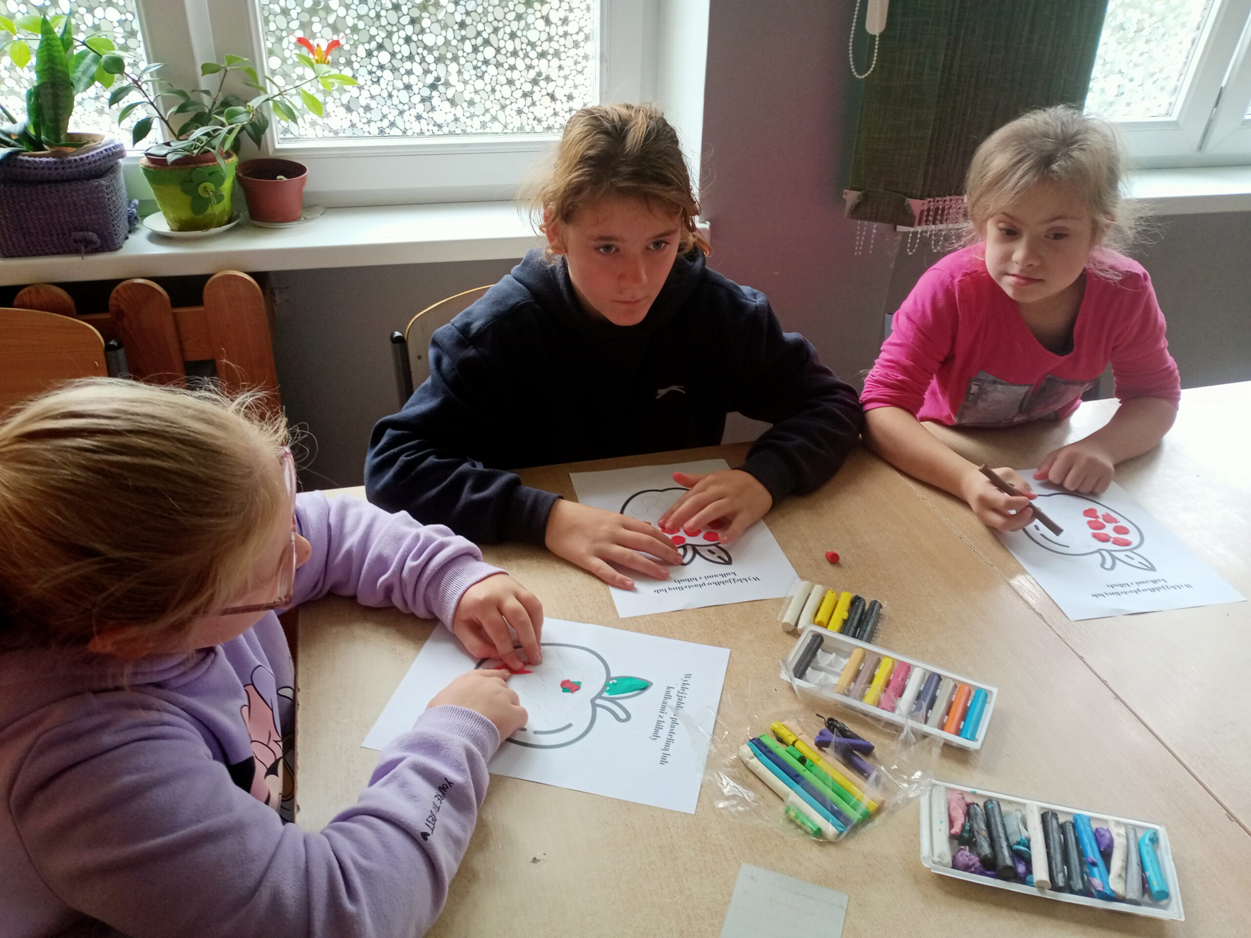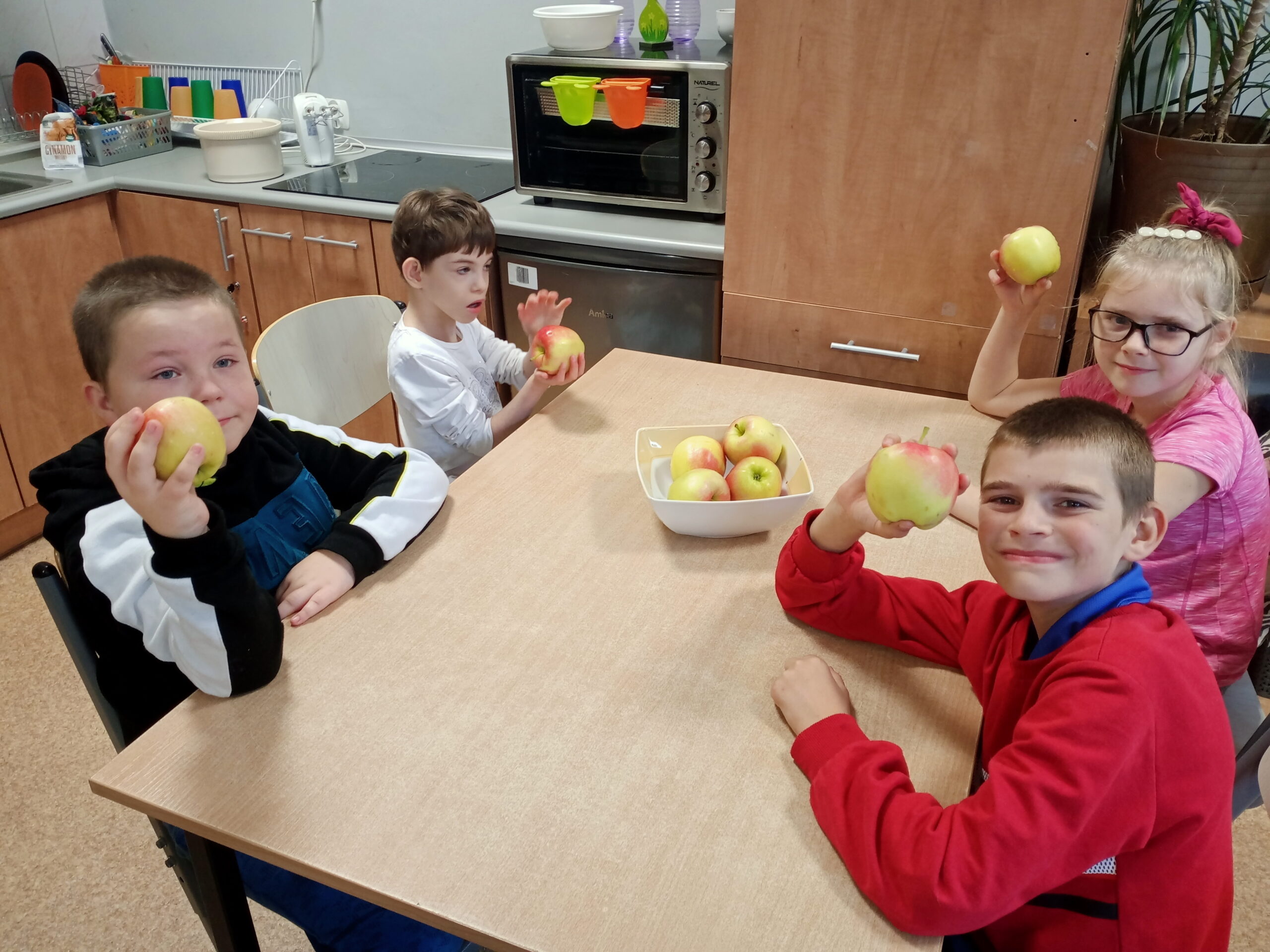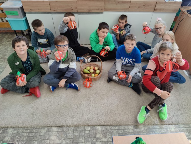 Dnia 28 września obchodziliśmy w świetlicy święto jabłka. Już od rana pachniało nimi w całej szkole. Wspólnie z dziećmi piekliśmy pyszne i aromatyczne racuchy. Na tym nie poprzestaliśmy, bo już po chwili z piekarnika wydobywał się kuszący zapach cynamonowych jabłek. I jak myślicie, że to koniec, to się mylicie! Były jeszcze jabłka w kopertach z ciasta francuskiego. Po zajęciach kulinarnych ochoczo przystąpiliśmy do zajęć twórczych, podczas których przygotowaliśmy kolorowe prace. Do smakowitej zabawy dołączyła klasa III b i III c SP.