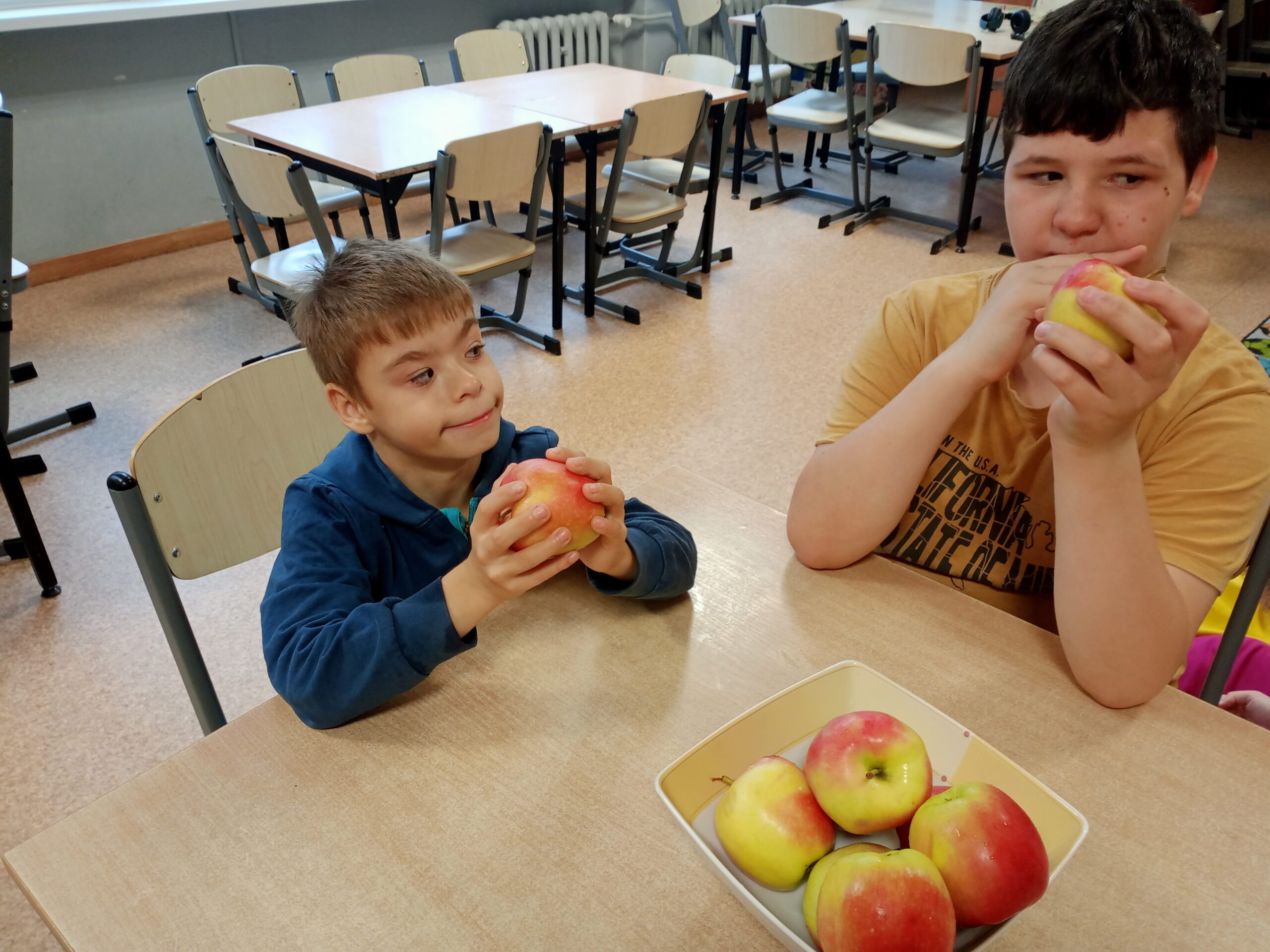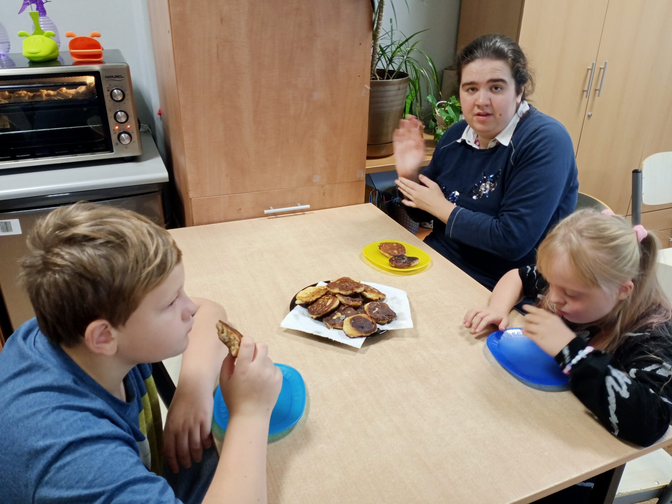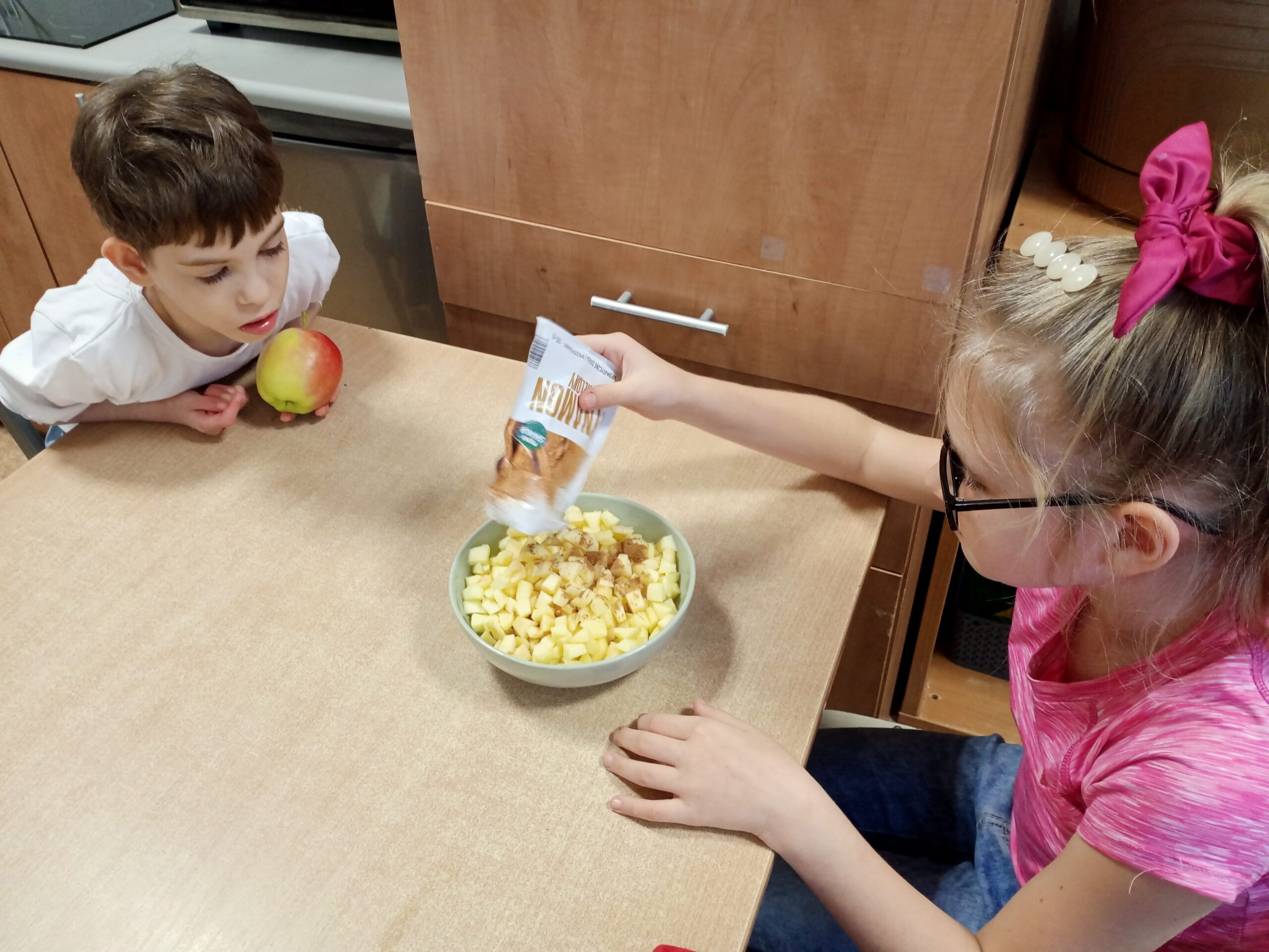 Dnia 28 września obchodziliśmy w świetlicy święto jabłka. Już od rana pachniało nimi w całej szkole. Wspólnie z dziećmi piekliśmy pyszne i aromatyczne racuchy. Na tym nie poprzestaliśmy, bo już po chwili z piekarnika wydobywał się kuszący zapach cynamonowych jabłek. I jak myślicie, że to koniec, to się mylicie! Były jeszcze jabłka w kopertach z ciasta francuskiego. Po zajęciach kulinarnych ochoczo przystąpiliśmy do zajęć twórczych, podczas których przygotowaliśmy kolorowe prace. Do smakowitej zabawy dołączyła klasa III b i III c SP.