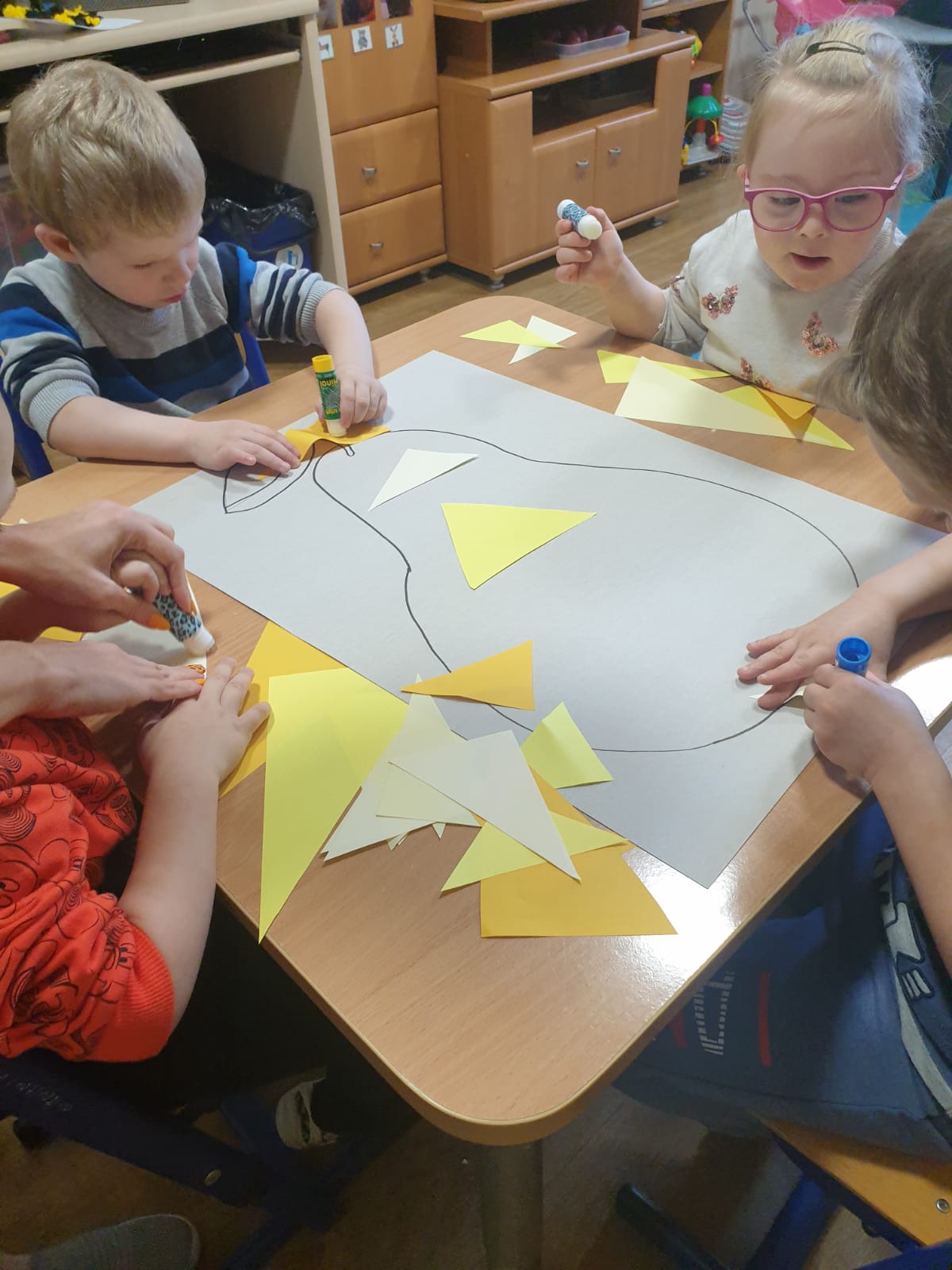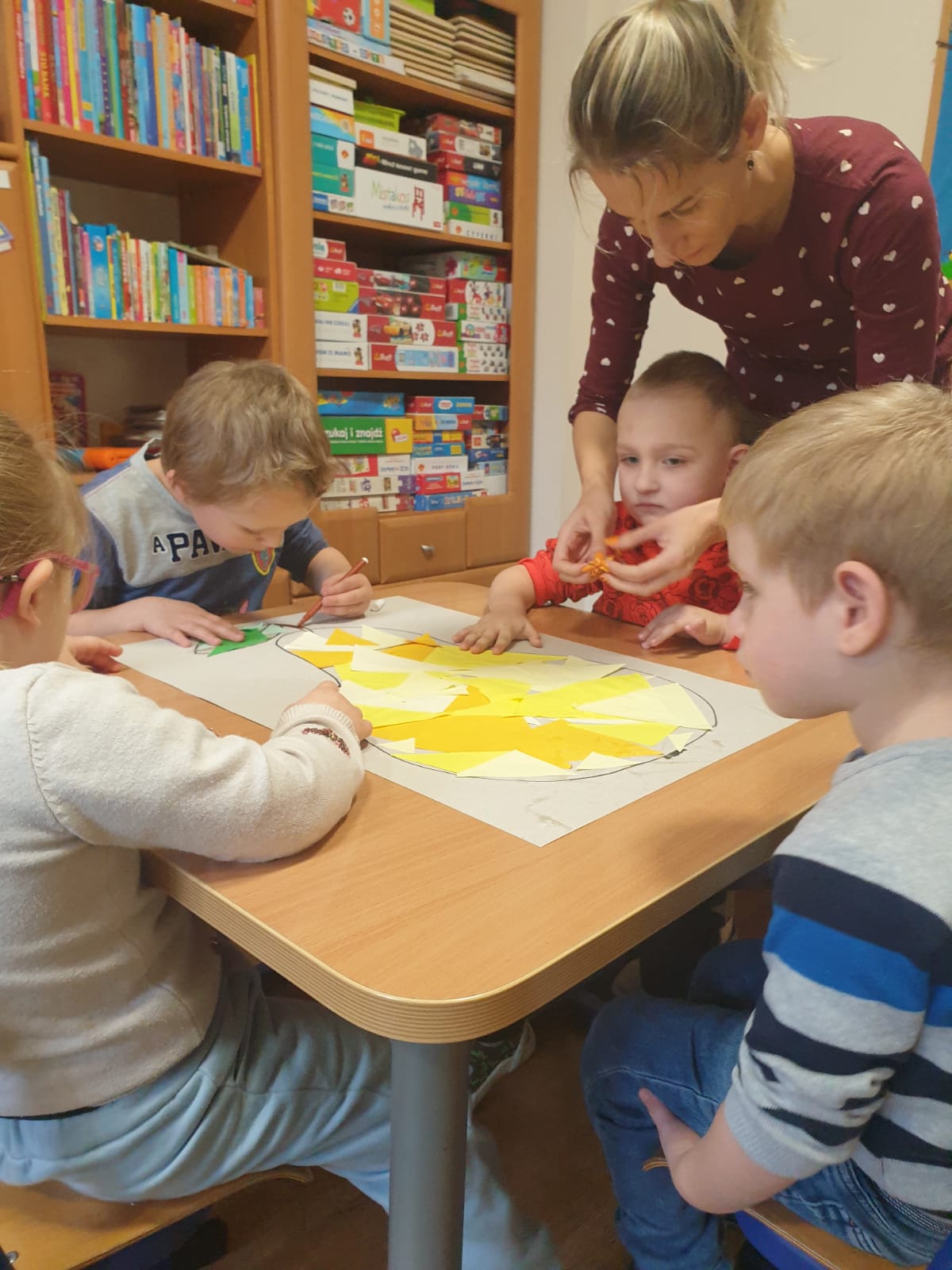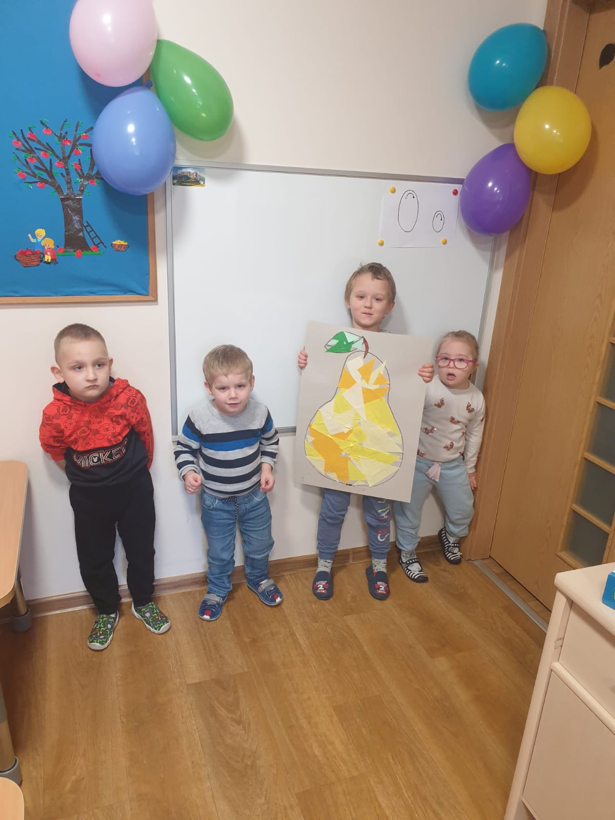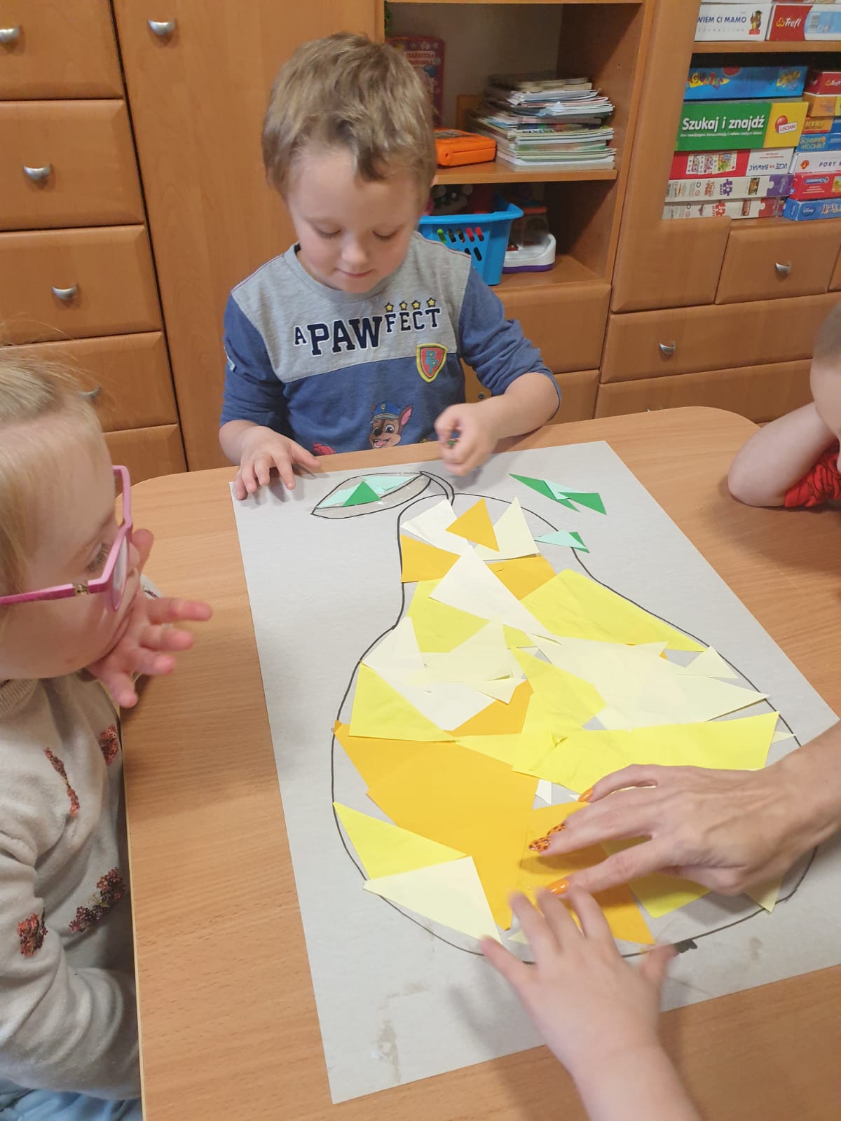 W ramach projektu dzieci wykonały dziś jedno z zadań – monochromatyzm. Do wykonania pracy wybraliśmy różne odcienie żółtego papieru. Wyklejaliśmy gruszkę, dodatkowo uczyliśmy się współpracy w grupie.