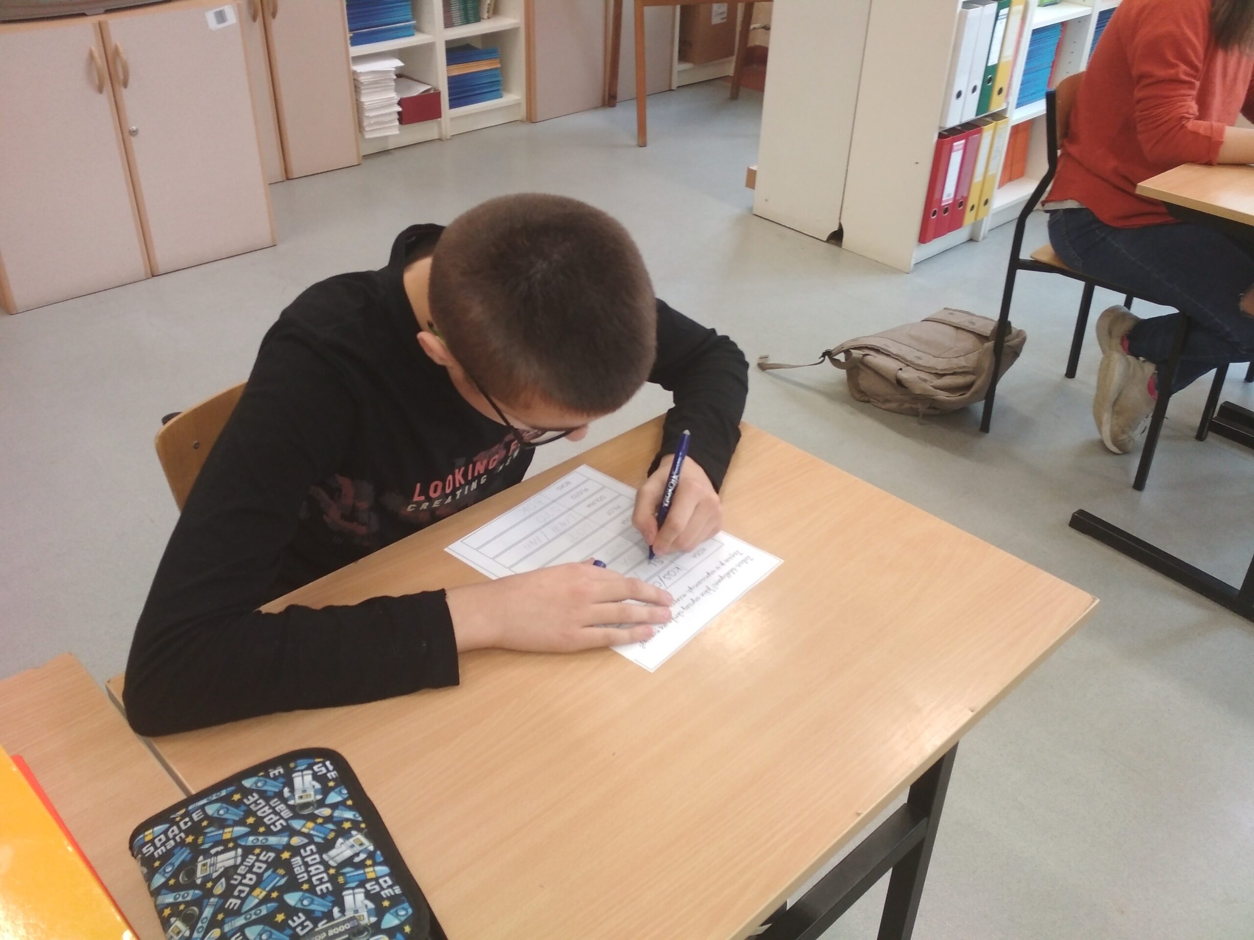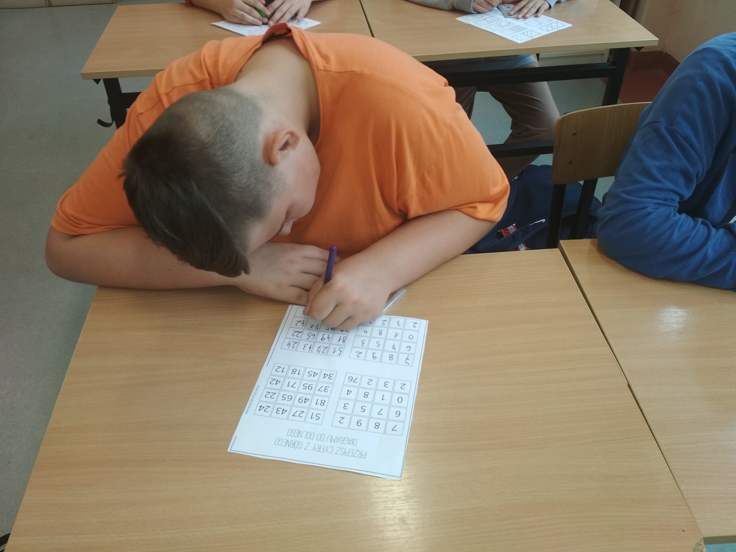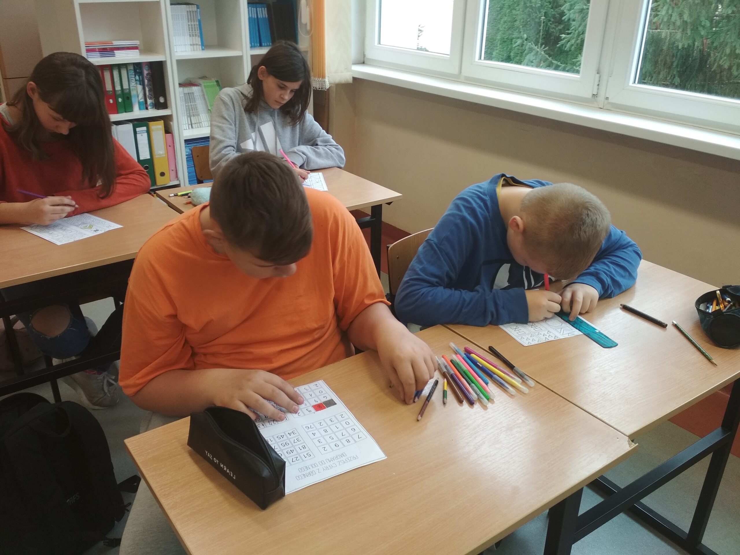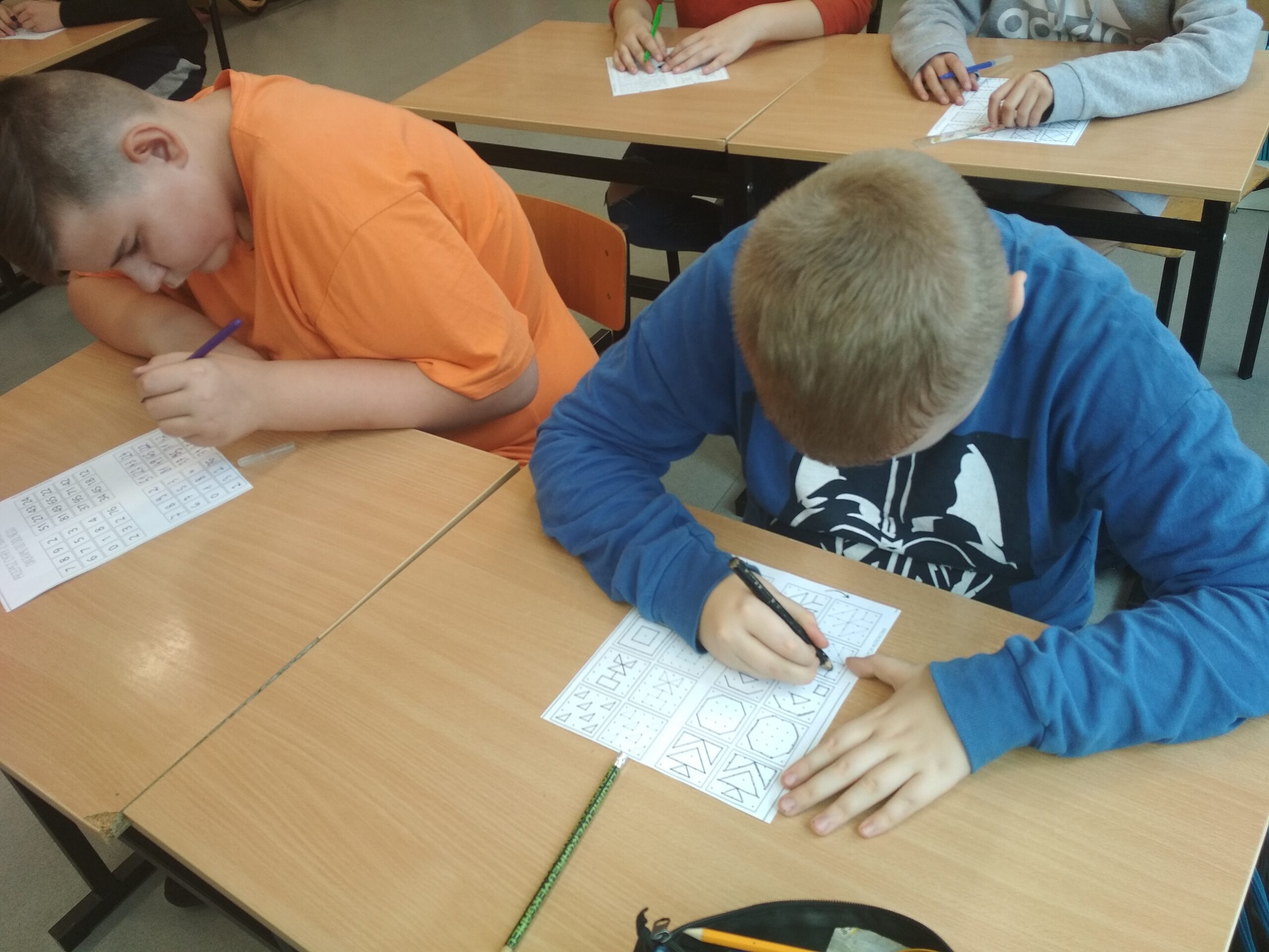 Klasa Va z zapałem przystąpiła do przysłowiowej rozgrzewki w owej potyczce z ortografią, niczym ortopestką. Ćwiczenia koordynacji wzrokowo-ruchowej, zaplanowane we wstępnej fazie realizacji programu, z pewnością ułatwią przyswajanie wzorców w pisowni wyrazów z trudnością ortograficzną.