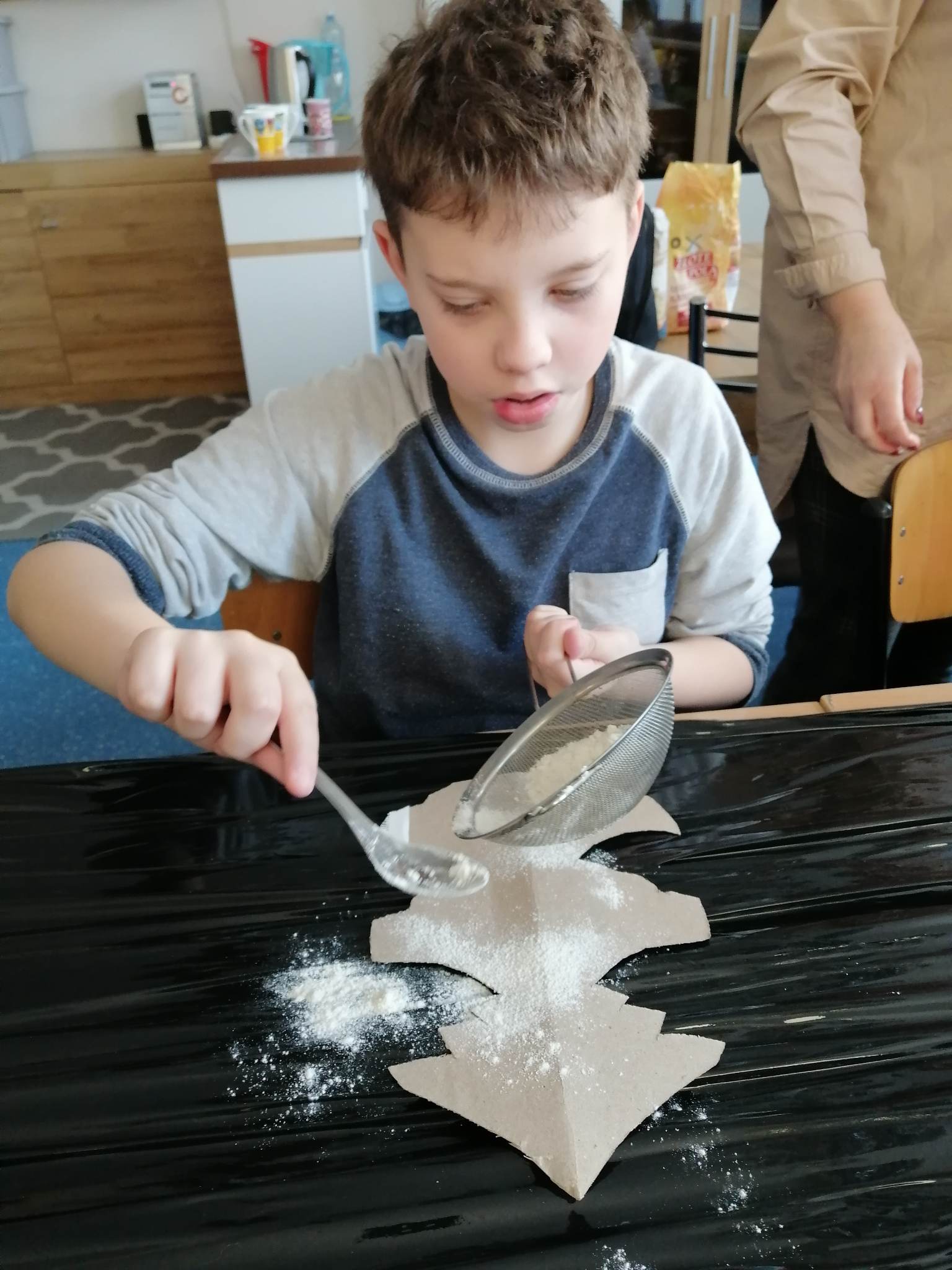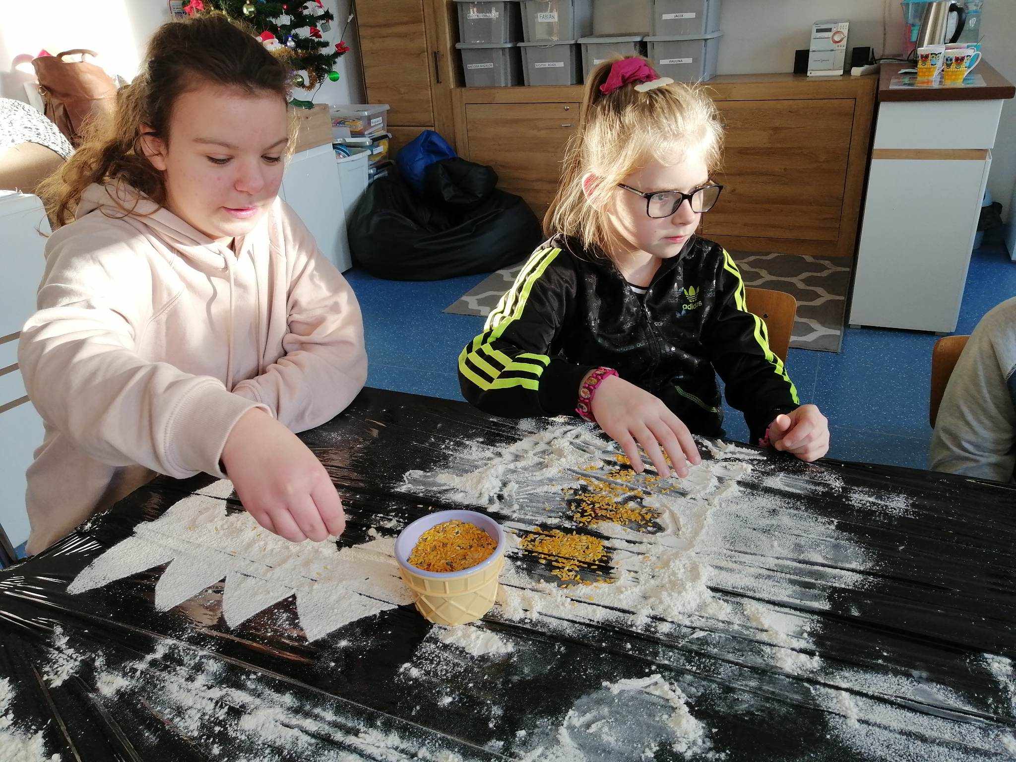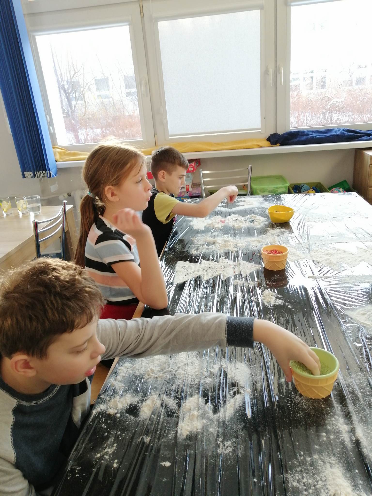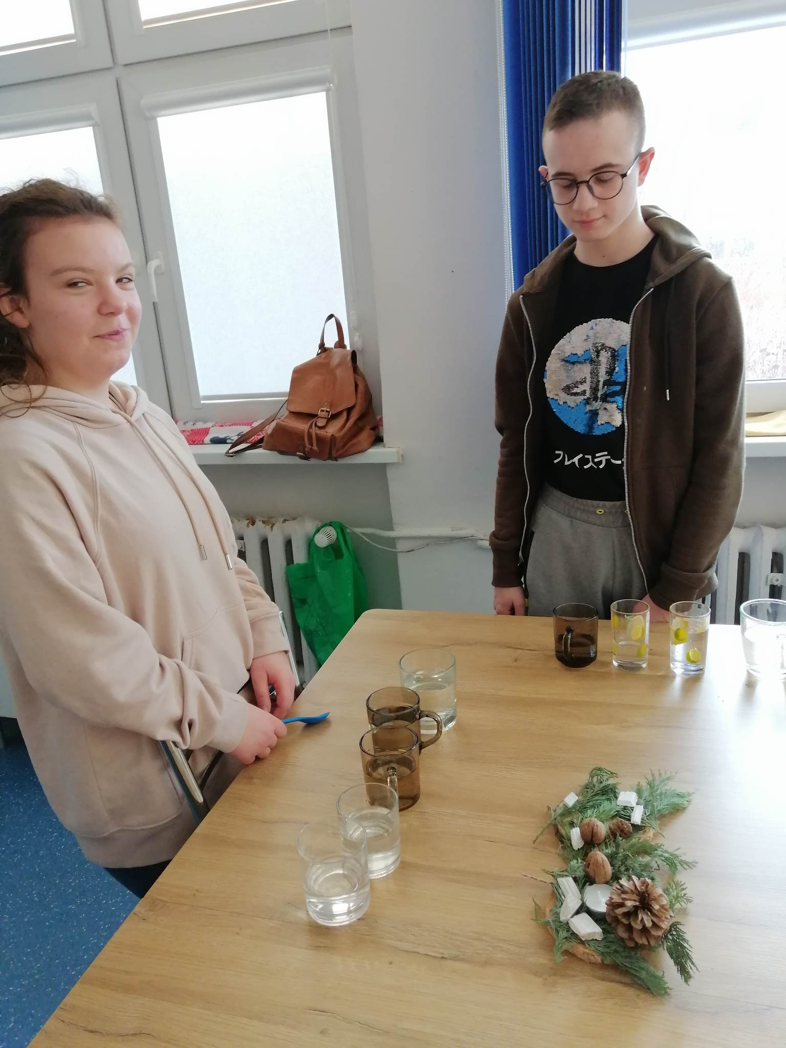 Wstępem do dzisiejszych zajęć z innowacji pedagogicznej była prezentacja o charakterze świątecznym, która stała się inspiracją dla kreatywnych i twórczych działań z wykorzystaniem naturalnych składników. Uczniowie klas III c i VII/VIII a stworzyli zimowy krajobraz, z choinką w roli głównej. Następnie do dźwięków świątecznych utworów dzieci improwizowały na wodnych instrumentach, których dźwięk niósł się po całym korytarzu szkolnym.