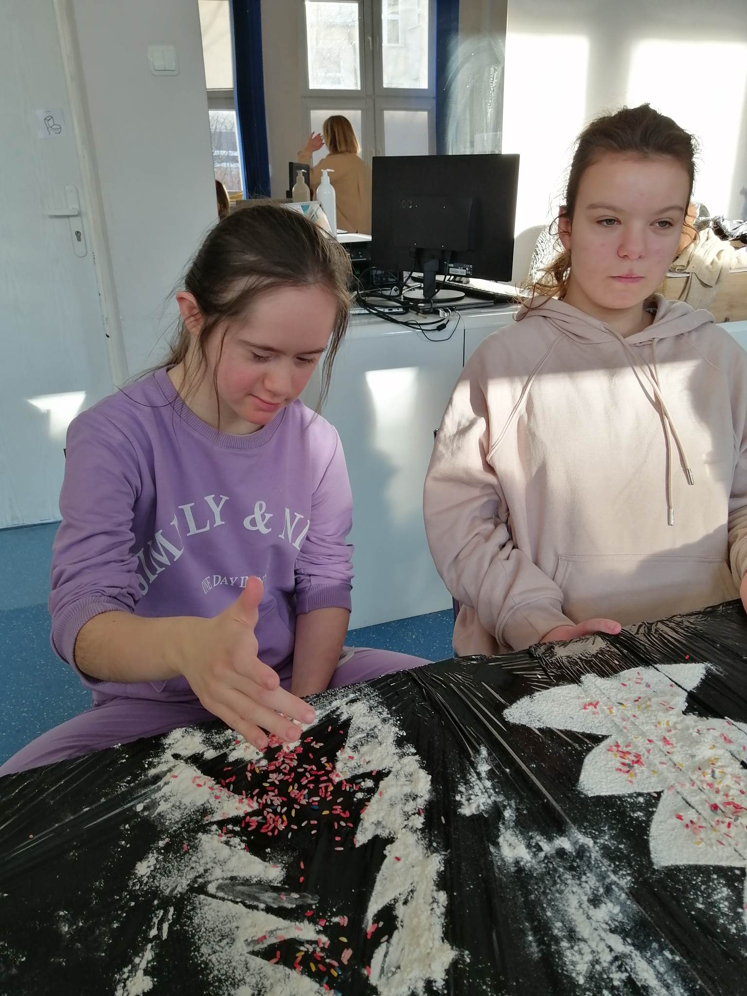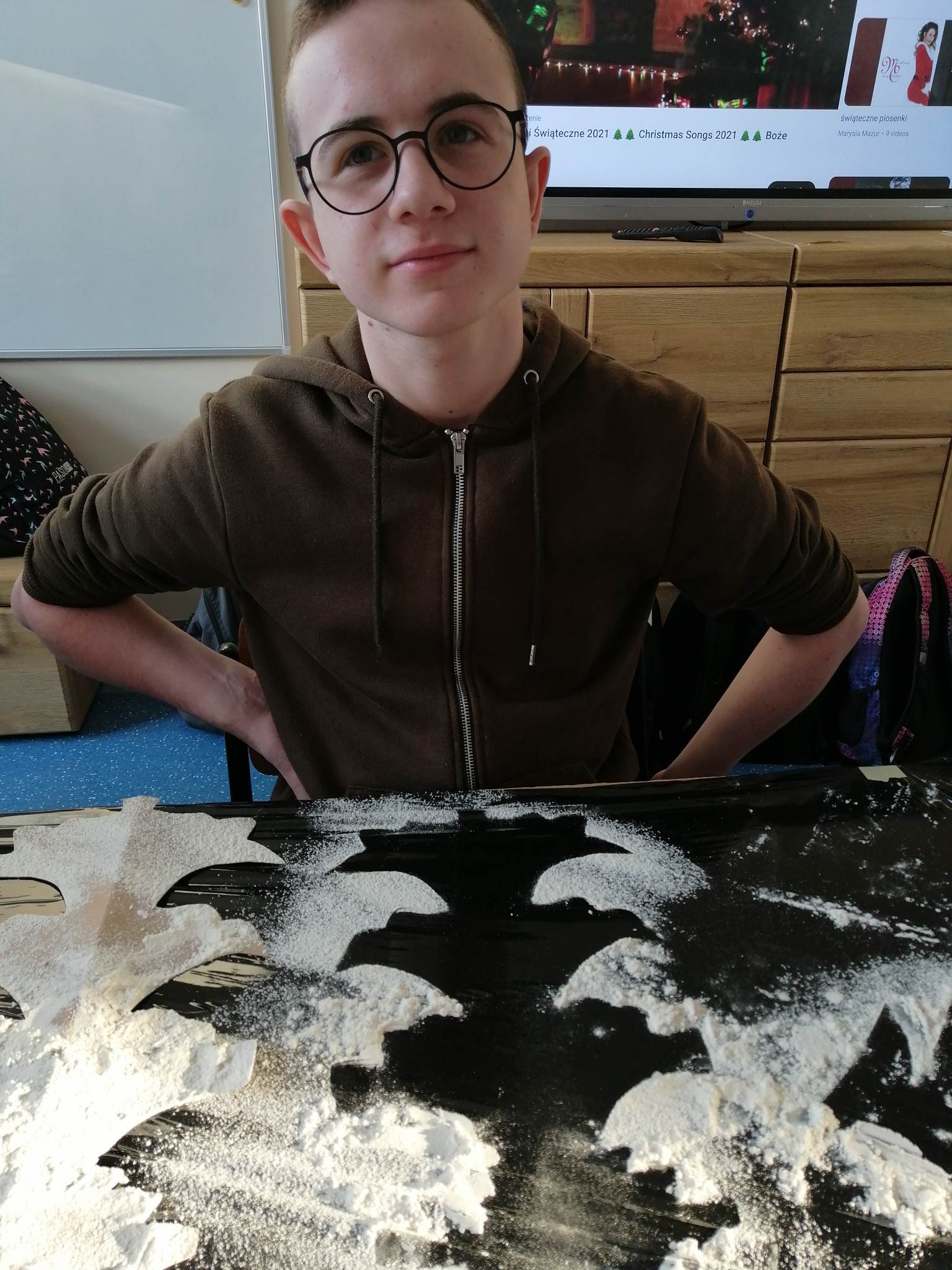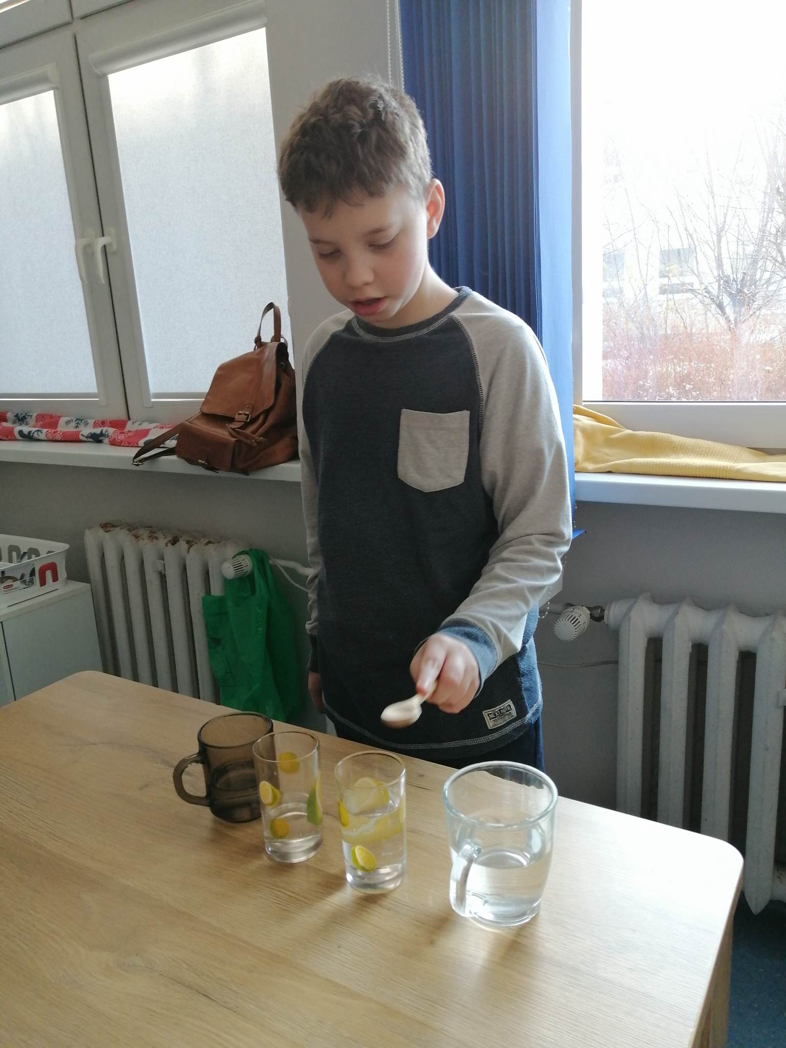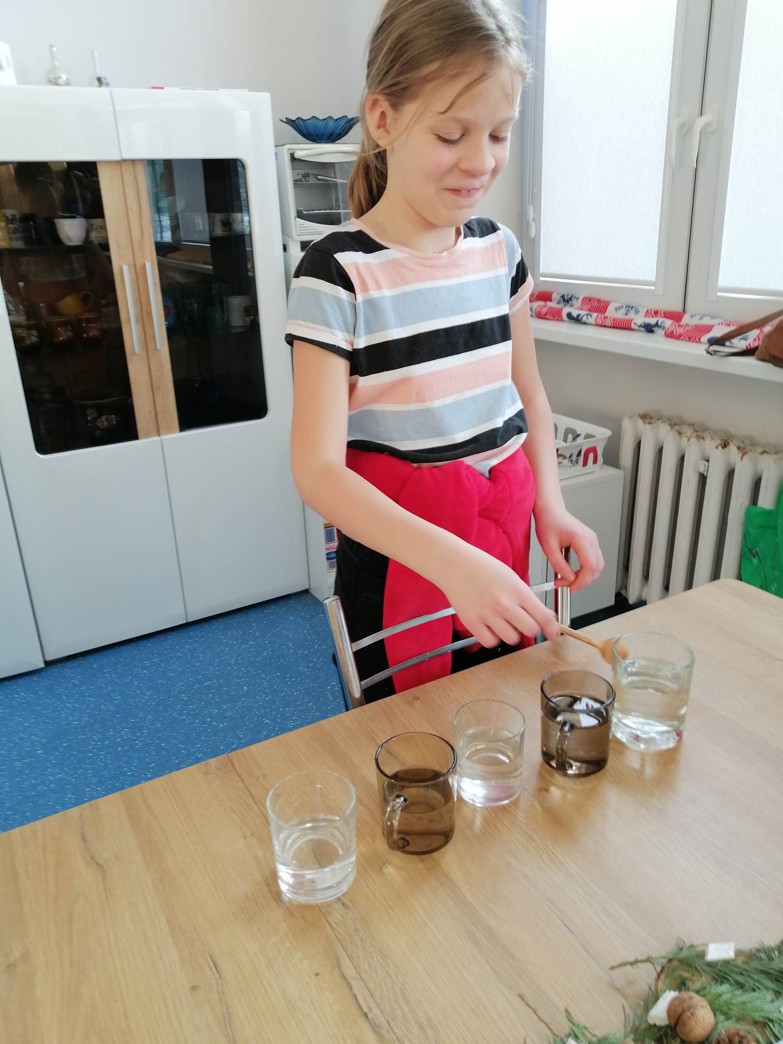 Wstępem do dzisiejszych zajęć z innowacji pedagogicznej była prezentacja o charakterze świątecznym, która stała się inspiracją dla kreatywnych i twórczych działań z wykorzystaniem naturalnych składników. Uczniowie klas III c i VII/VIII a stworzyli zimowy krajobraz, z choinką w roli głównej. Następnie do dźwięków świątecznych utworów dzieci improwizowały na wodnych instrumentach, których dźwięk niósł się po całym korytarzu szkolnym.