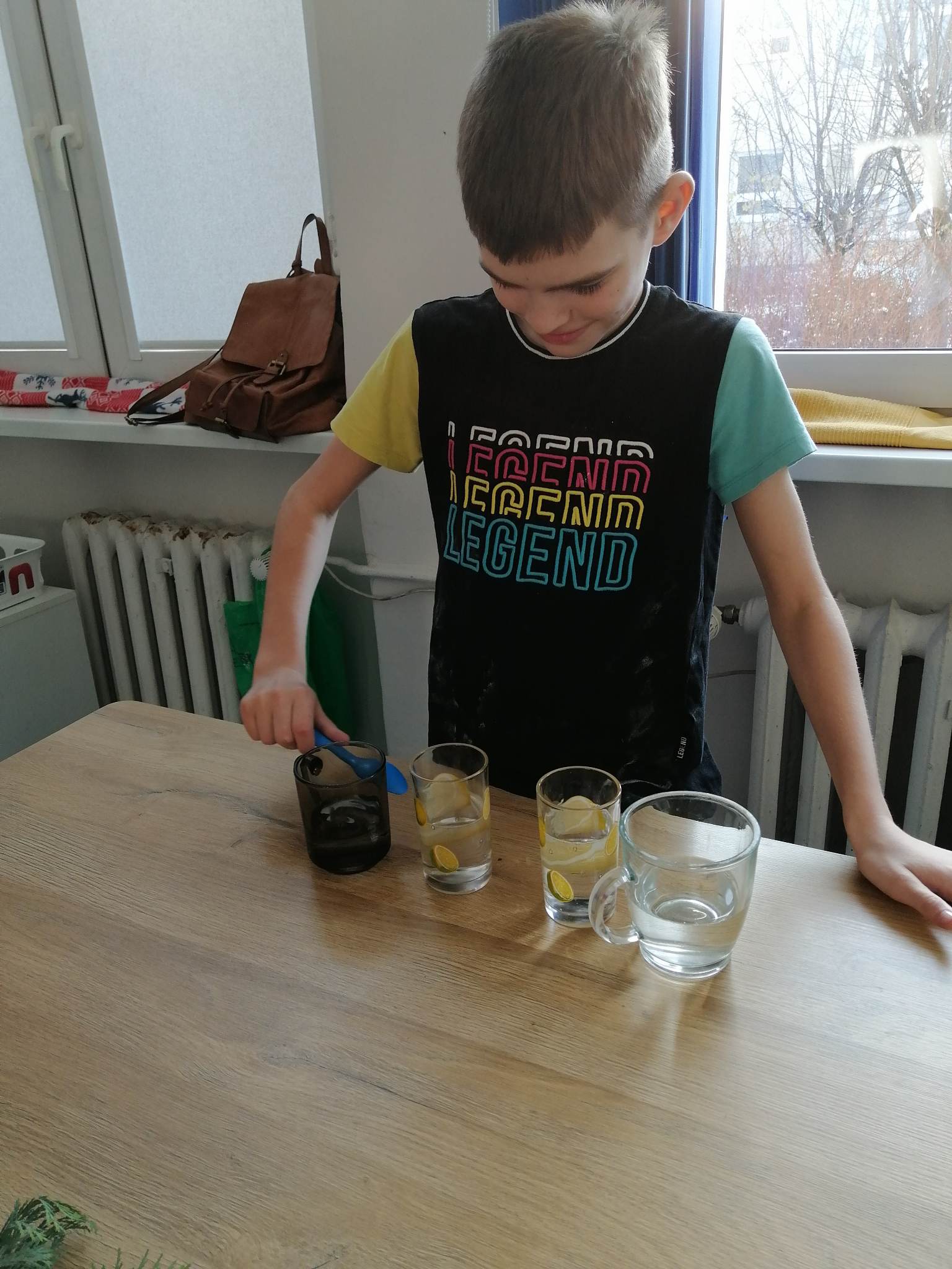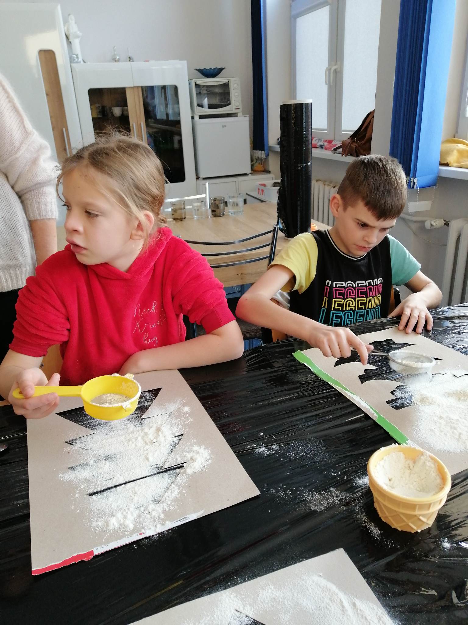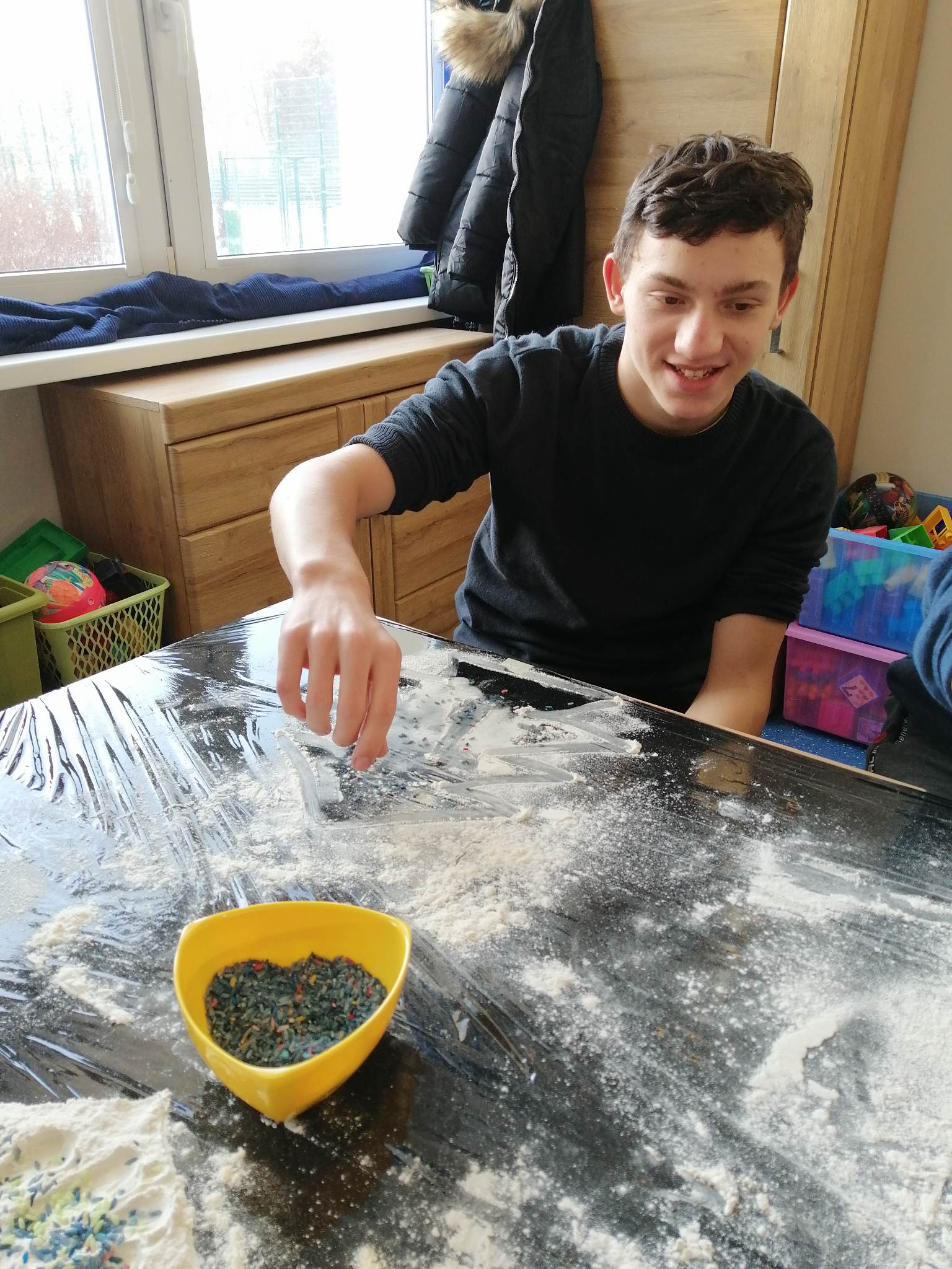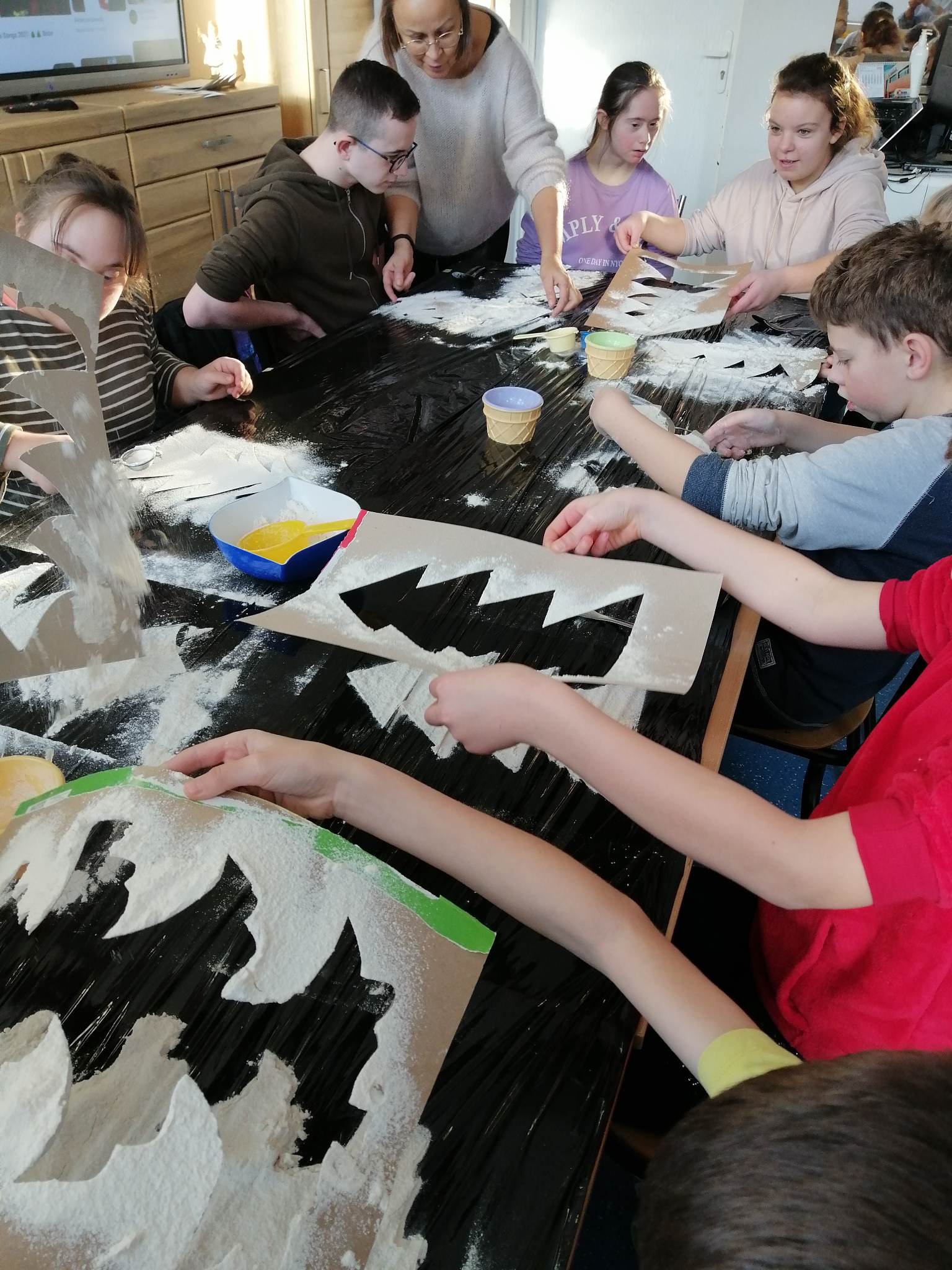Wstępem do dzisiejszych zajęć z innowacji pedagogicznej była prezentacja o charakterze świątecznym, która stała się inspiracją dla kreatywnych i twórczych działań z wykorzystaniem naturalnych składników. Uczniowie klas III c i VII/VIII a stworzyli zimowy krajobraz, z choinką w roli głównej. Następnie do dźwięków świątecznych utworów dzieci improwizowały na wodnych instrumentach, których dźwięk niósł się po całym korytarzu szkolnym.