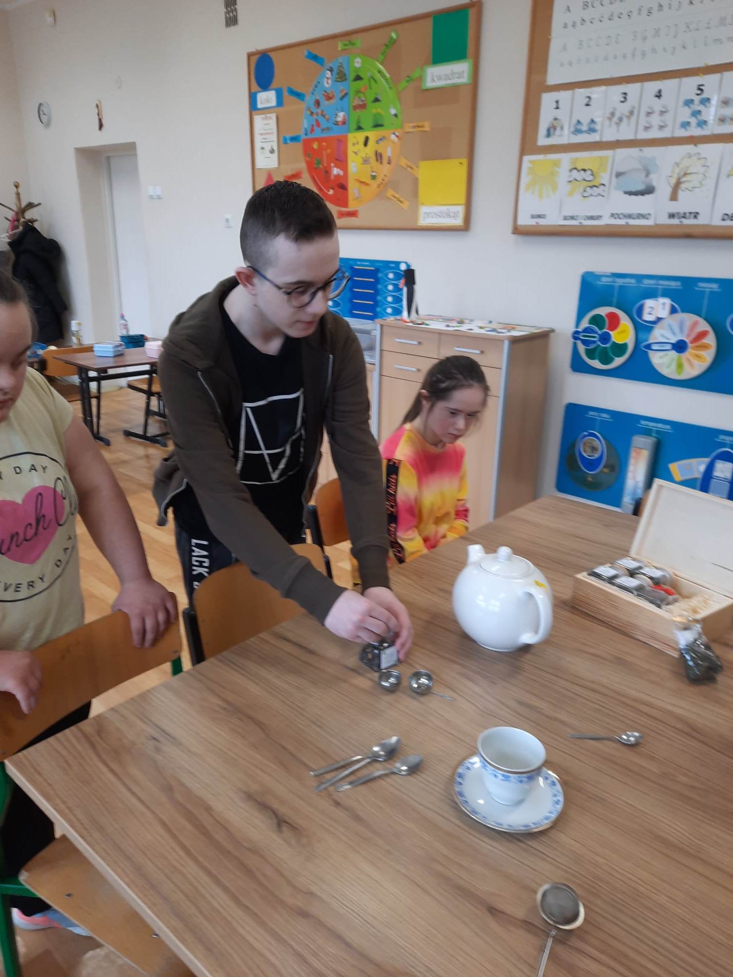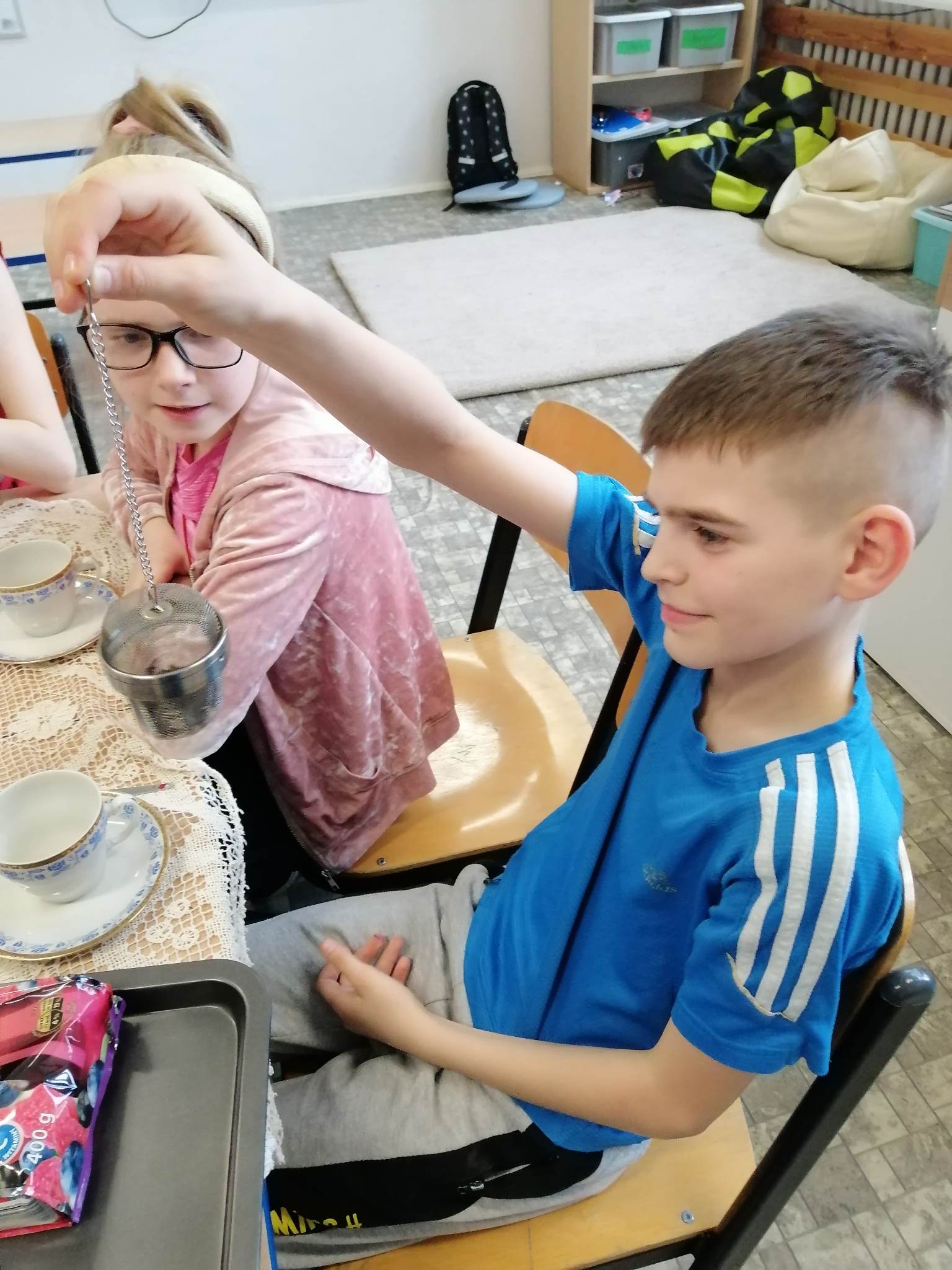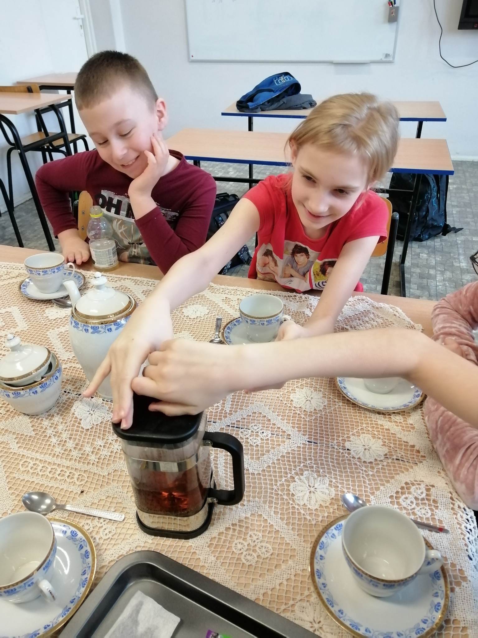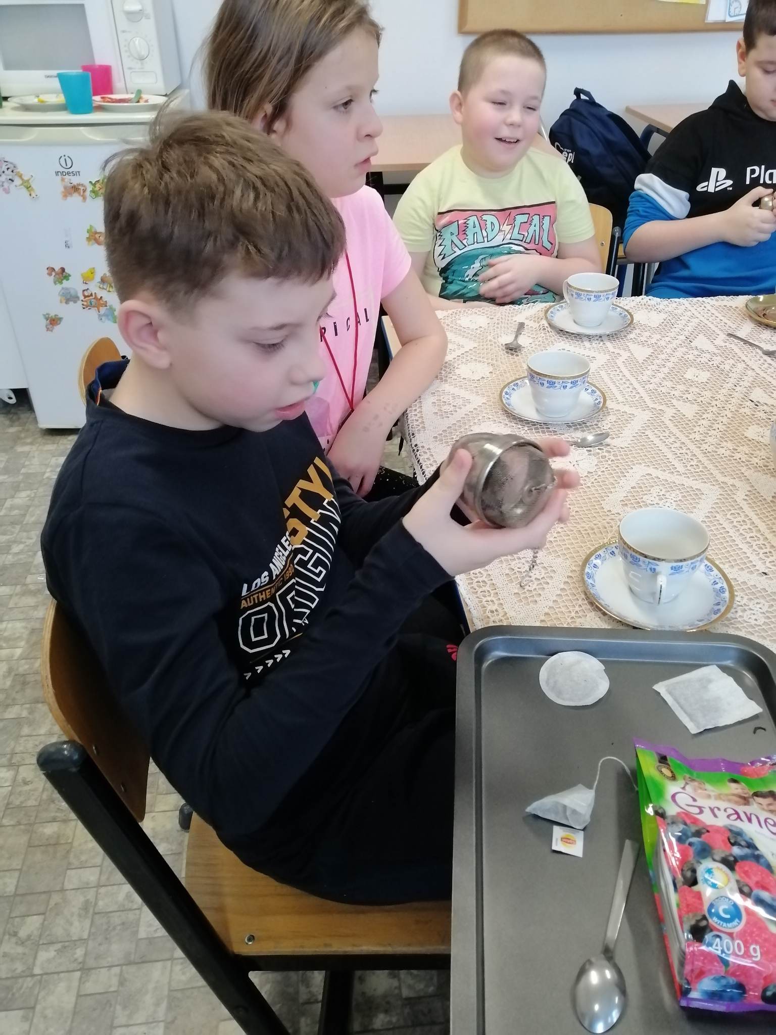 Podczas prezentacji określali położenie Anglii w Europie, poznali angielską flagę i godło oraz niektóre zwyczaje Anglików – angielska herbatka. Po teorii nadszedł czas na …. herbatę. Na stole uczniowie mieli przygotowaną zastawę do sporządzenia herbatki. Każdy mógł wybrać dla siebie inny rodzaj herbaty: zielona, czarna, czerwona. Na elegancko przygotowanym przez uczniów stole, w herbacianym serwisie, uczestnicy delektowali się samodzielnie zaparzona herbatą.