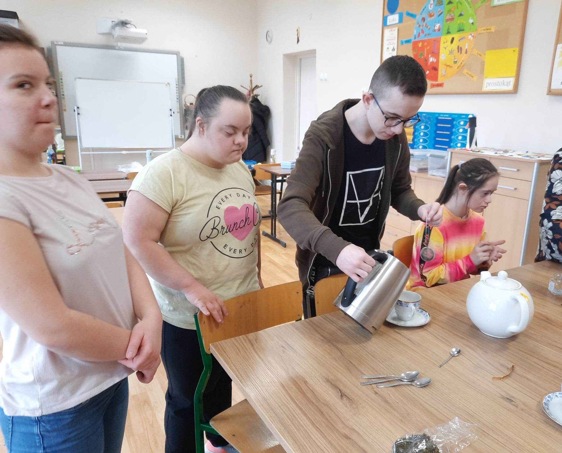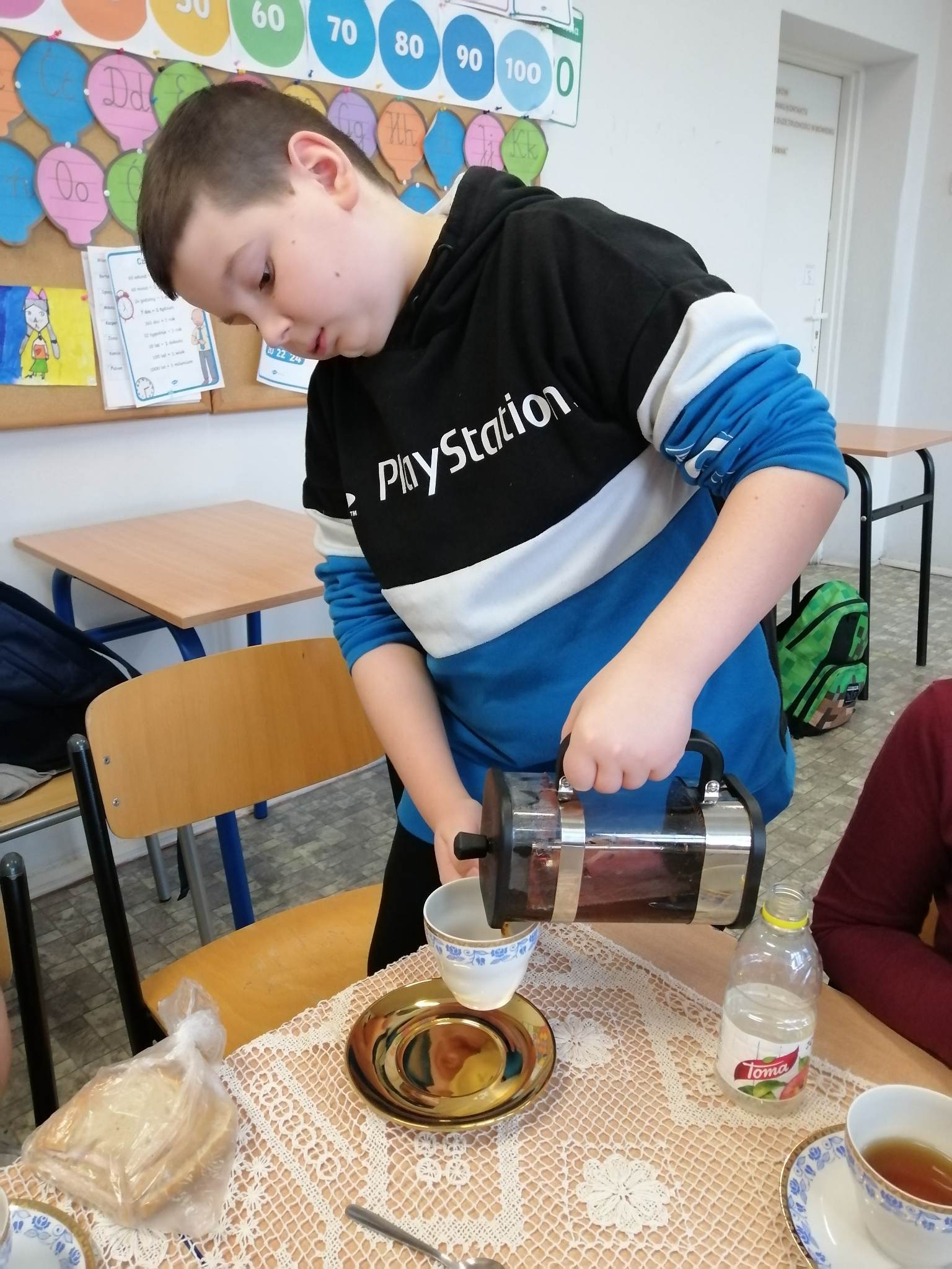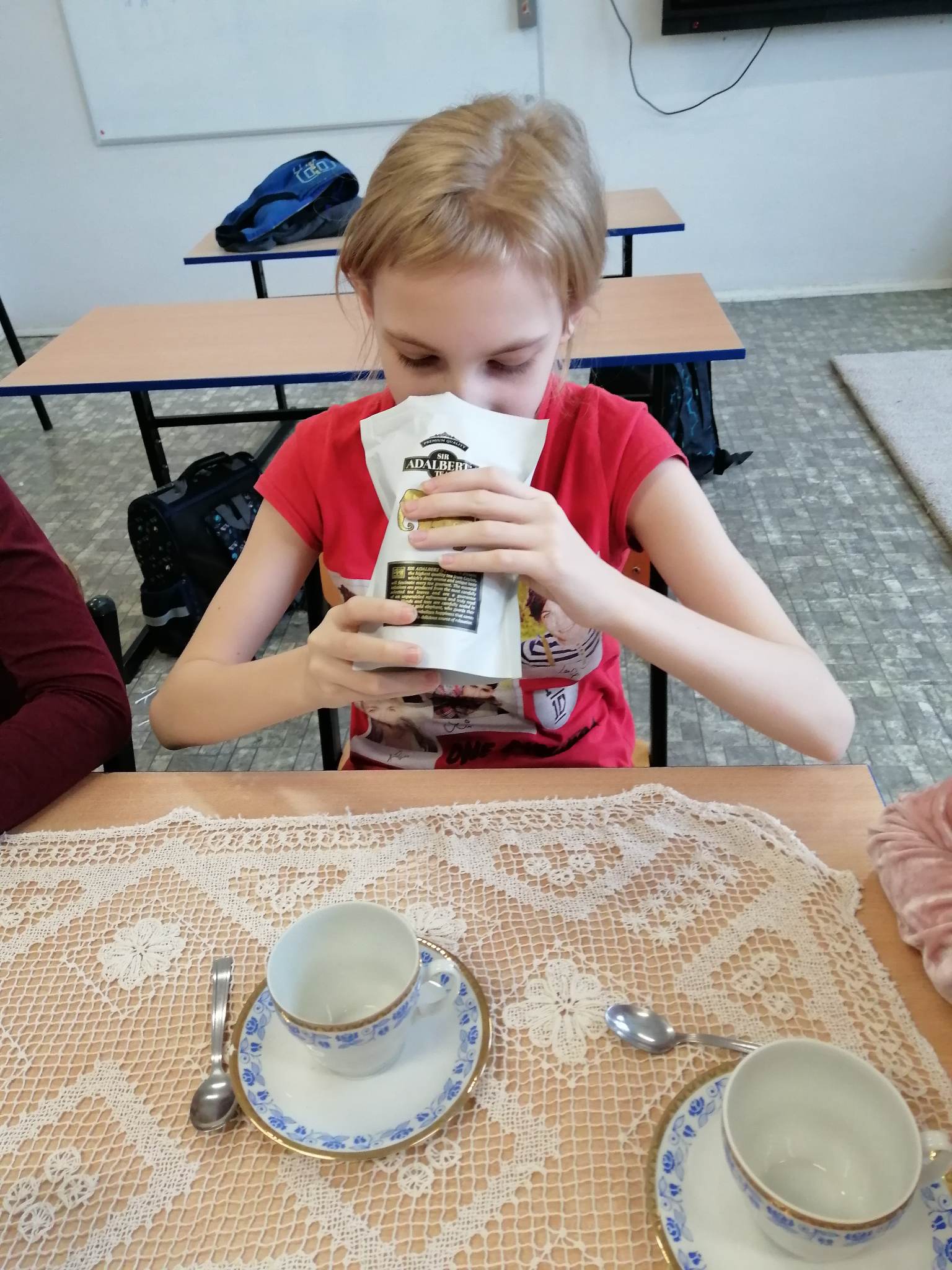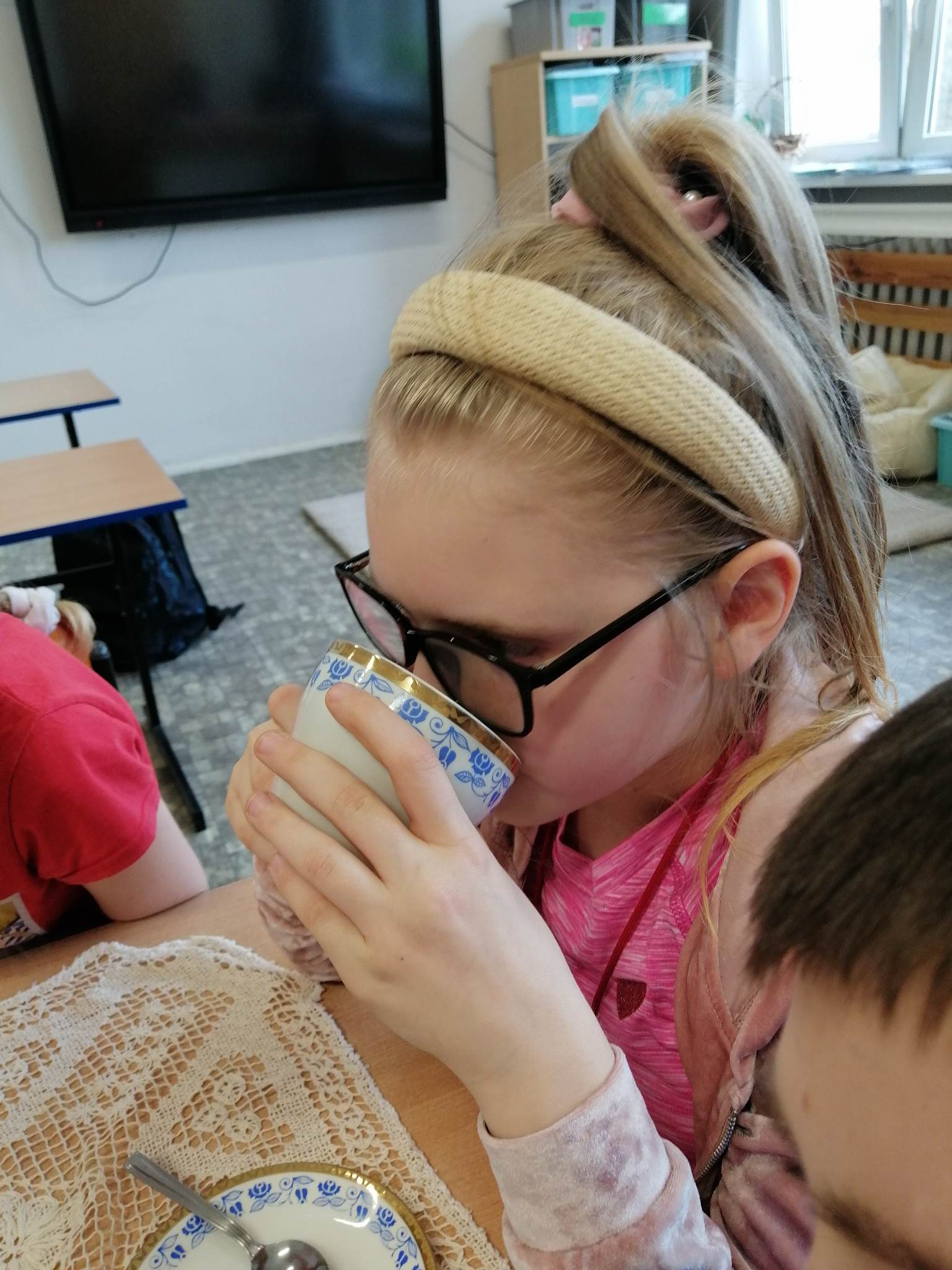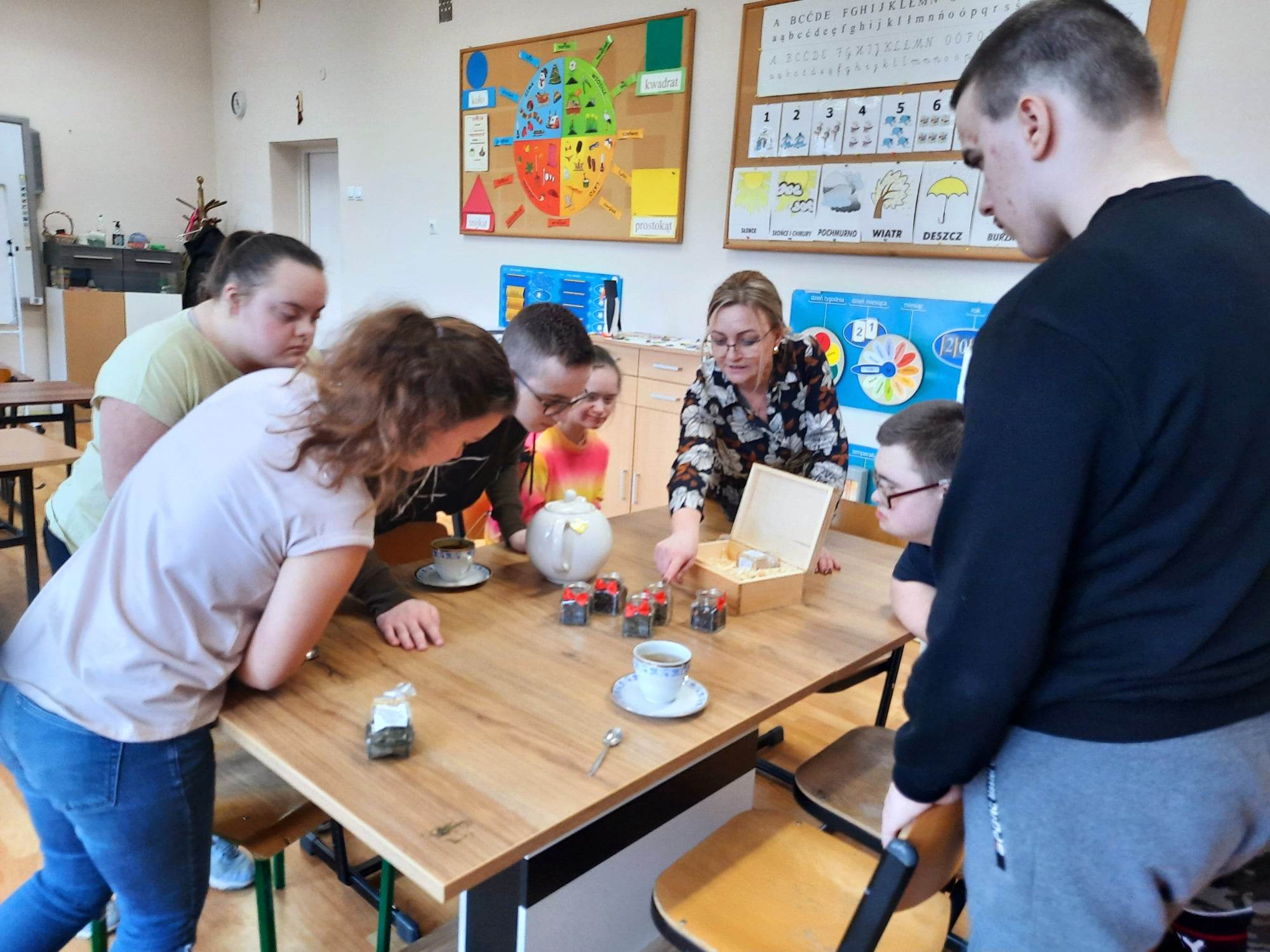 Podczas prezentacji określali położenie Anglii w Europie, poznali angielską flagę i godło oraz niektóre zwyczaje Anglików – angielska herbatka. Po teorii nadszedł czas na …. herbatę. Na stole uczniowie mieli przygotowaną zastawę do sporządzenia herbatki. Każdy mógł wybrać dla siebie inny rodzaj herbaty: zielona, czarna, czerwona. Na elegancko przygotowanym przez uczniów stole, w herbacianym serwisie, uczestnicy delektowali się samodzielnie zaparzona herbatą.