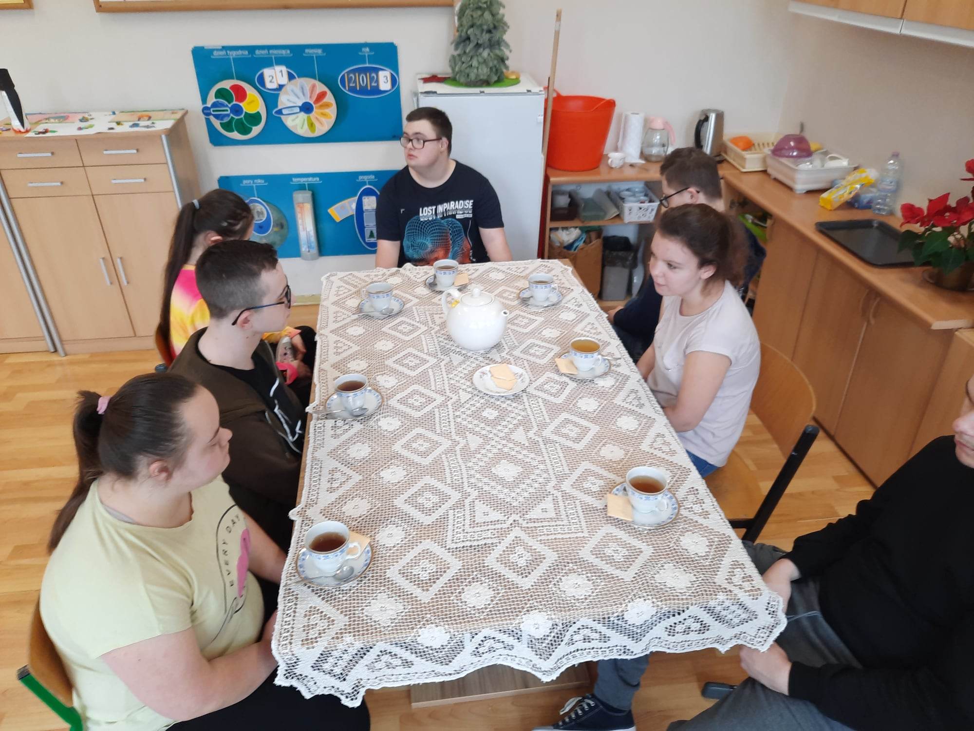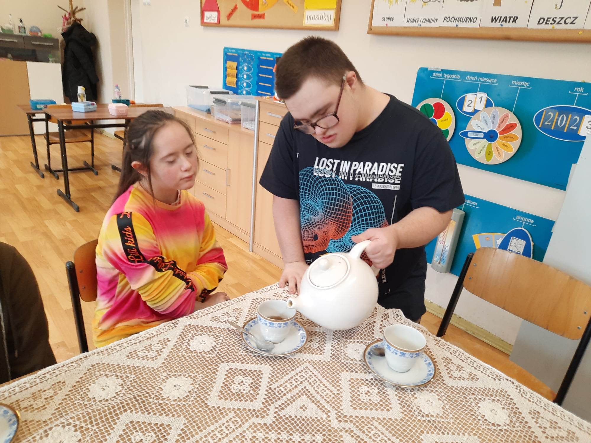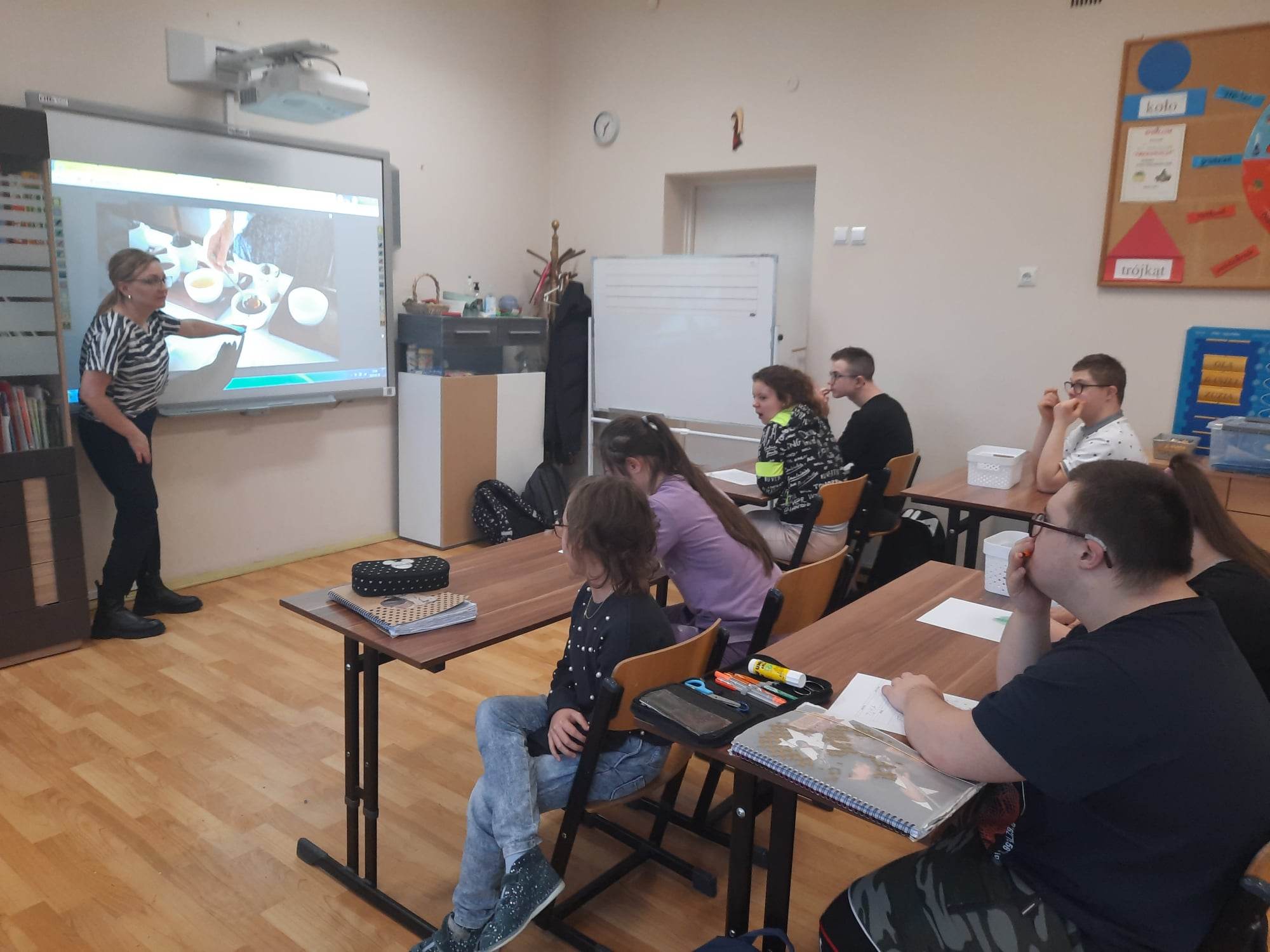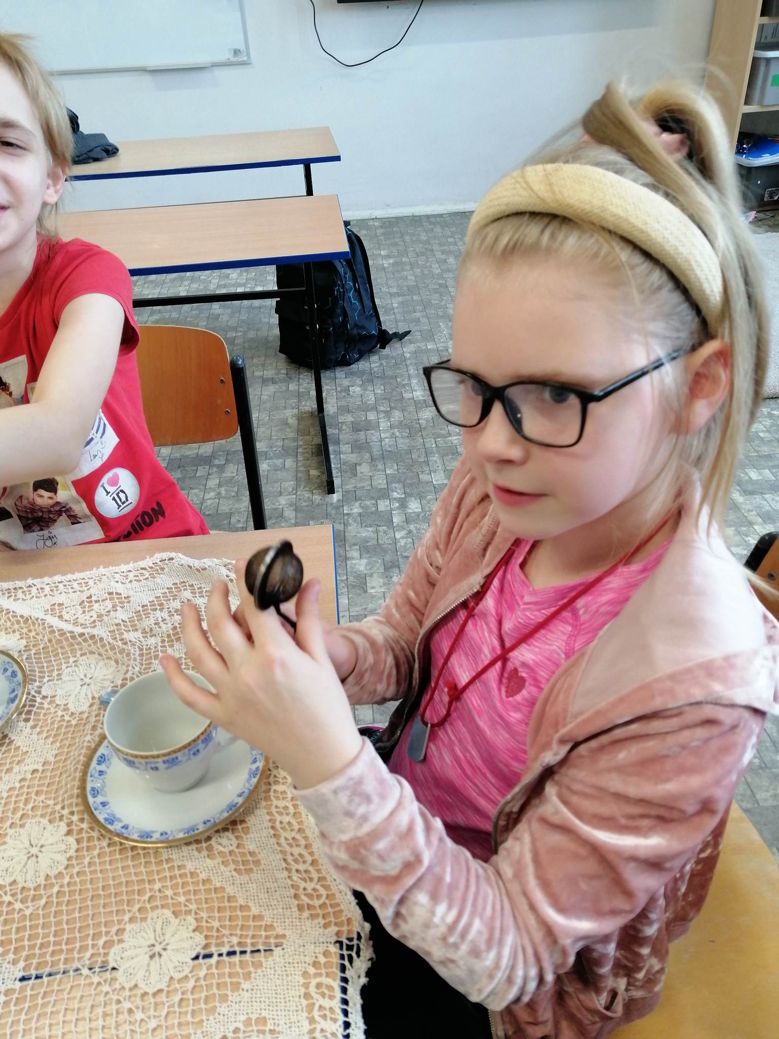 Podczas prezentacji określali położenie Anglii w Europie, poznali angielską flagę i godło oraz niektóre zwyczaje Anglików – angielska herbatka. Po teorii nadszedł czas na …. herbatę. Na stole uczniowie mieli przygotowaną zastawę do sporządzenia herbatki. Każdy mógł wybrać dla siebie inny rodzaj herbaty: zielona, czarna, czerwona. Na elegancko przygotowanym przez uczniów stole, w herbacianym serwisie, uczestnicy delektowali się samodzielnie zaparzona herbatą.