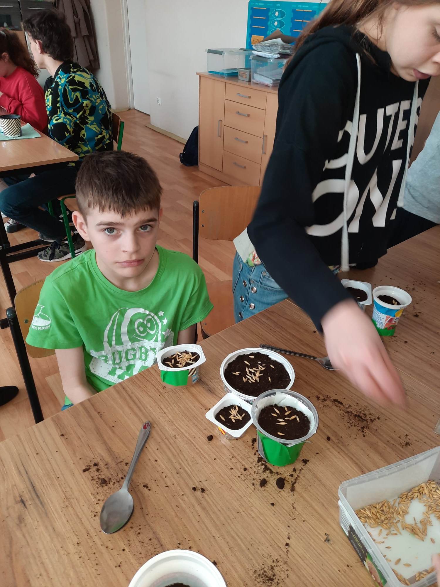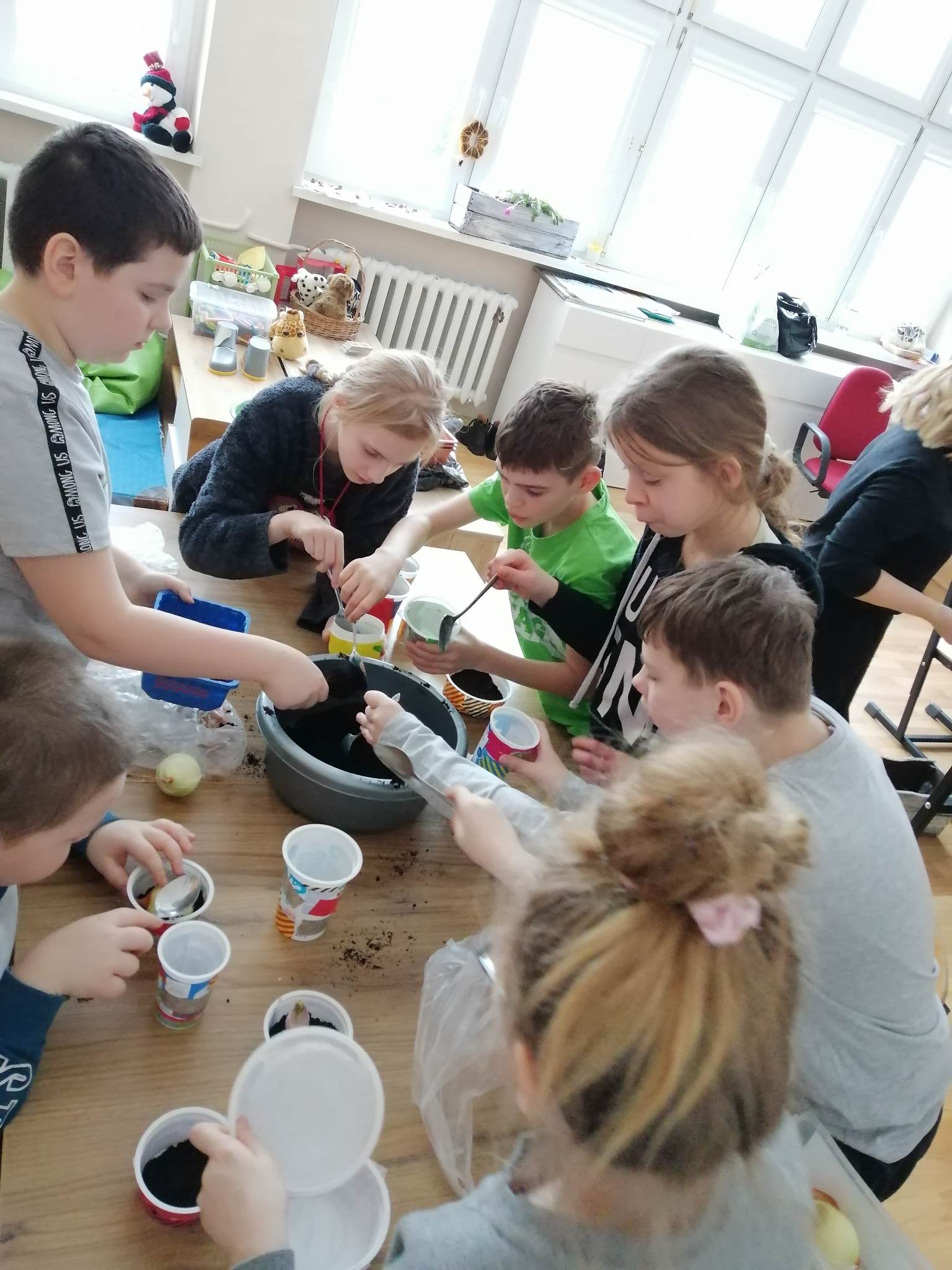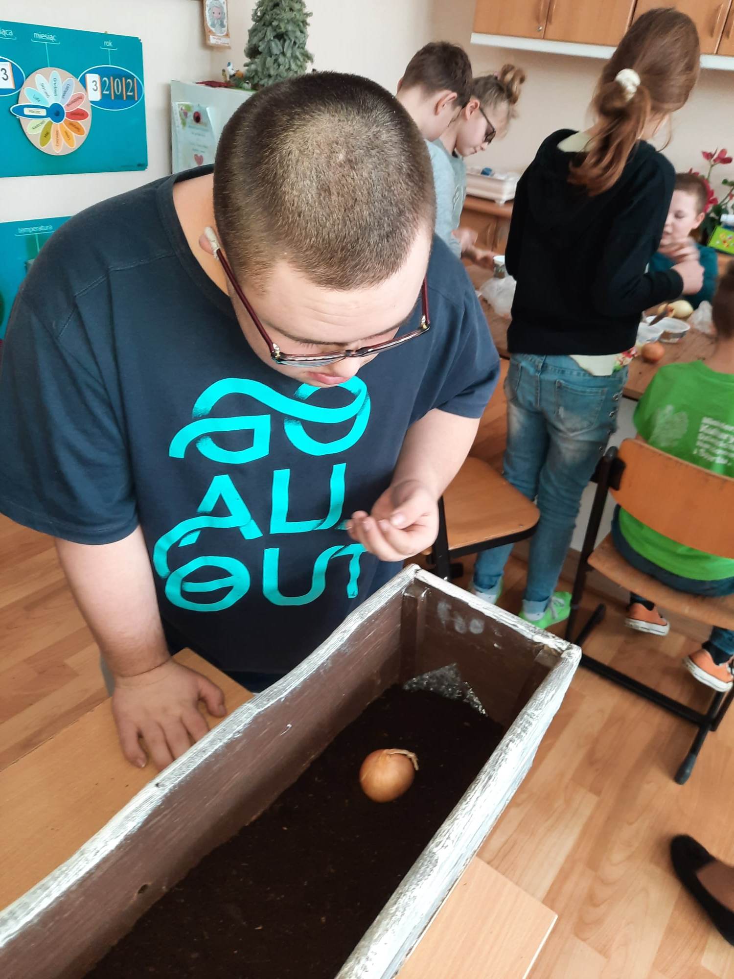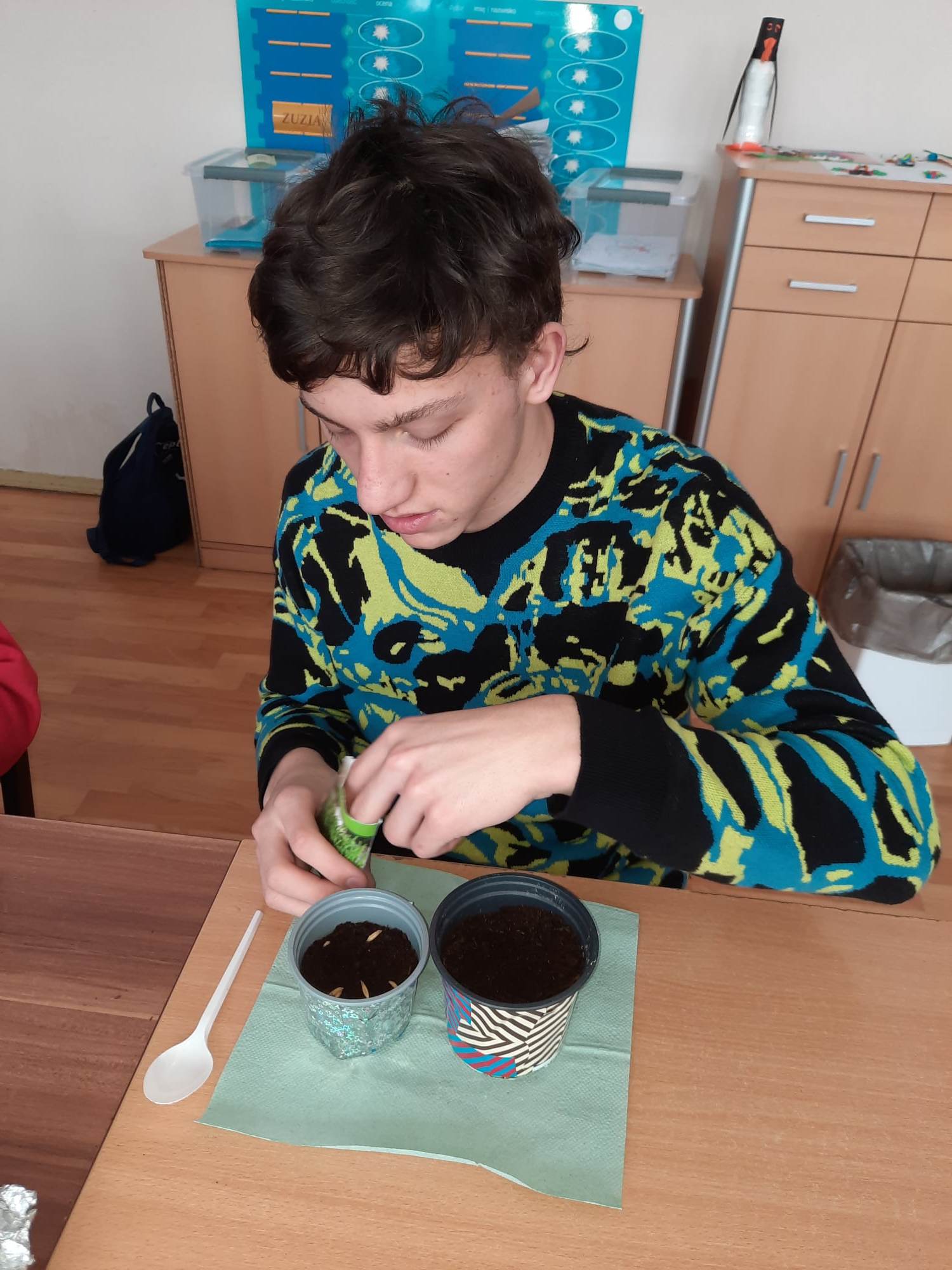 Wiosna zbliża się wielkimi krokami, więc uczniowie klas 3c, 7/8a, 8f założyli własne mini ogródki. Na początku przygotowali wszystkie potrzebne przedmioty i narzędzia ogrodnicze. A następnie zamienili się w małych ogrodników. Odmierzali ziemię, wsypywali ją do samodzielnie ozdobionych kolorowych doniczek, sadzili  cebulę i siali owies. Z wcześniejszych zajęć pamiętali, co potrzebne jest do rozwoju roślin, wiec doniczki z sadzonkami postawili na parapecie, żeby słońce przyspieszyło ich kiełkowanie. Od tej pory ich zadaniem będzie codzienna pielęgnacja własnych ogródków. Wszyscy z niecierpliwością czekają na efekty swojej pracy.