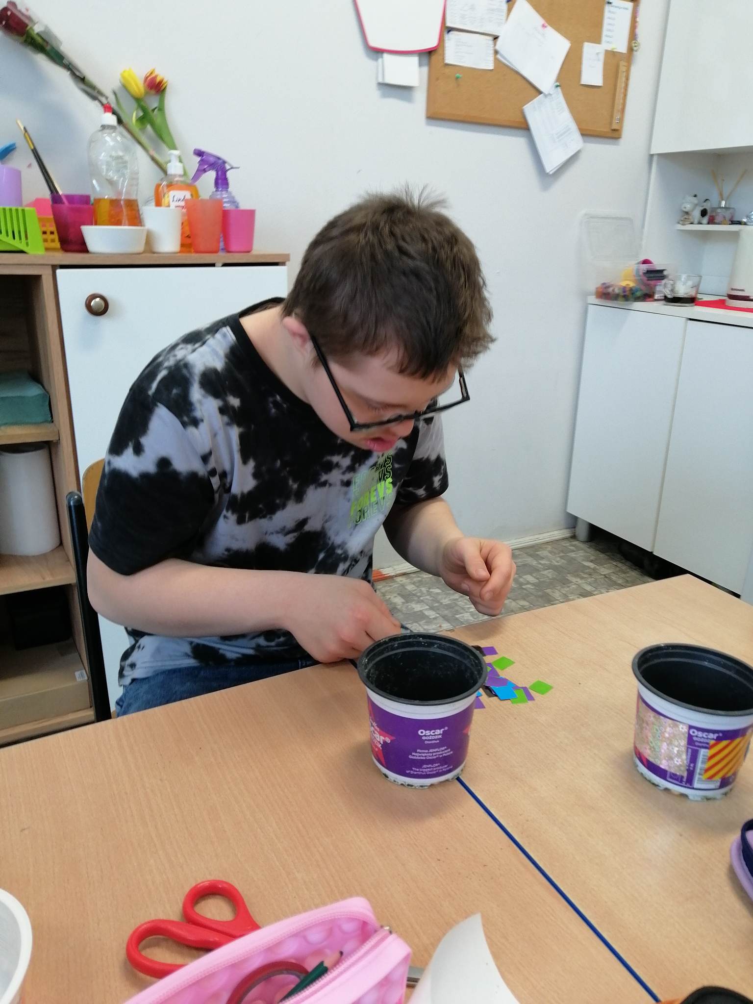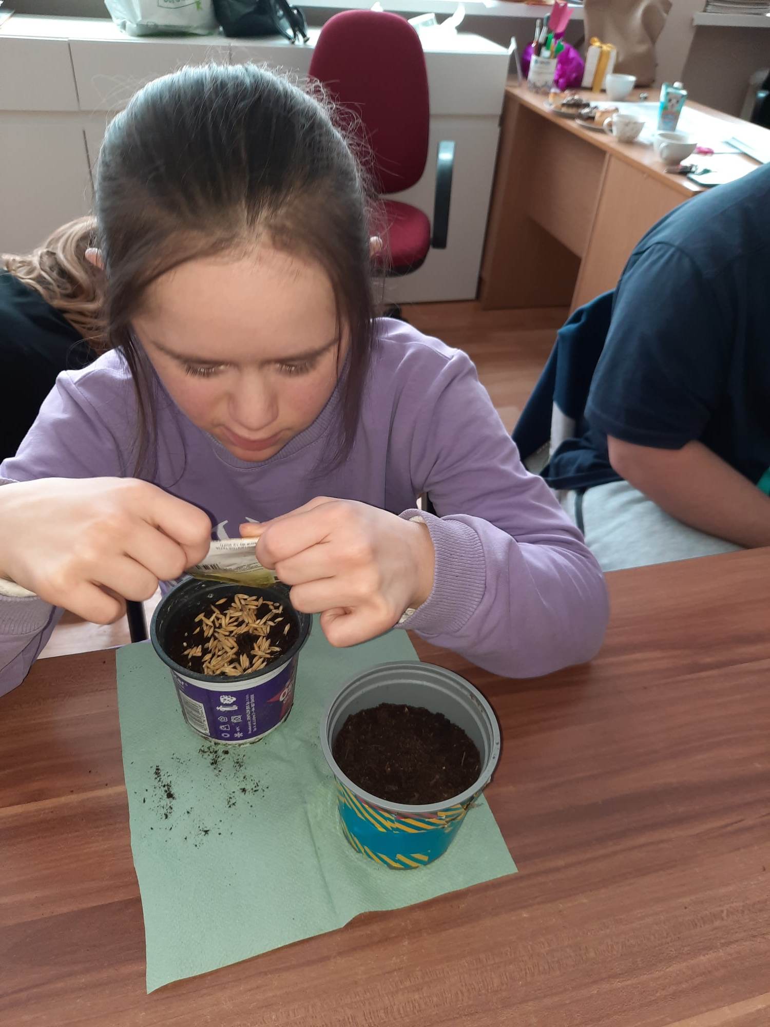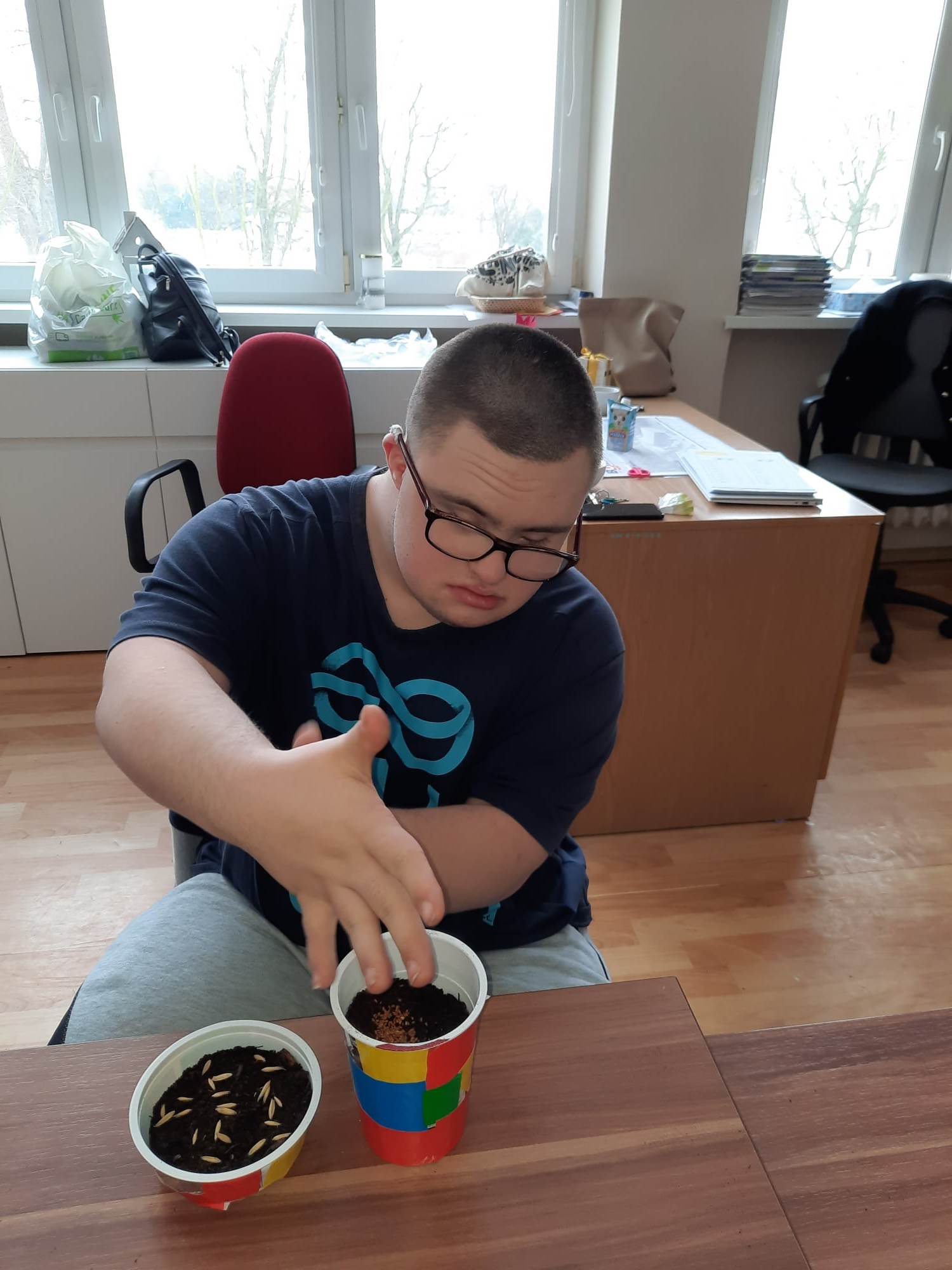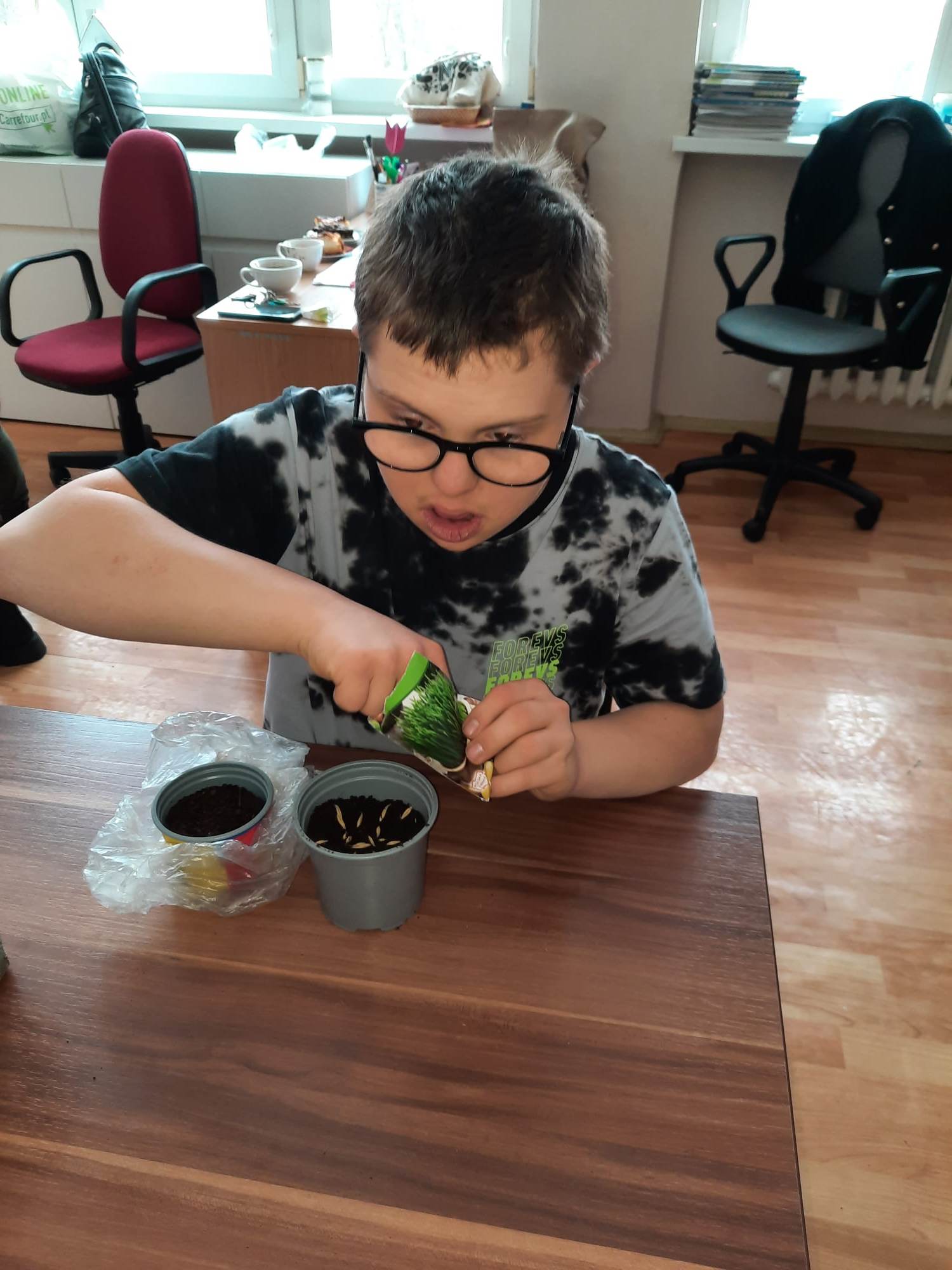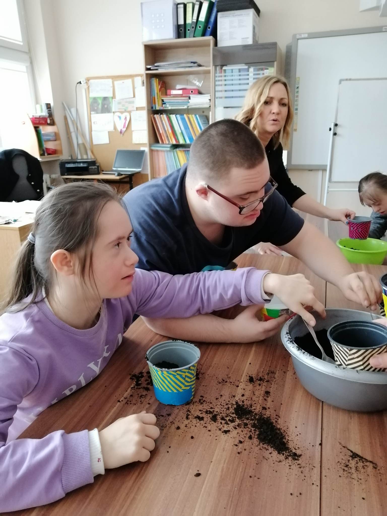 Wiosna zbliża się wielkimi krokami, więc uczniowie klas 3c, 7/8a, 8f założyli własne mini ogródki. Na początku przygotowali wszystkie potrzebne przedmioty i narzędzia ogrodnicze. A następnie zamienili się w małych ogrodników. Odmierzali ziemię, wsypywali ją do samodzielnie ozdobionych kolorowych doniczek, sadzili  cebulę i siali owies. Z wcześniejszych zajęć pamiętali, co potrzebne jest do rozwoju roślin, wiec doniczki z sadzonkami postawili na parapecie, żeby słońce przyspieszyło ich kiełkowanie. Od tej pory ich zadaniem będzie codzienna pielęgnacja własnych ogródków. Wszyscy z niecierpliwością czekają na efekty swojej pracy.