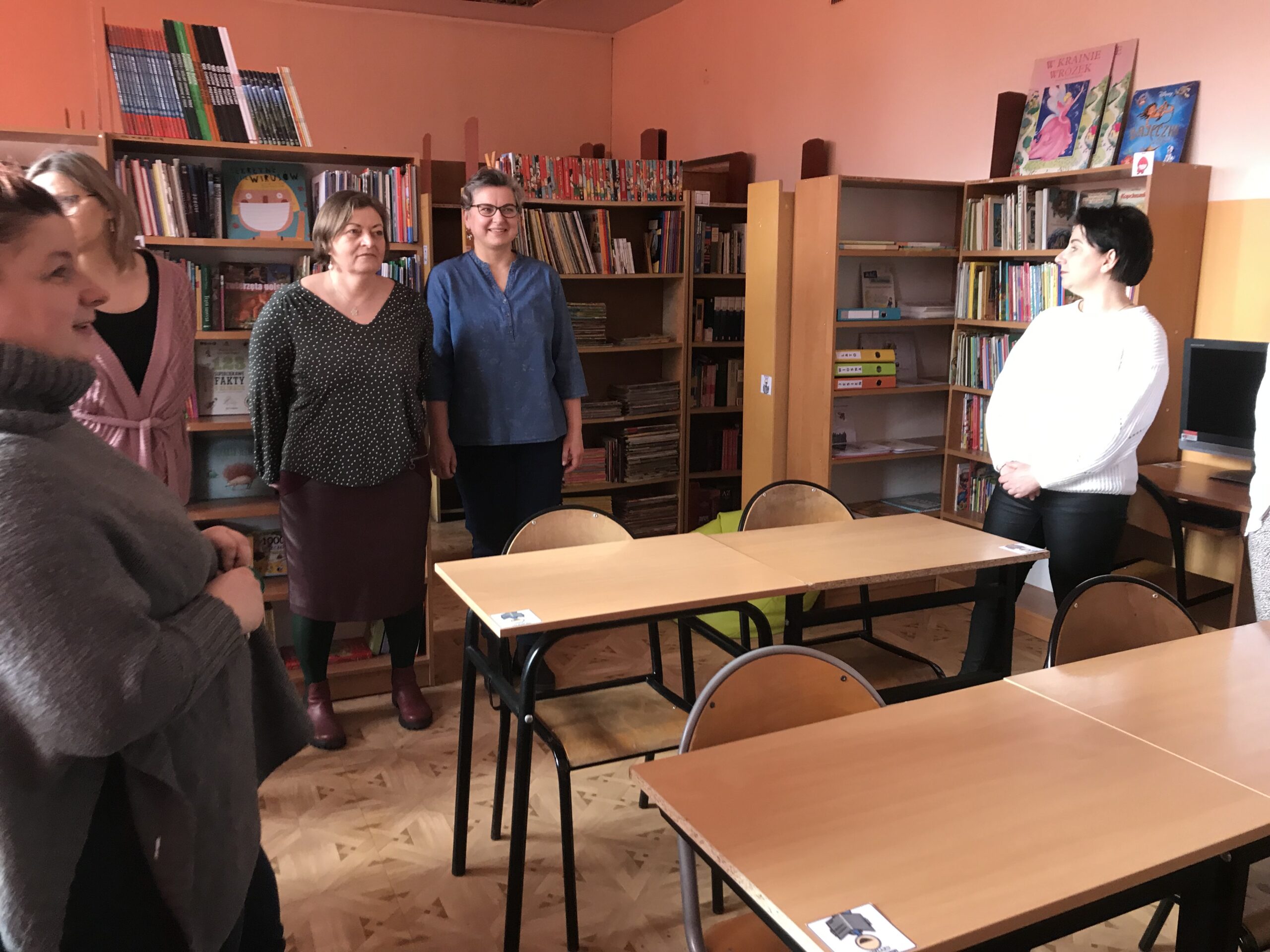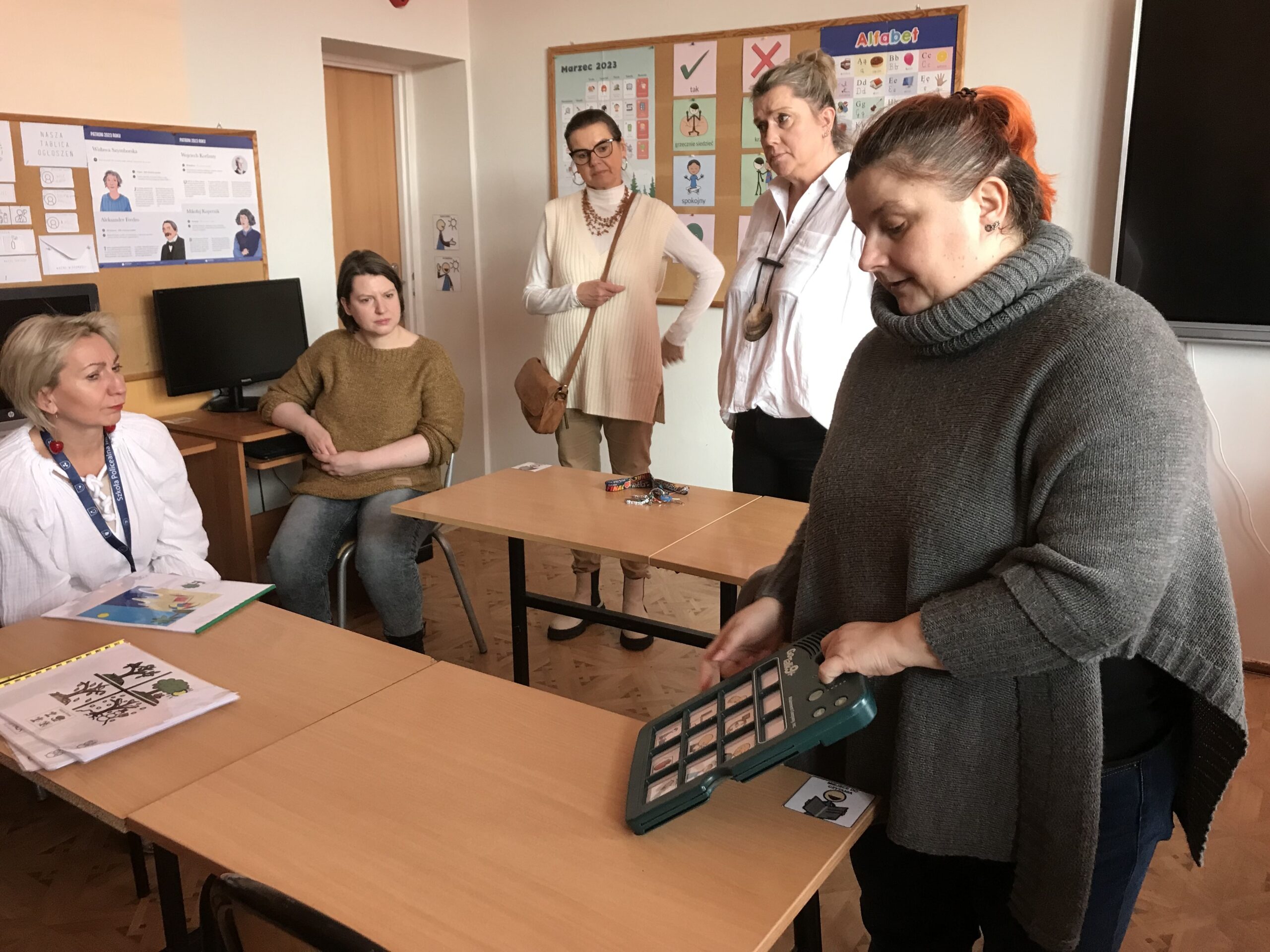 Uczestnicy spotkania odwiedzili także szkolną bibliotekę, w której pani Magdalena Janiak omówiła pracę nauczyciela bibliotekarza w szkole specjalnej. Uczestnicy spotkania poznali wykorzystywaną w naszej bibliotece strategię komunikacji alternatywnej dla osób z niepełnosprawnością intelektualną ze szczególnym uwzględnieniem osób niemówiących lub z minimalnym zasobem mowy czynnej. Mogli też obejrzeć znajdujące się w zasobach szkolnej biblioteki książki do czytania uczestniczącego.