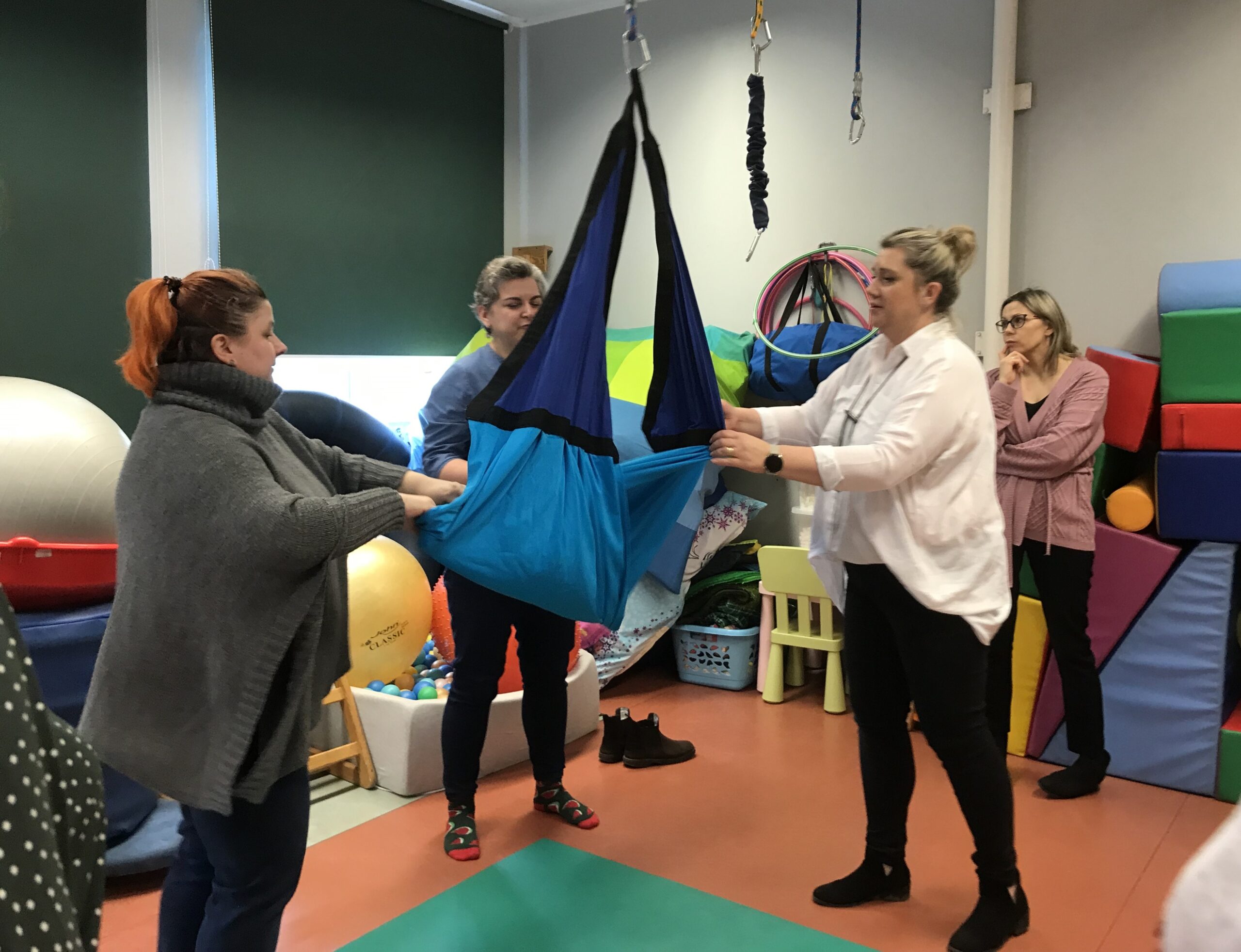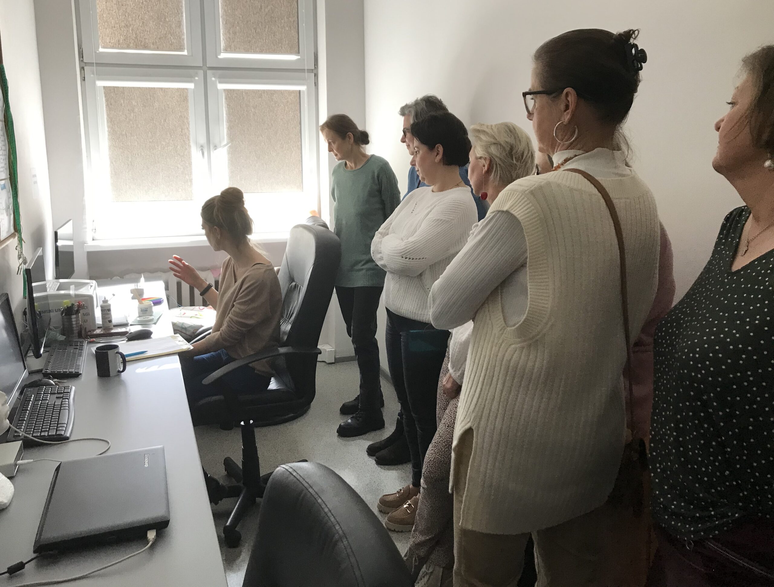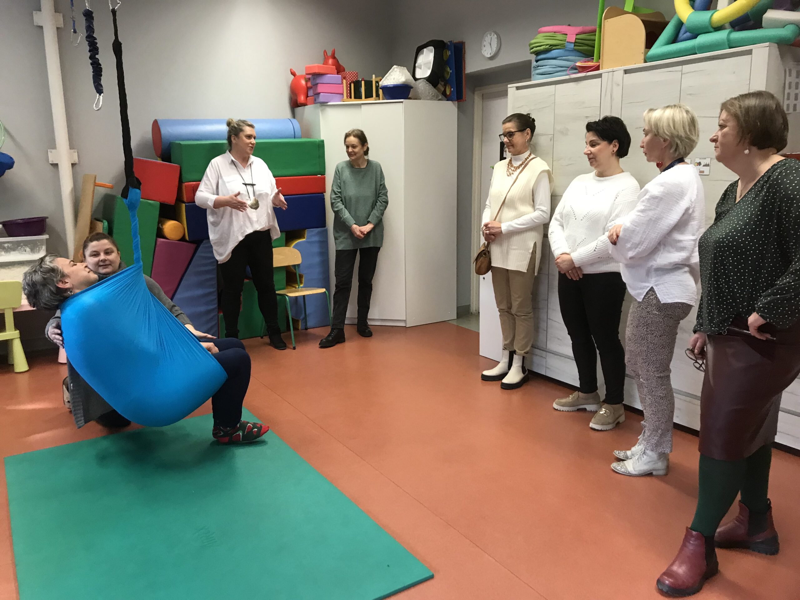 Przybyłych gości powitały wicedyrektor Iwona Sapińska oraz wicedyrektor Iwona Zwara. Następnie nauczyciele bibliotekarze z elbląskich placówek mogli z bliska przypatrzeć się pracy naszego Ośrodka. Odwiedzili m.in. salę doświadczania świata oraz pracownię SI. Podczas spotkania pani Anna Hatle-Tafelska opowiadała o pracy terapeutów integracji sensorycznej. Pani Kamila Paczkowska pokazała pracownię dla uczniów z autyzmem oraz przybliżyła uczestnikom spotkania specyfikę pracy z uczniami w spektrum. Pani Magdalena Komorska w pracowni biofeedbacku zapoznała przybyłych gości z metodą terapii umożliwiającą normalizację fal EEG. O metodach pracy w szkole przysposabiającej do pracy opowiadały panie Małgorzata Sierek oraz Wioletta Szczepańska.