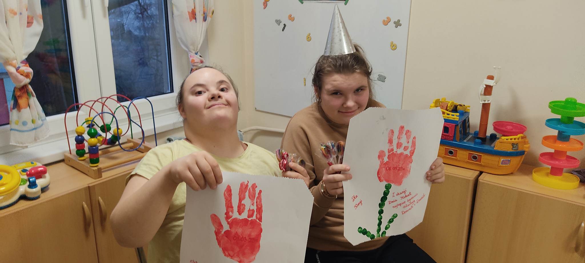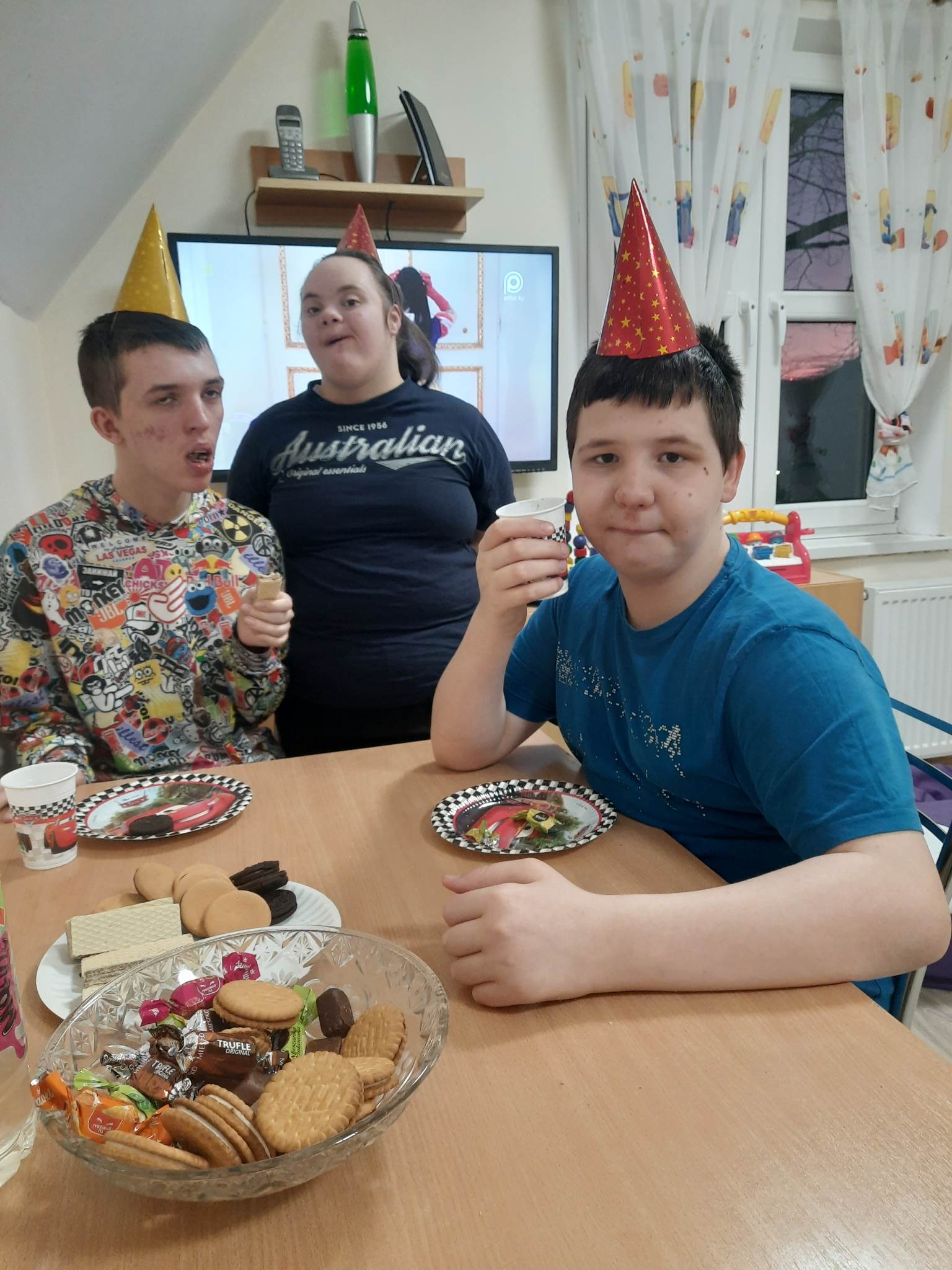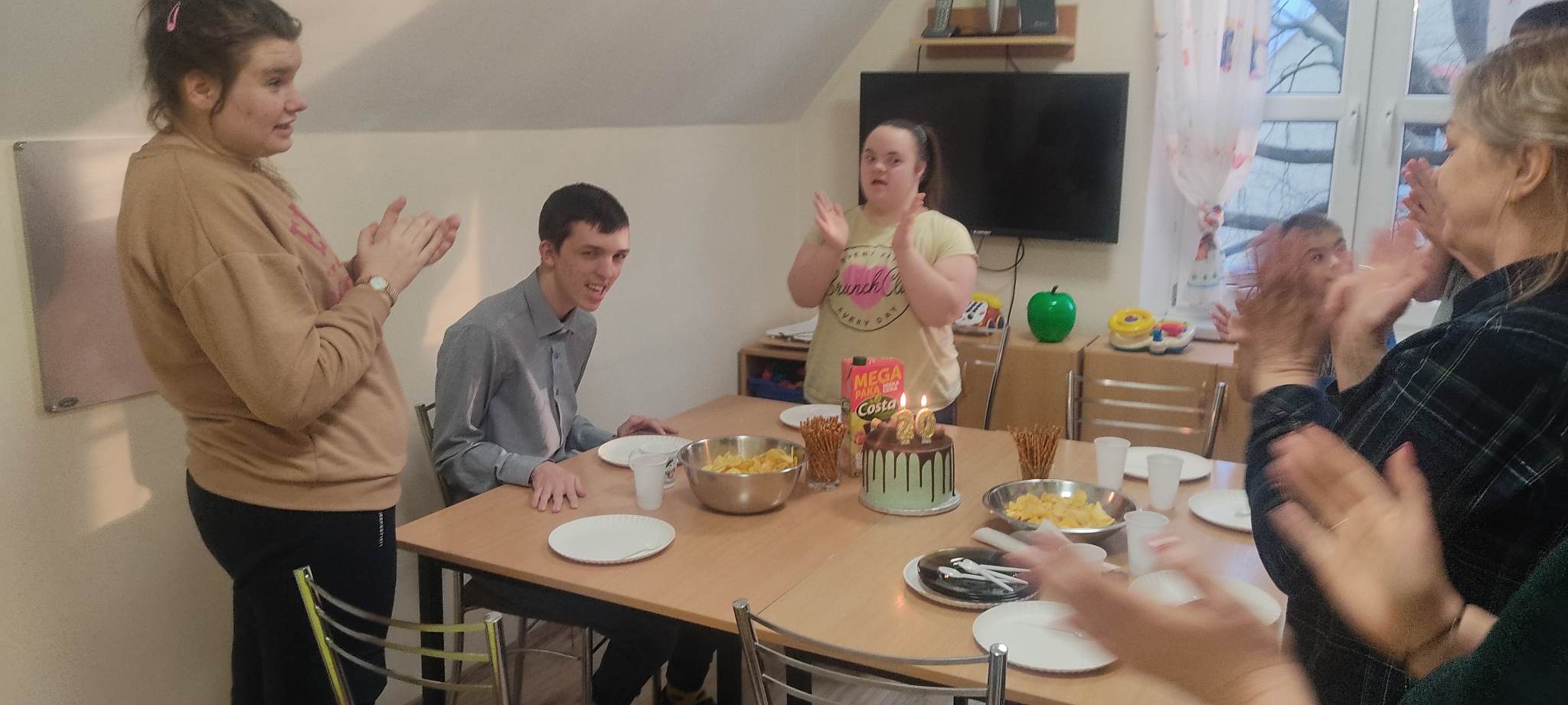 W internacie świętowaliśmy w marcu urodziny dwóch wychowanków. Były to wyjątkowe urodziny. Dawid skończył magiczne 18 lat a Dominik 20. Jubilaci przyjmowali życzenia od pań oraz koleżanek i kolegów. Wszyscy tradycyjnie zaśpiewali ,,Sto lat”, wręczyli prezent i wspólnie bawili się przy muzyce oraz częstowali słodkościami. Przy okazji świętowania urodzin chłopcy nie zapomnieli o swoich koleżankach z grupy. Kinga i Paulina zostały obdarowane przez Dominika i Dawida bukiecikiem z lizaków oraz laurką z okazji Dnia Kobiet.