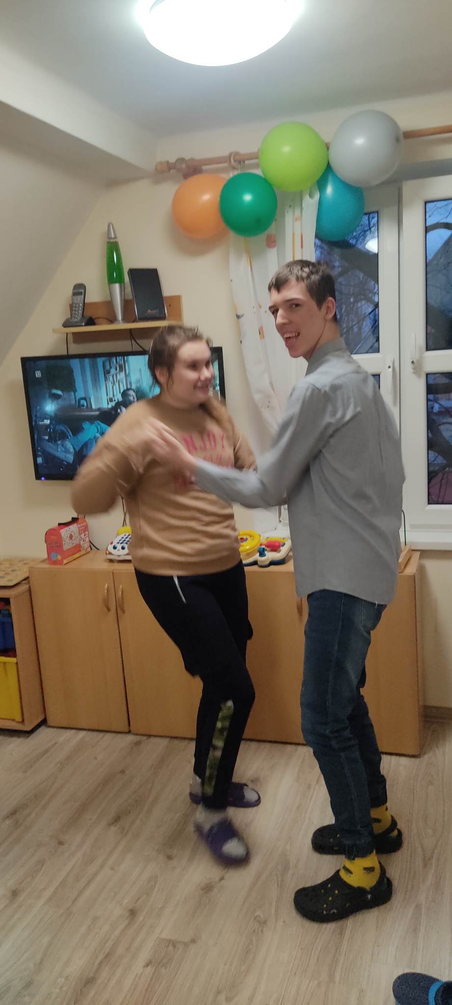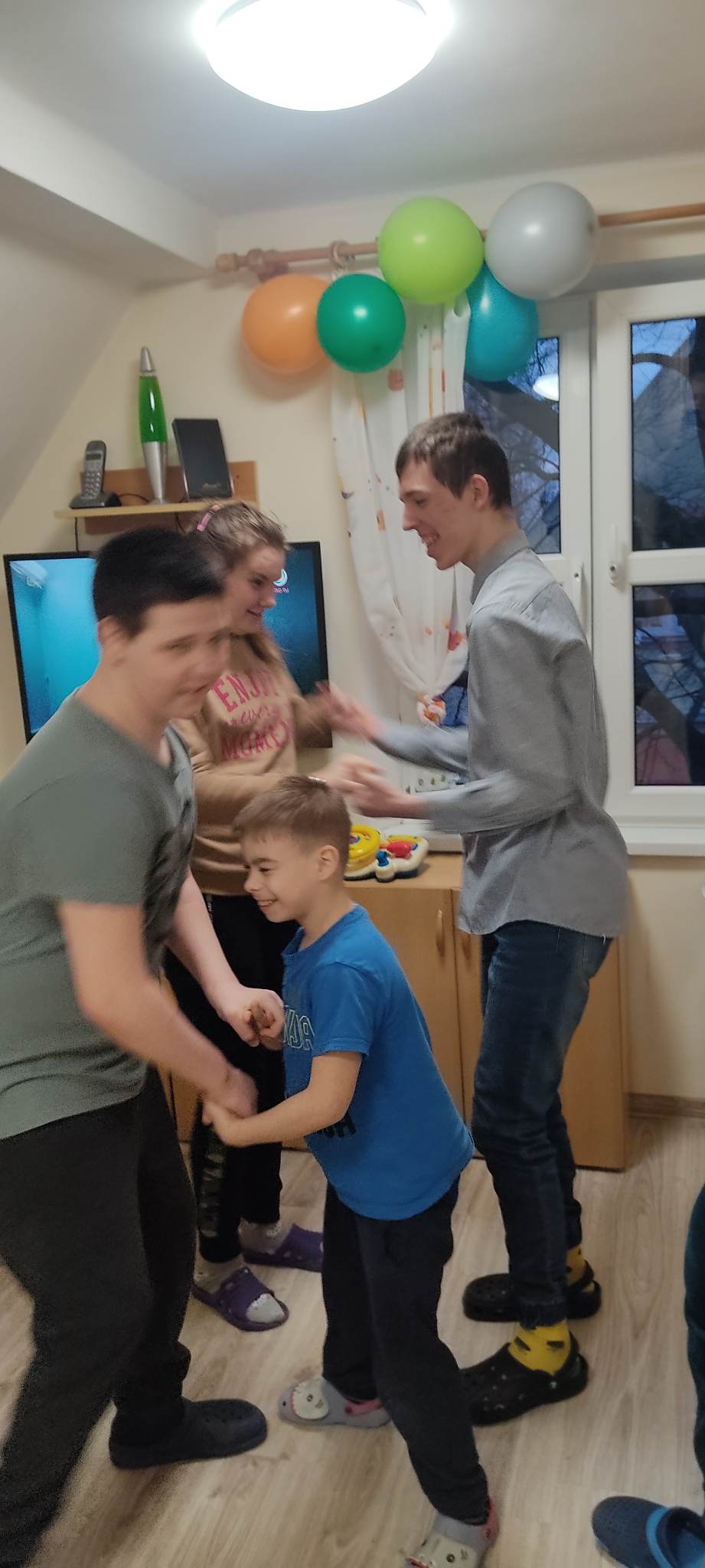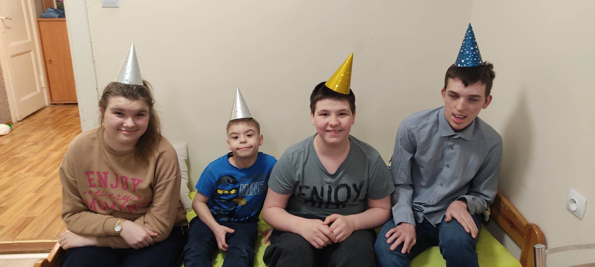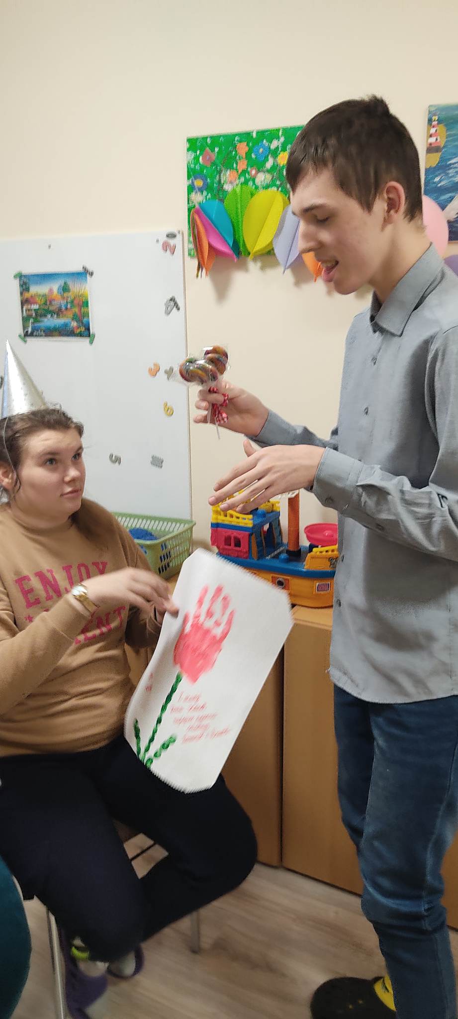 W internacie świętowaliśmy w marcu urodziny dwóch wychowanków. Były to wyjątkowe urodziny. Dawid skończył magiczne 18 lat a Dominik 20. Jubilaci przyjmowali życzenia od pań oraz koleżanek i kolegów. Wszyscy tradycyjnie zaśpiewali ,,Sto lat”, wręczyli prezent i wspólnie bawili się przy muzyce oraz częstowali słodkościami. Przy okazji świętowania urodzin chłopcy nie zapomnieli o swoich koleżankach z grupy. Kinga i Paulina zostały obdarowane przez Dominika i Dawida bukiecikiem z lizaków oraz laurką z okazji Dnia Kobiet.