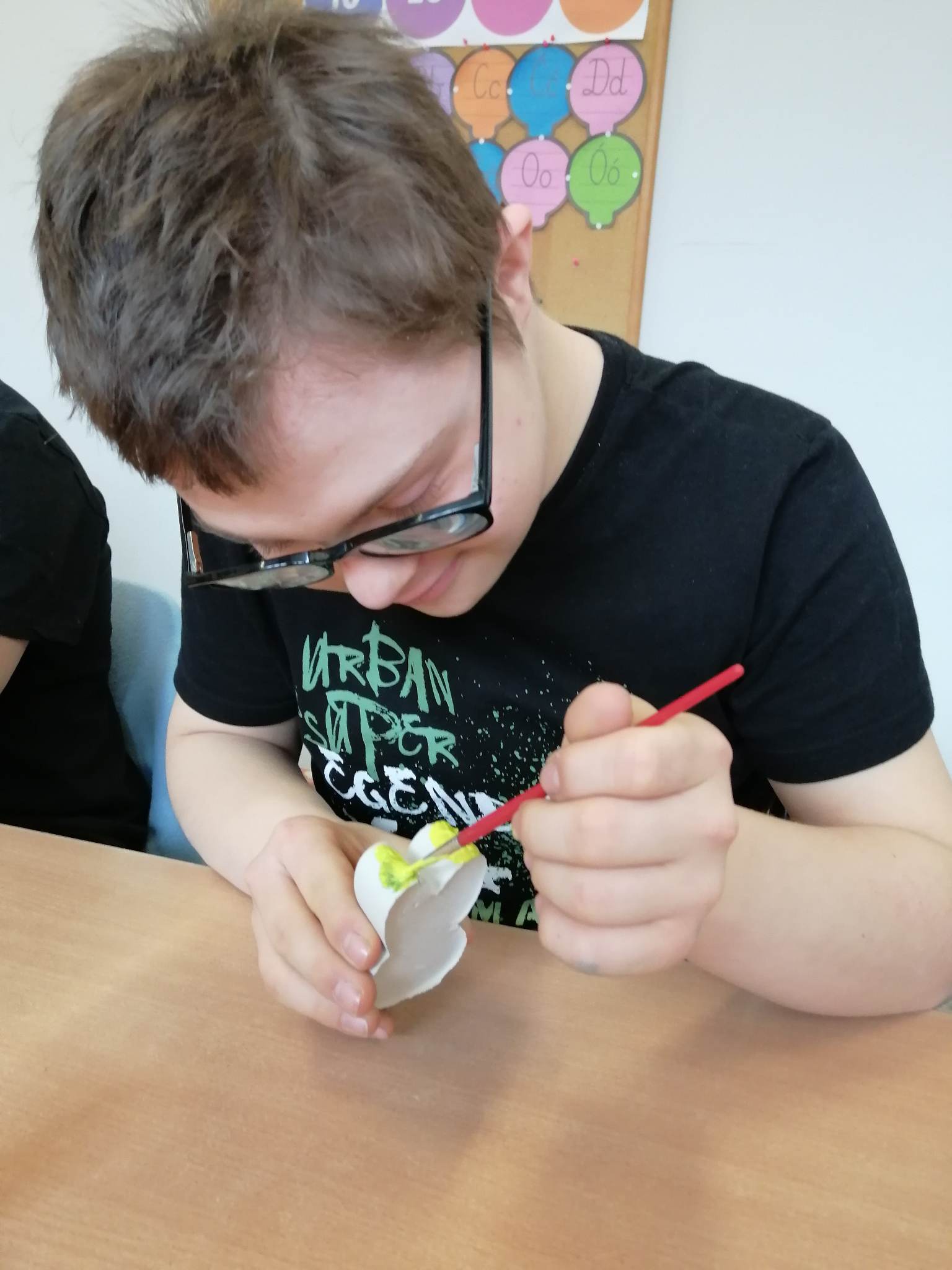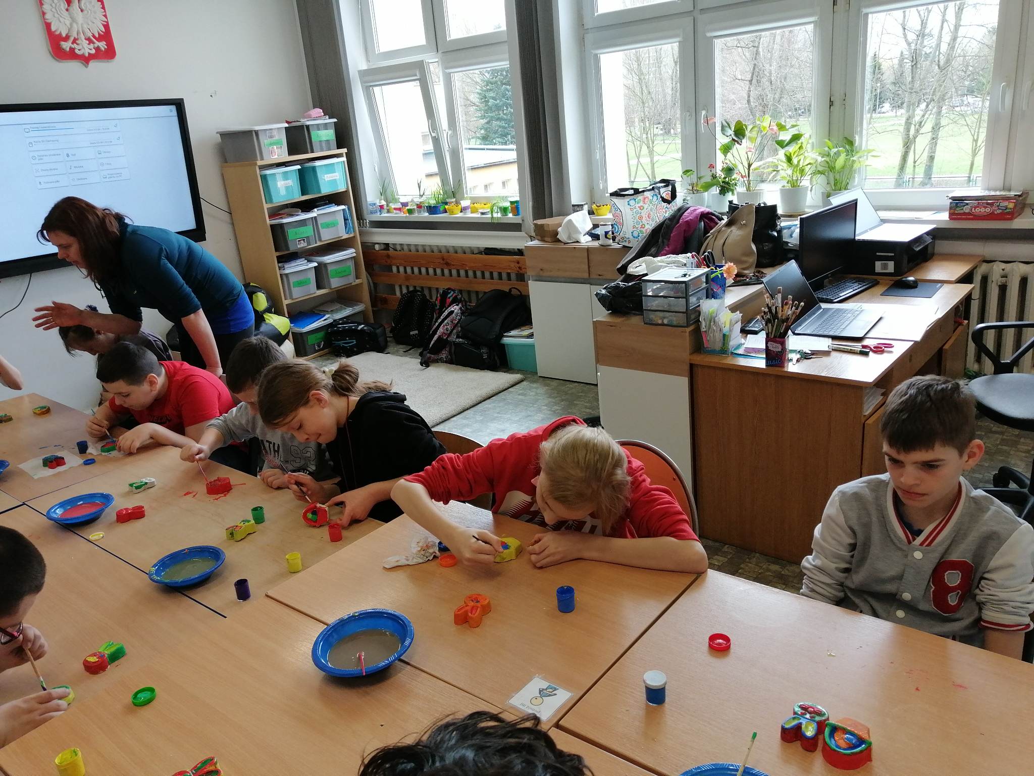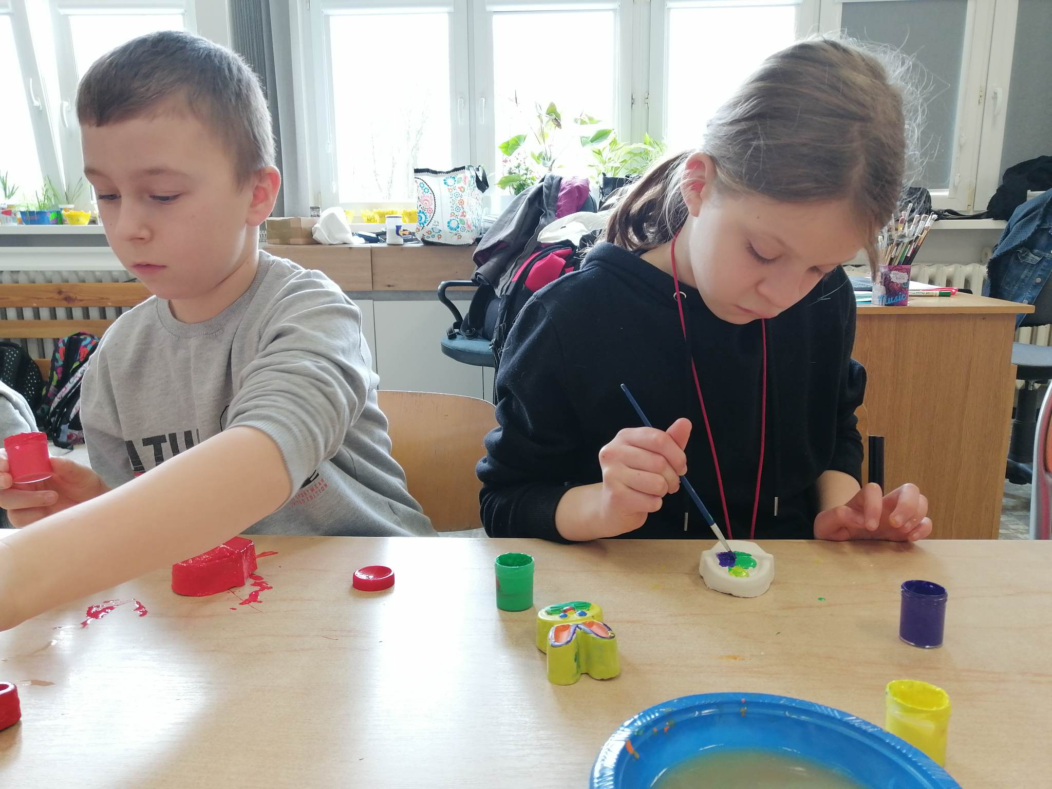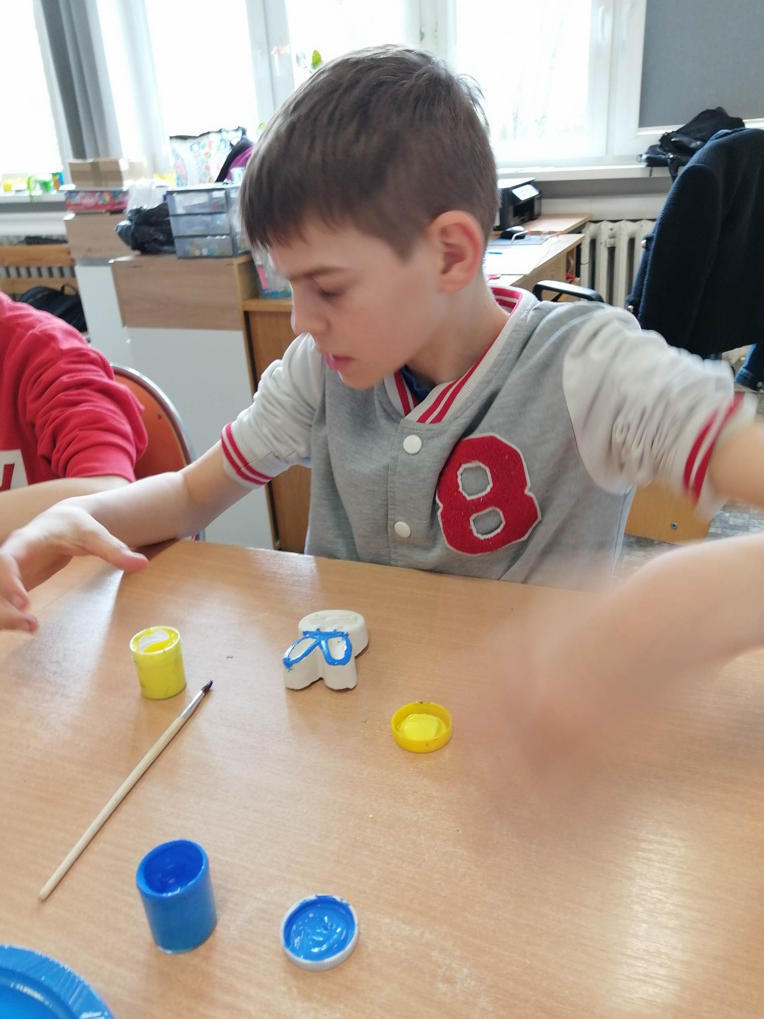 Uczestnicy zajęć klasy 3c, 7/8a i 8f mieli okazję obejrzeć ciekawą prezentację na temat malowania i dekorowania wielkanocnych jajek. W trakcie warsztatów uczniowie malowali figurki gipsowe: wielkanocne zajączki i jajka. Po zajęciach gotowe prace trafiły do pudełka, aby w trakcie świąt mogły zdobić wielkanocny stół. Warsztaty stworzyły możliwość twórczego przygotowania się do świąt Wielkiej Nocy – stworzenia dekoracji idealnej na nadchodzące święta.